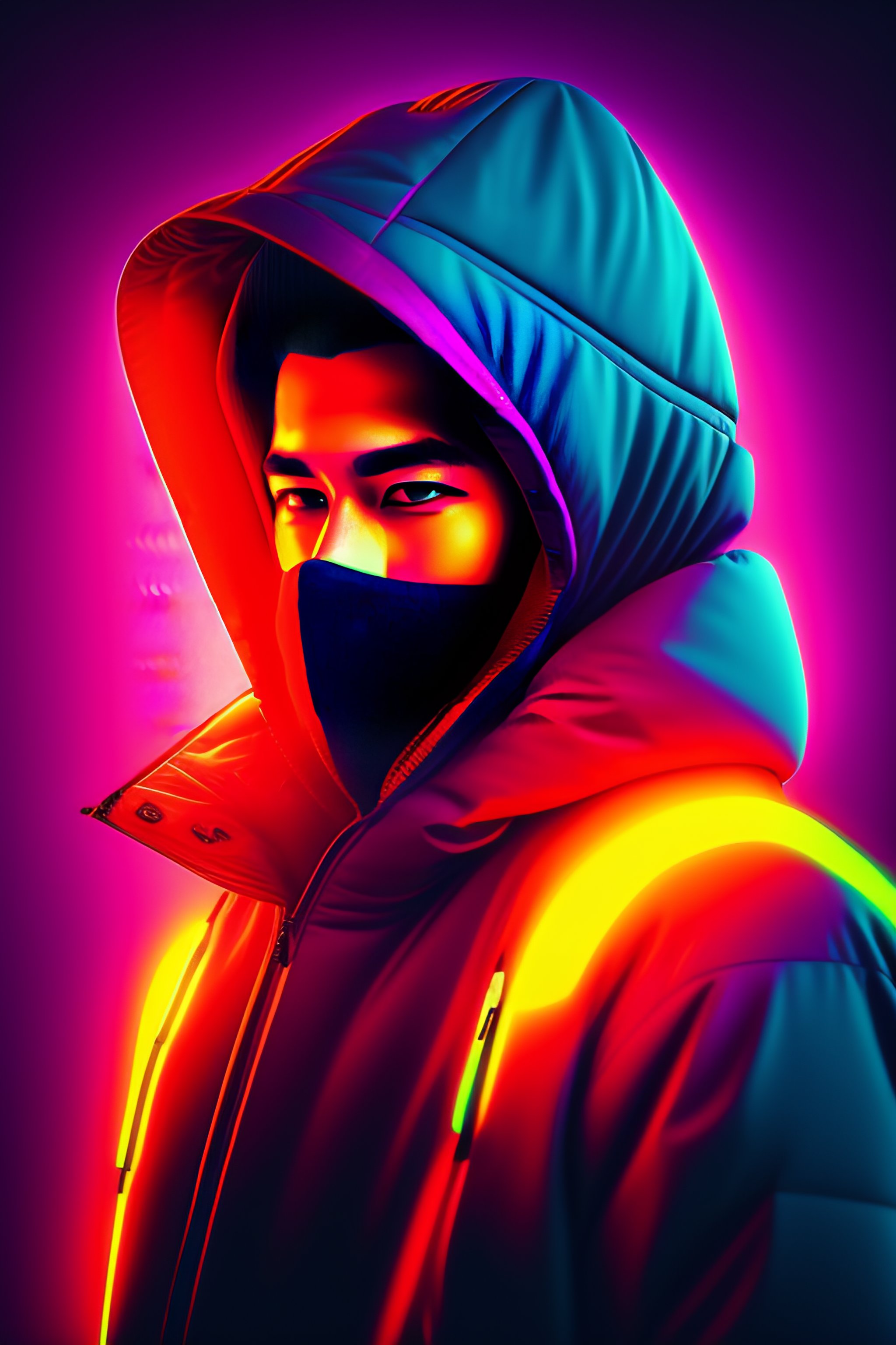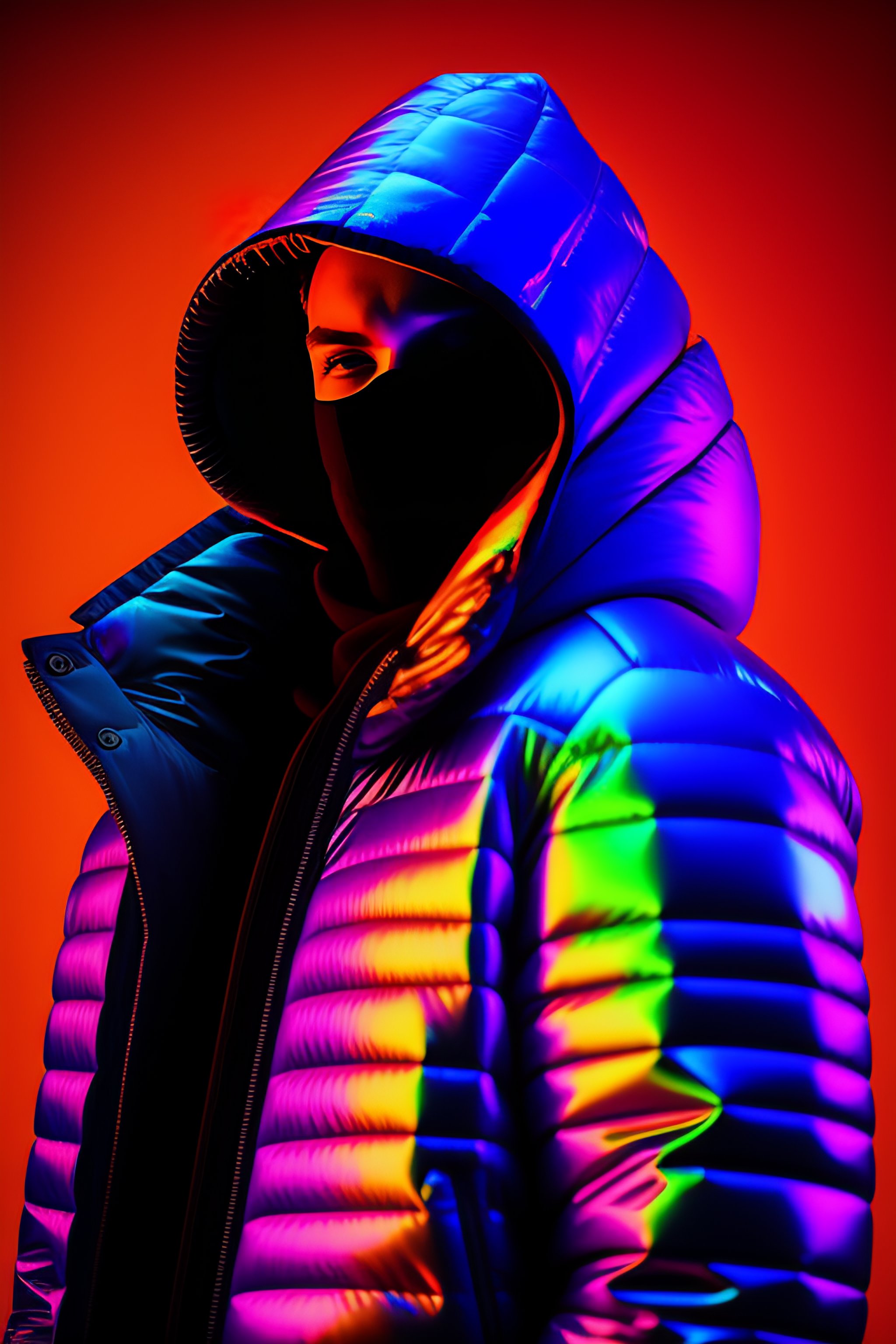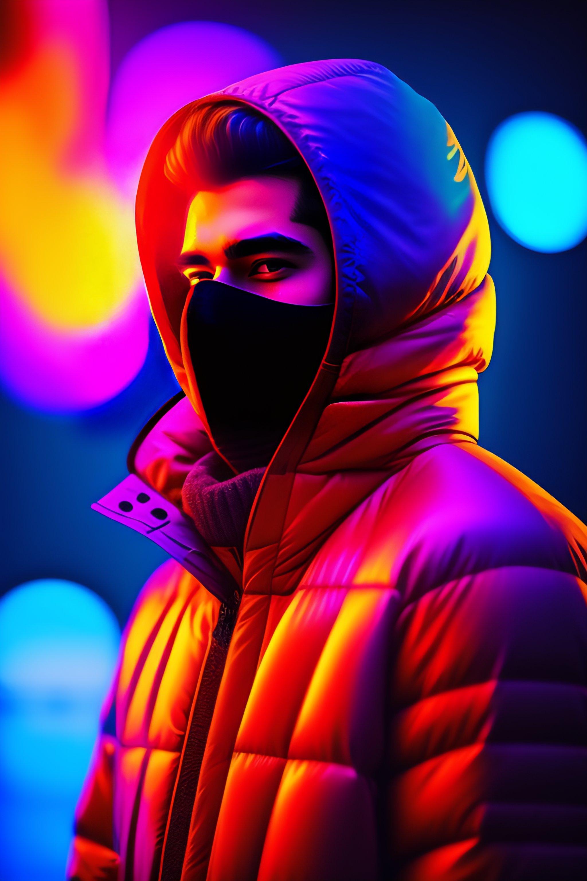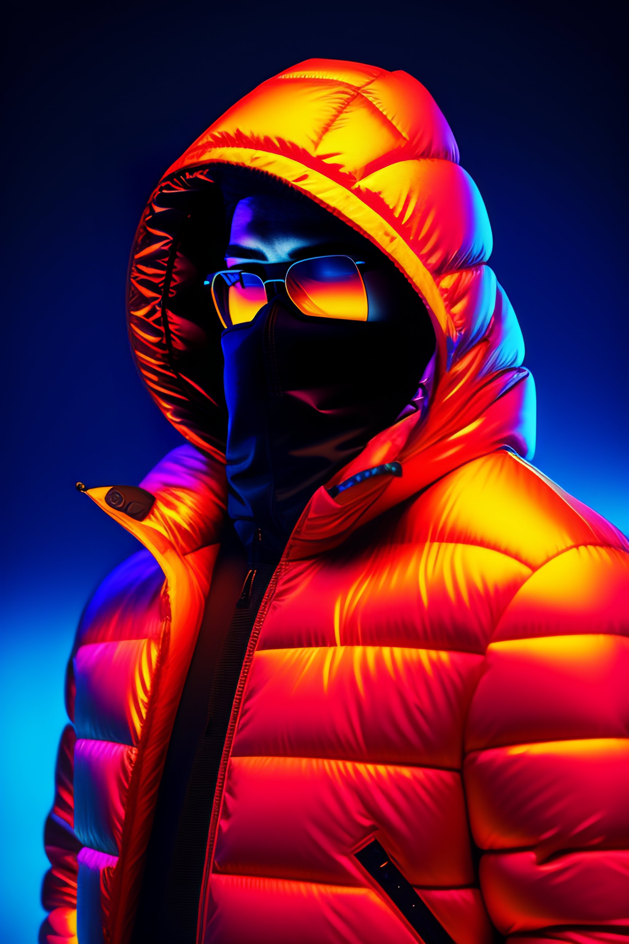 Man in puffer jacket wearing ski mask, portrait, vaporwave, synthwave, neon, vector graphics, cinematic, volumetric lighting, f 8 aperture, cinematic eastman 5 3 8 4 film, photorealistic