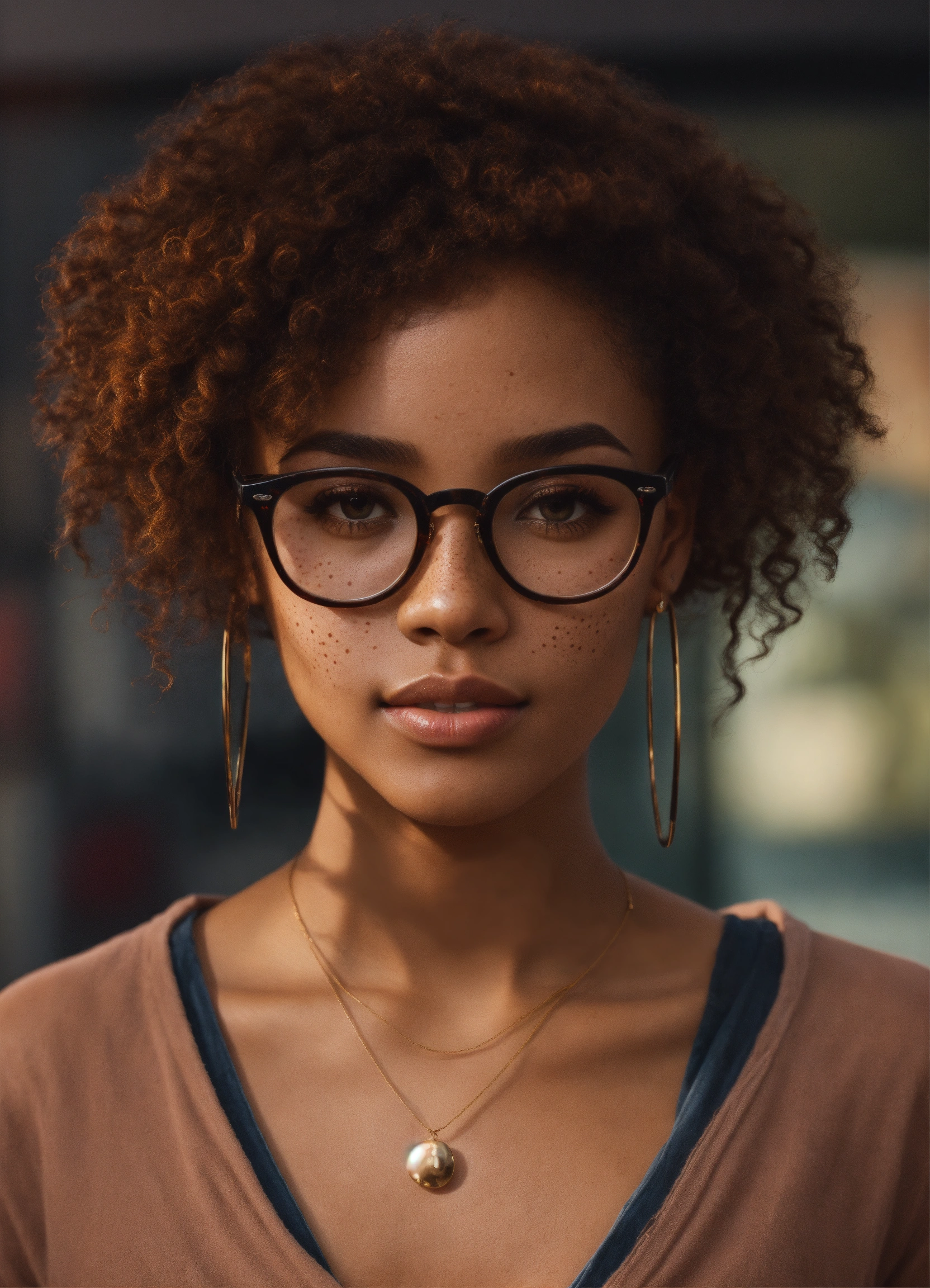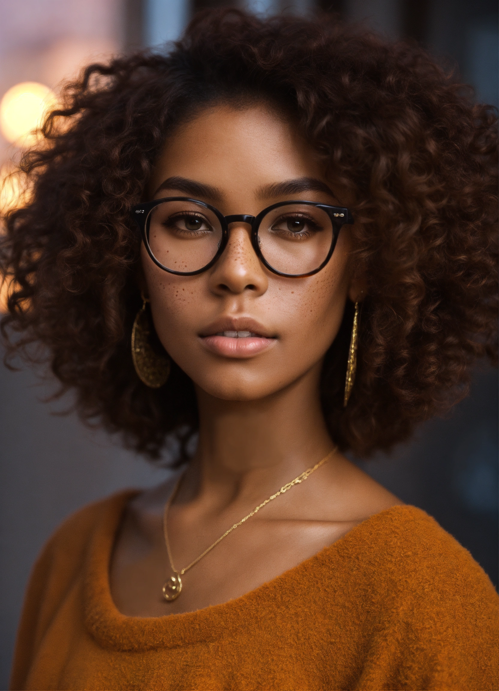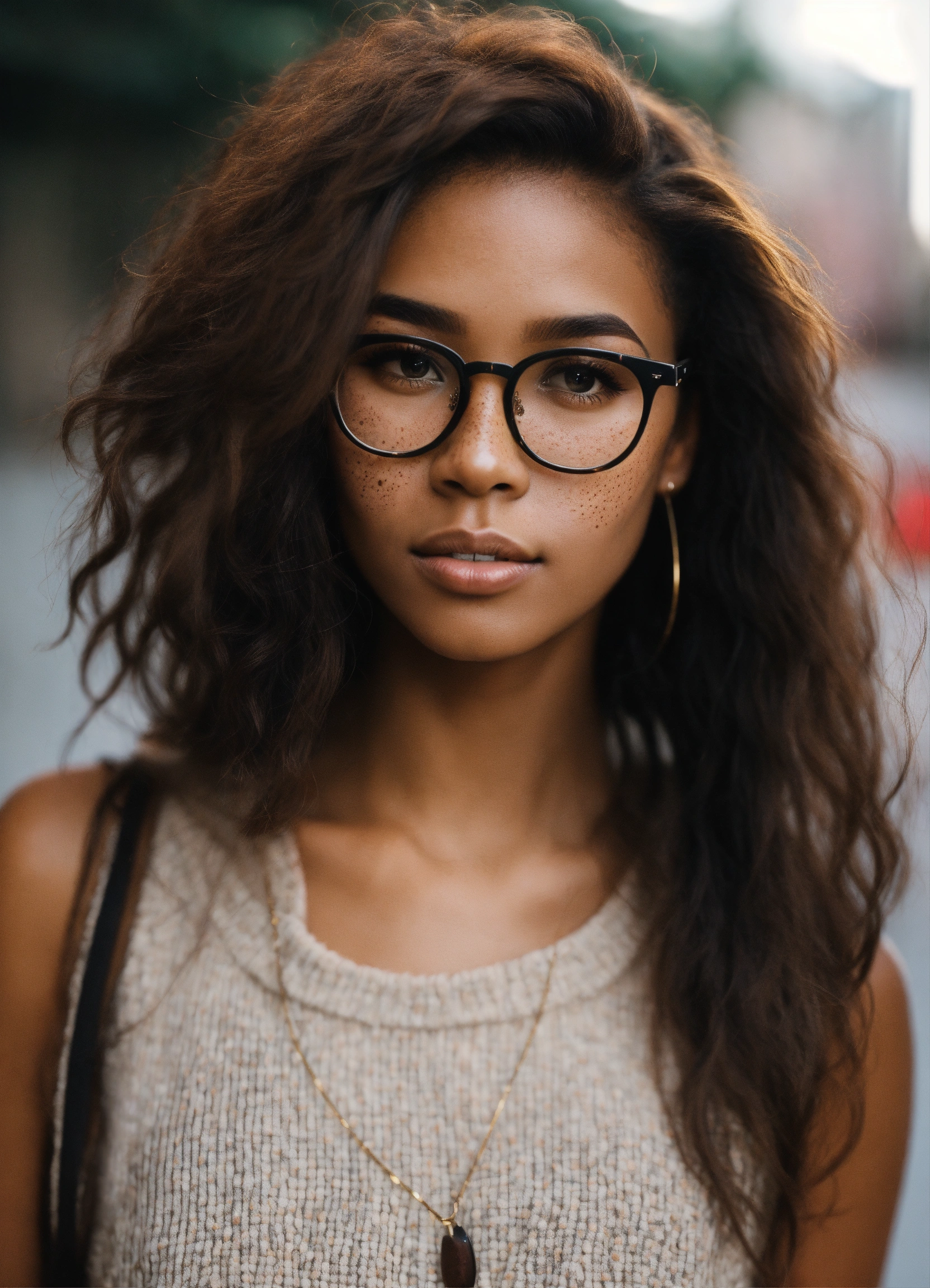 Short light skinned black female, long yaki straight fluffy brown hair, glasses, freckles, brown eyes, no imperfections