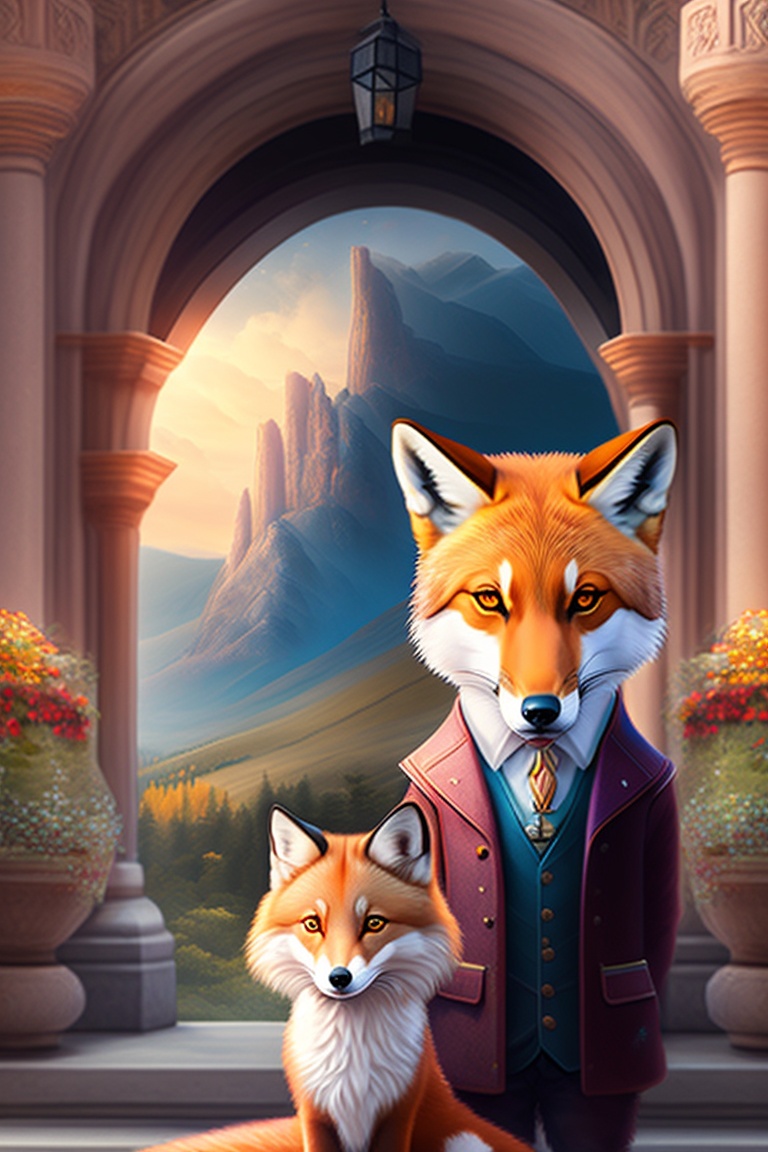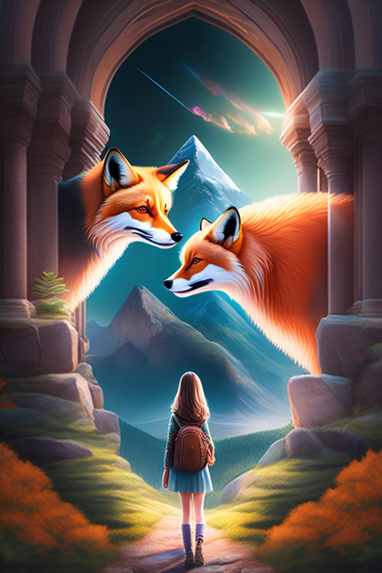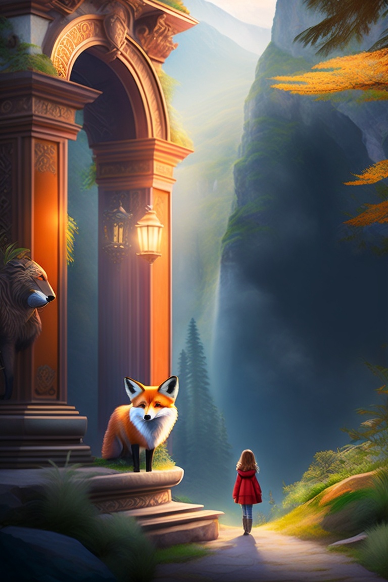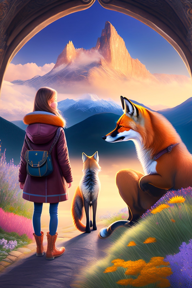 Girl and fox after a long and adventurous journey, alice and mia arrived at the grand and imposing gates of fairy mountain. they were in awe of the beauty of the place and couldn't wait to explore further.