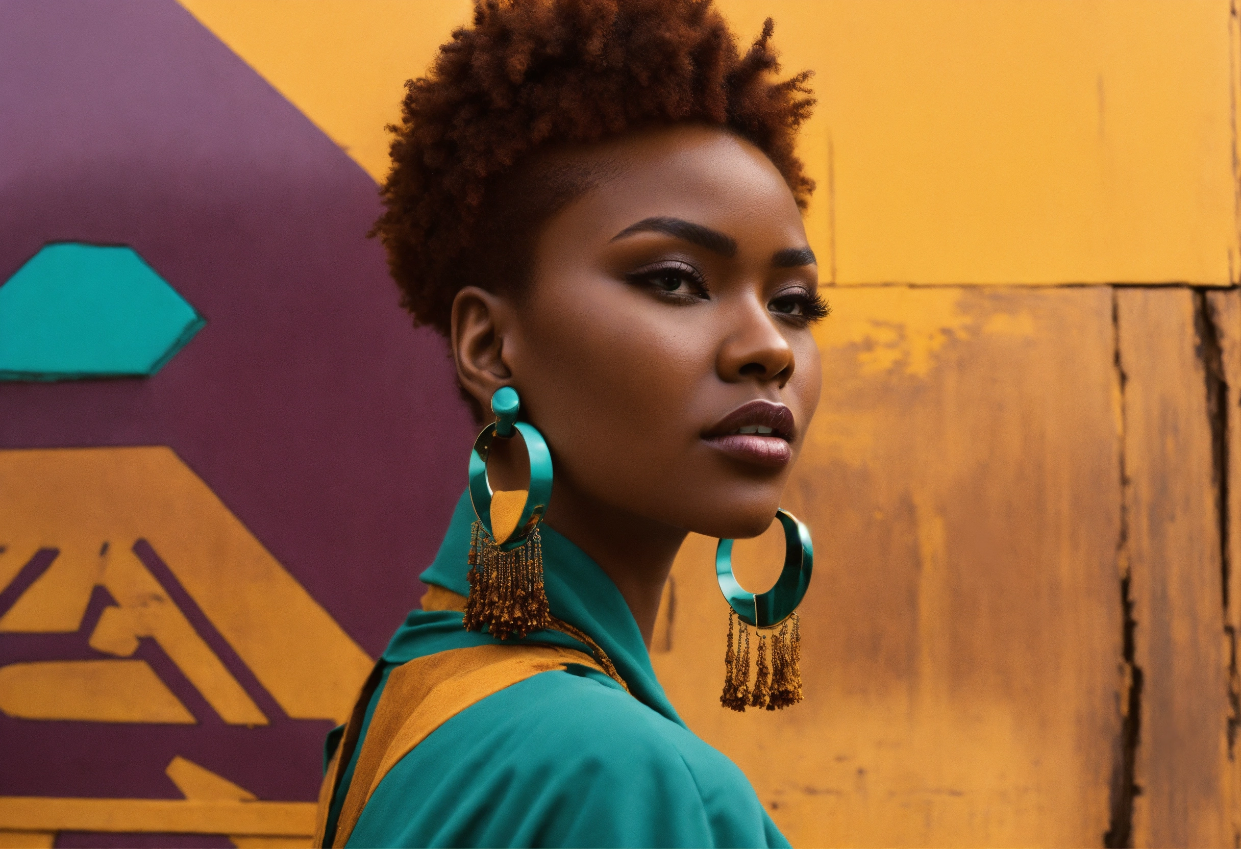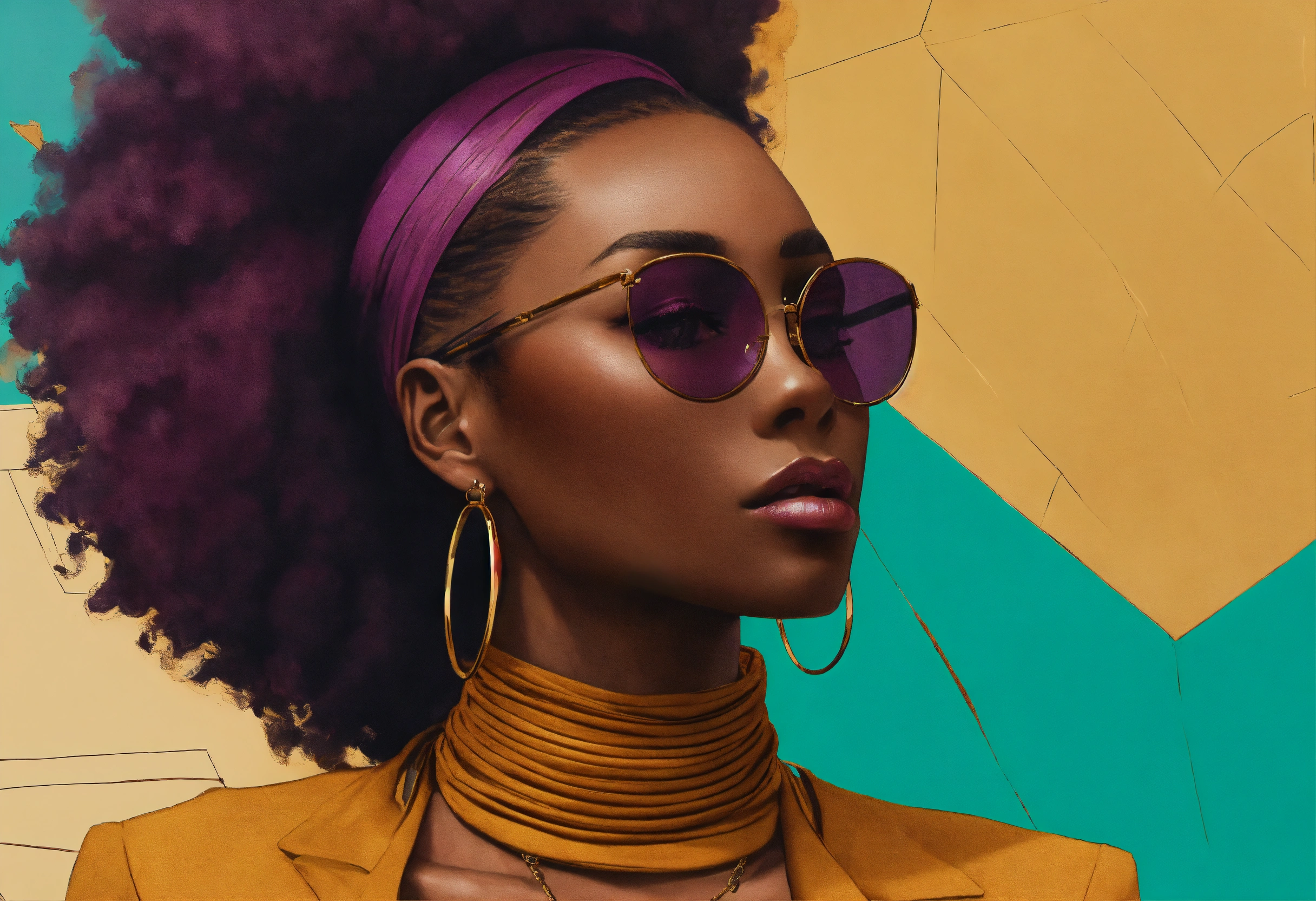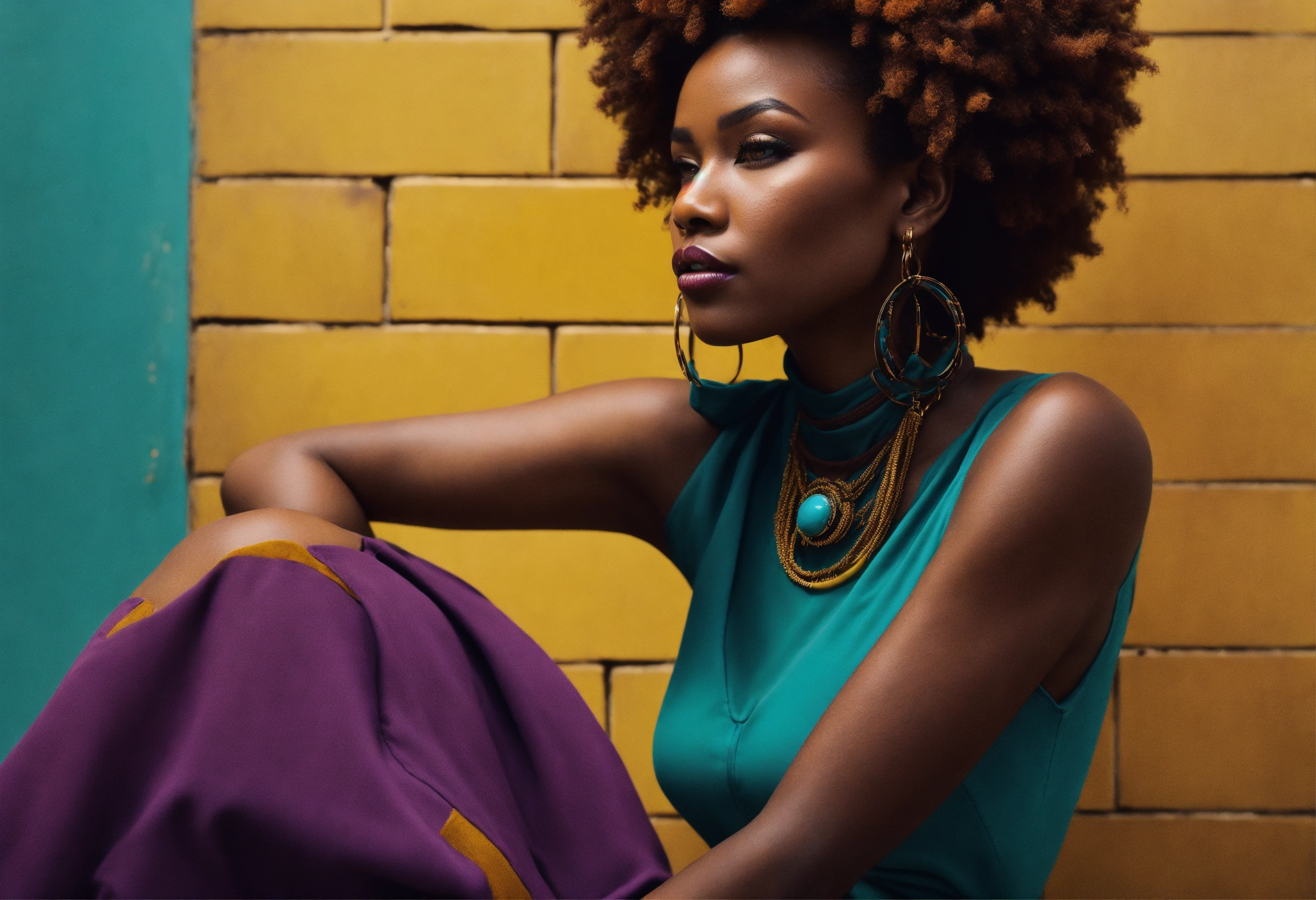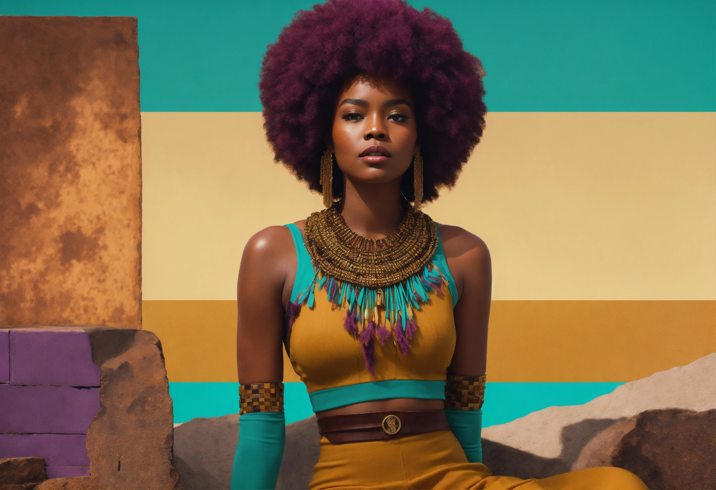 Art ‘yes you can breakout and something new’, a beautifully majestic afrocentric woman, color palette; turquoise rich mahogany burnt umber mustard shades of violet, rule of thirds, dc comics aesthetic styling