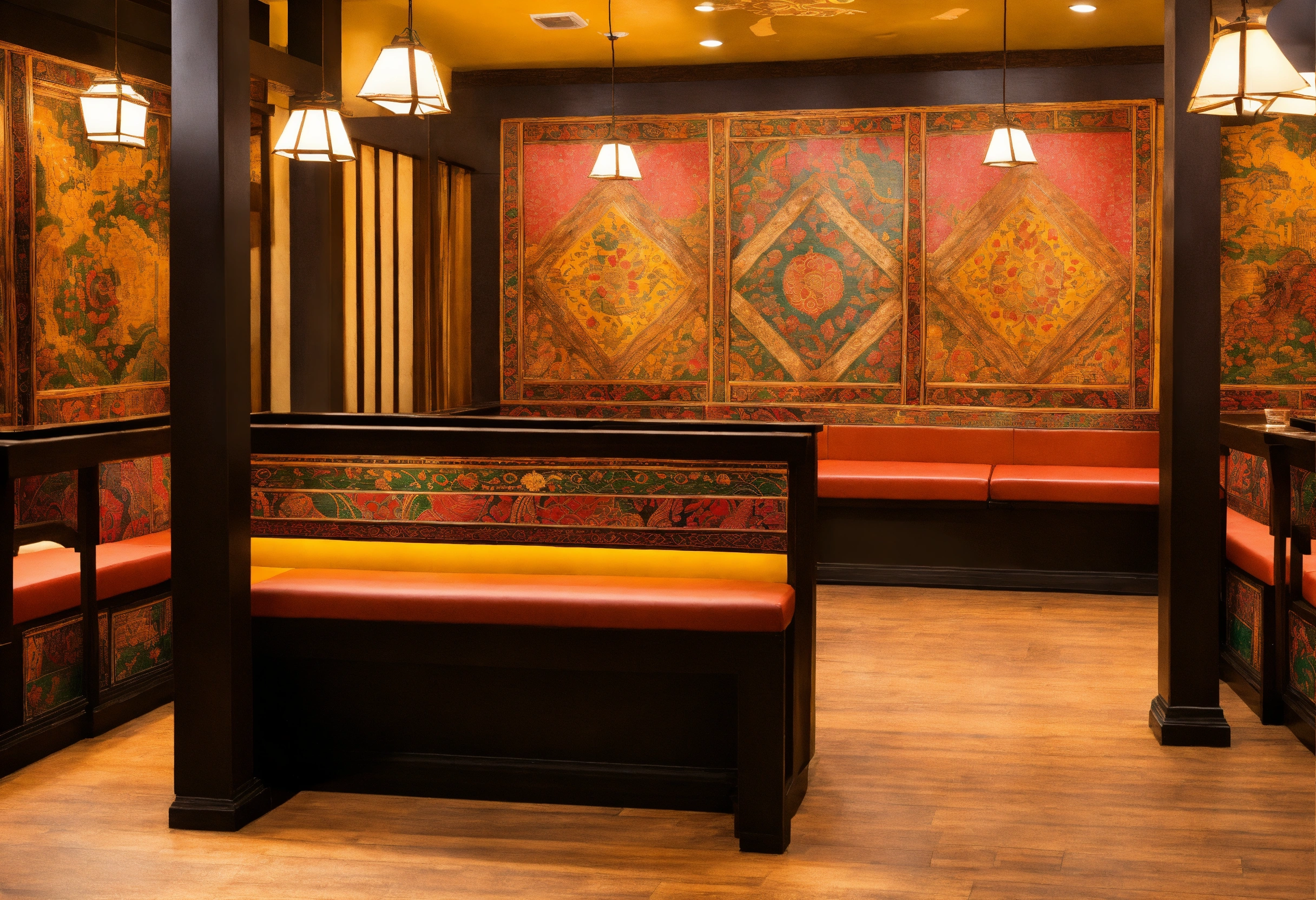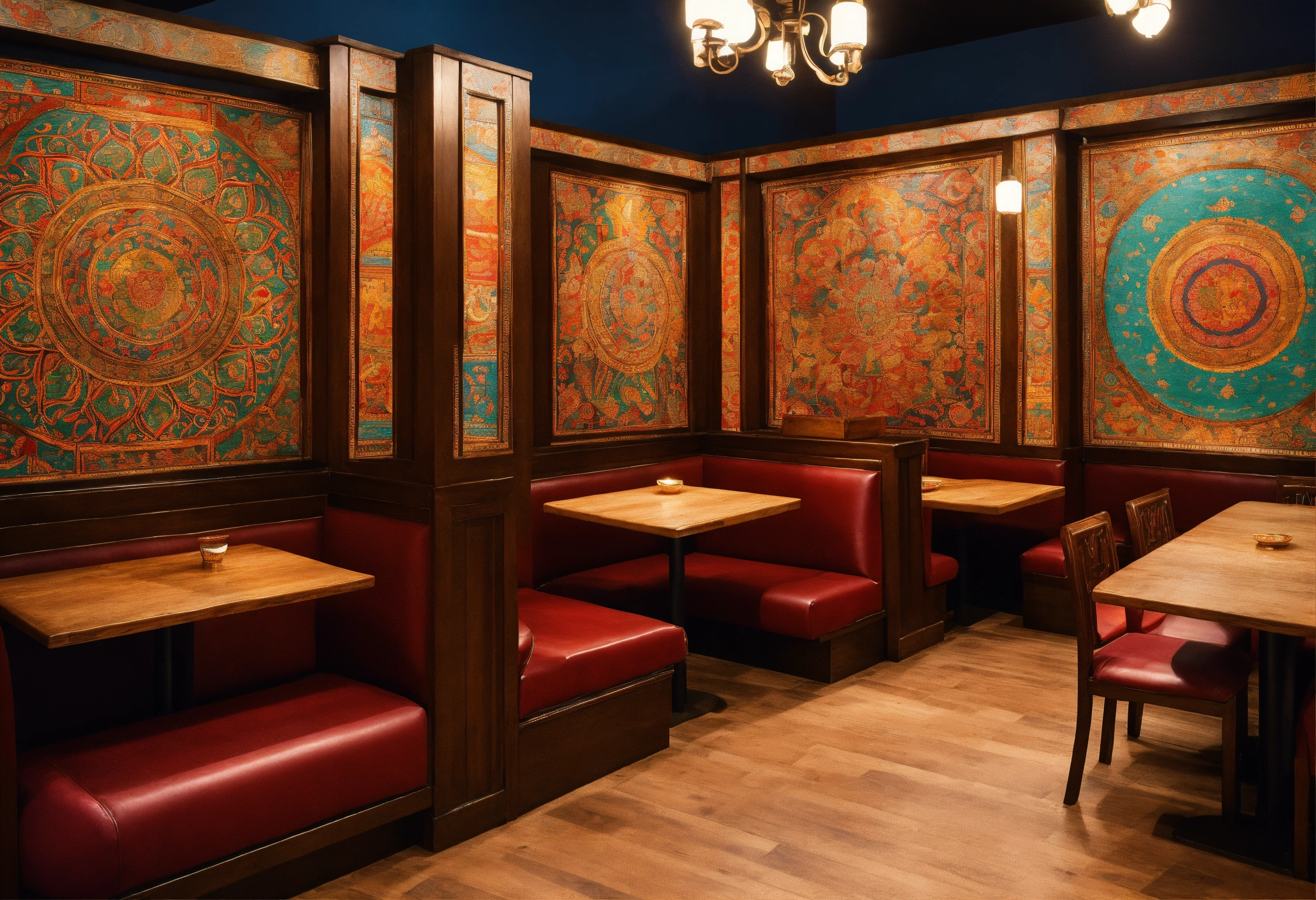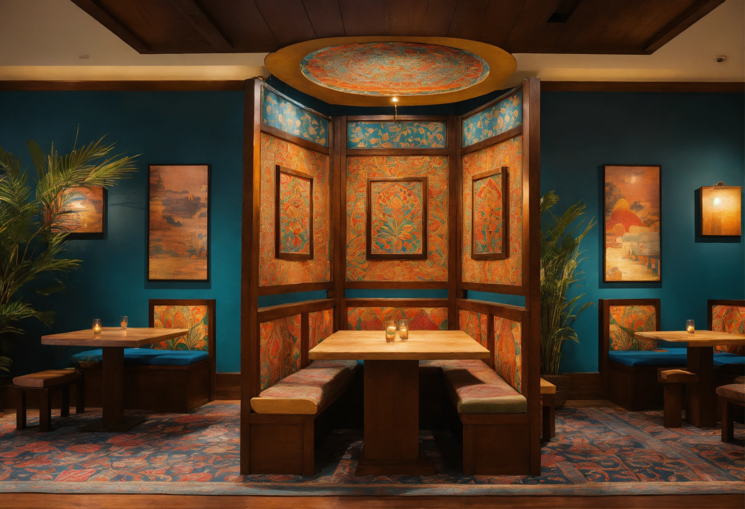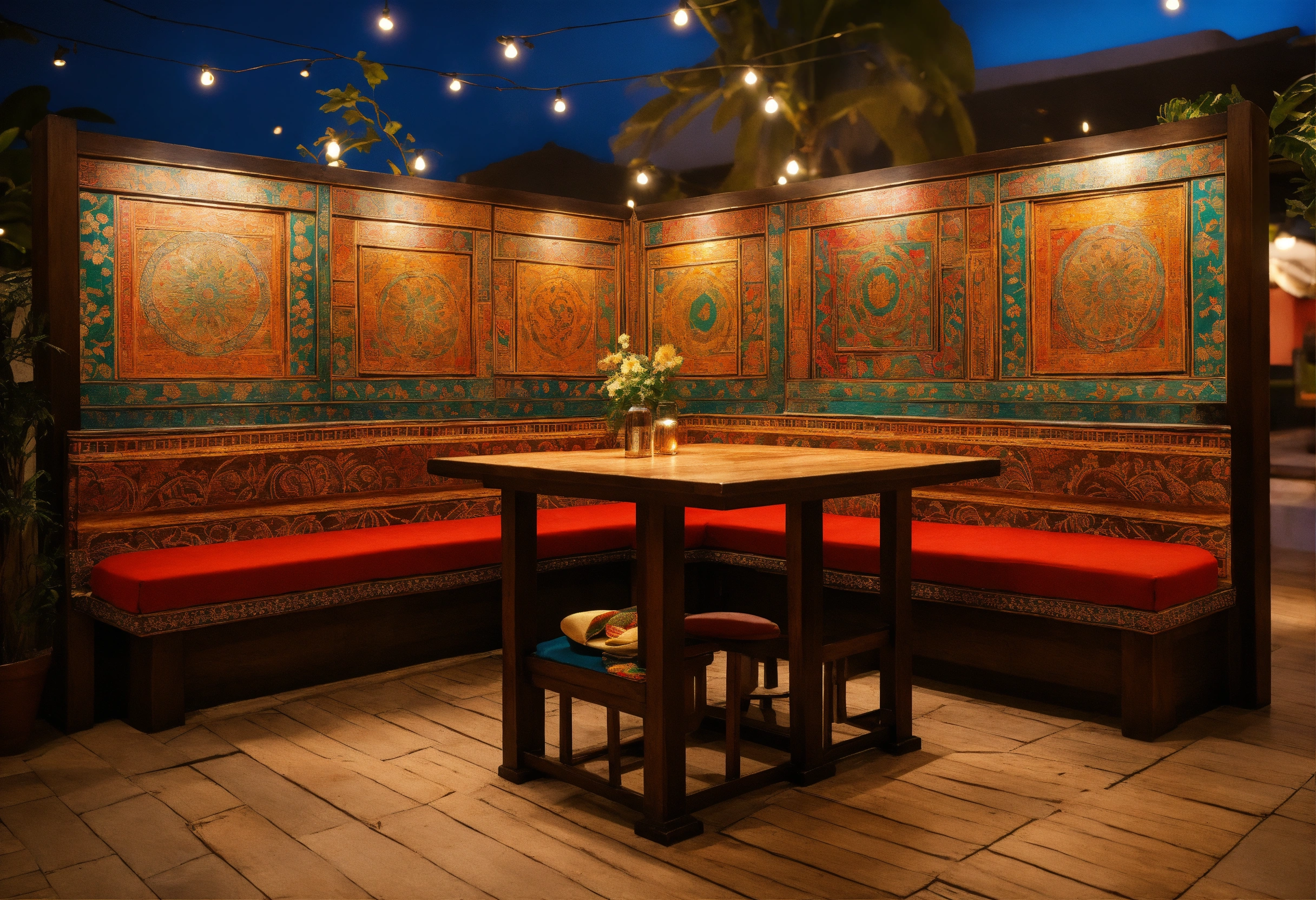 "create an image of a small wooden frame booth-style u-shaped seating table with intricate and colorful indian patterns, motifs, and decor. the design should authentically capture the essence of indian culture and cuisine, immersing diners in an inviting and culturally rich dining experience."
