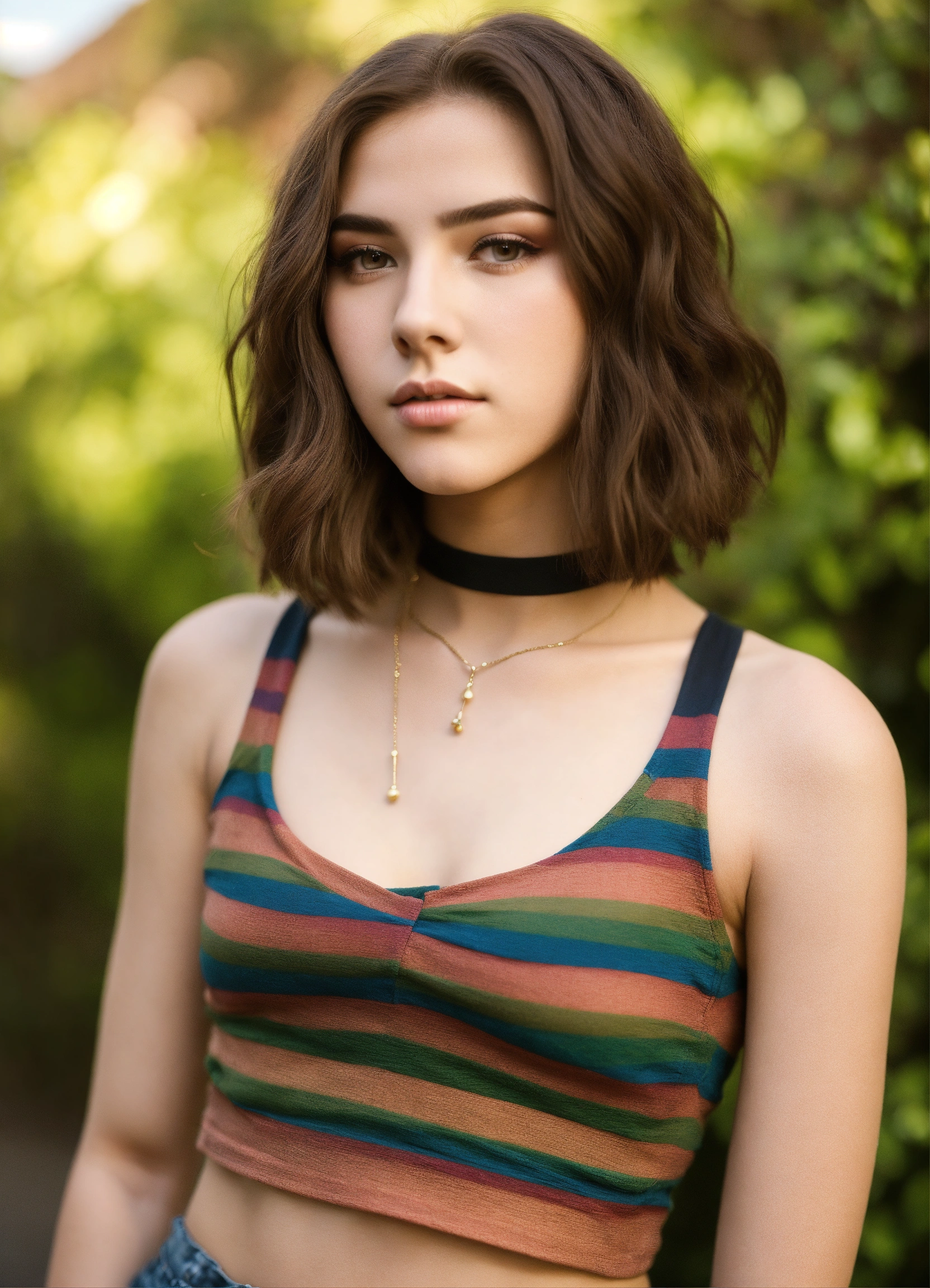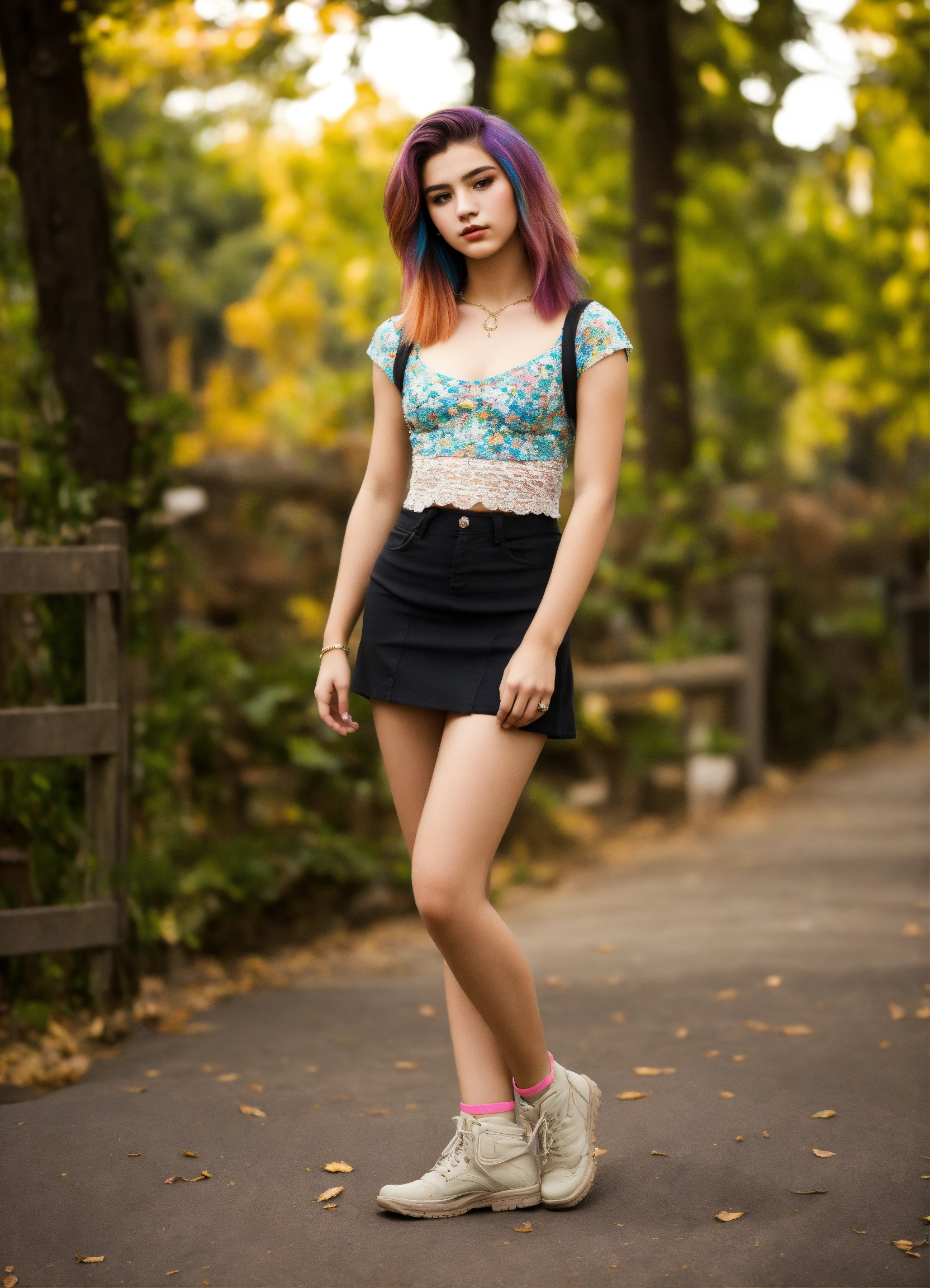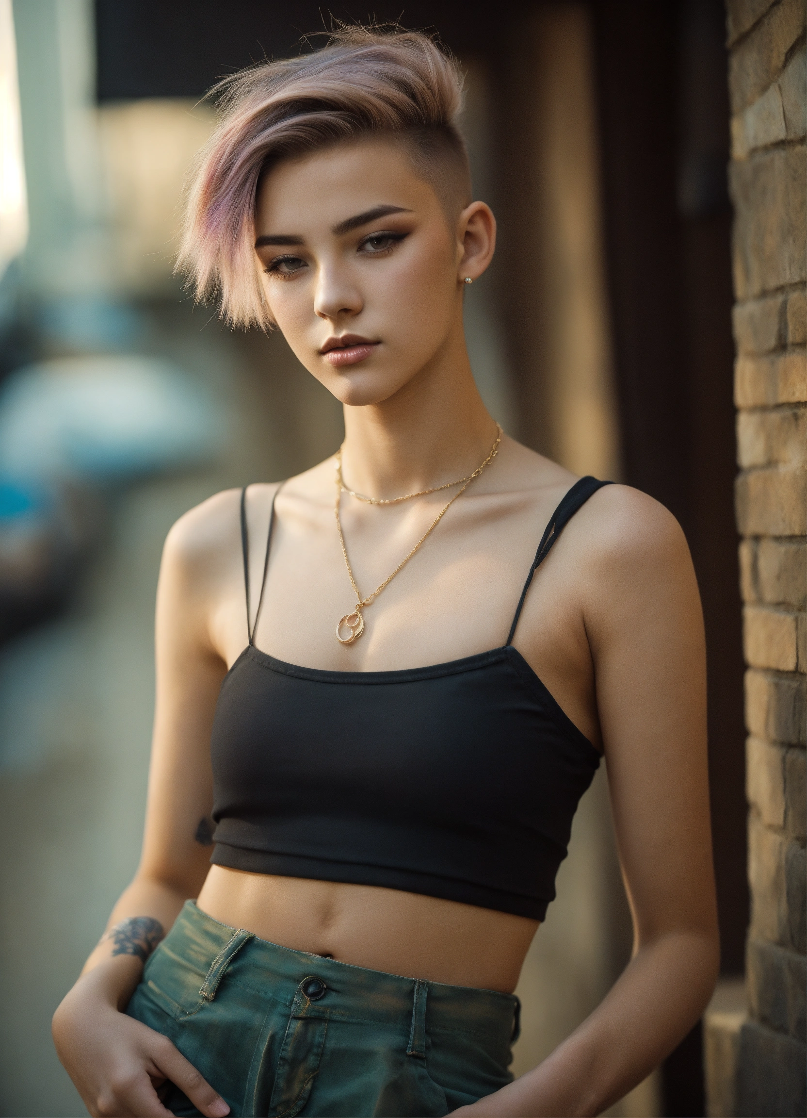 A slender 18-year-old genderqueer boy in a crop top, miniskirt. feminine features. sculpted curves. graceful pose. makeup. random hair style, color and length.