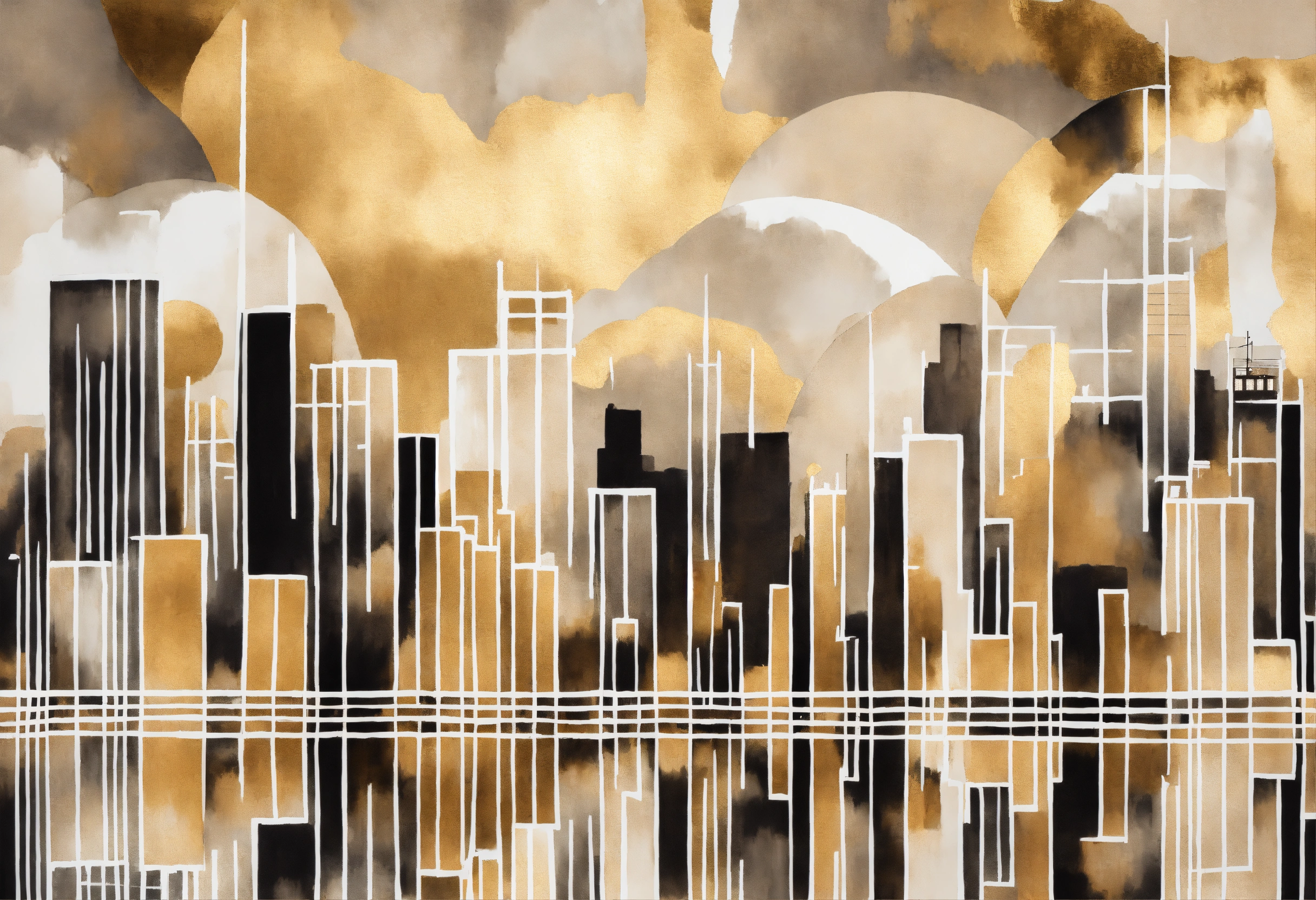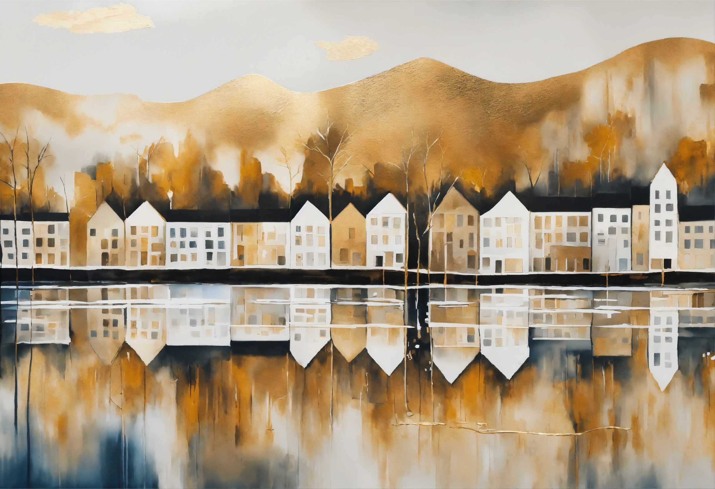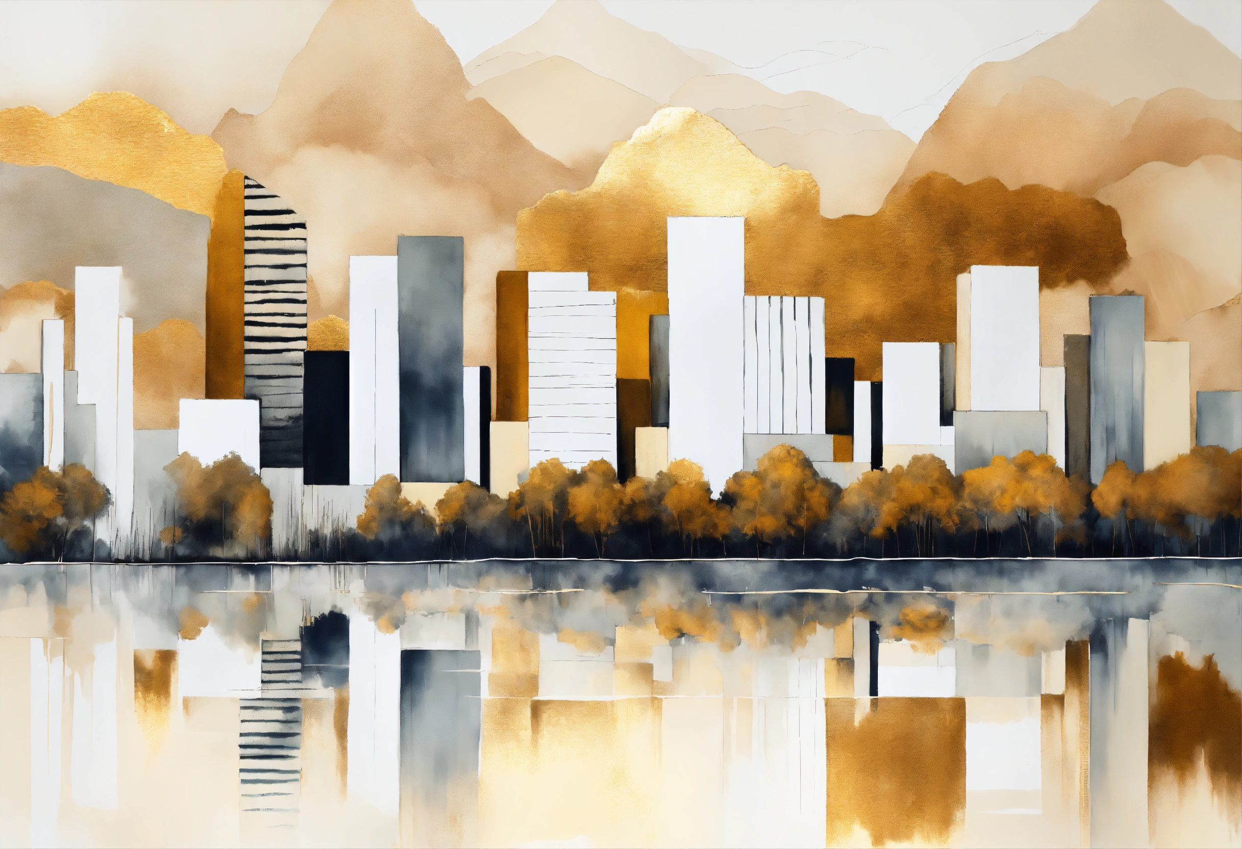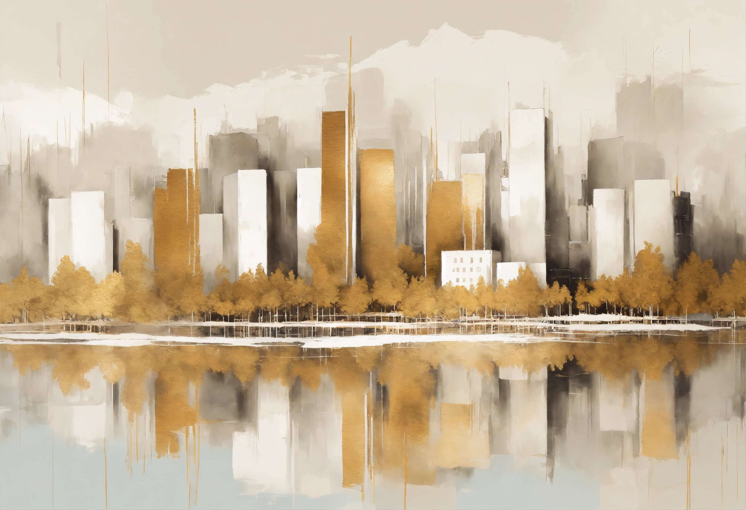 ((abstract city)), ((buildings reflected in the calm, misty waters)), ((brush strokes with acrylic paint, reliefs with texture, rustic but soft art)), stylized art, abstract, creative art, soft monochrome colors, shape, lines, white colors, simple, contemporary, modern, chic pattern, scandinavian modern art, minimalist, lines, super minimalist, hand-drawn, line brushstroke, mountain, leaf pattern, line art, neutral colors ((white buildings and buildings with gold metallic accents)) ((white background, studio lighting)) high-resolution digital art, studio art, soft, neutral colors