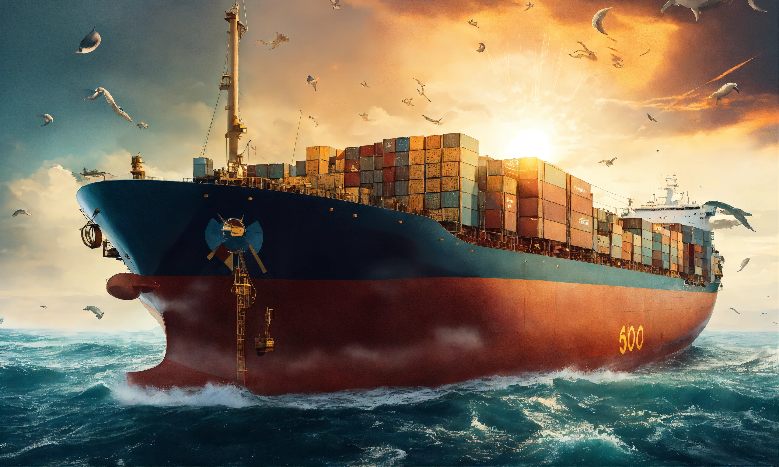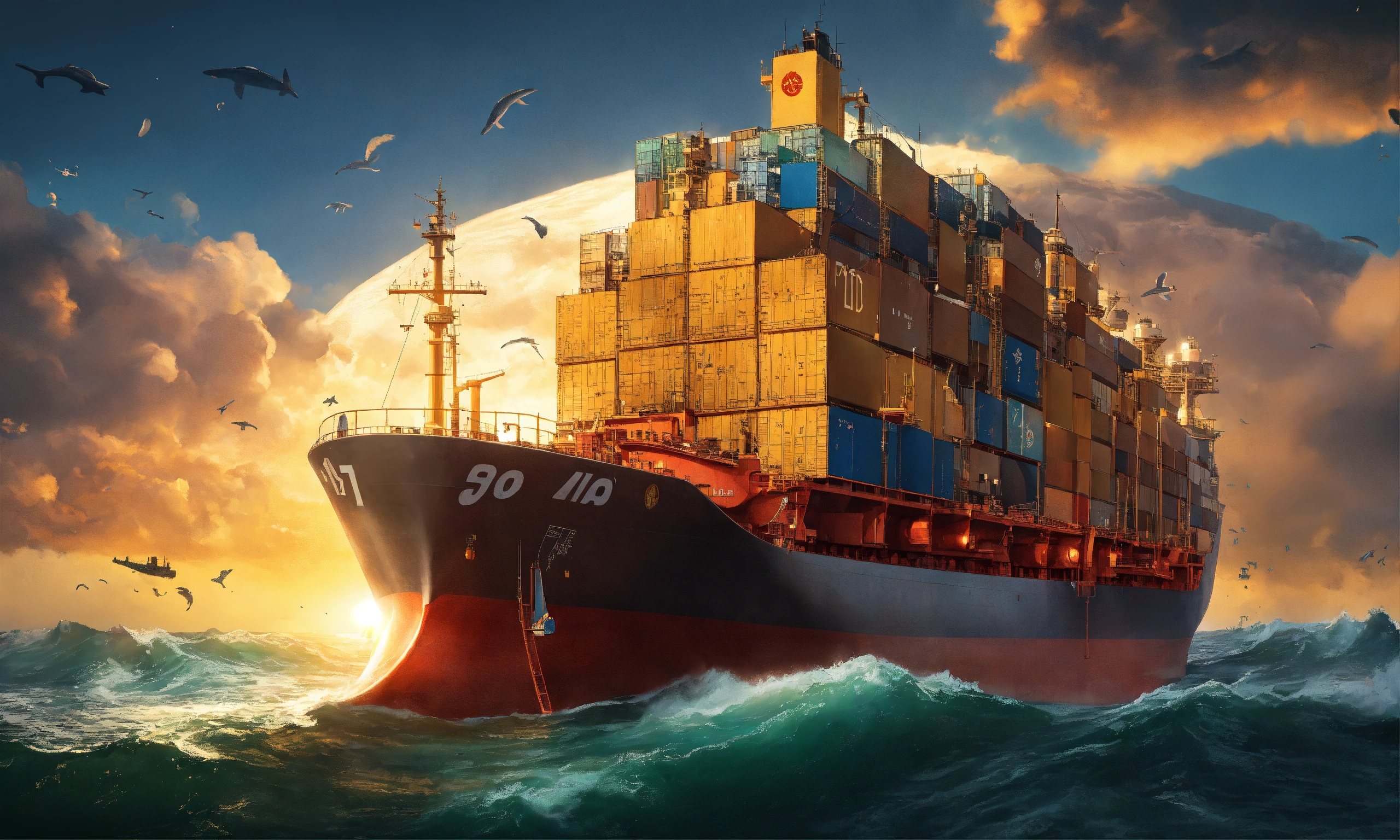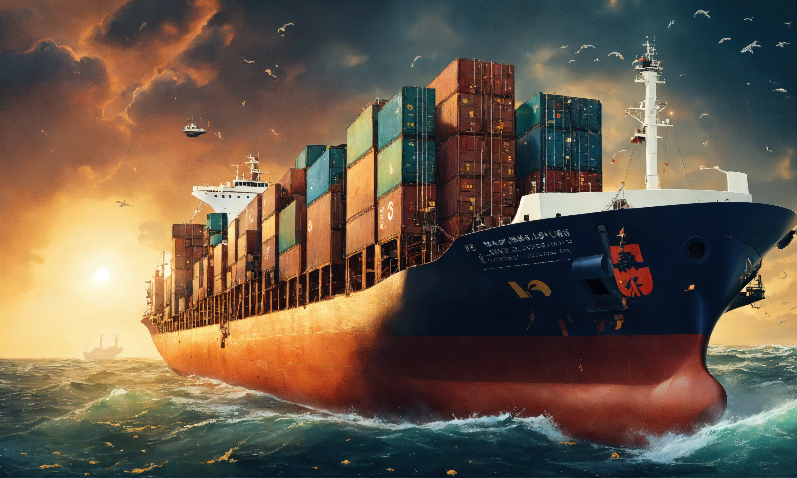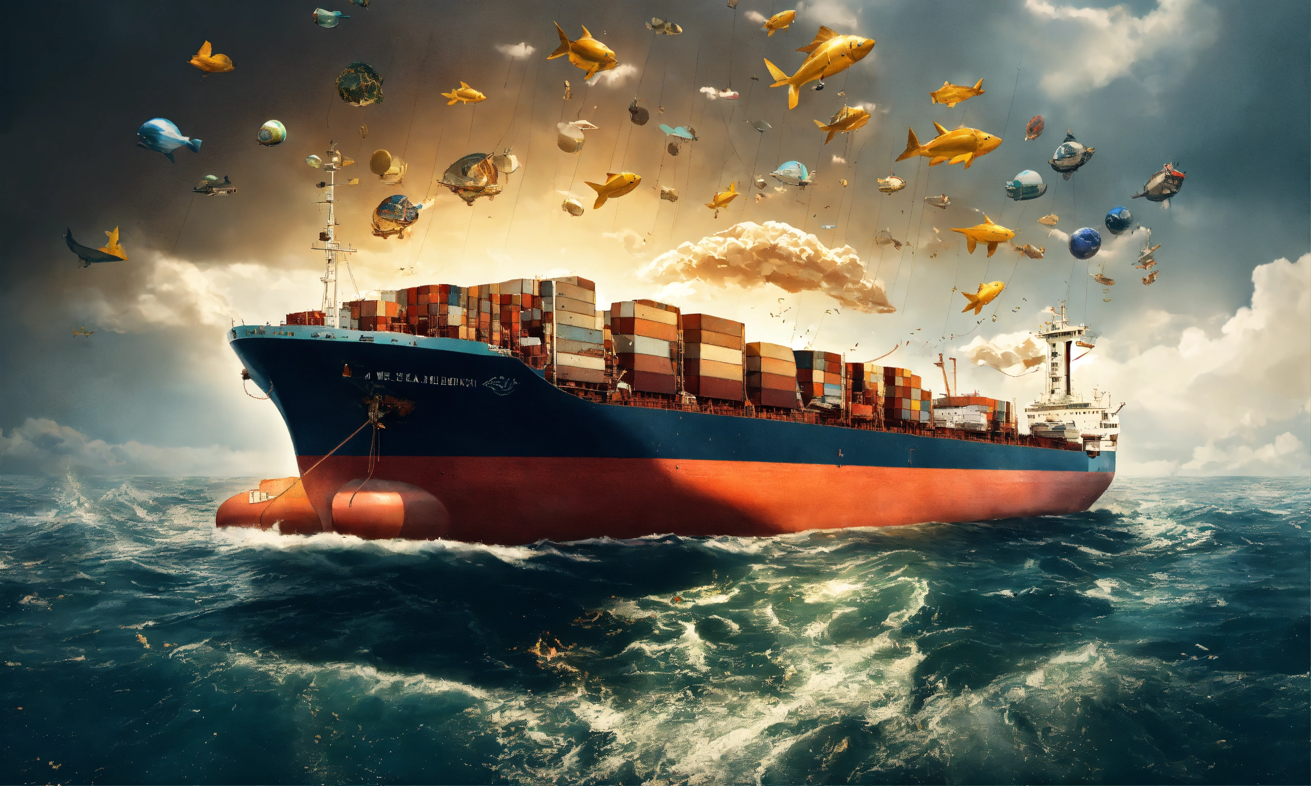 A massive tanker ship that is struggling to change its course, symbolizing the difficulties large organizations face in adapting to new opportunities. the ocean is filled with various symbols like a treasure chest, a storm cloud, and a bright sun to represent risks and opportunities.