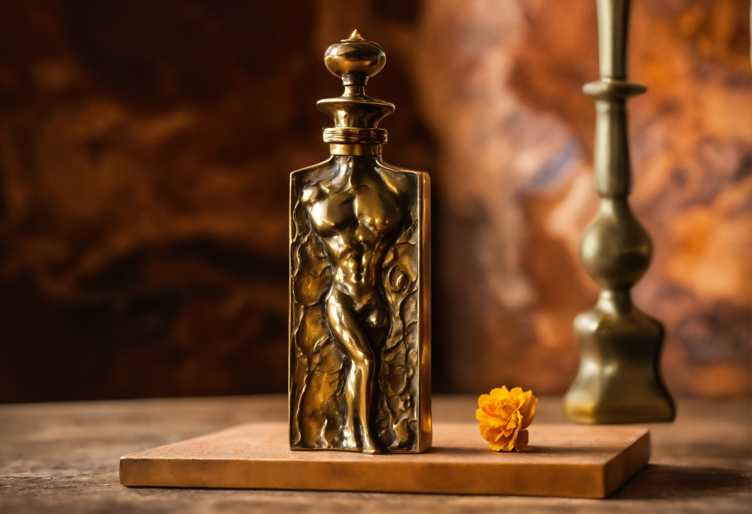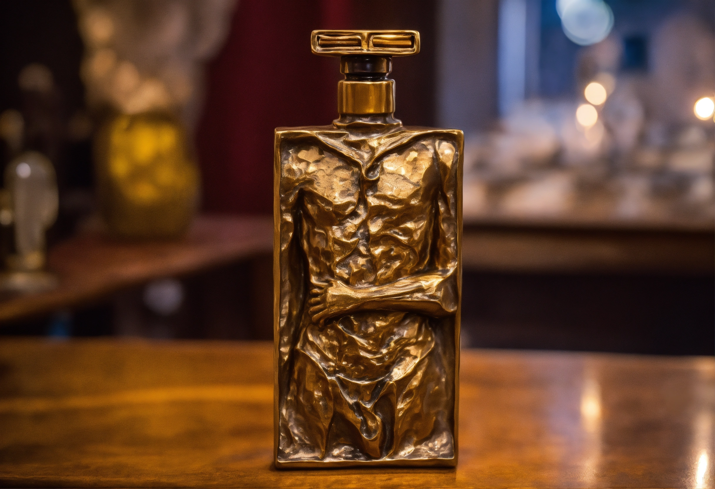 Hand-made bronze sculpture, perfume bottle representing man body, immersive- experience inside and out, captivating and passionate universe, egon schiele the painter inspiration