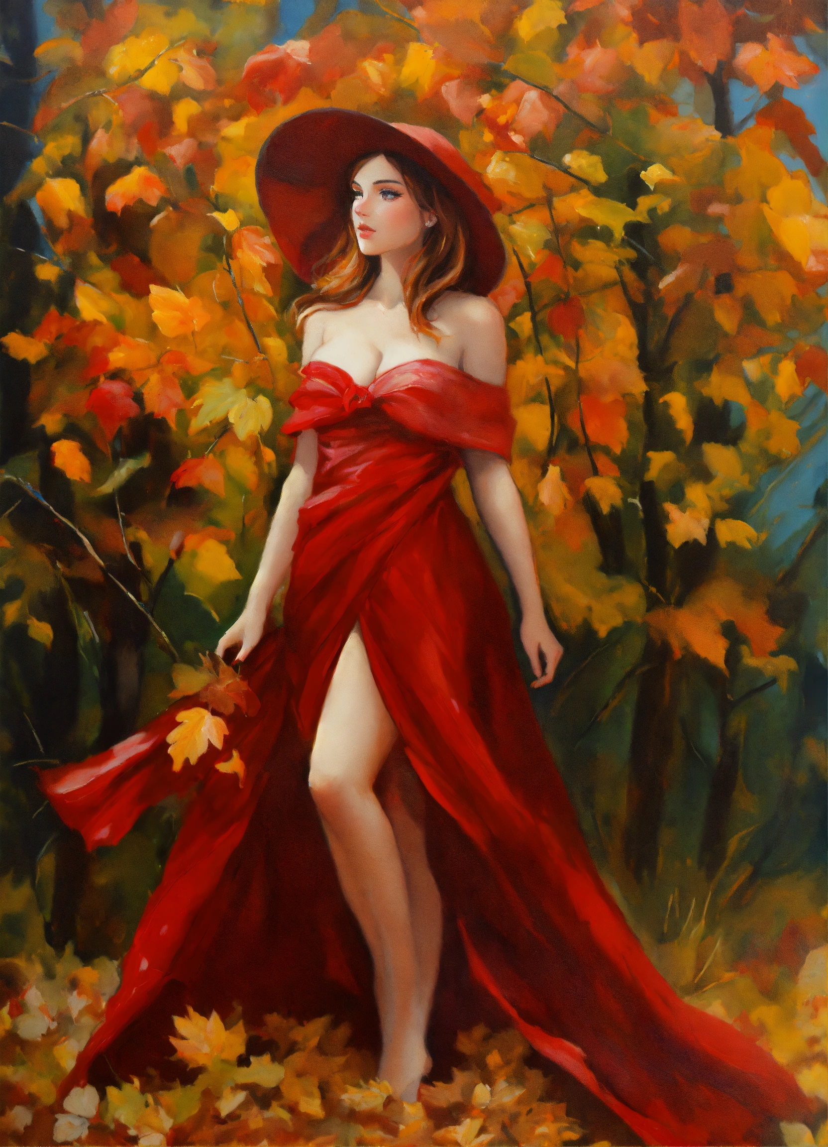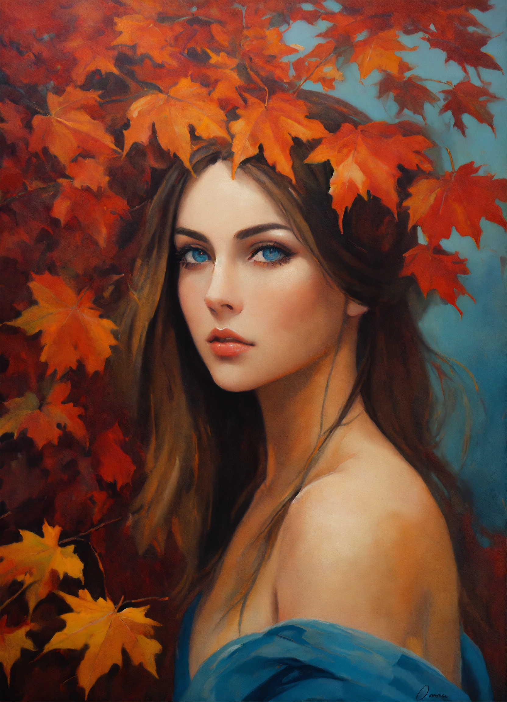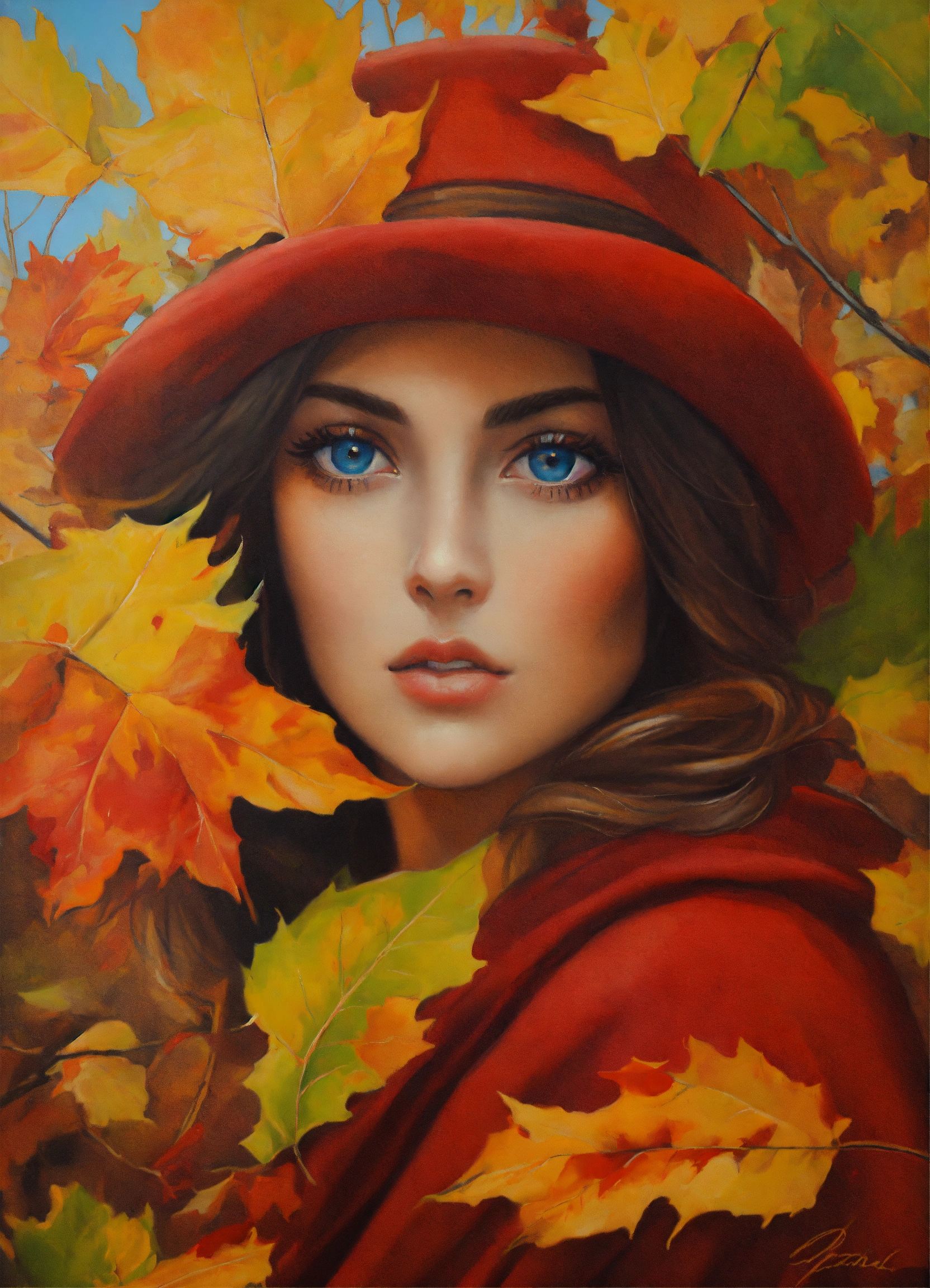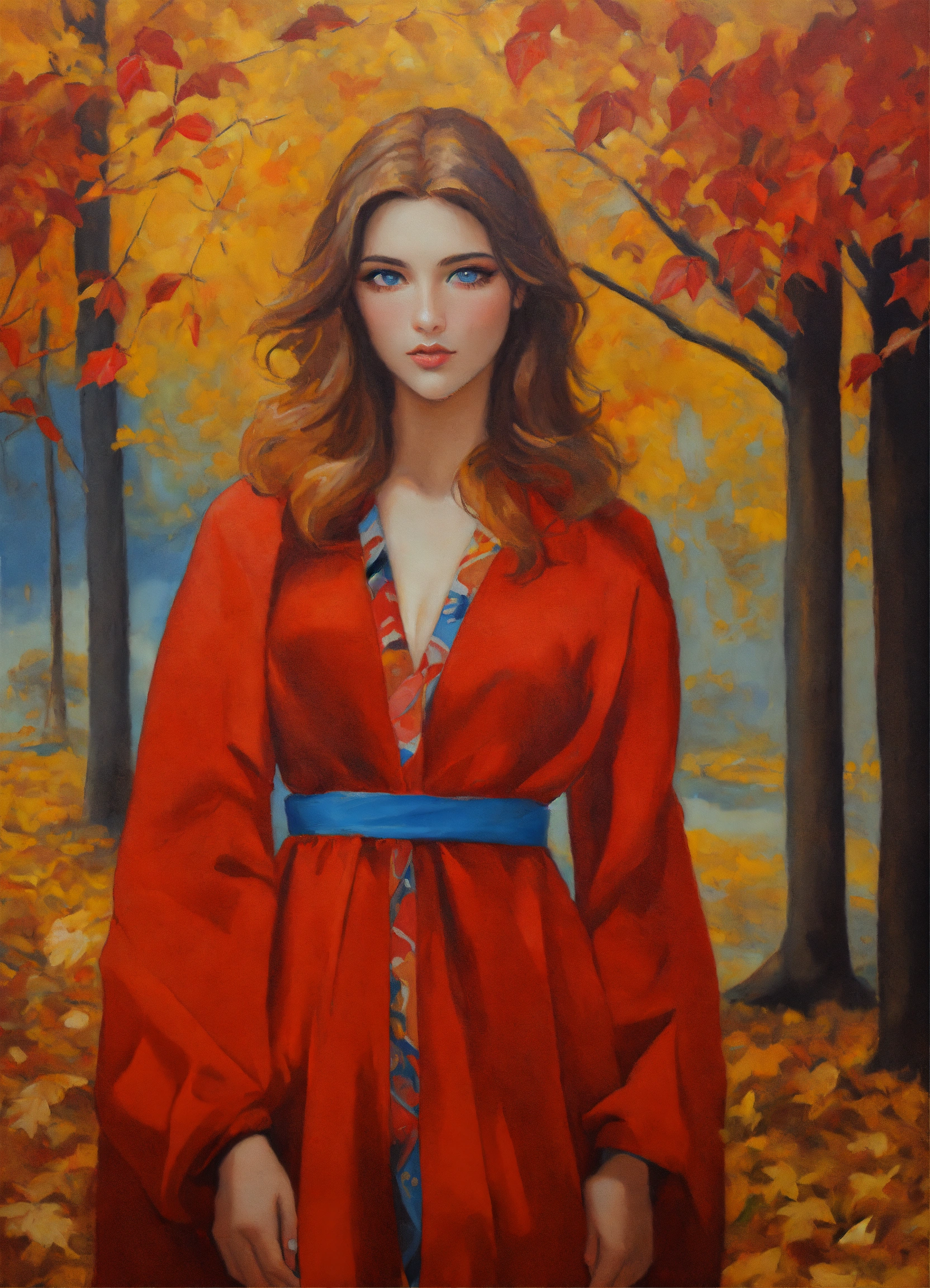 Oil painting donna matura con grandi occhi azzurri in autunno rosso