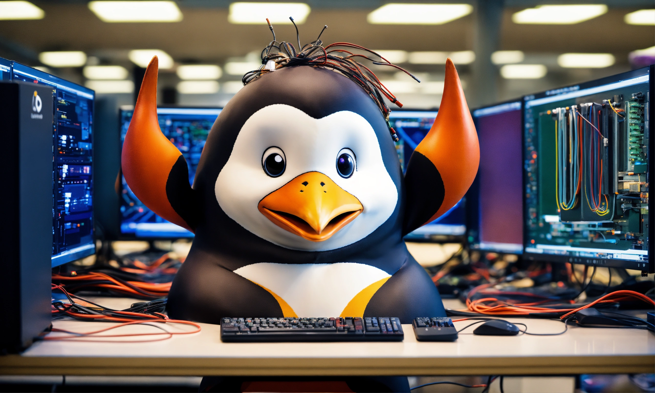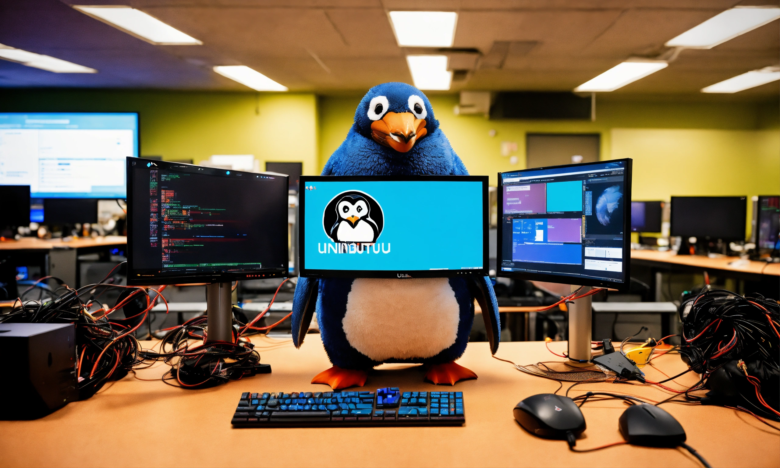 A penguin dressed up as a minotaur, in a computer lab with messy wires and lots of monitors displaying the ubuntu linux logo