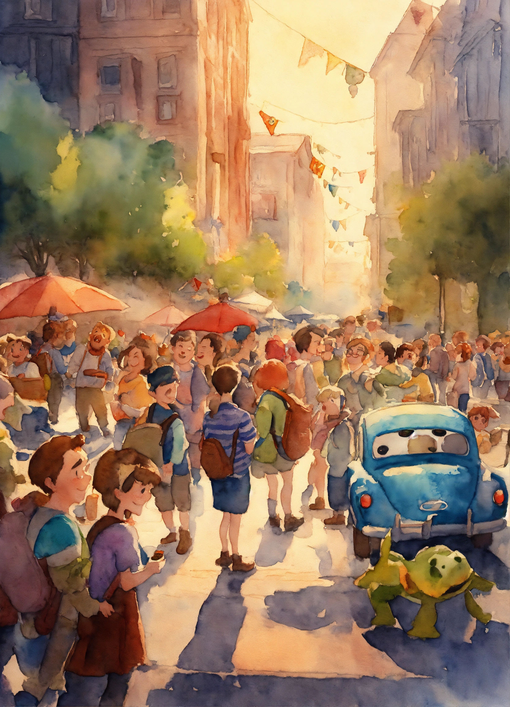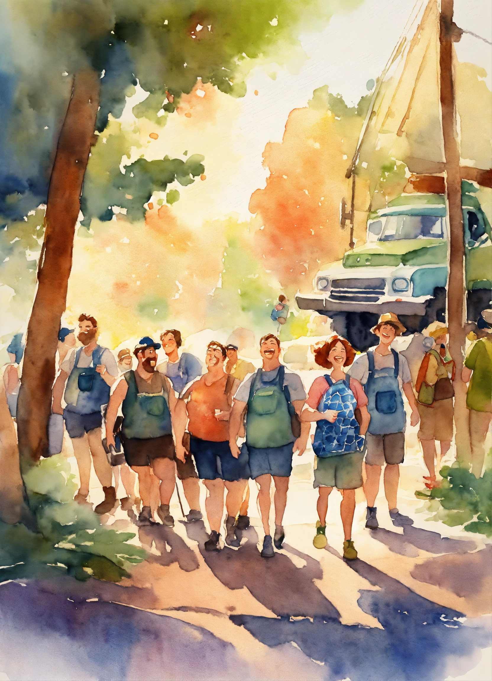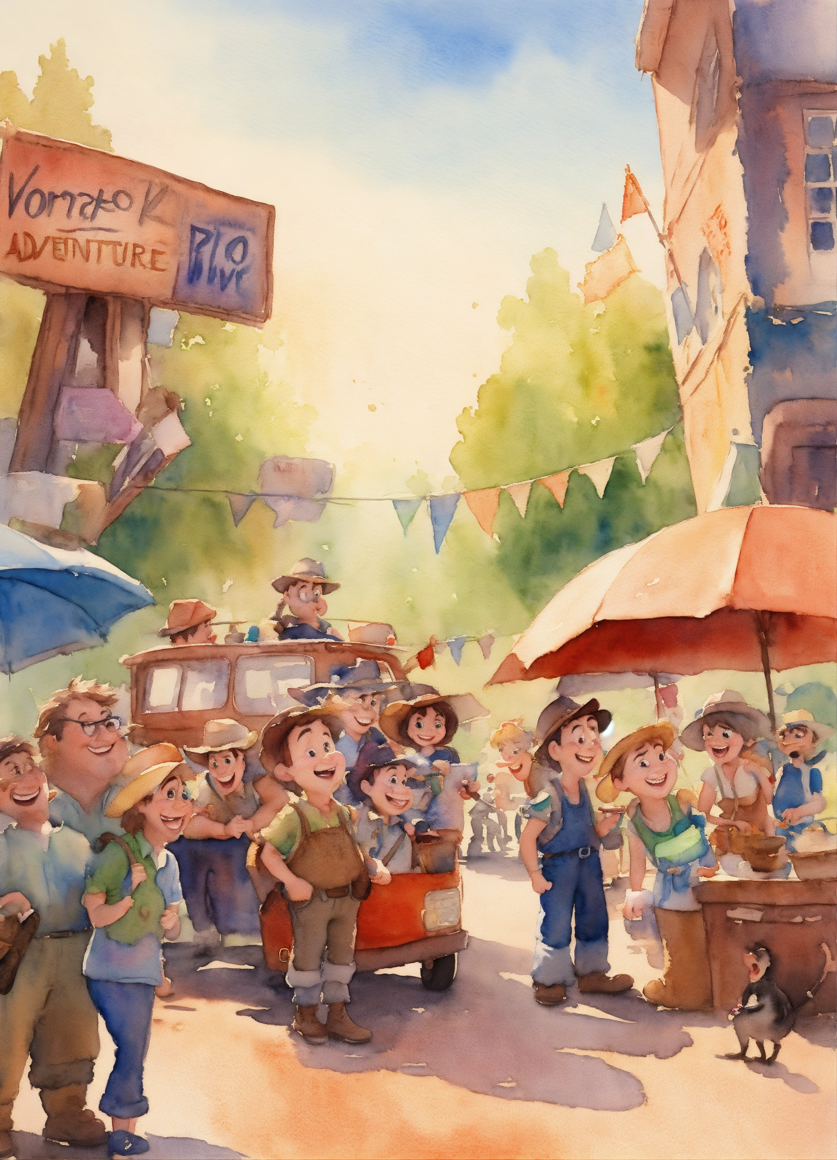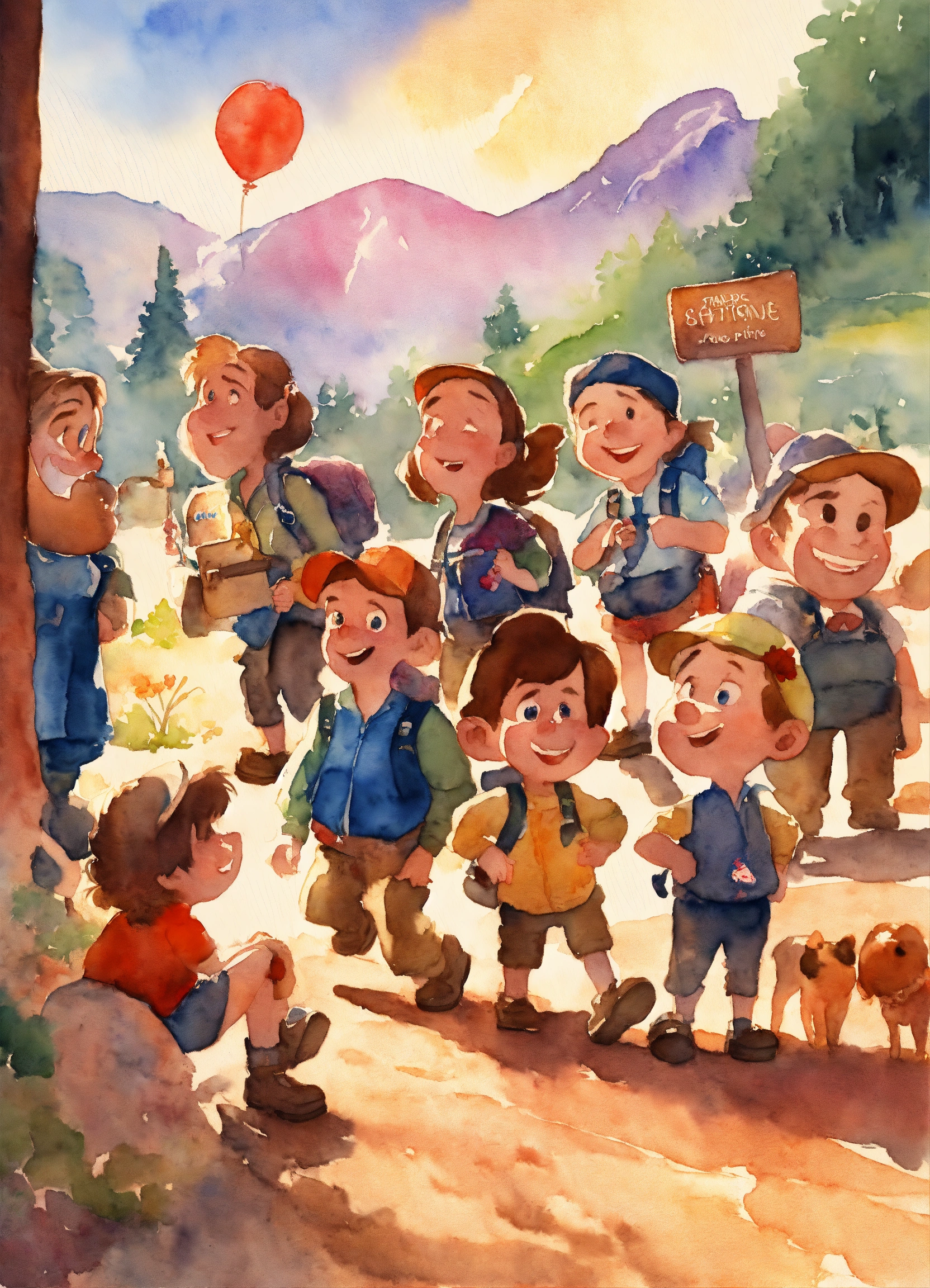 Watercolor pixar painting of participants gathering at the starting point, their smiles reflecting their voracious appetite for adventure, watercolor pixar style cartoon