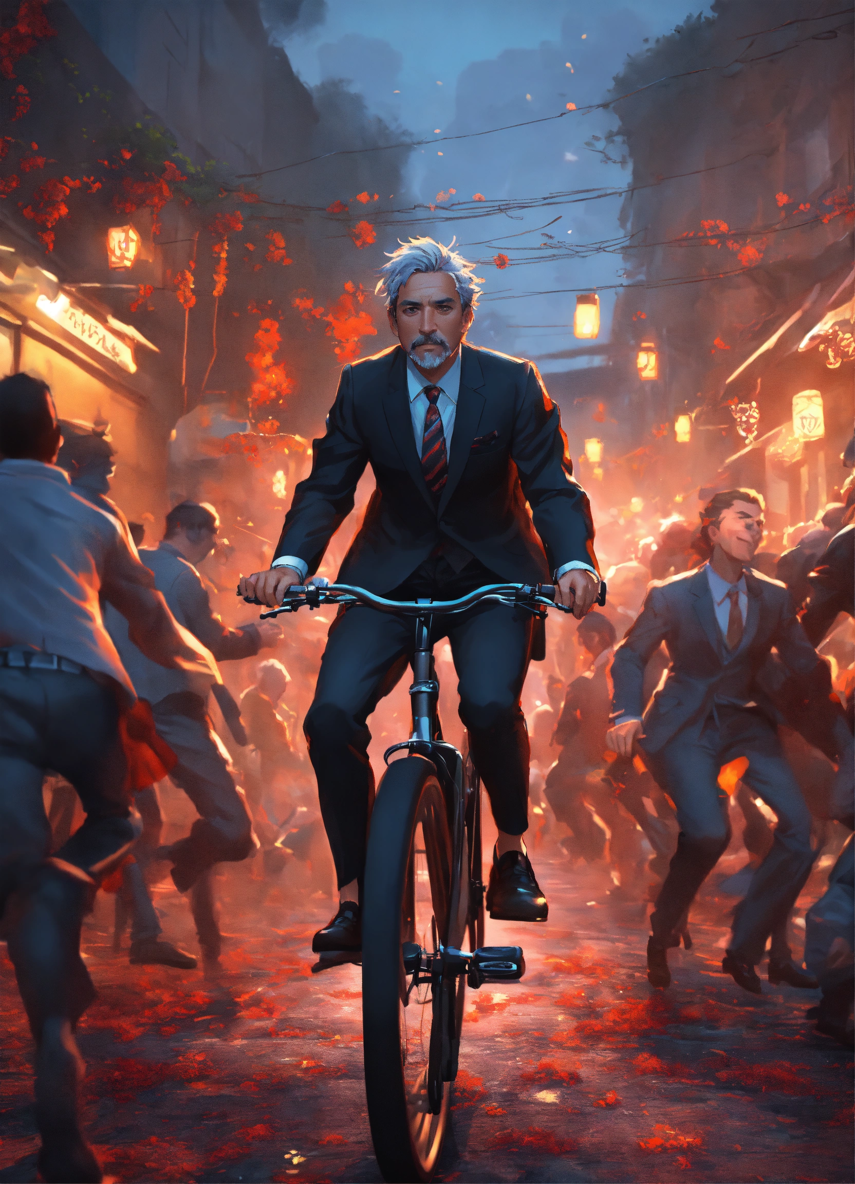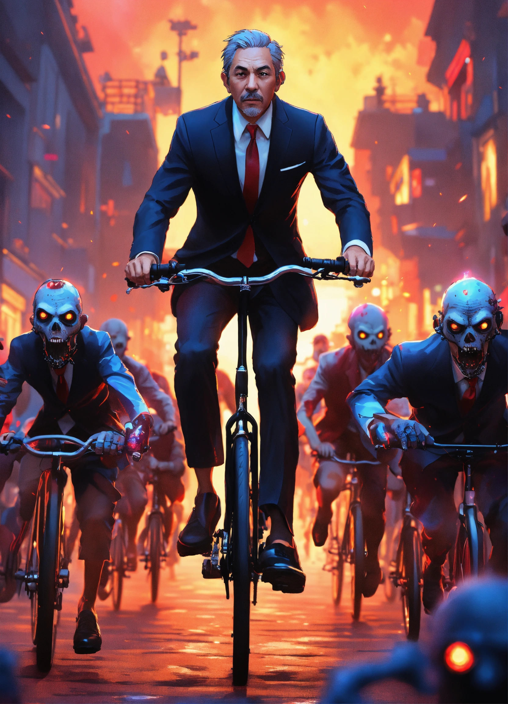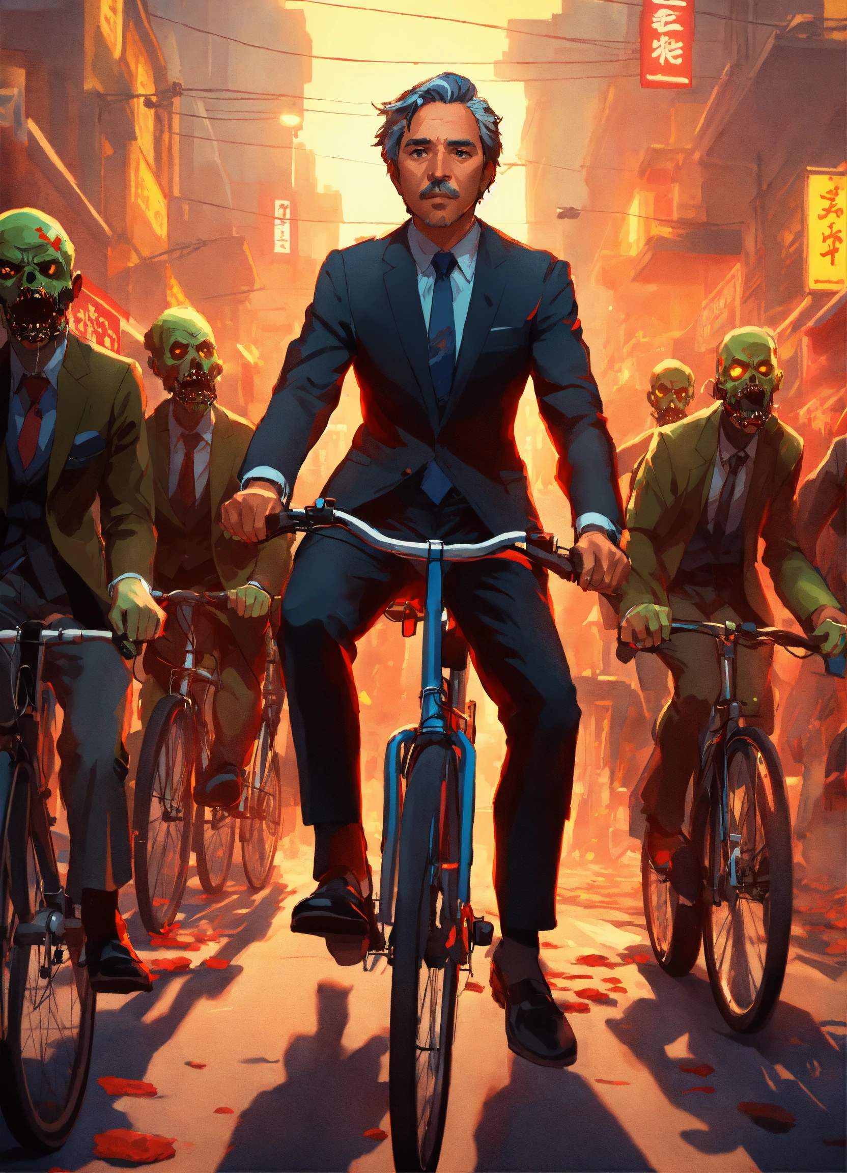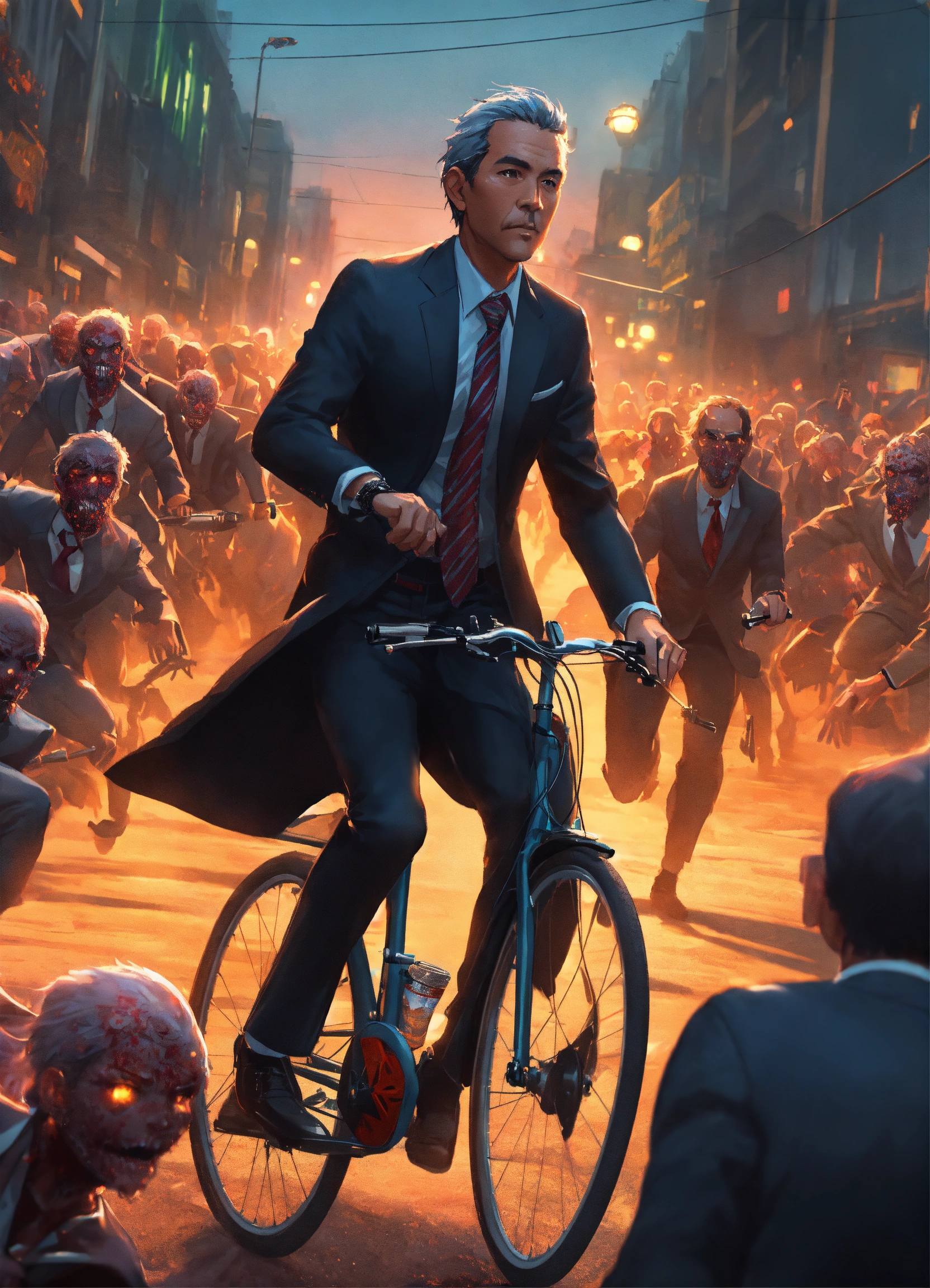 A middle-aged man in an elegant black suit and tie rides on a small bicycle towards the camera, he is being chased by a horde of zombies, anime art by studio ghibli, stunning, vibrant, 8k resolution concept art, artgerm, dynamic lighting hyperdetailed intricately detailed splash art trending on artstation triadic colors unreal engine 5 volumetric lighting