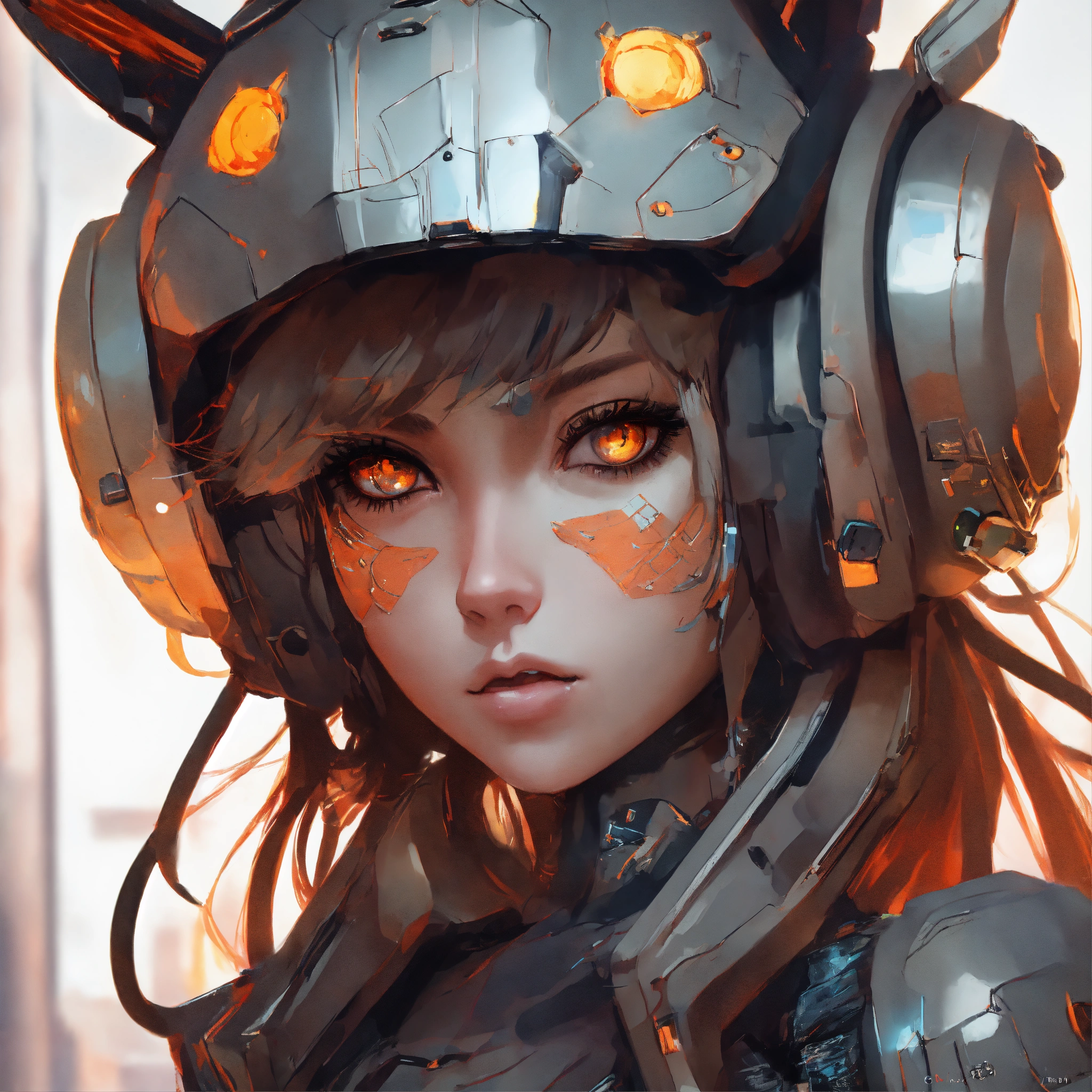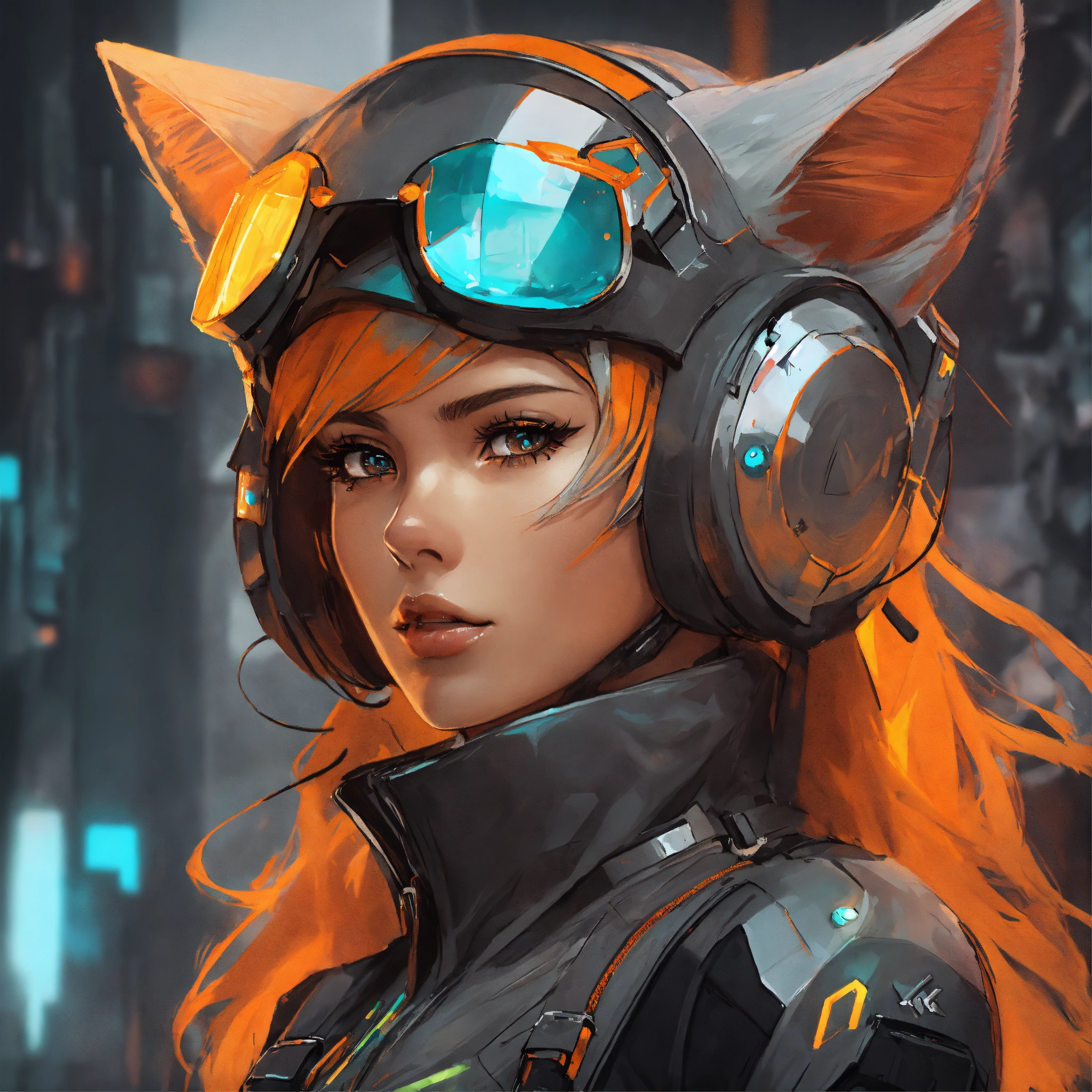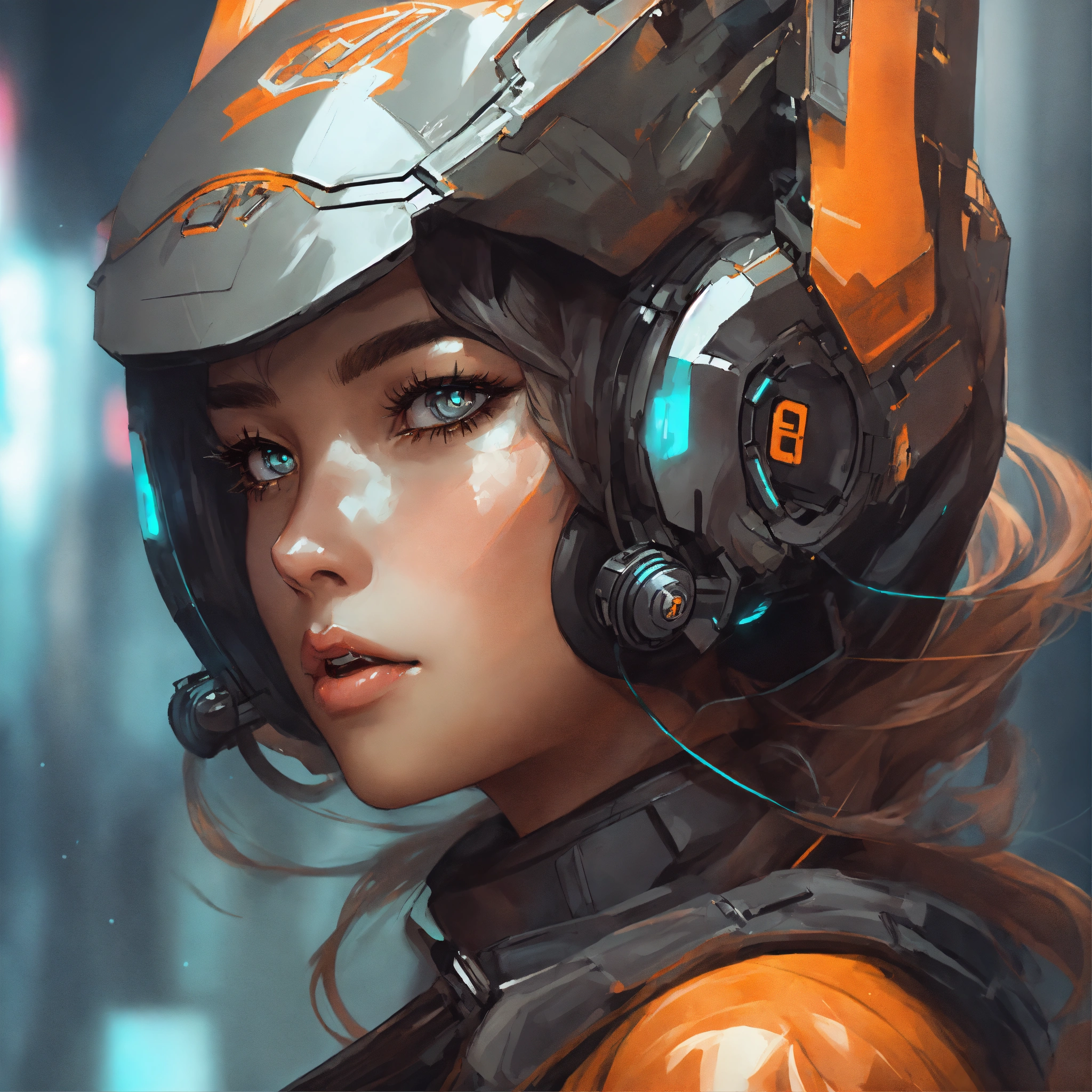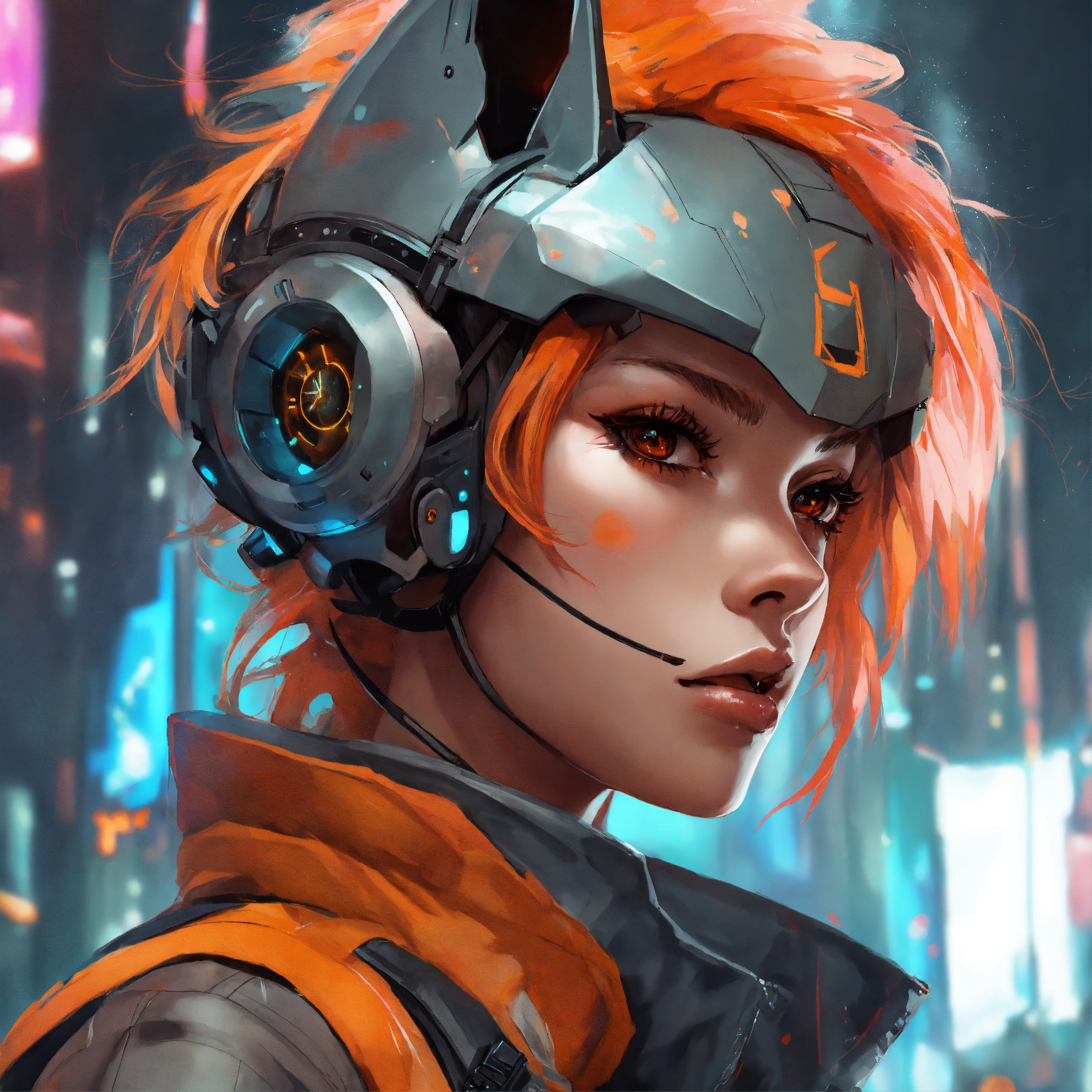 Abstract style anime art of a cyberpunk girl, 8k, side on head shot, futuristic headware, aggressive cat like eyes, stunning intricate details, muted colours, dark grey, orange, light grey, by artgerm