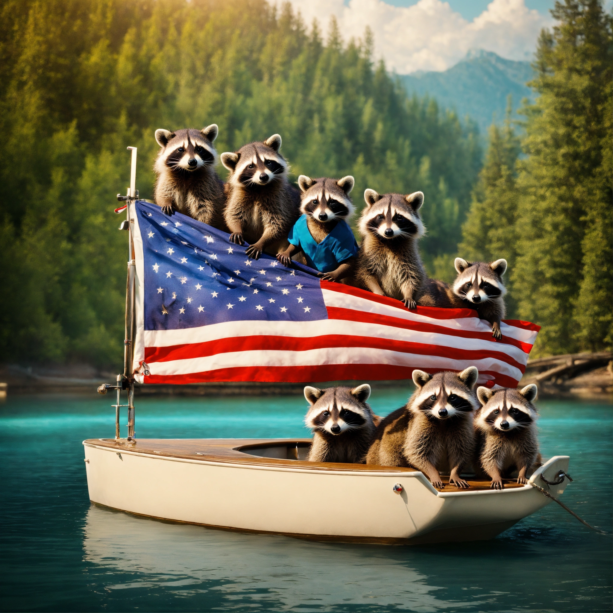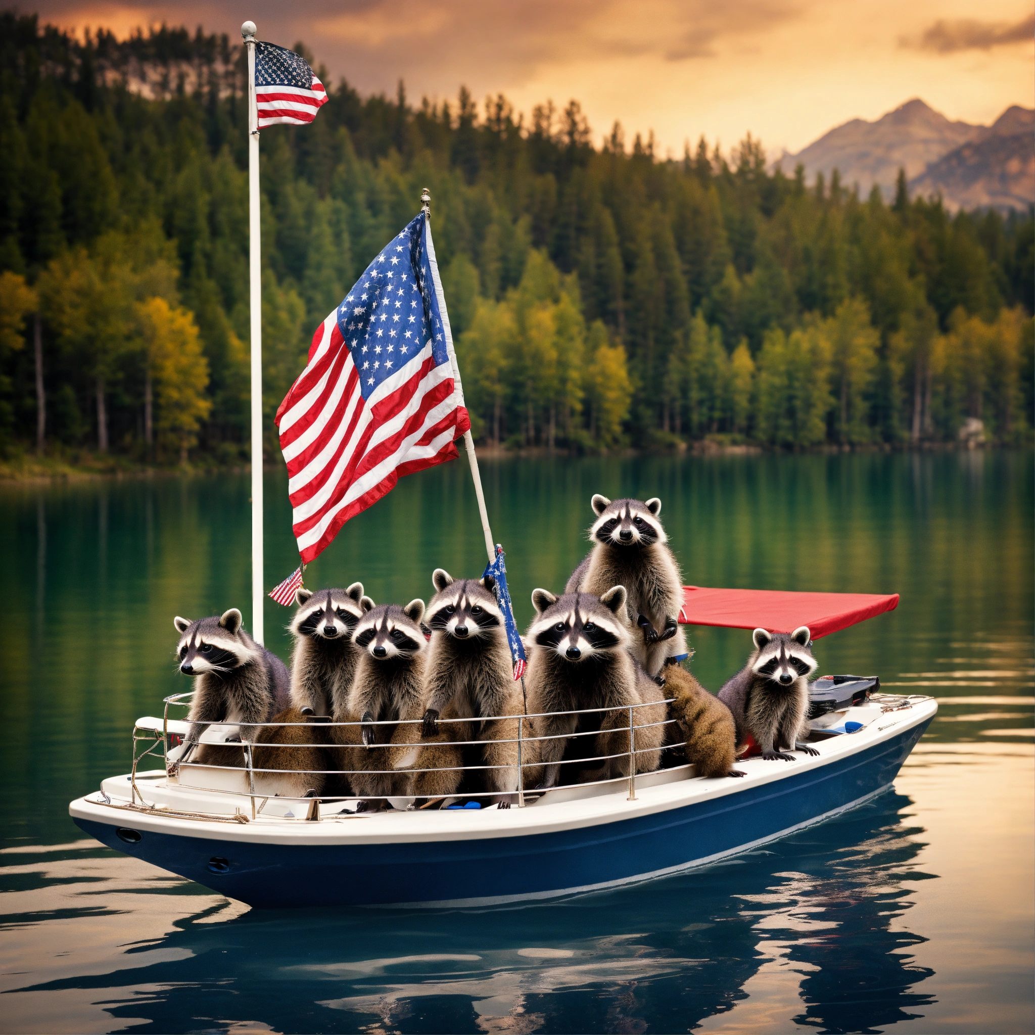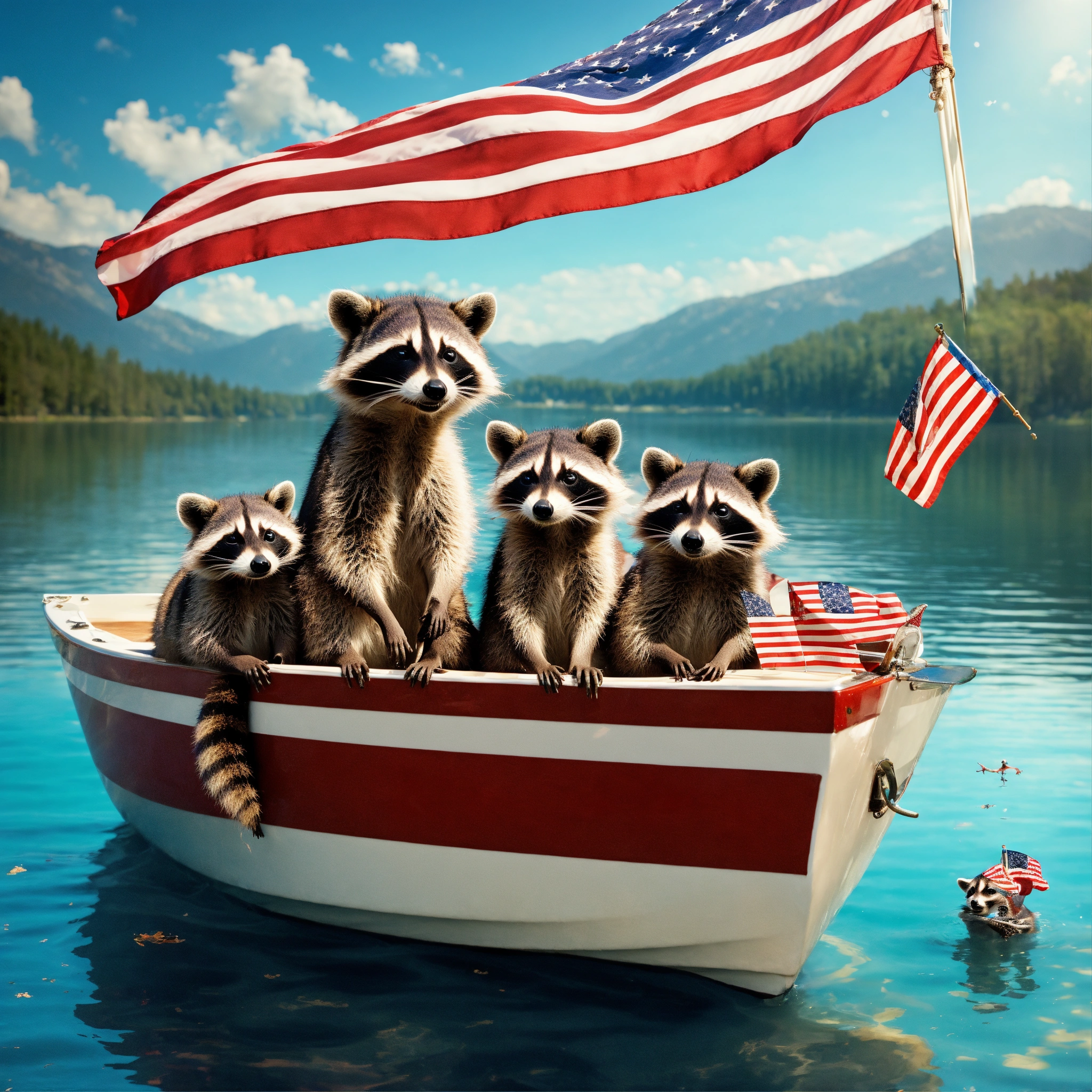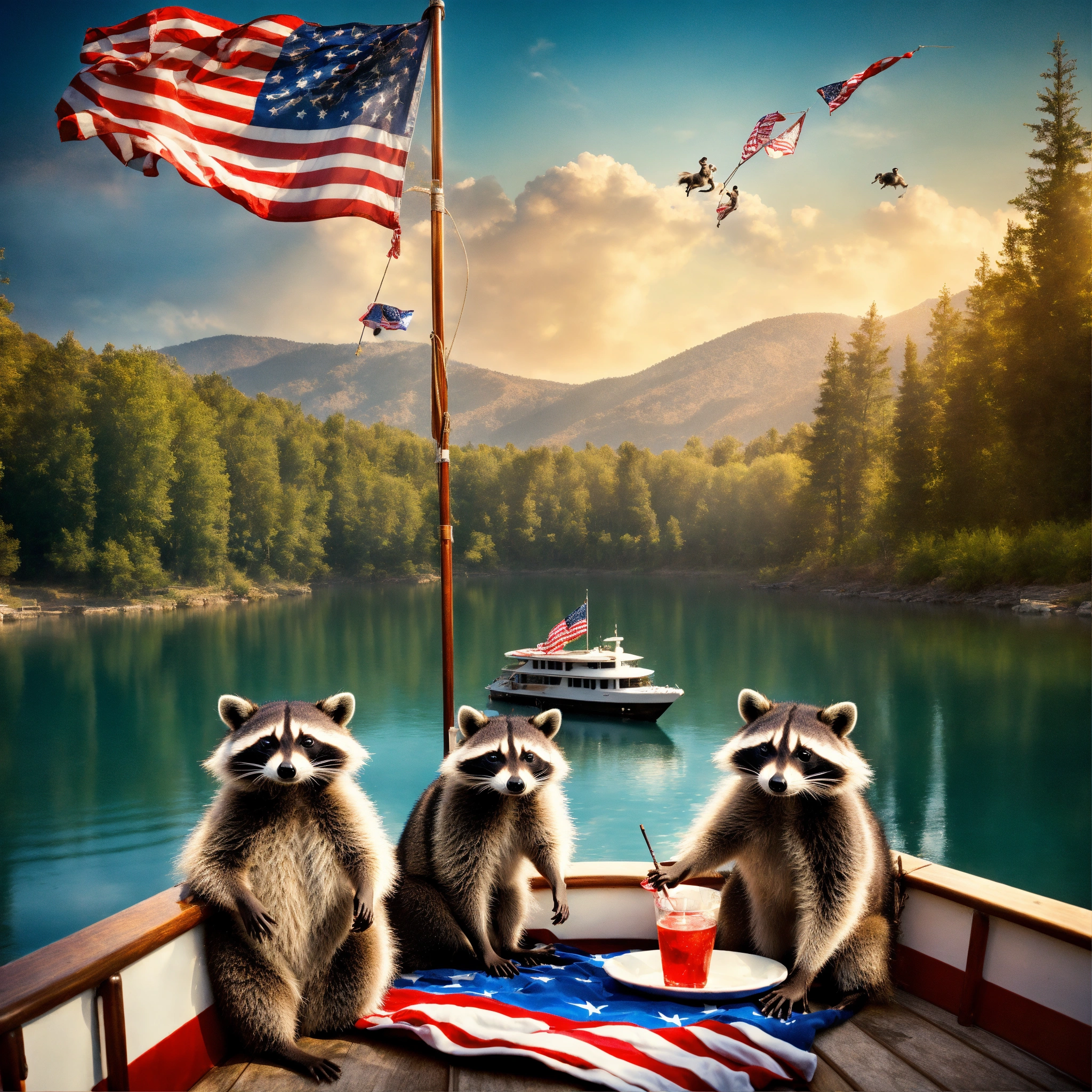 A raccoon family celebrating american labor day on a yacht in a gorgeous lake with the american flag, surreal