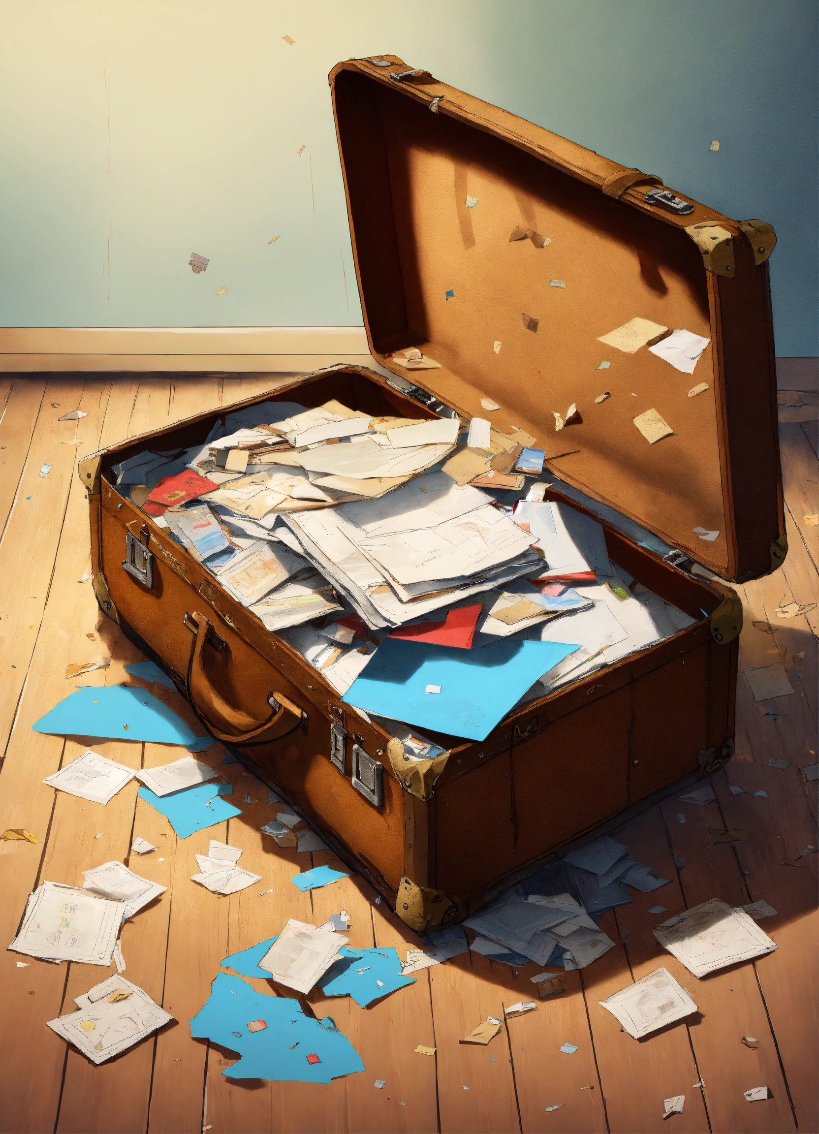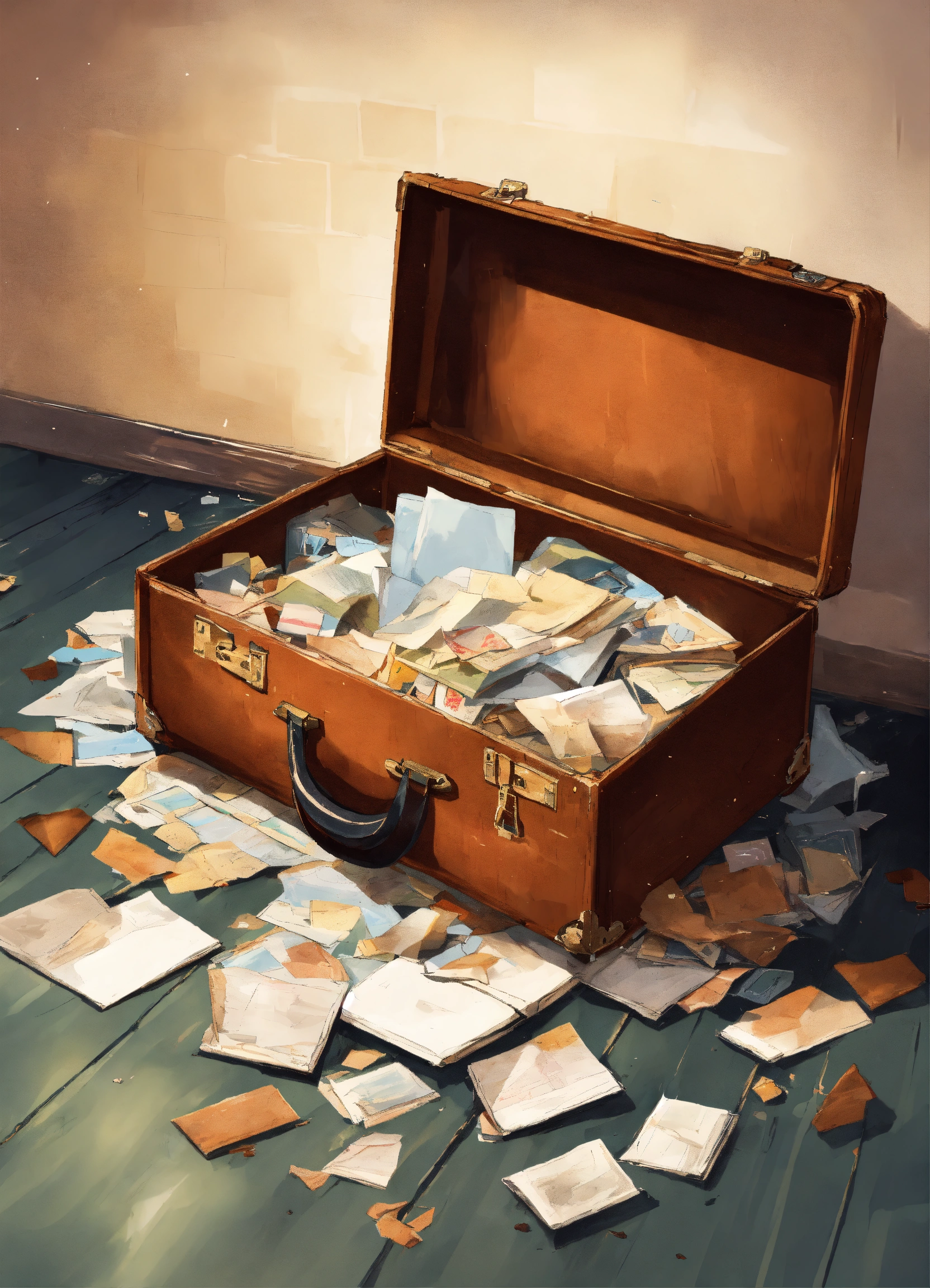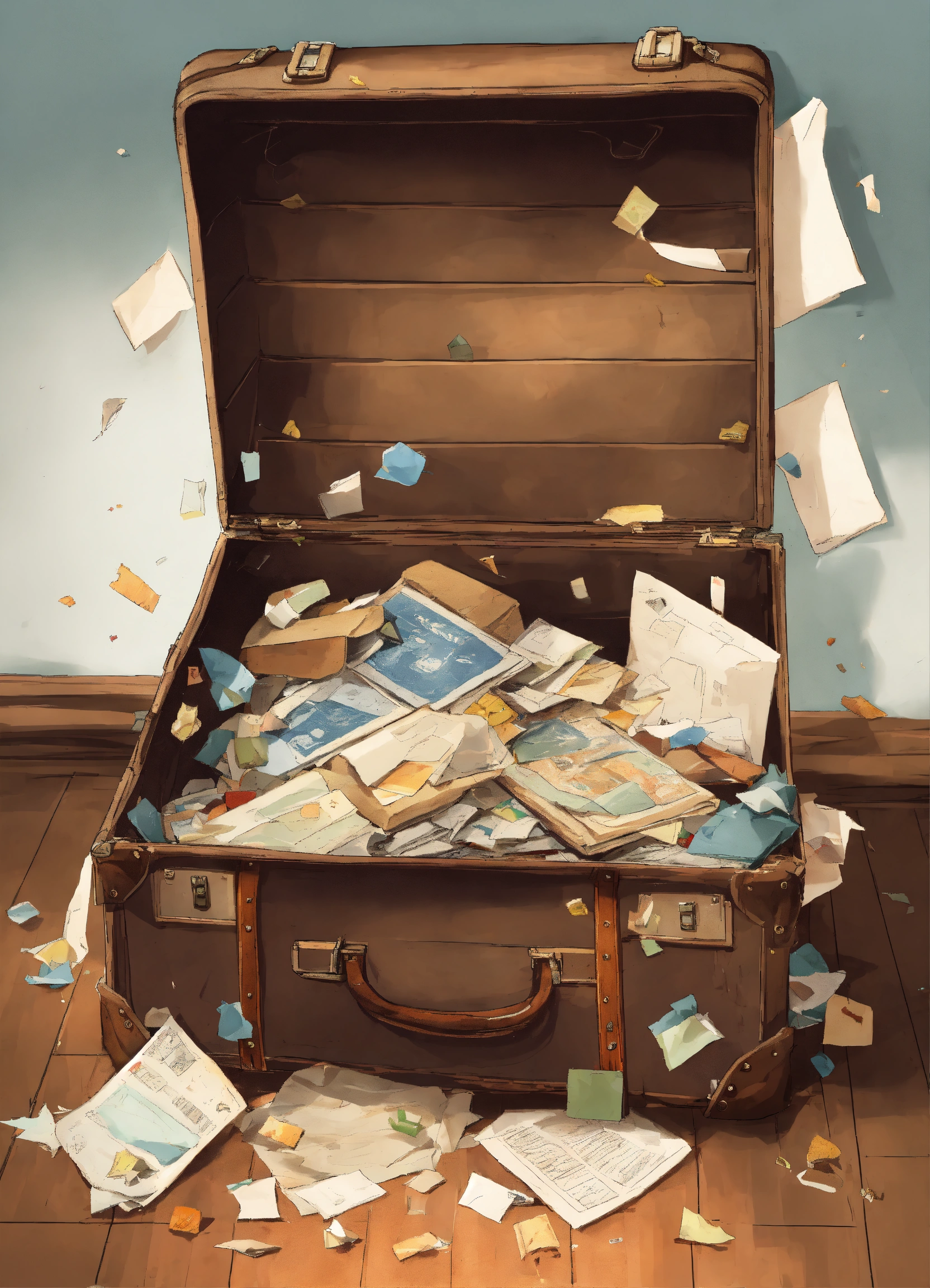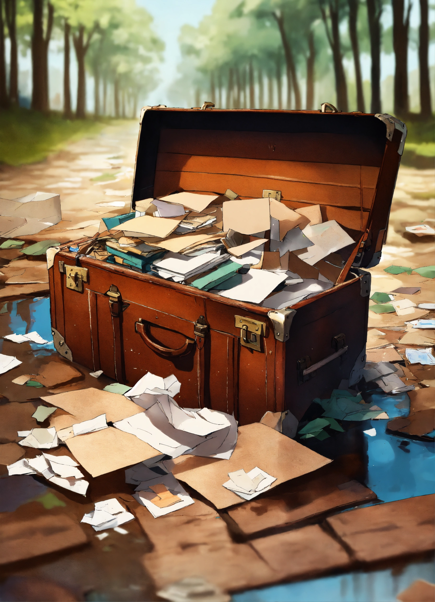 A drawing of an opened old wooden suitcase with lot of paper pieces in a puddle on the floor
