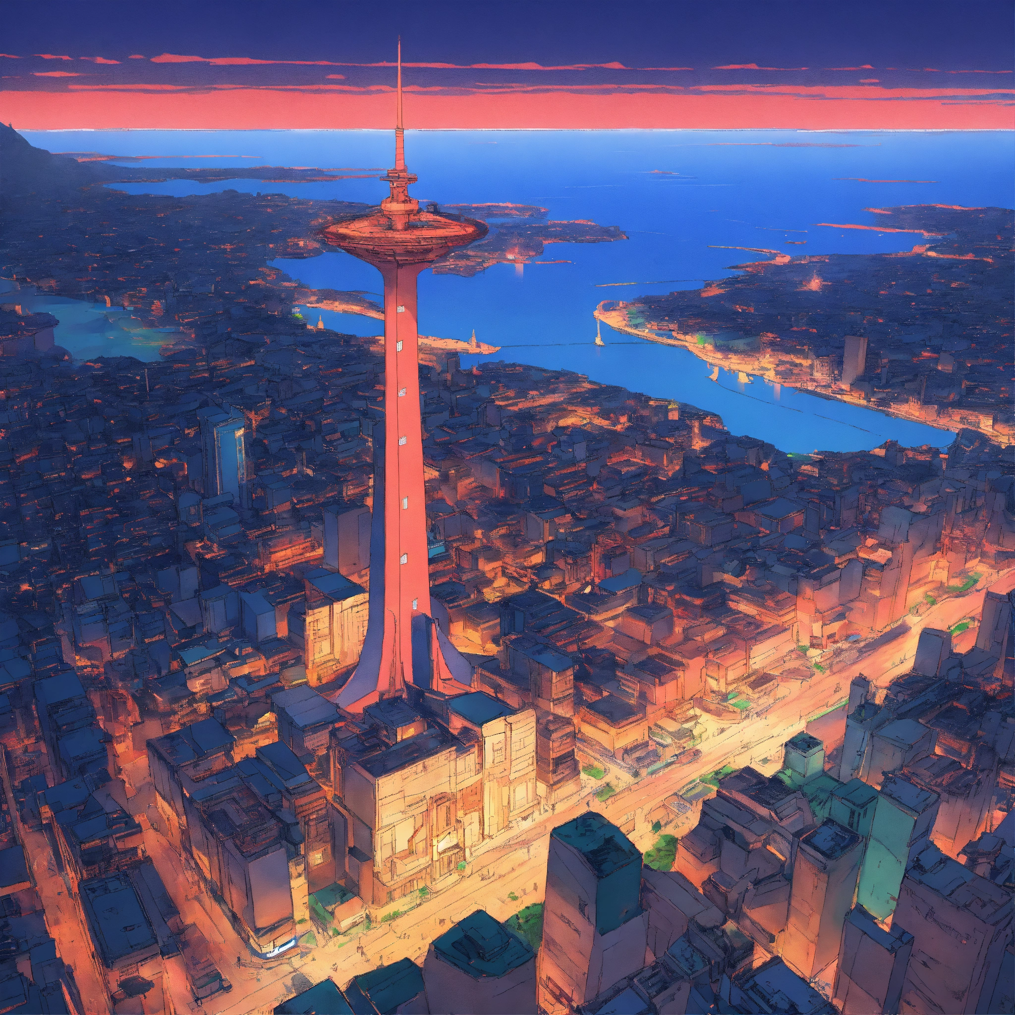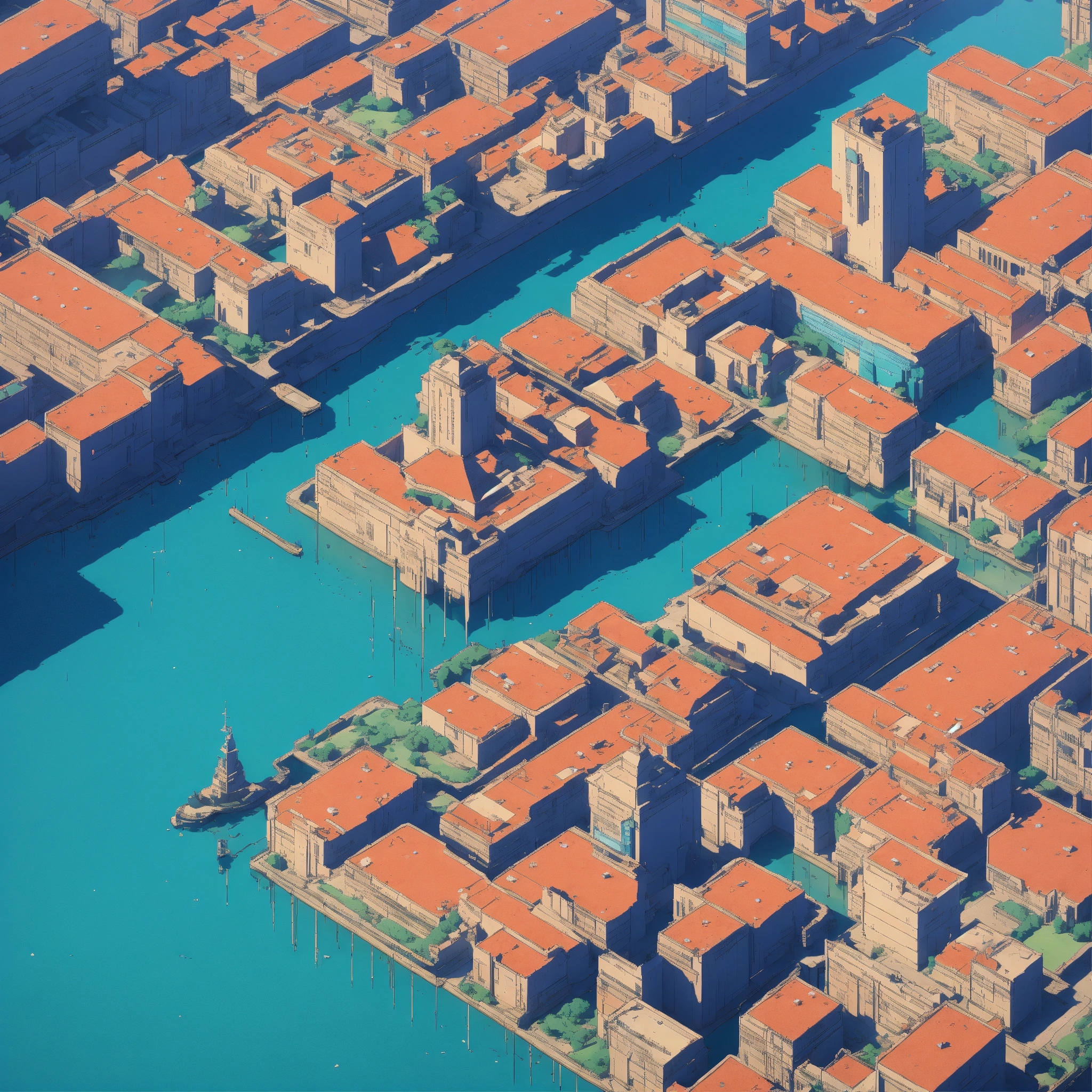 The city of atlantis but with in a throwback animation shot from evangelion, a 90's anime. contemporary minimalism. viewed from above. i want the color blue more present.