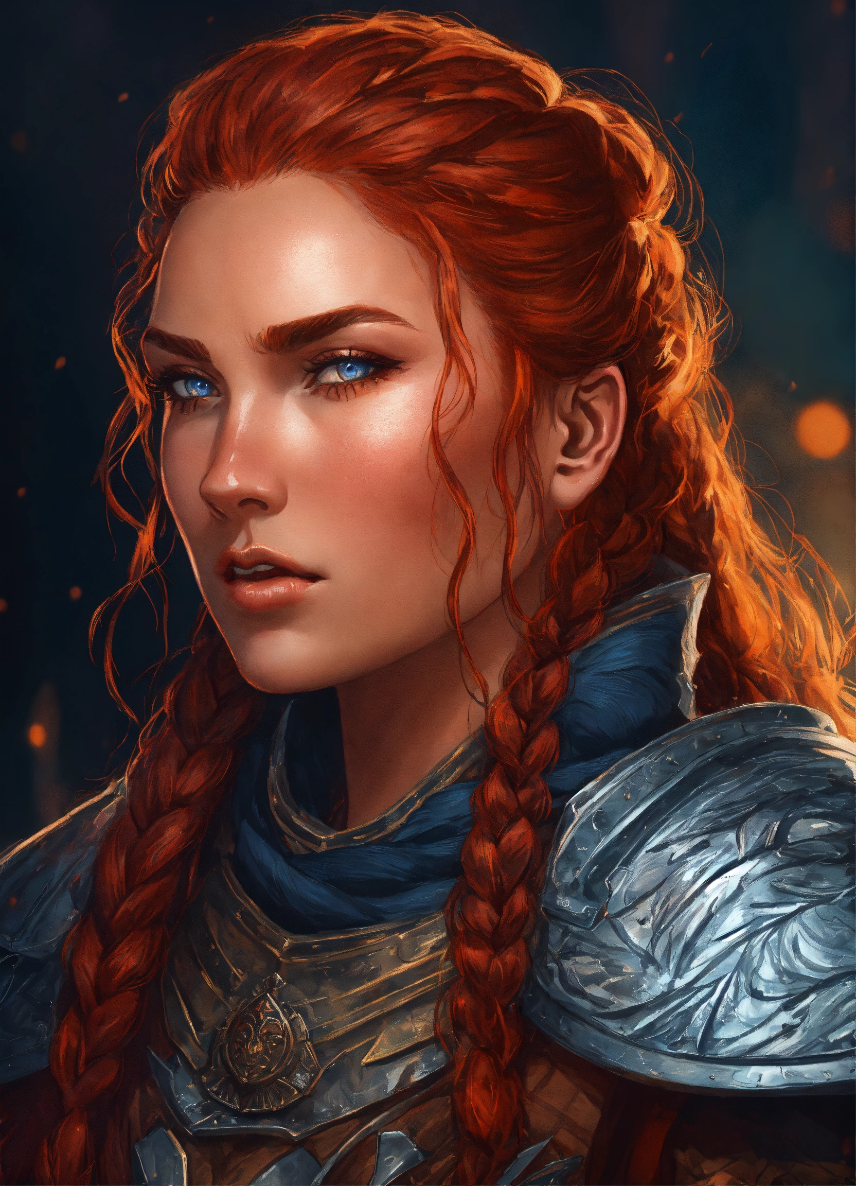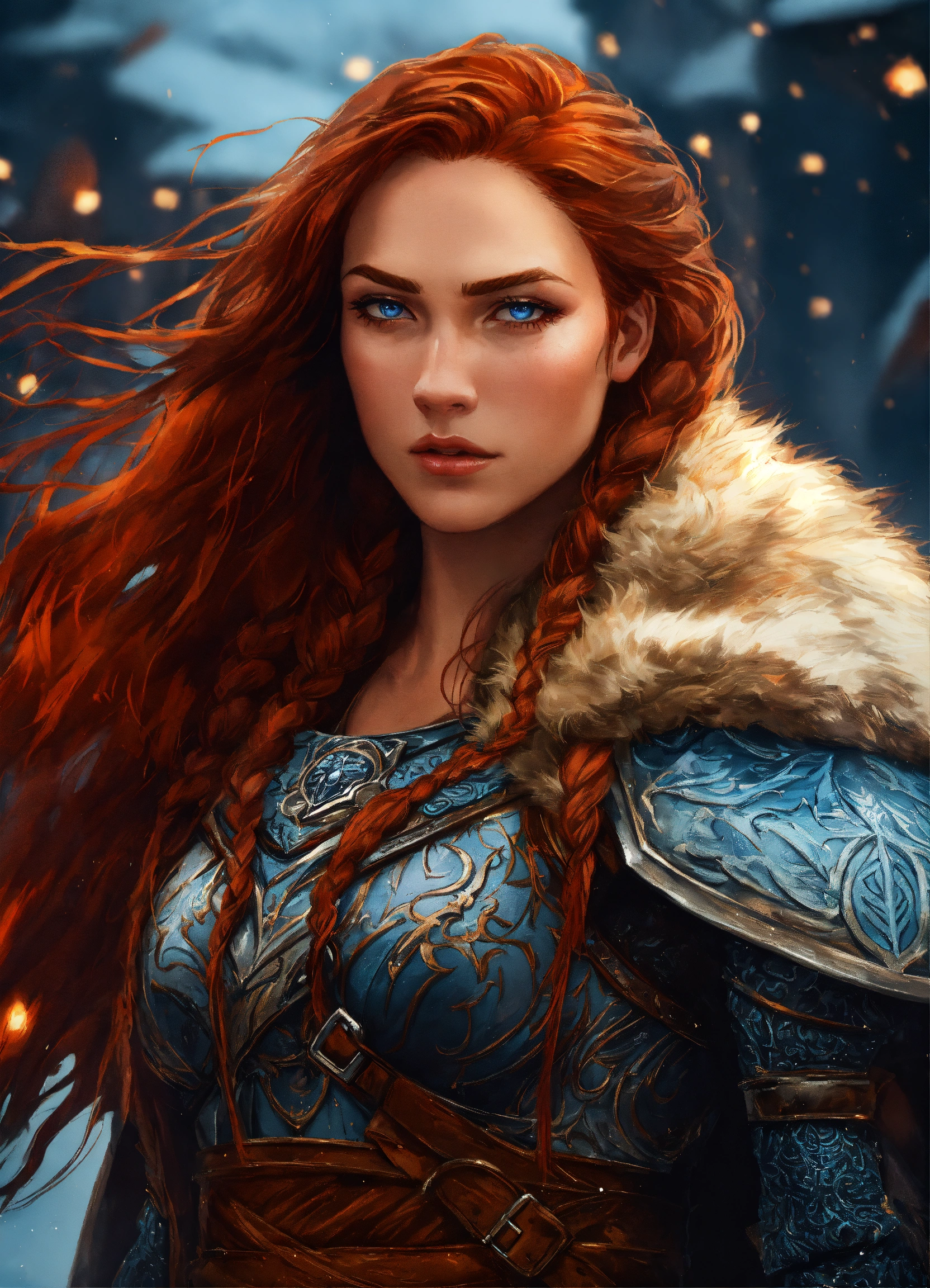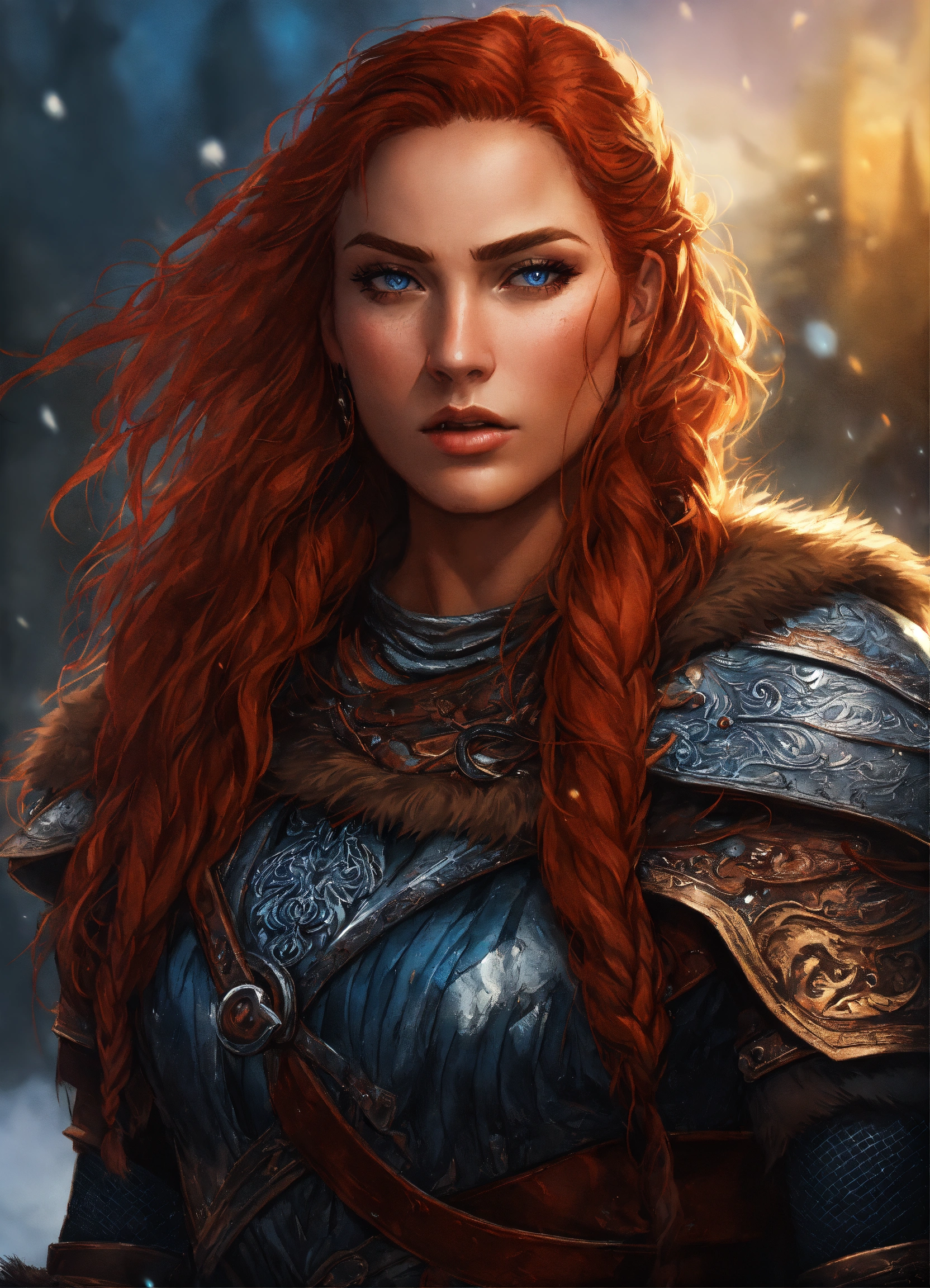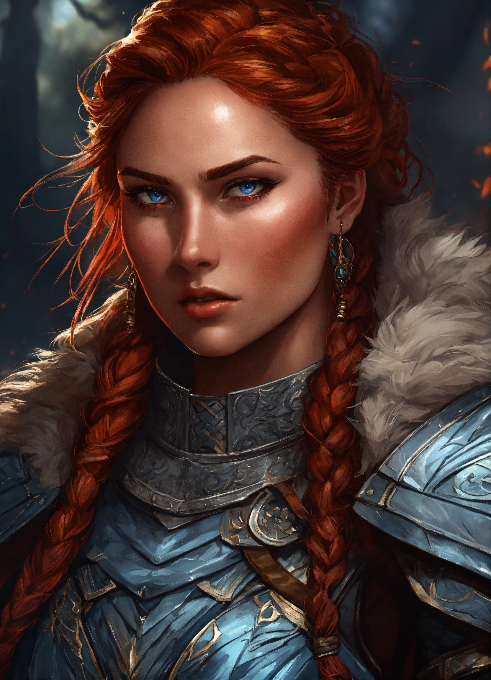 A close up of an red haired female wearing wolf pelt shoulder cloak, symmetrical epic fantasy art, highly detailed dark art, detailed digital 2d fantasy art, intricate armor, in the style of alex gray art, dan mumford art style, large armored female, knight, red hair, viking, norsca, norscan, barbarian knight, blue eyes, firece, handsome woman, determined, strong, wildly beautiful, fierce expression, savage expression, 6ft tall, big strong woman, braided hair, scars, warrior, gal gadot