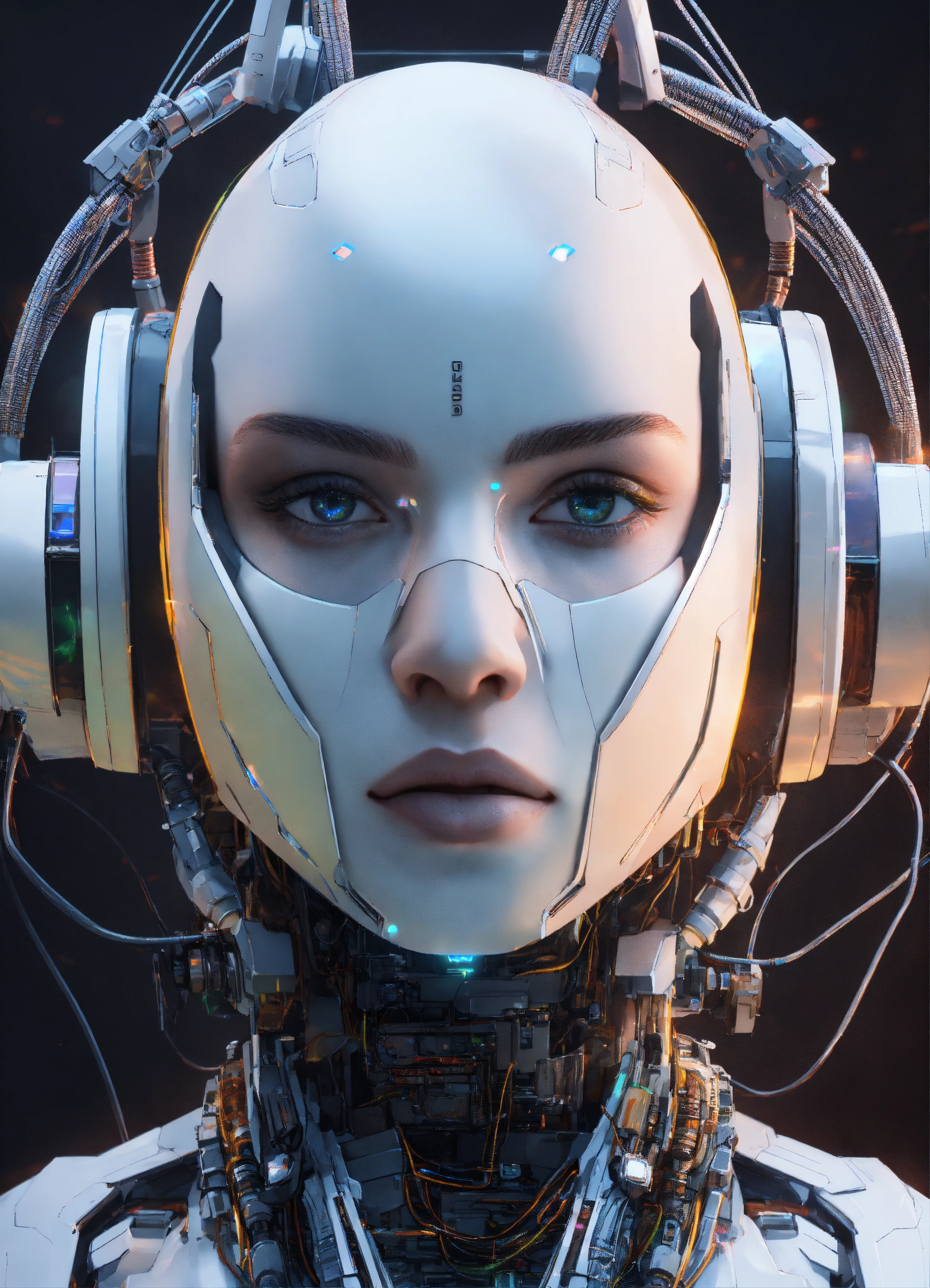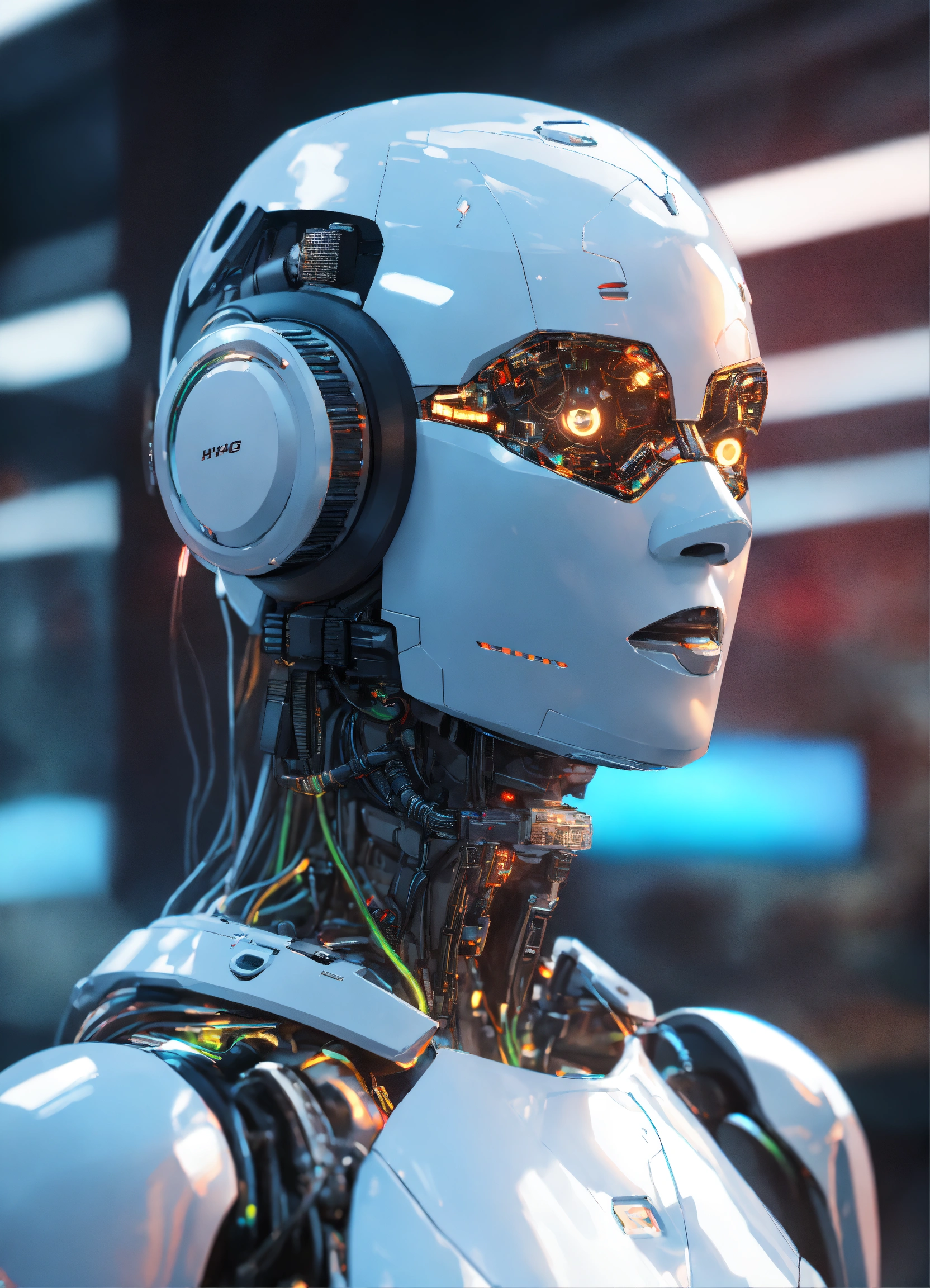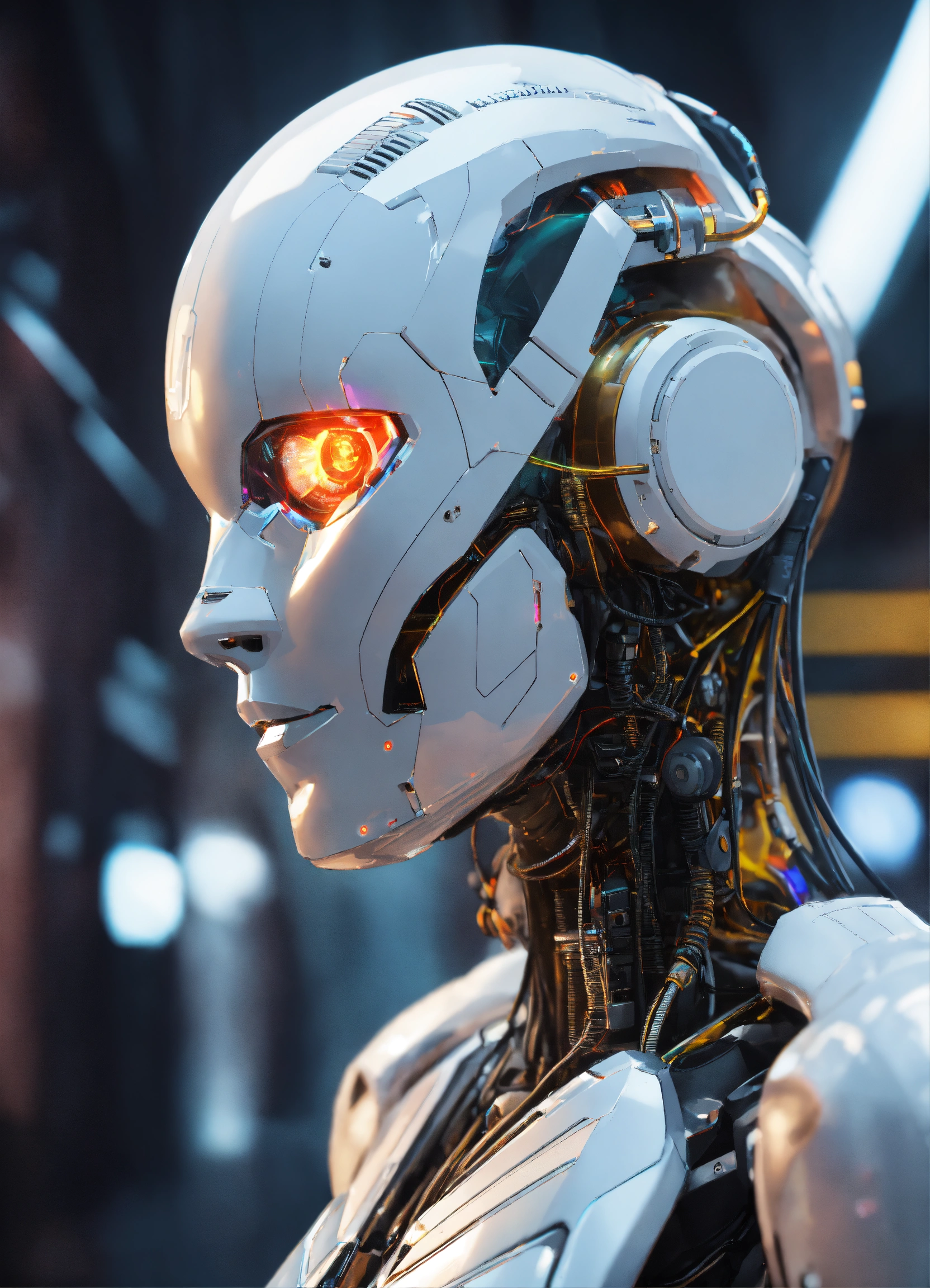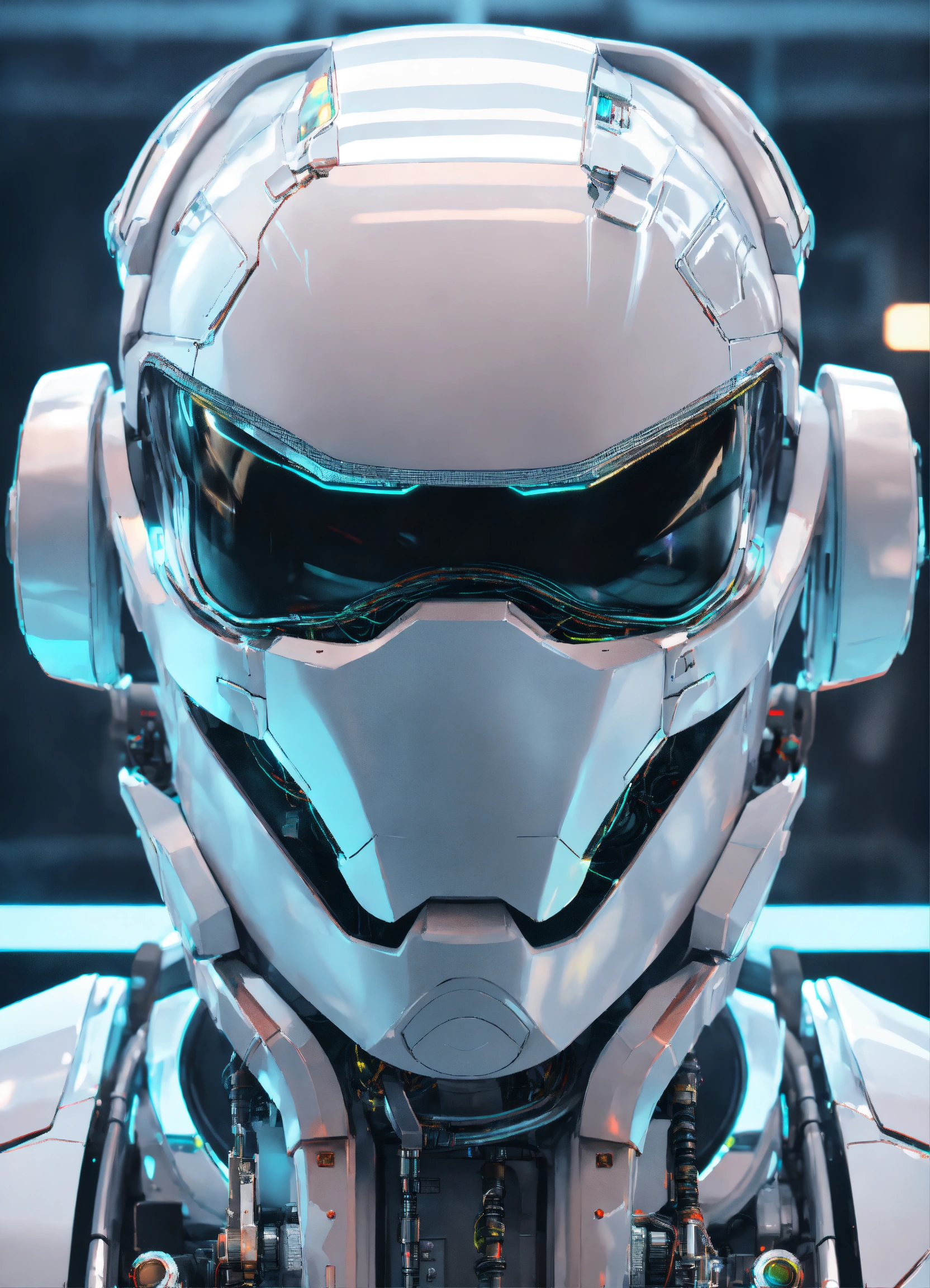 Focus on a white robotic head, with cables connected, holograms, chromatic design, realism, cyberpunk, glowing eye, white background, metallic texture, futuristic style, 35mm, high reflection, ambient occlusion, tyndall effect, f/4, 8k, detailed, hyper detailed, insane detailed, high resolution, rtx, octane, post production, ray tracing, unreal engine 5, photography, chromatic aberration