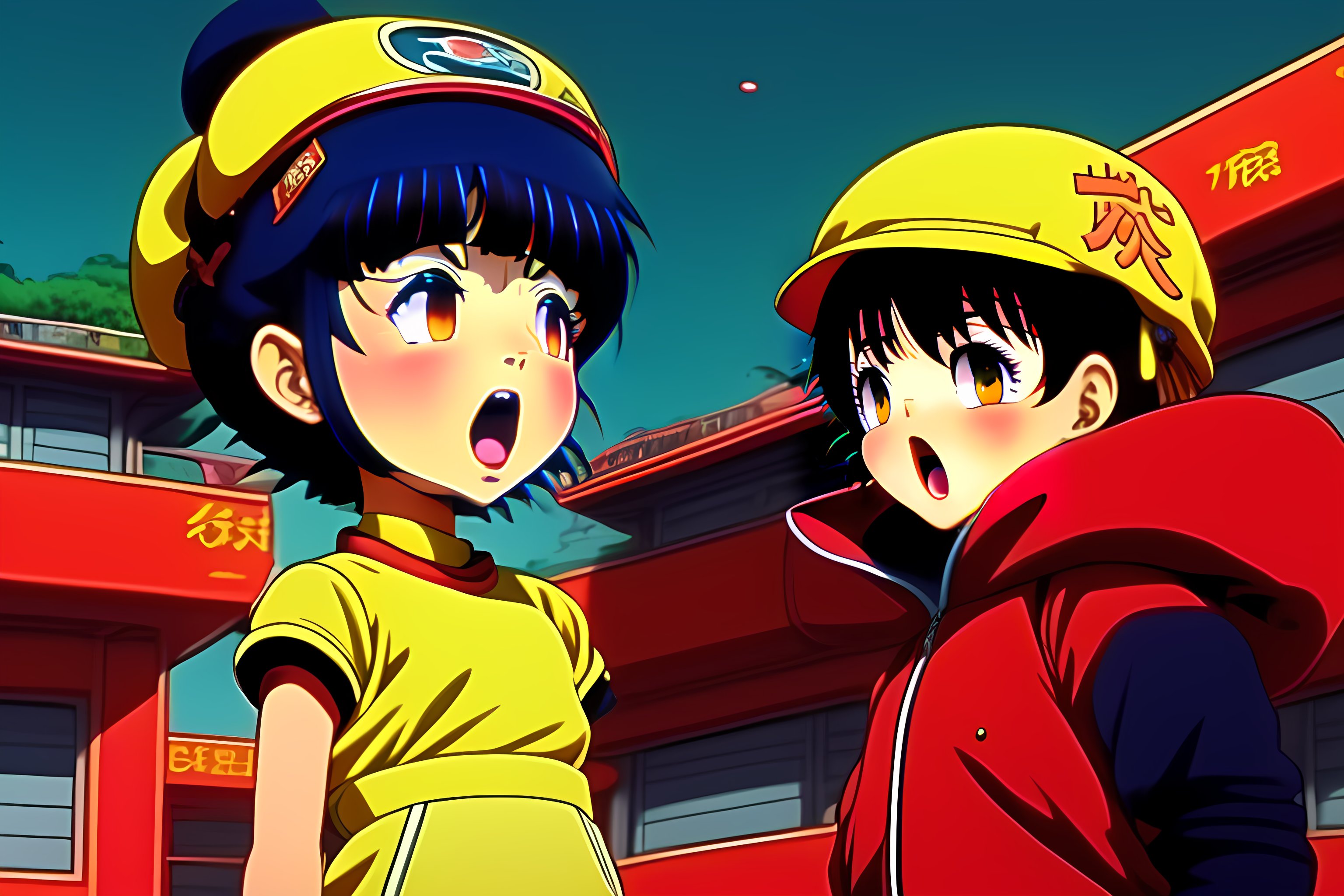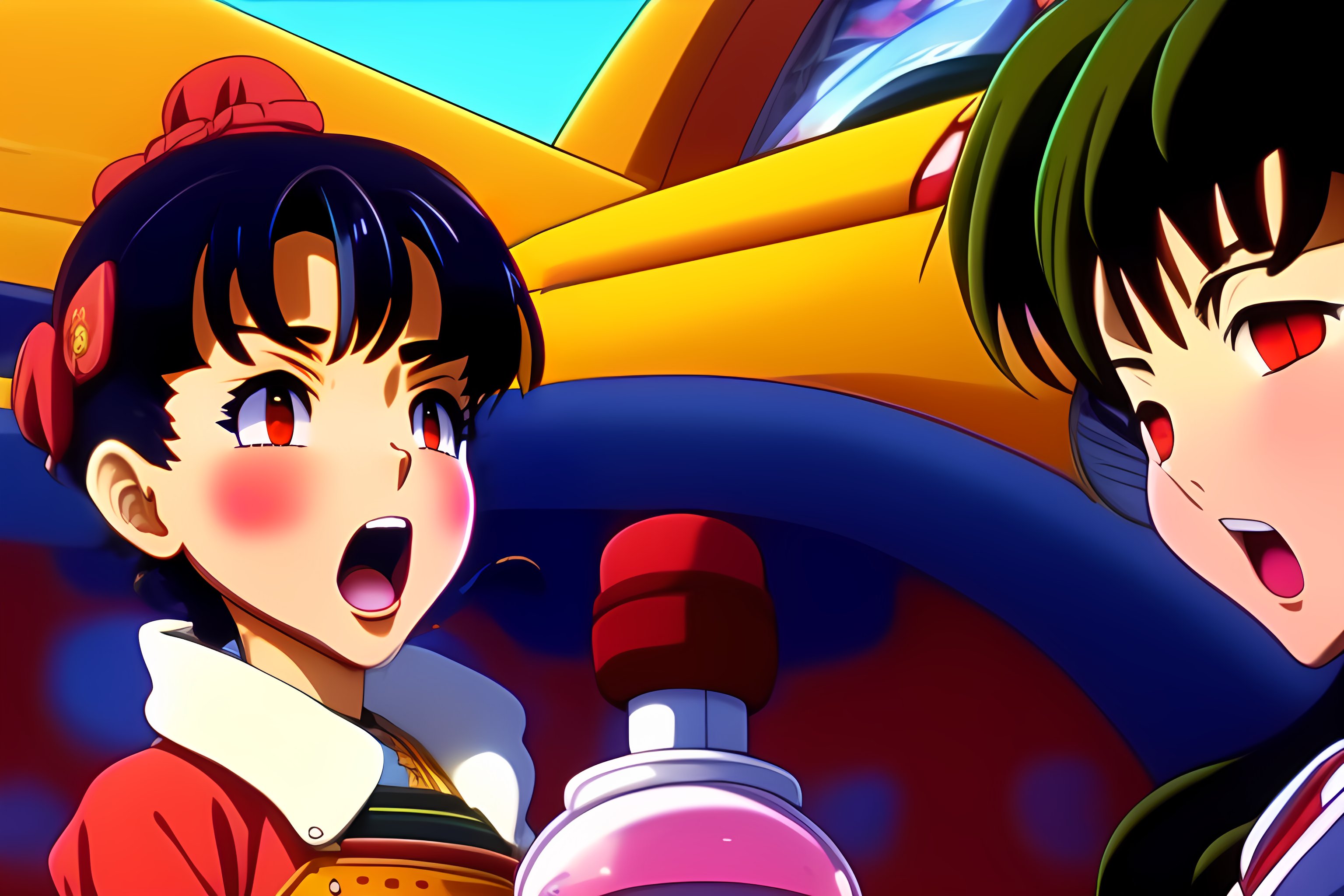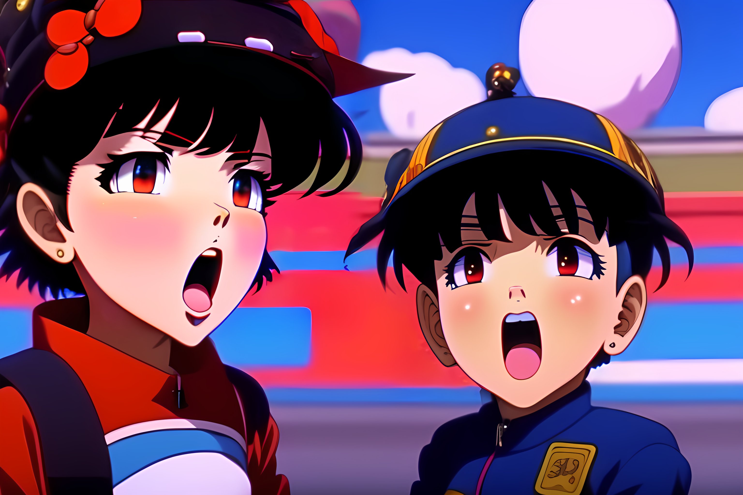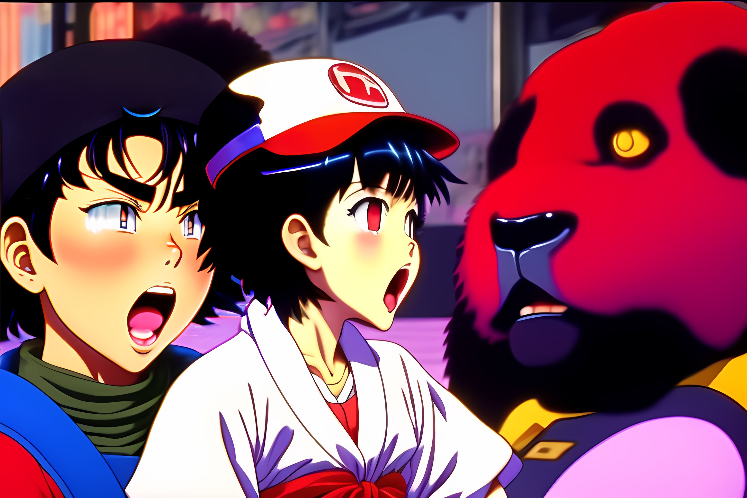 Vintage anime screenshot from akira, 90’s anime.girl screaming at a scared panda, vibrant maximalism.