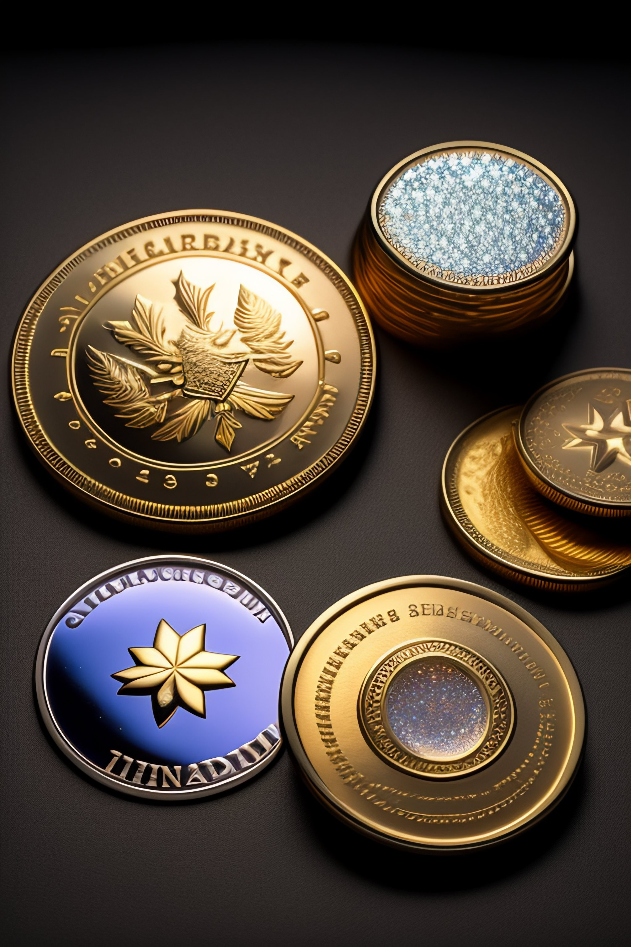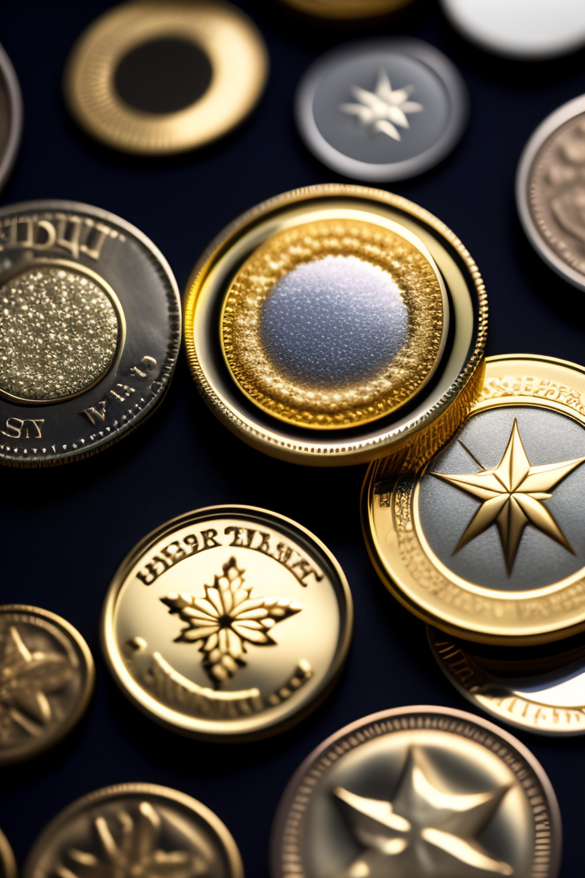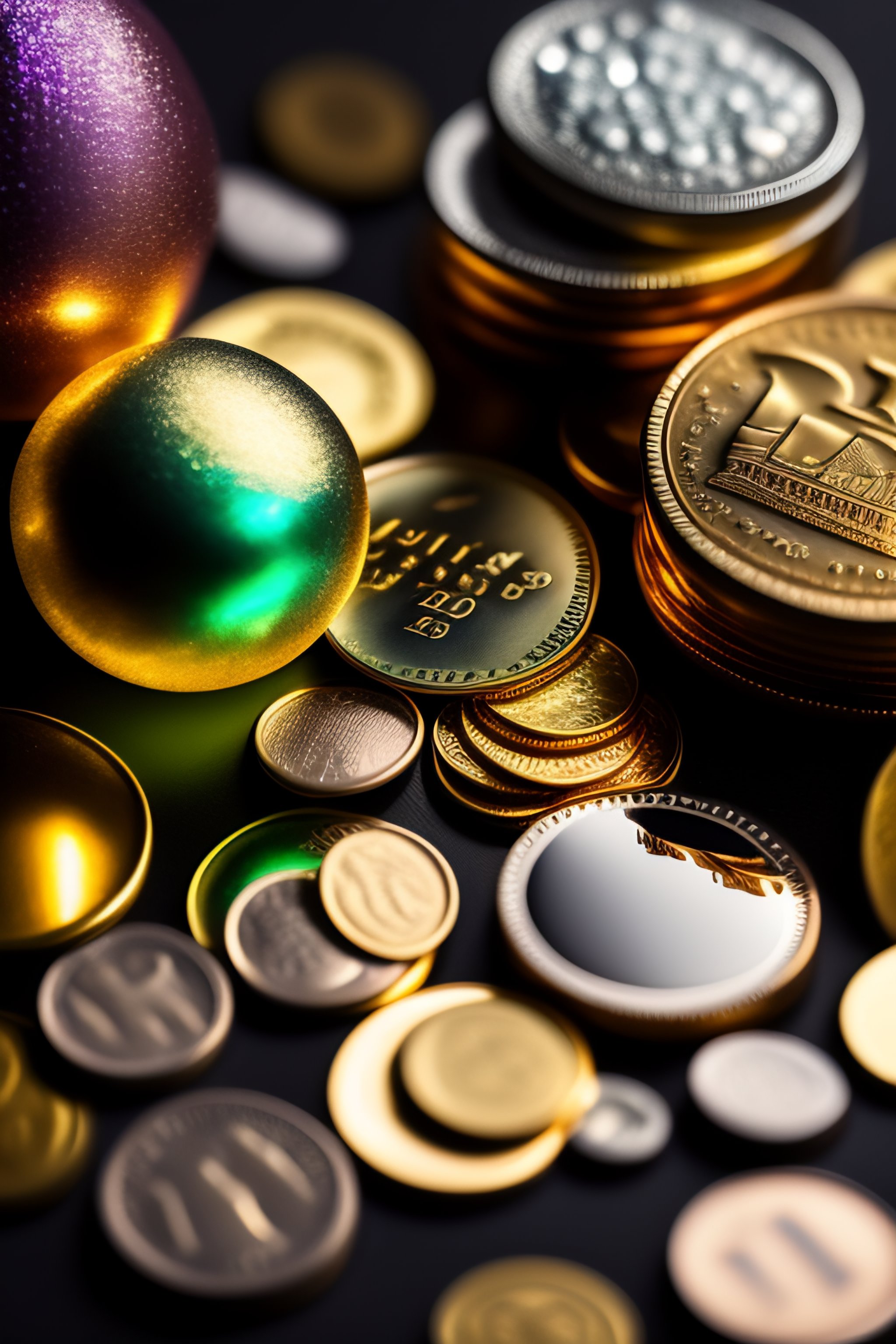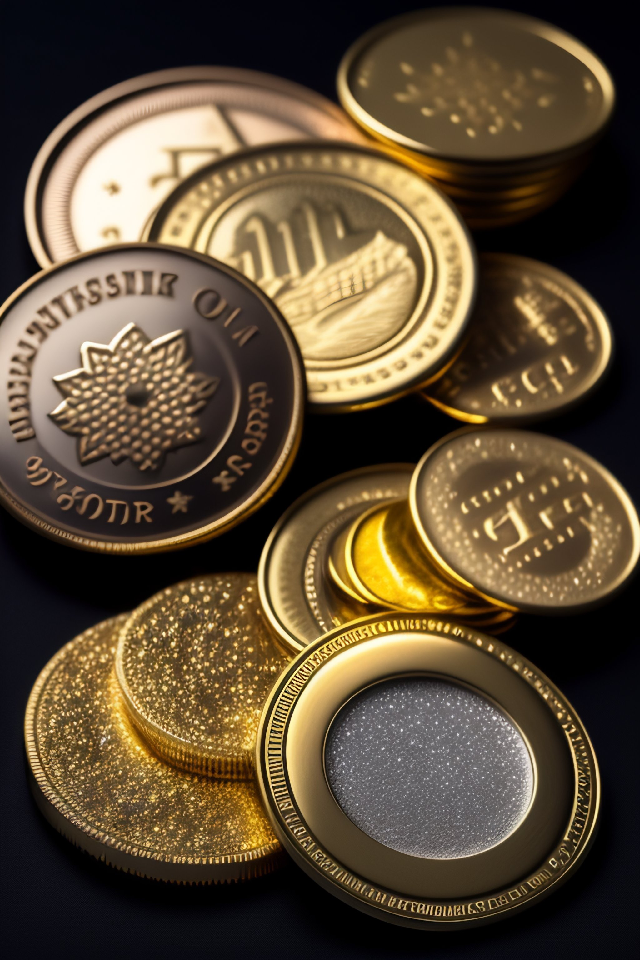Various coins with sparkling reflections multiple items