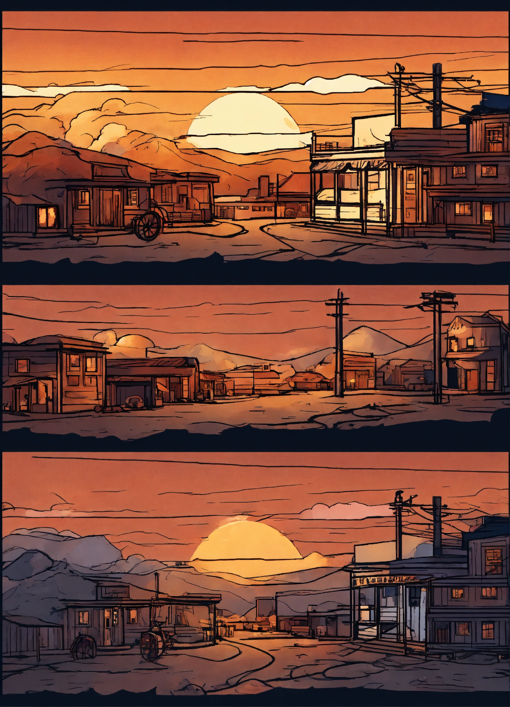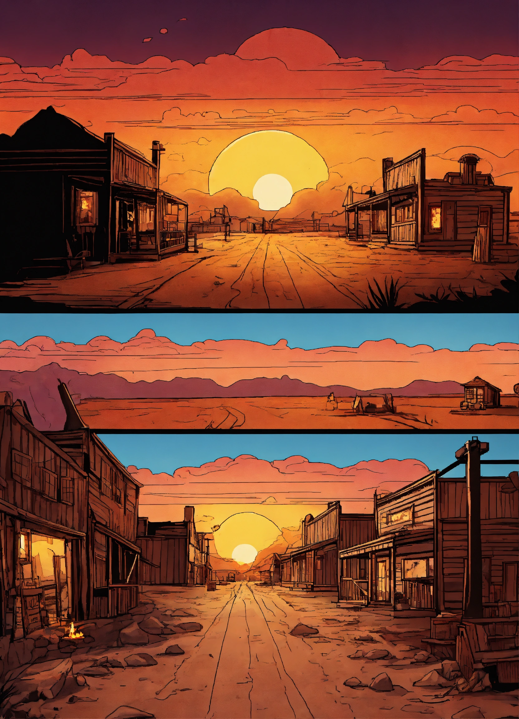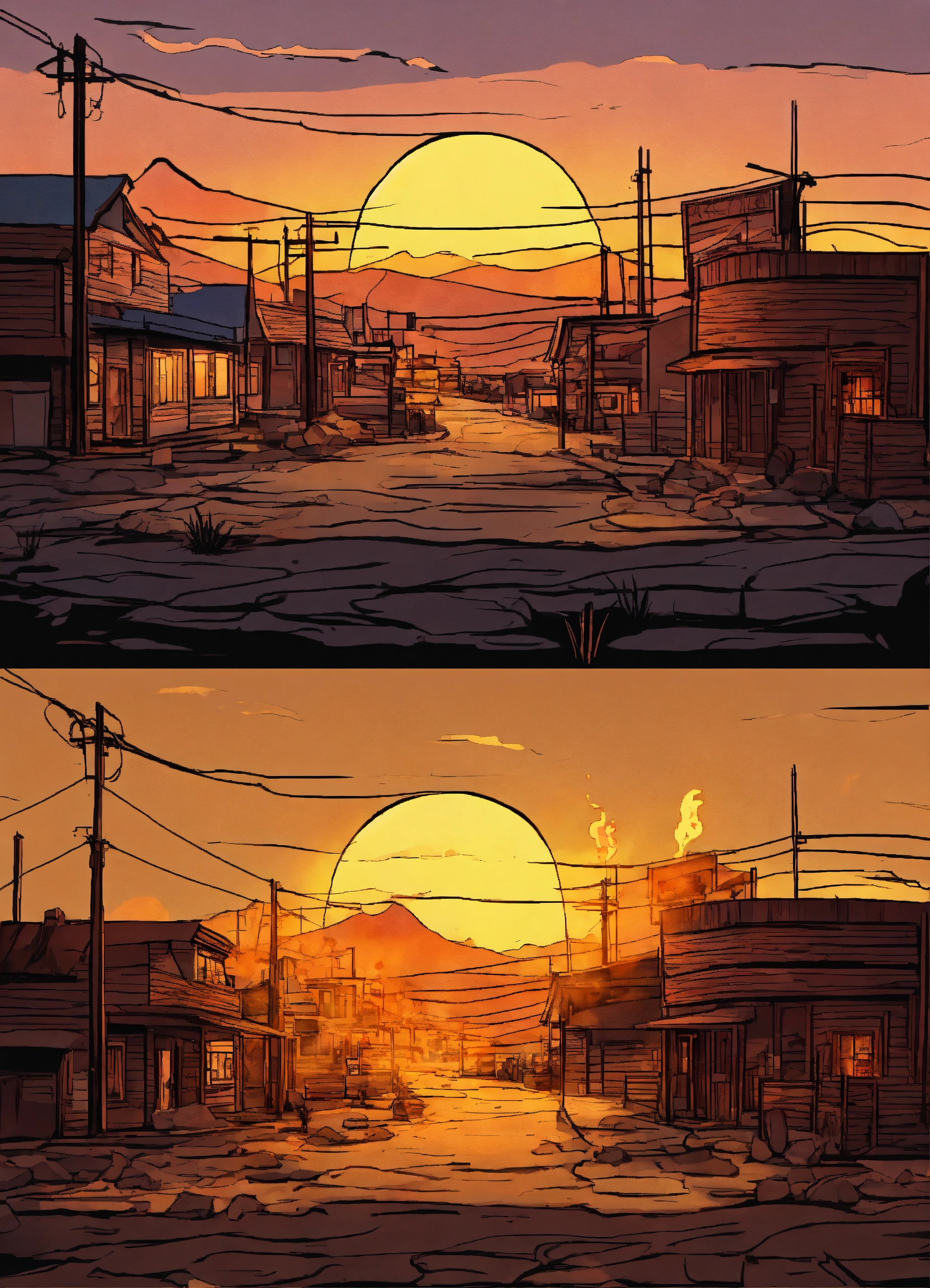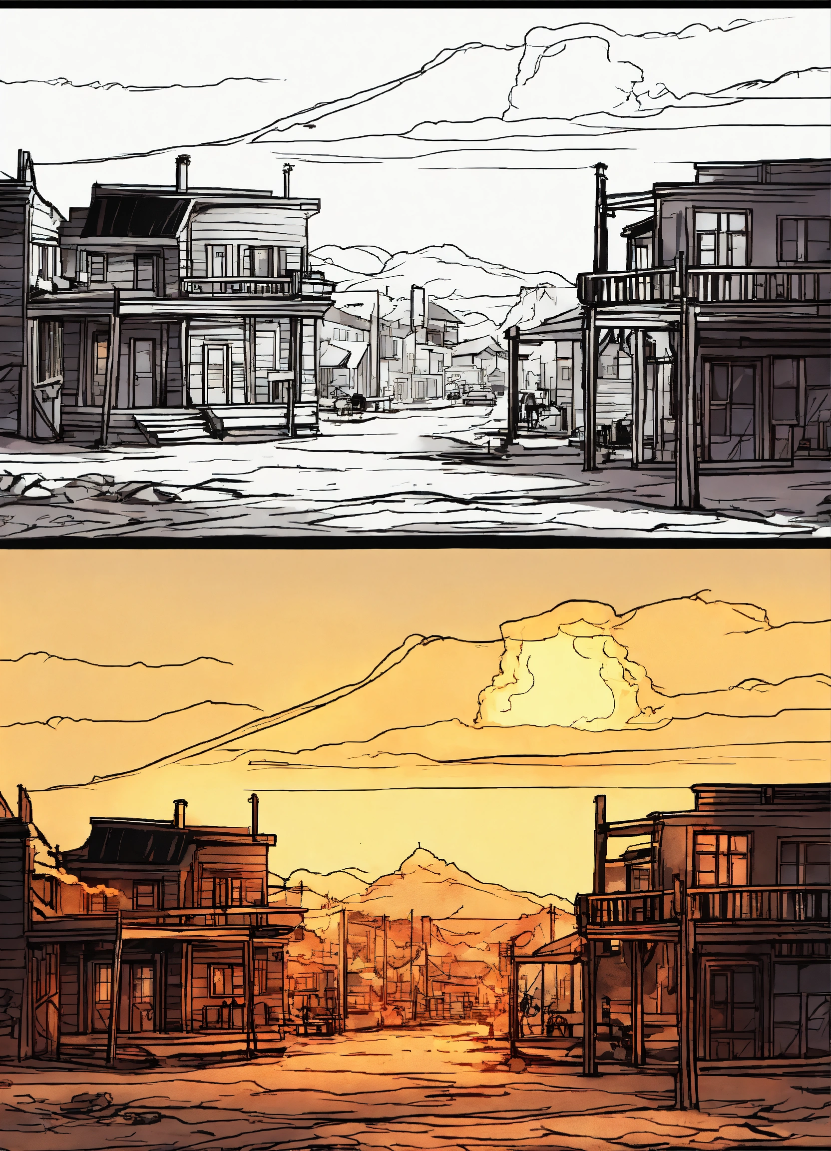 Wild west sunset, scene slip in two with one side in darkness and the other in light, a town in the middle, with one side burning, cartoon line art