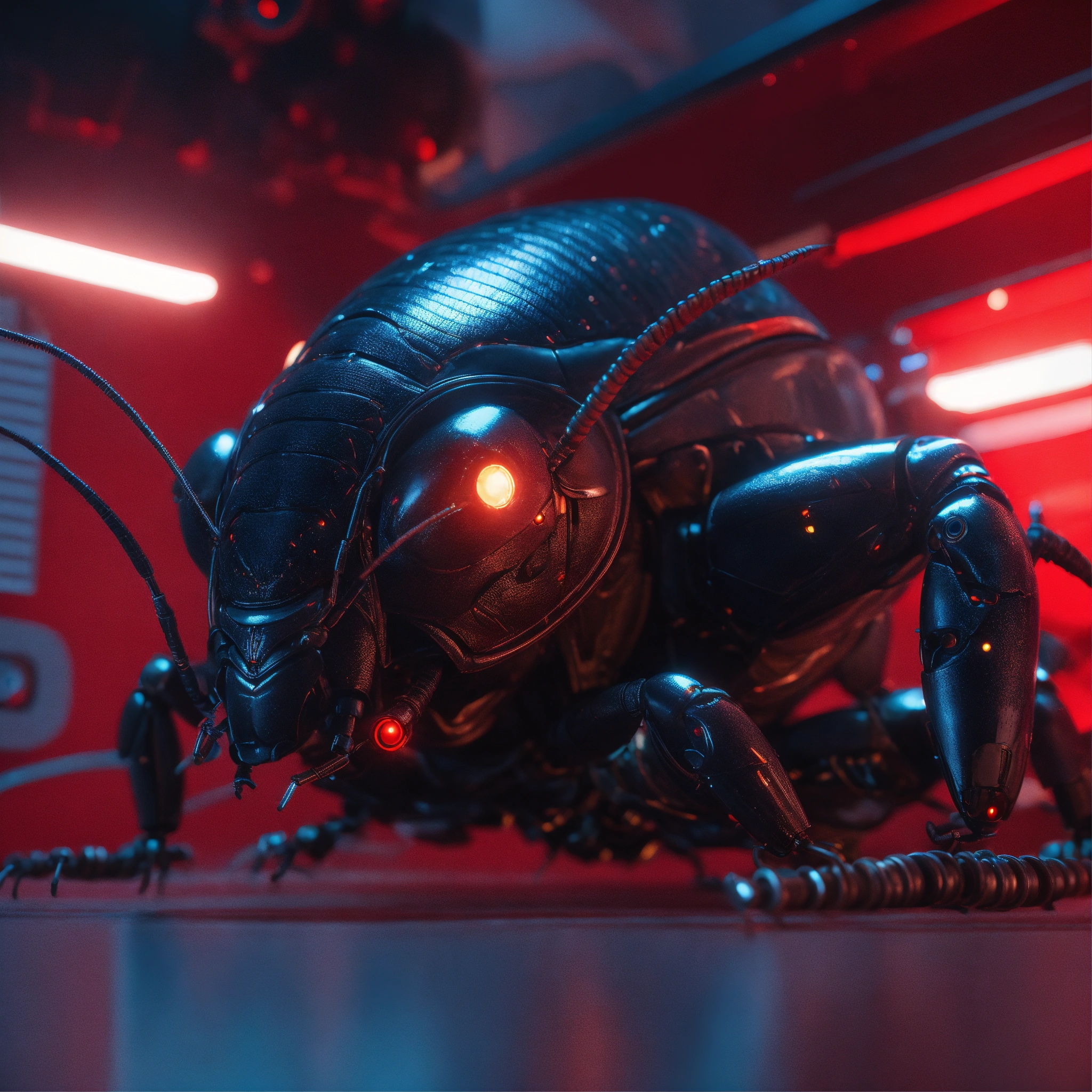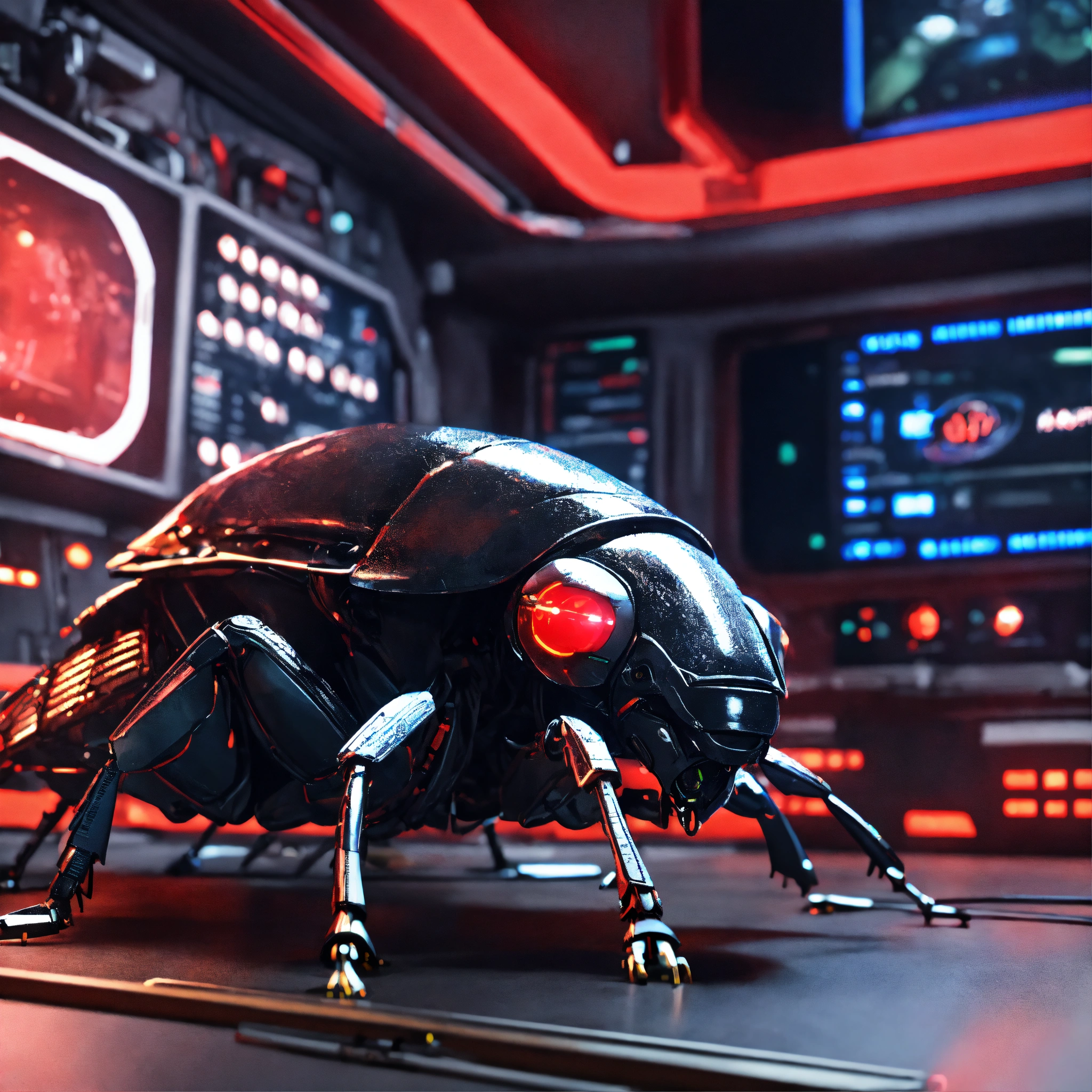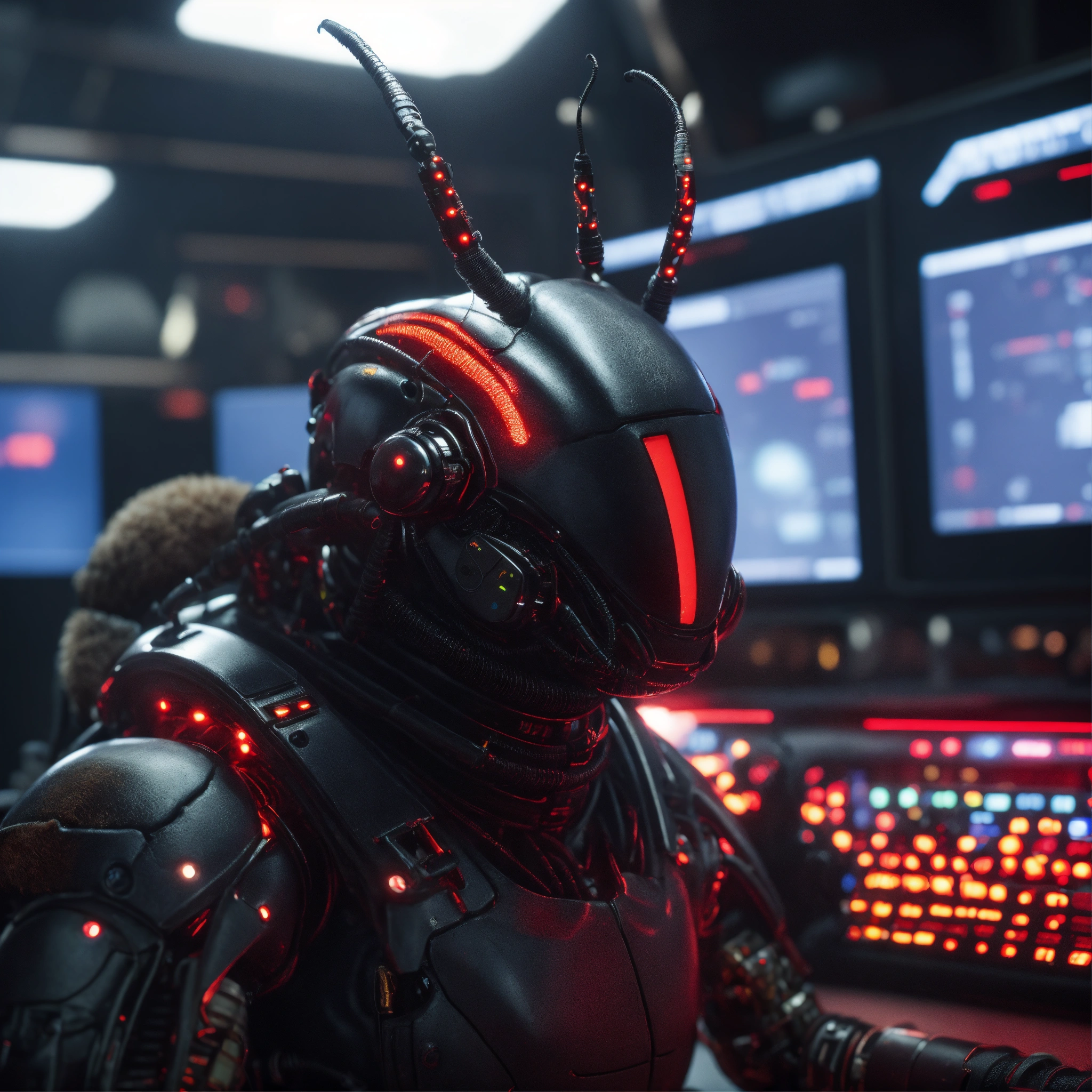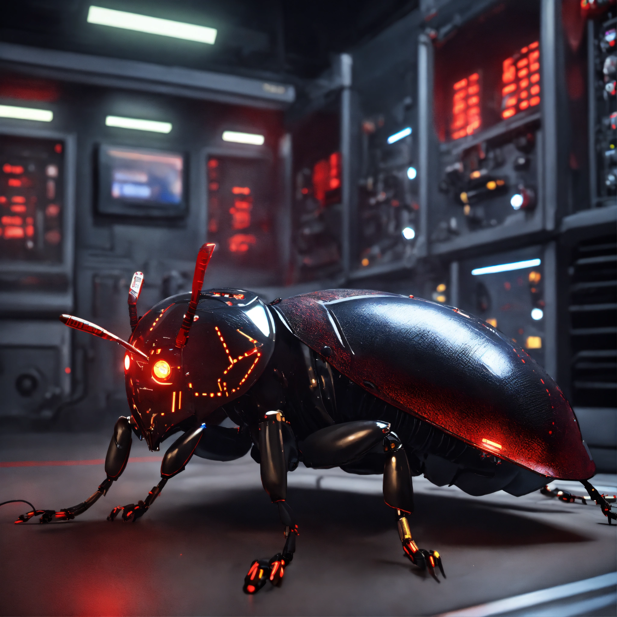 Black cockroach faced humanoids with red eyes and detailed circuitry markings, sleping with his teddy in a hi tech alien control room, realistic, 8k, unreal engine, pixar