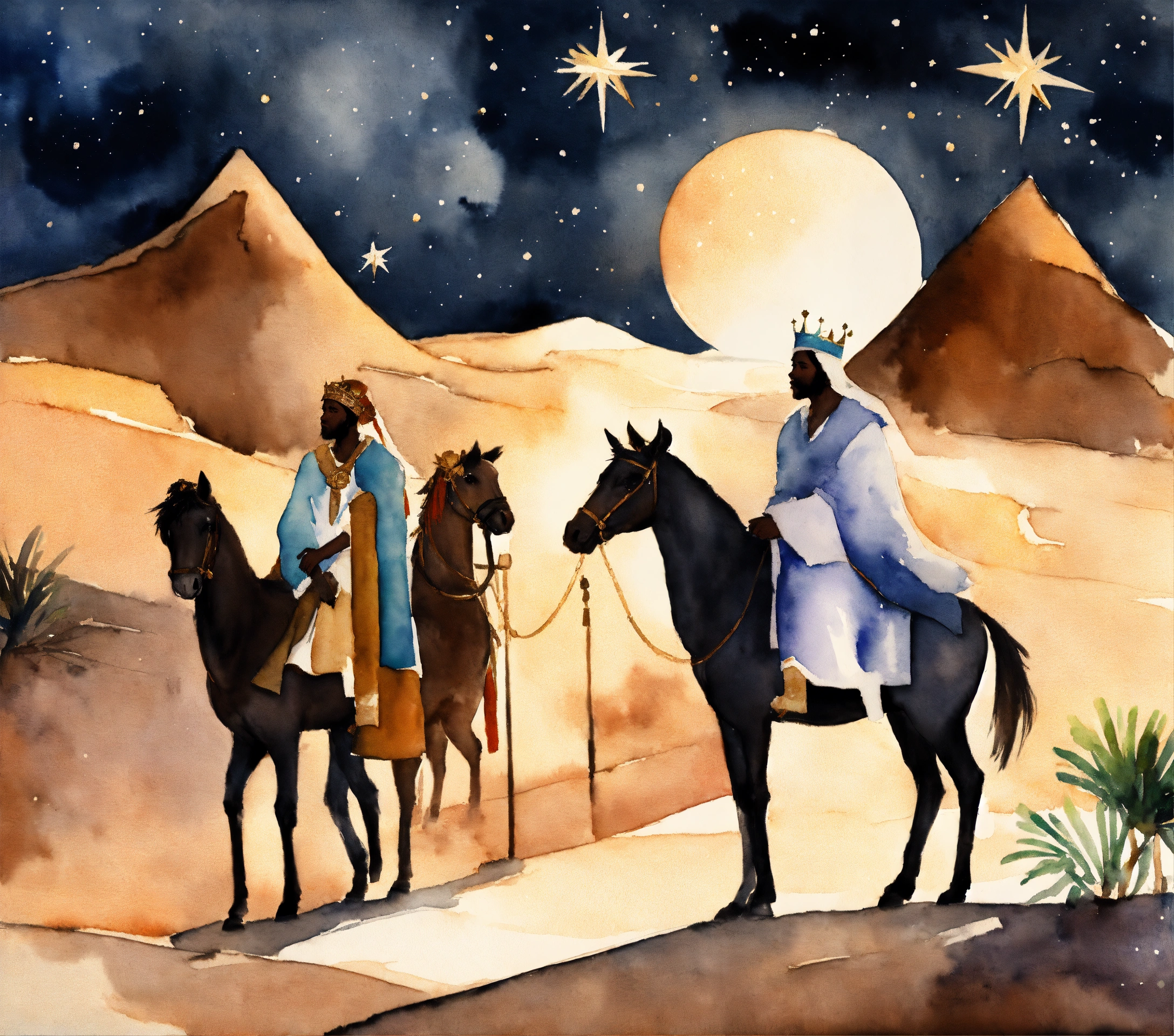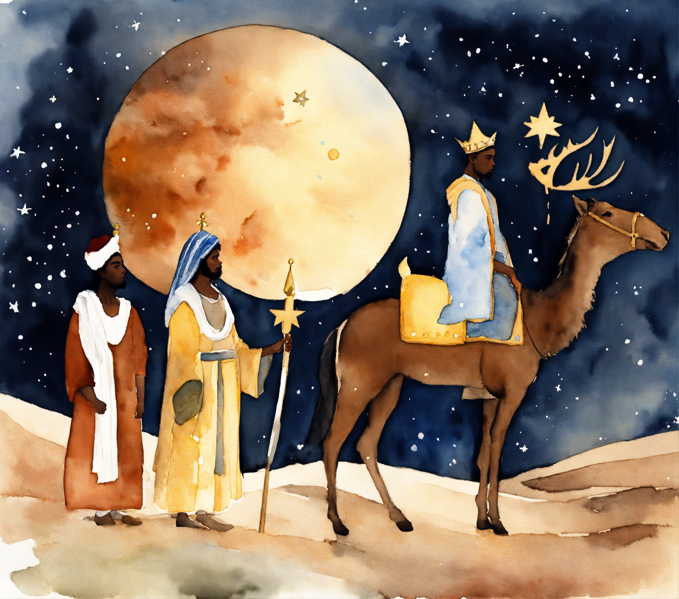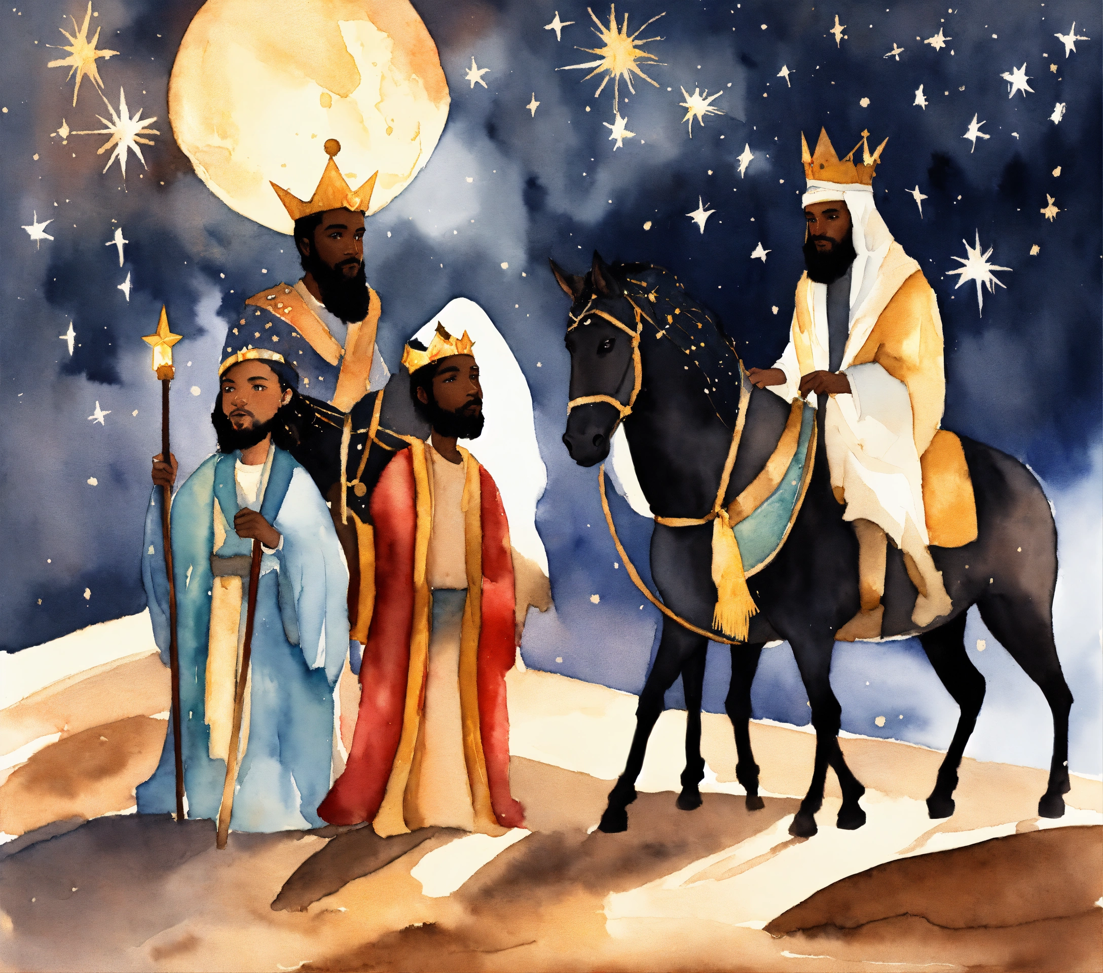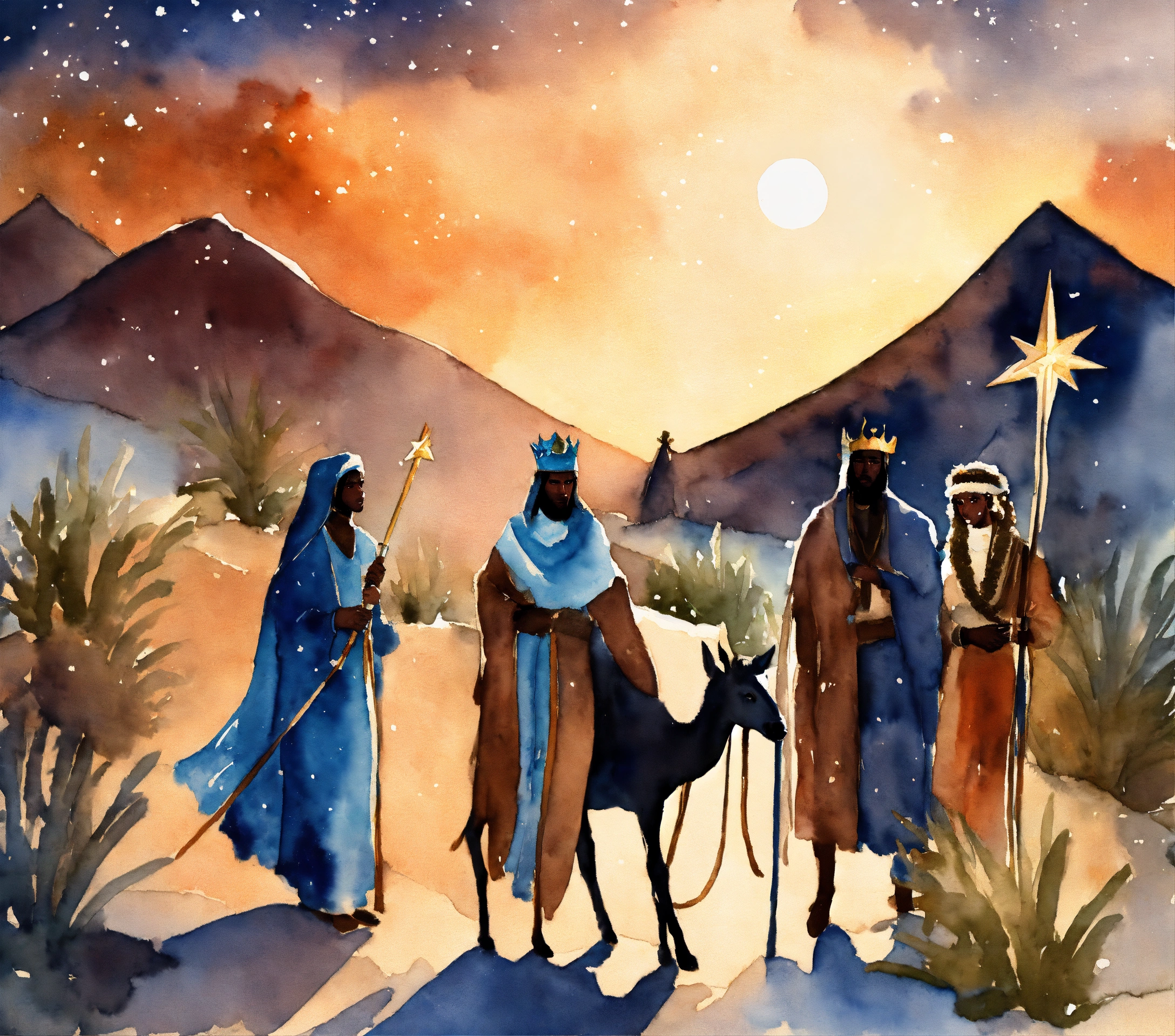 We three kings themed christmas scene, the north star, three african american, desert, 8k, watercolor subjects, dark complexion black american, storybook