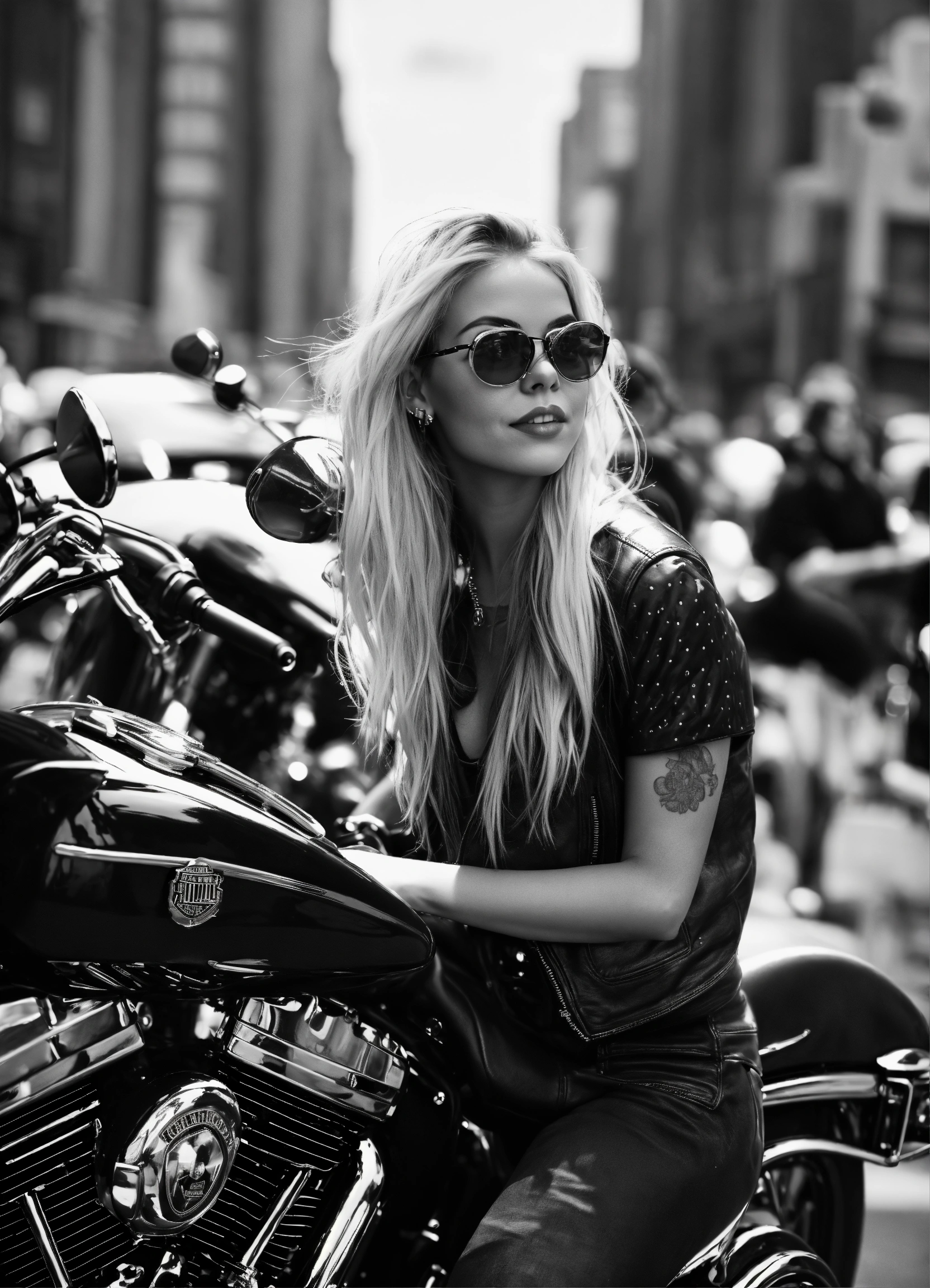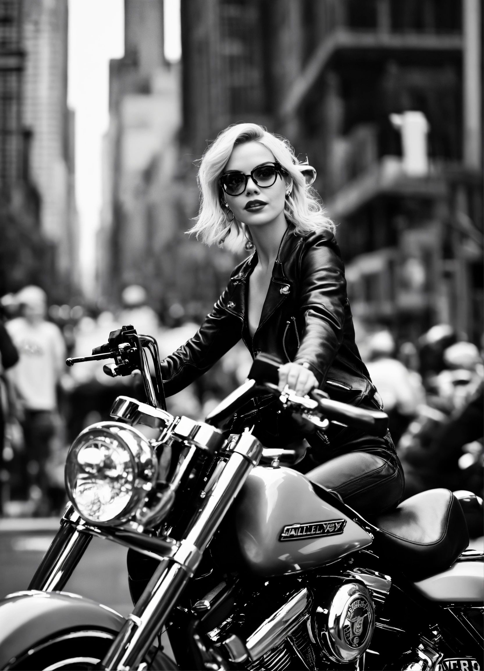 A blonde girl with eyeglasses on harley davidson moto in new york and behind her a lot of people in black and white