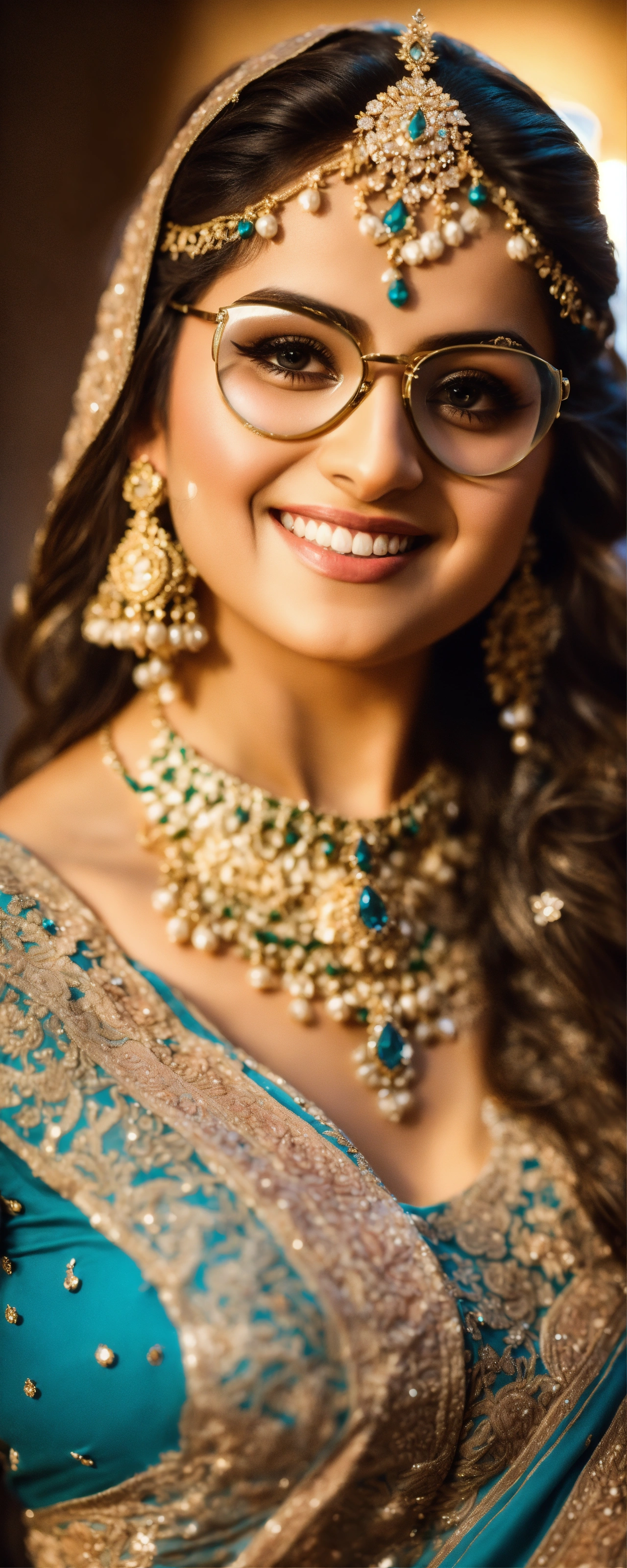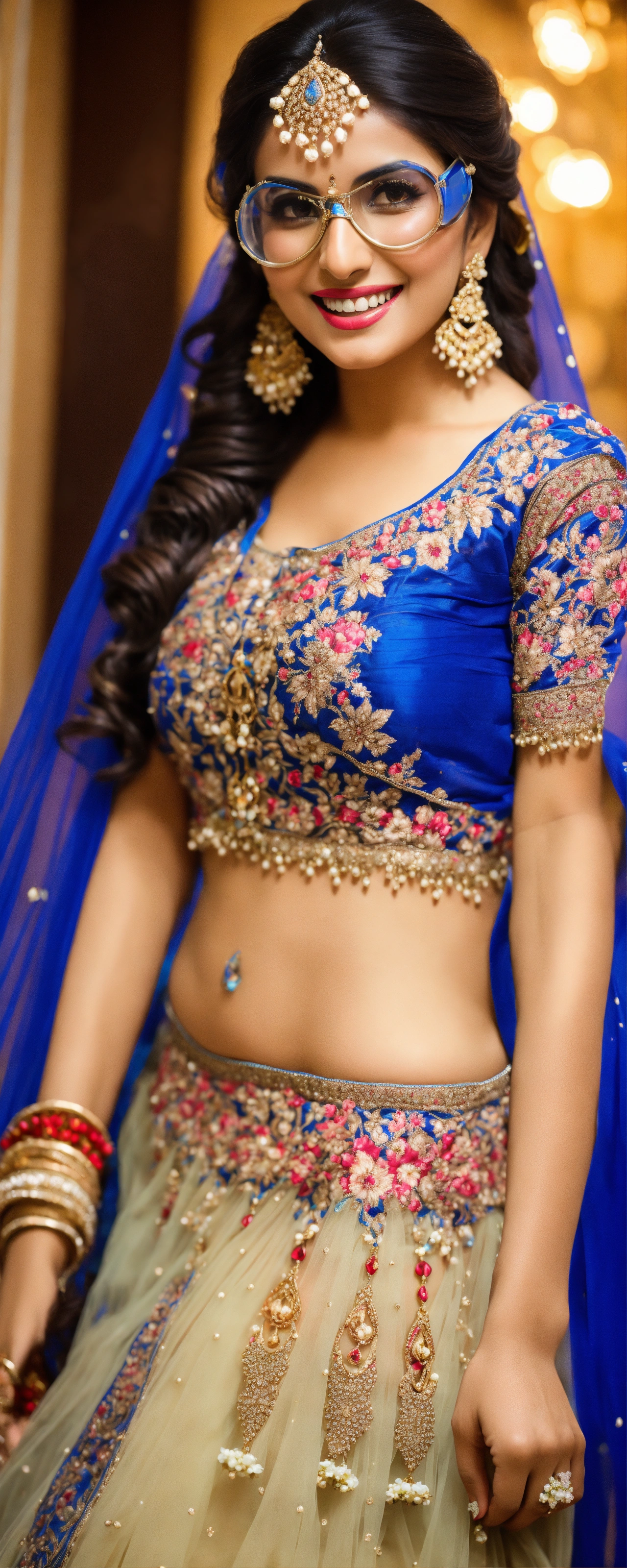 Floral background, beautiful pakistani bride, wearing goggles truban, in blue beige lehnga, dancing, full body pose, bridal jewellery, long hairs, cute smile, shiny eyes, nice shape body