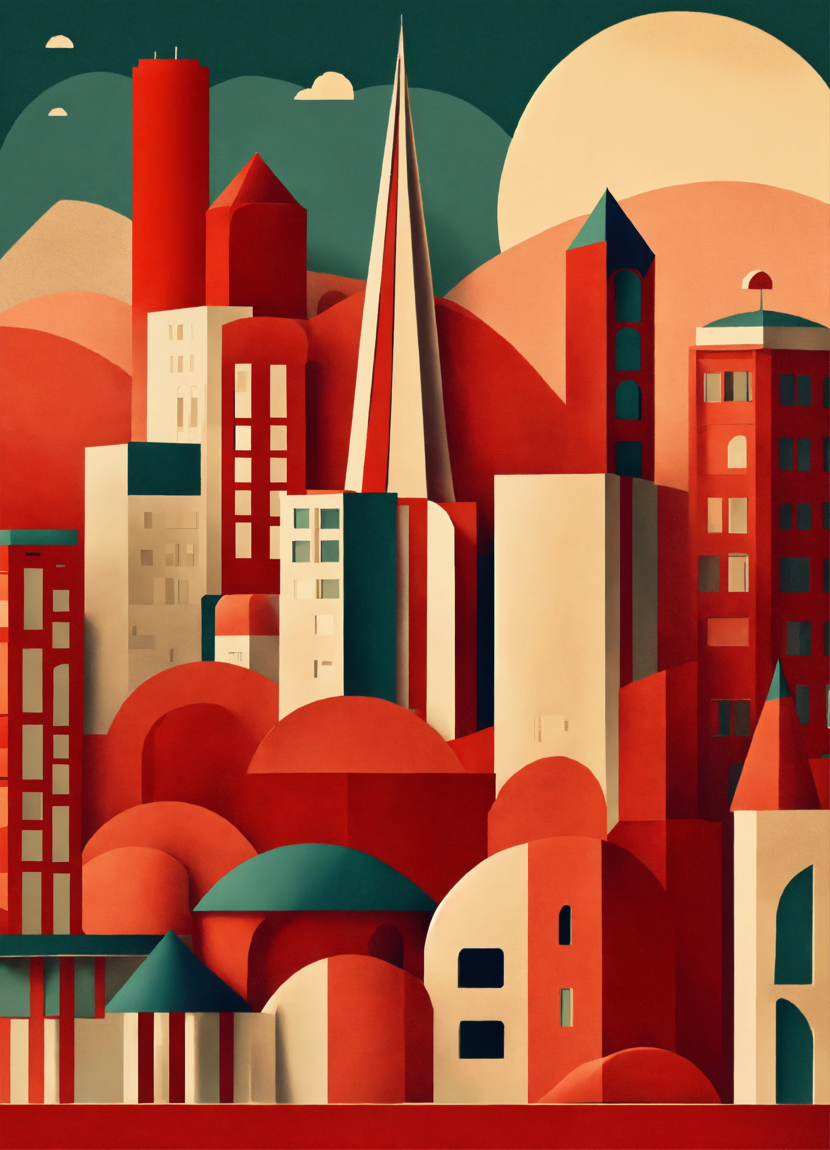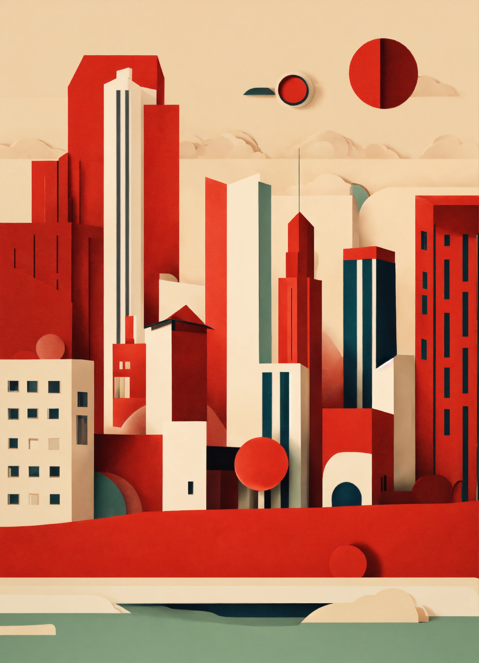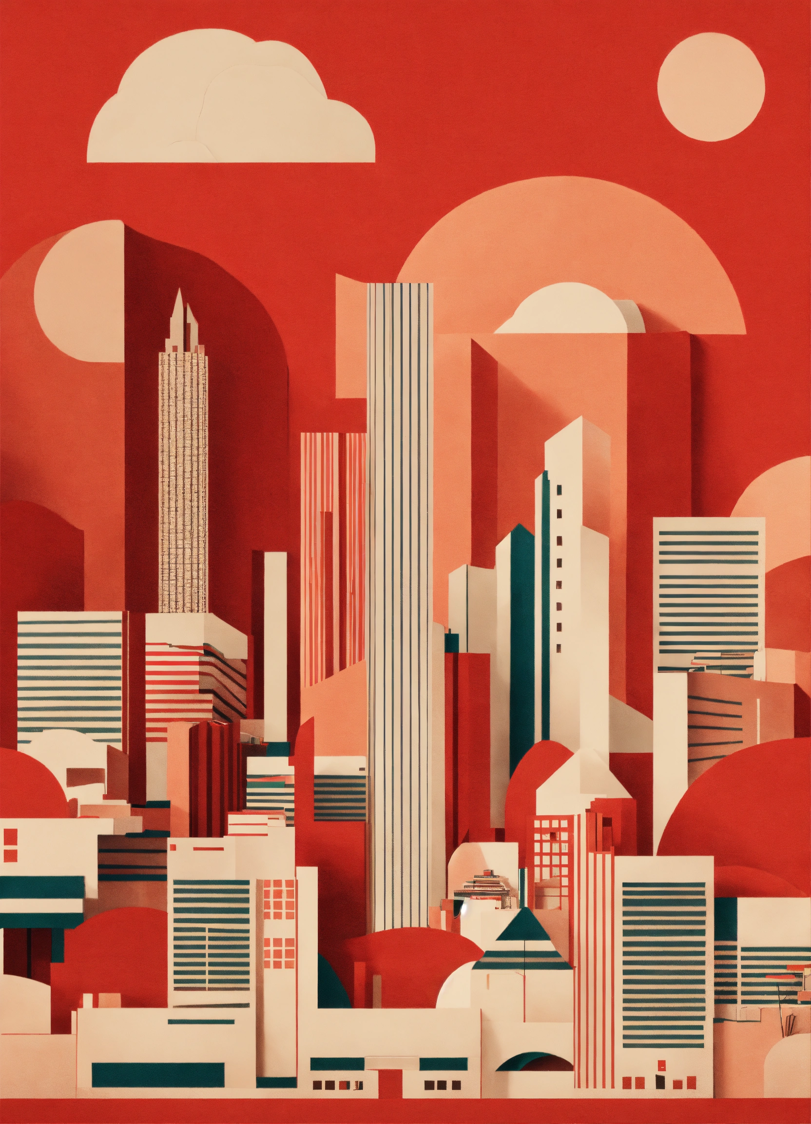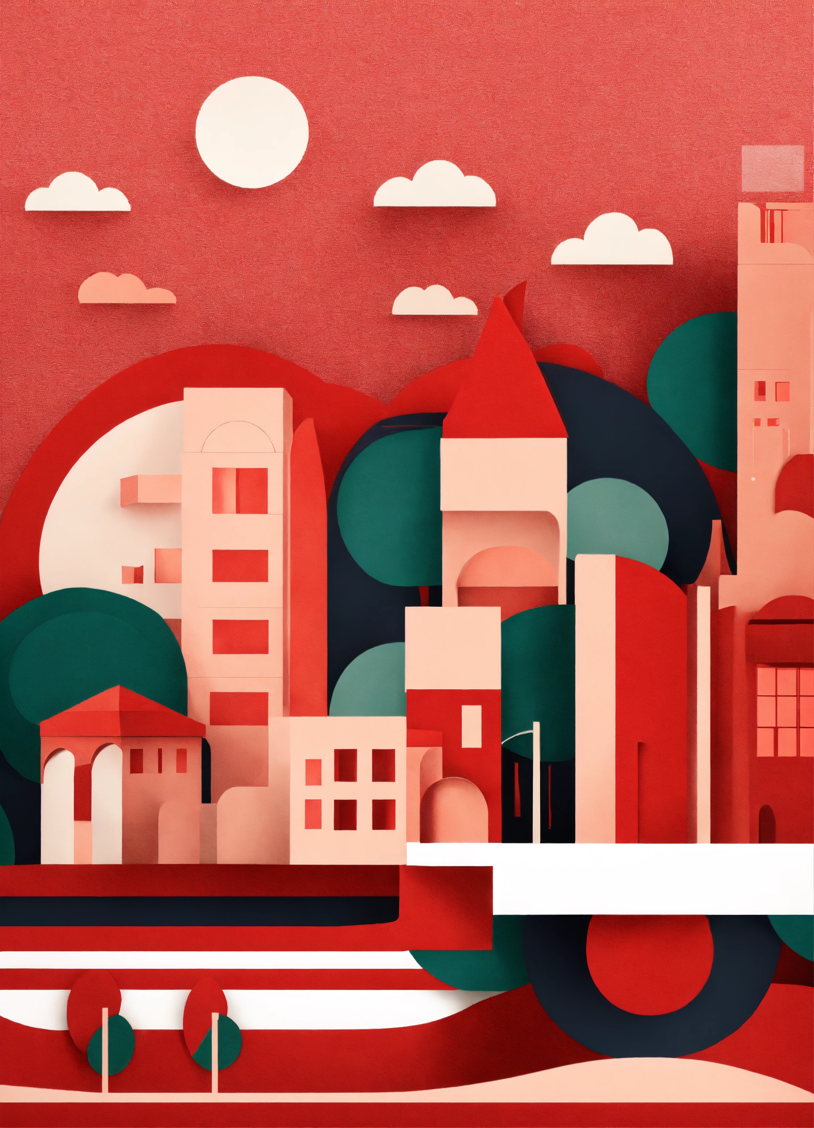 Minimalist bold shapes playful paper retro 60’s red city landscape
