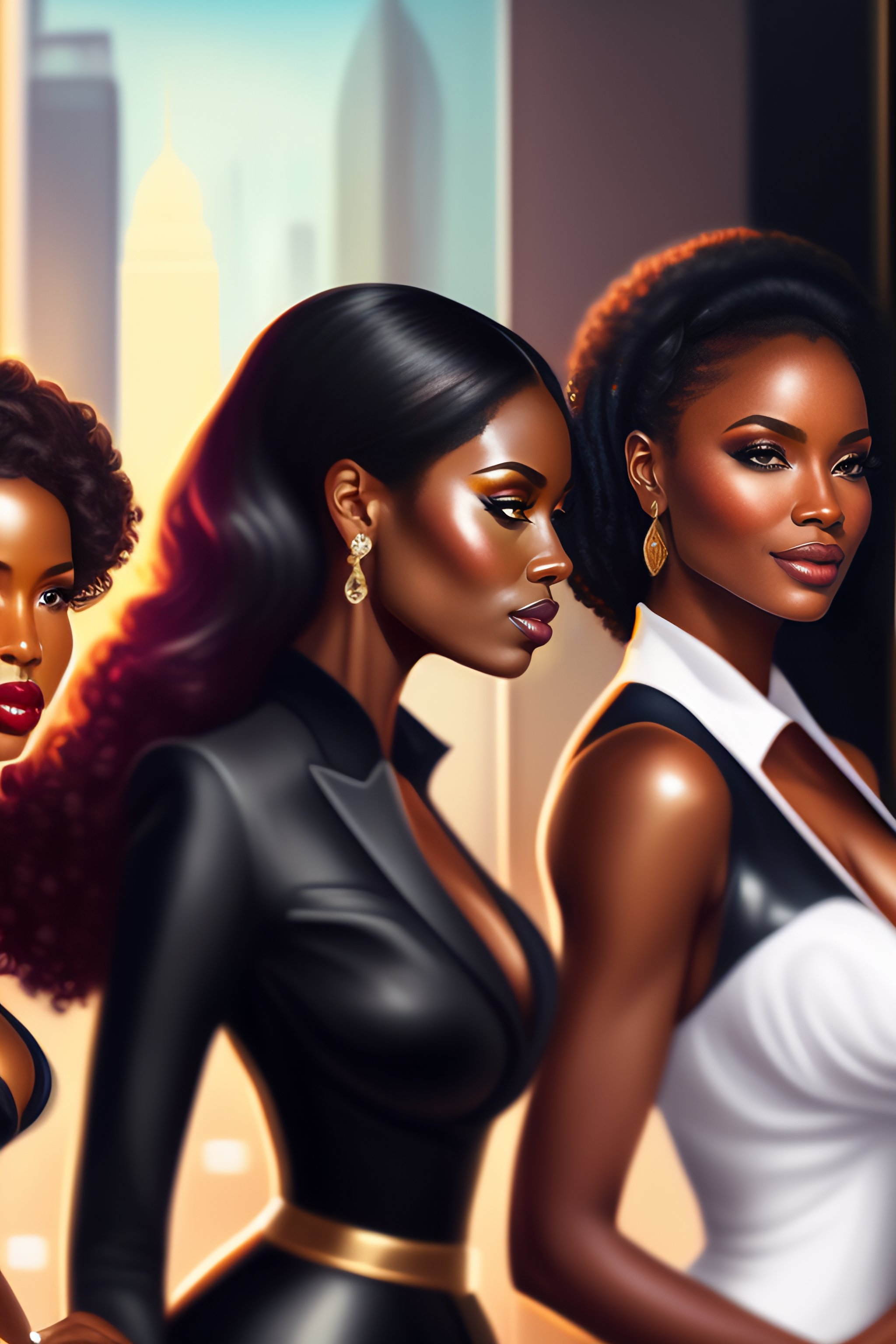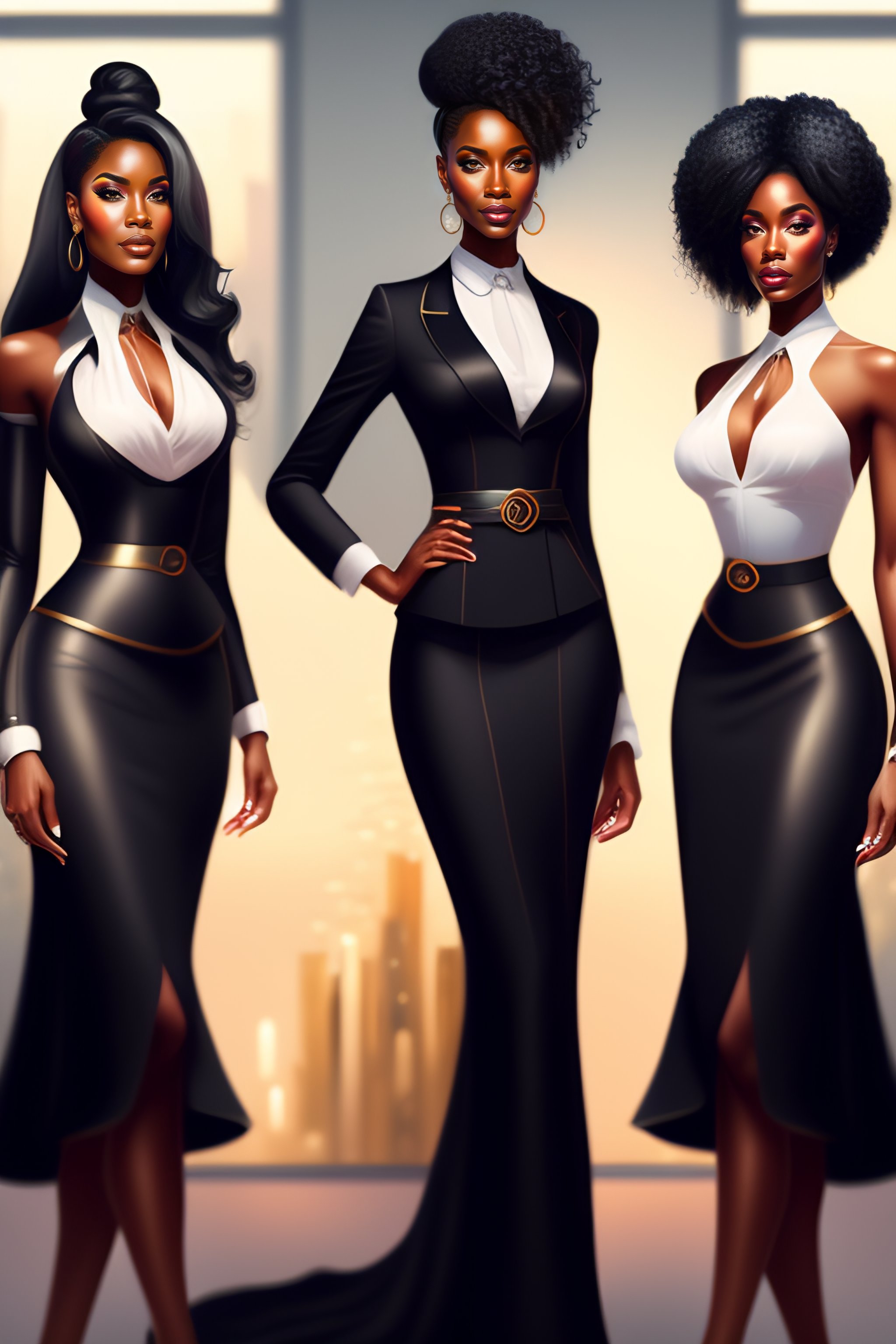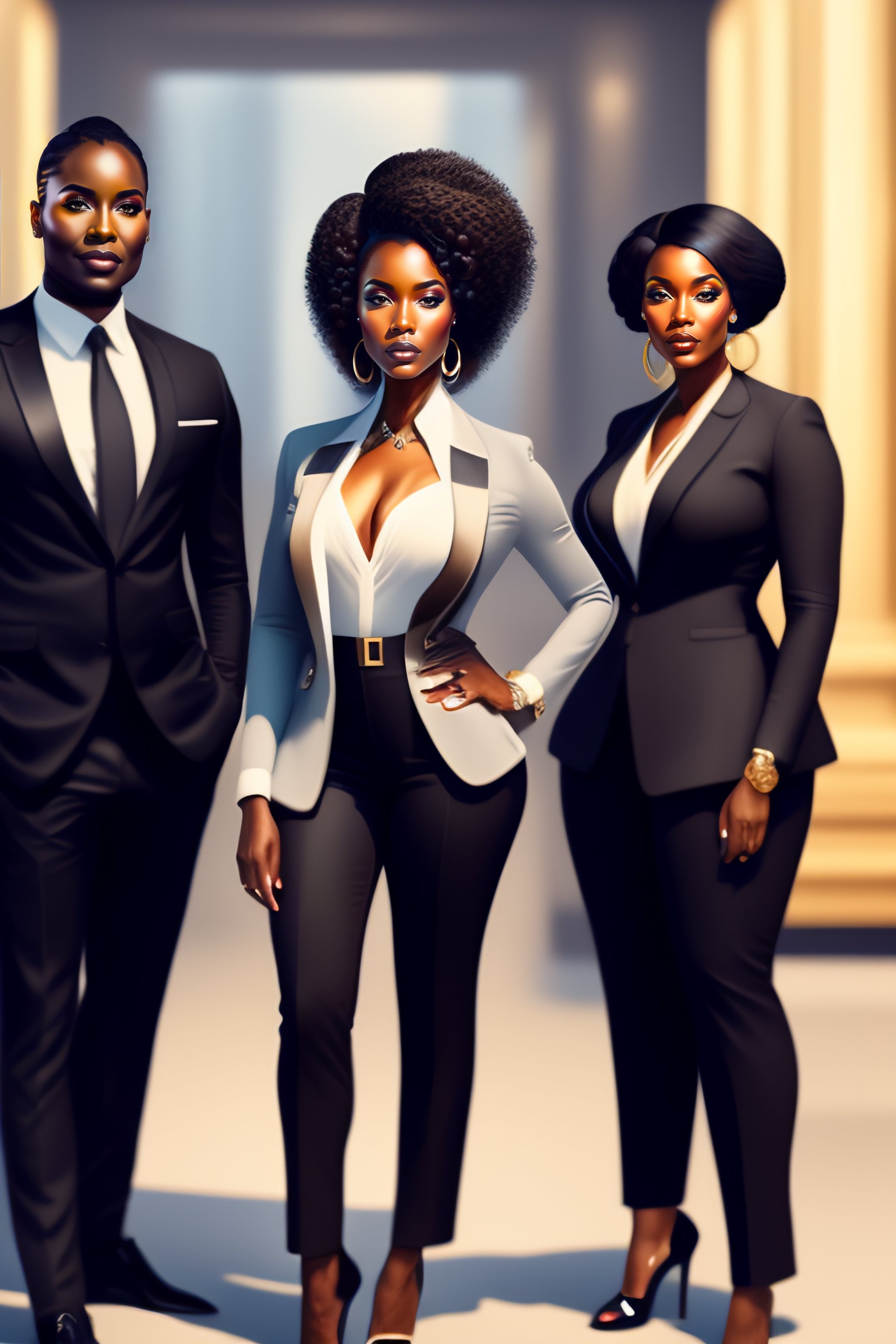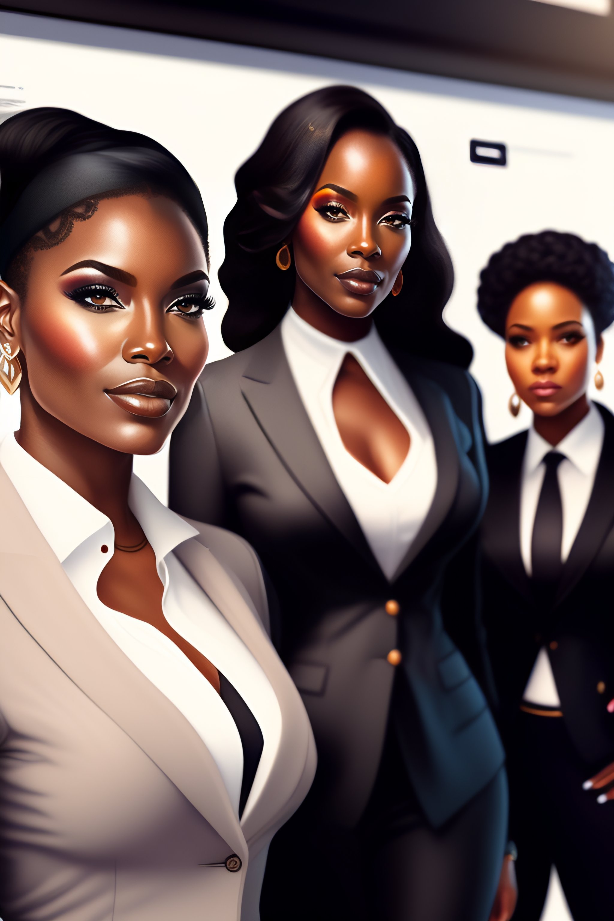 Black business woman with her team, full body, intricate, elegant, highly detailed, digital painting, concept art, art station, smooth, sharp focus