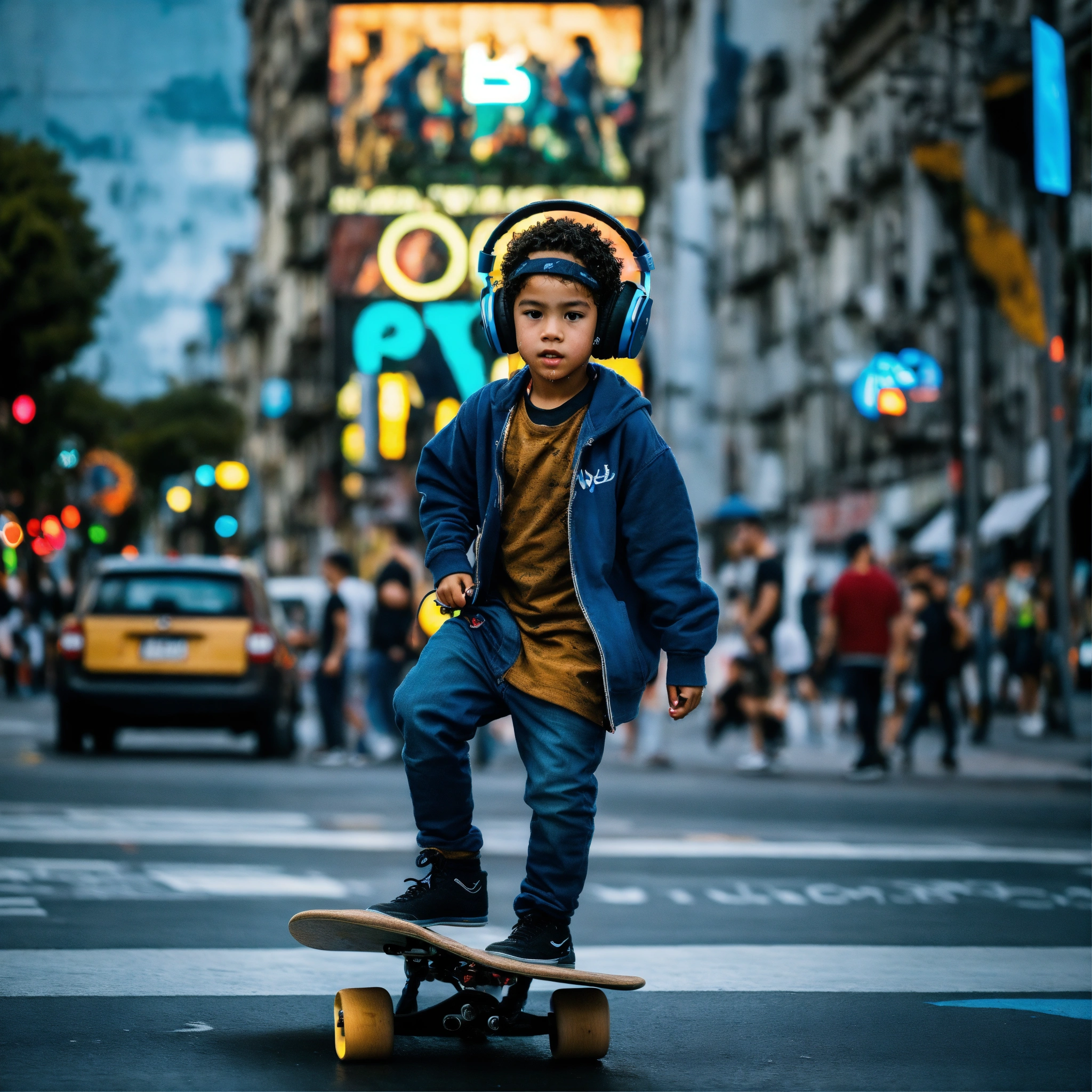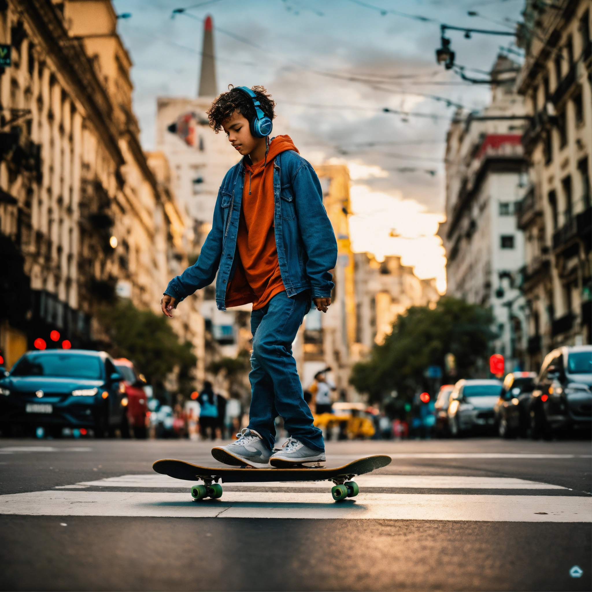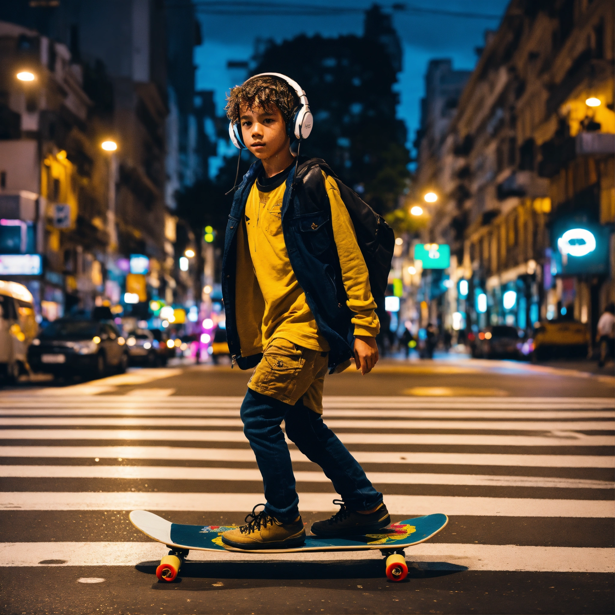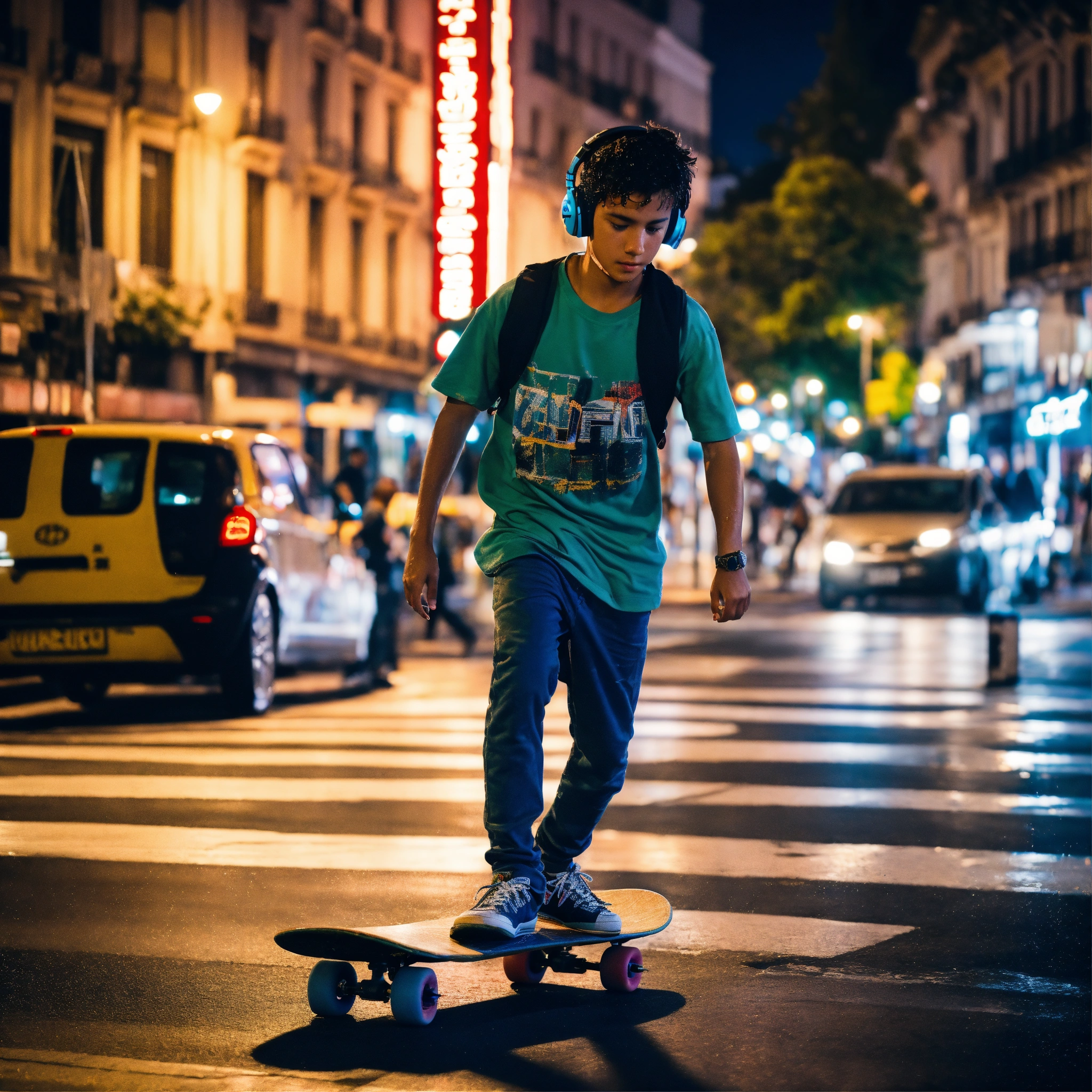 8k photo portrait of a young boy skateboarding, with headphones at a bustling crosswalk in buenos aires, argentina, obelisk at night, ywu logo, highly detailed, vibrant, production cinematic, reflections on wet street, 8k, film grain, graffiti on walls say you wouldn't understand