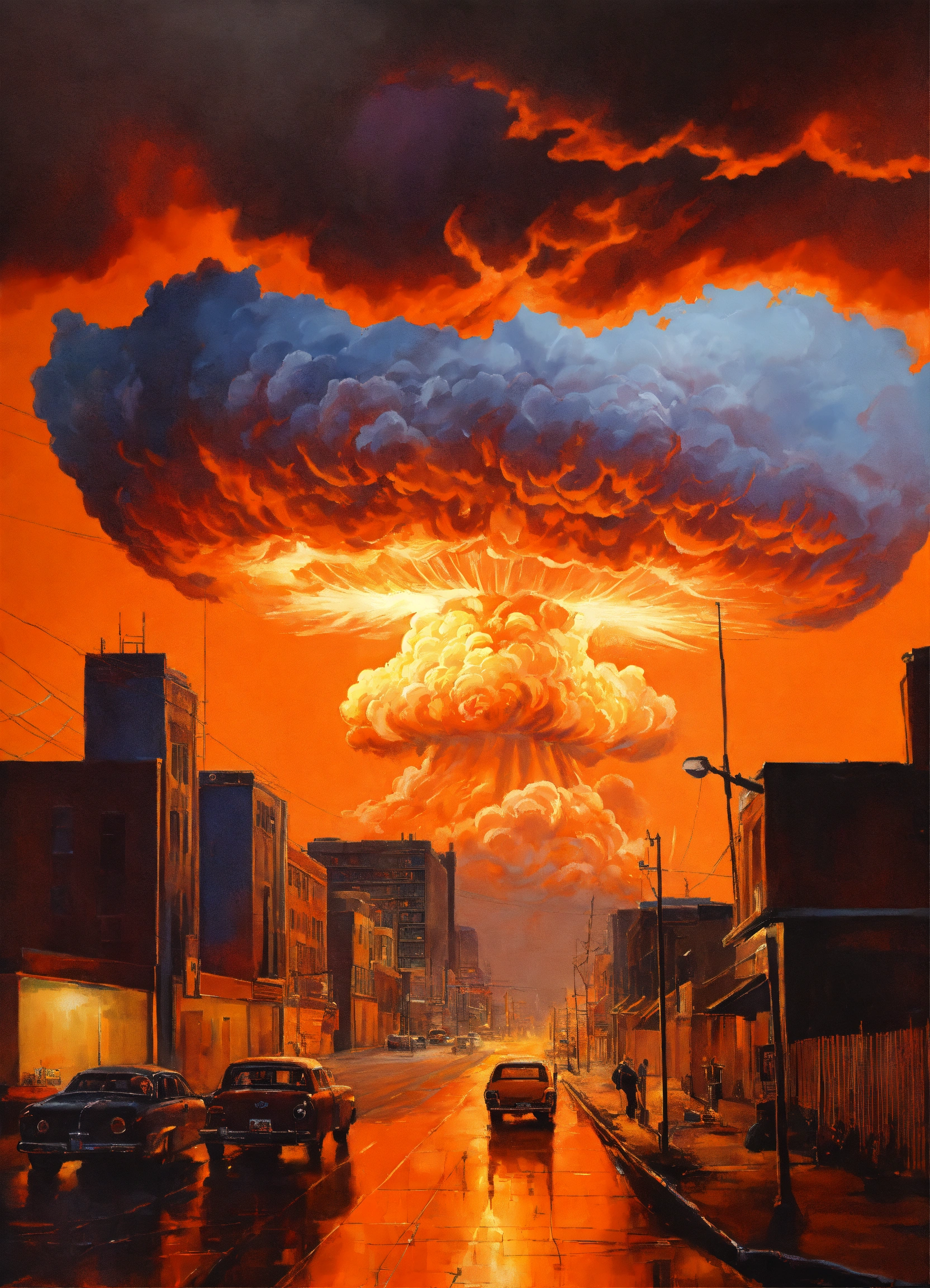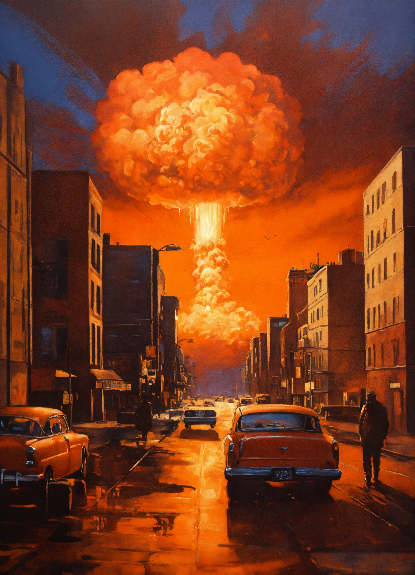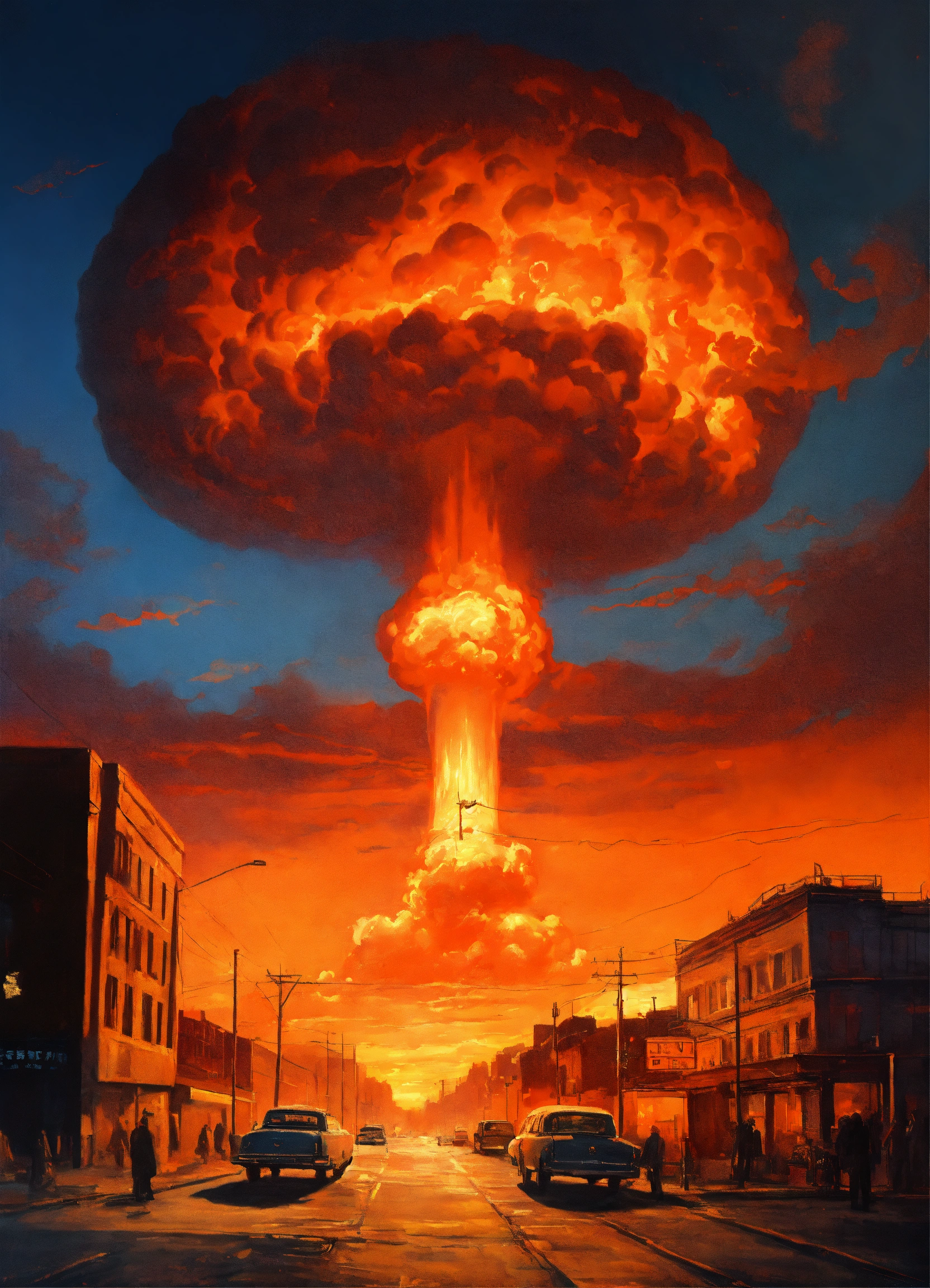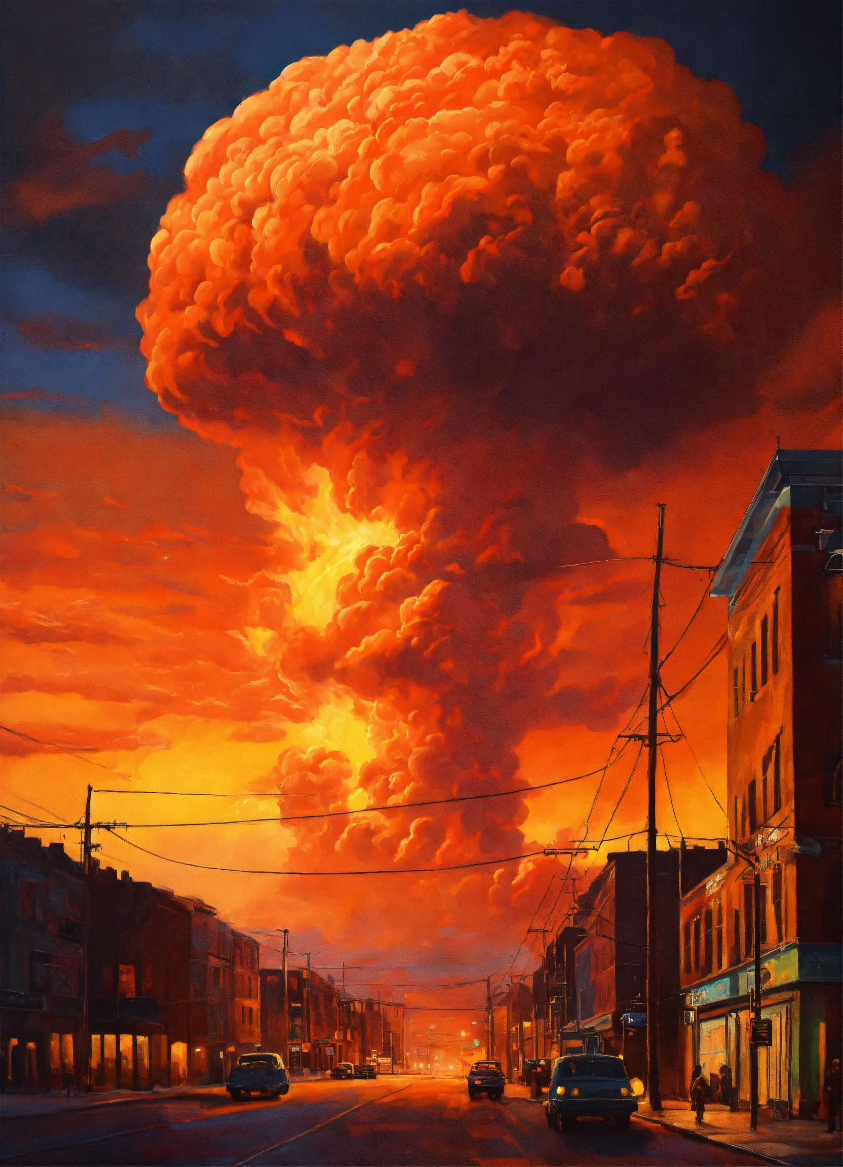Superrealist style, urban style, nuclear bomb, night, big powerful nuclear blast, orange sky, vivid hues