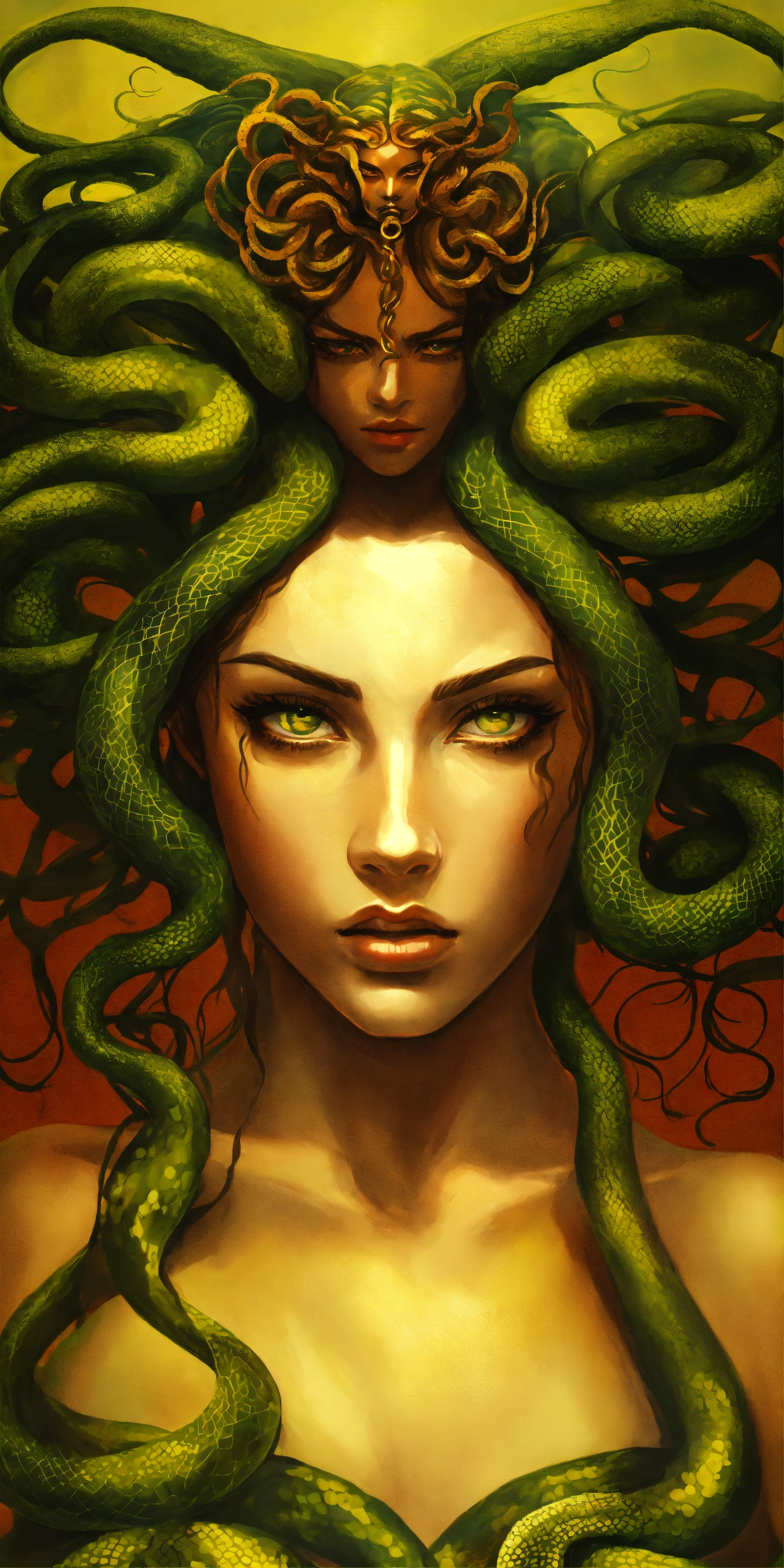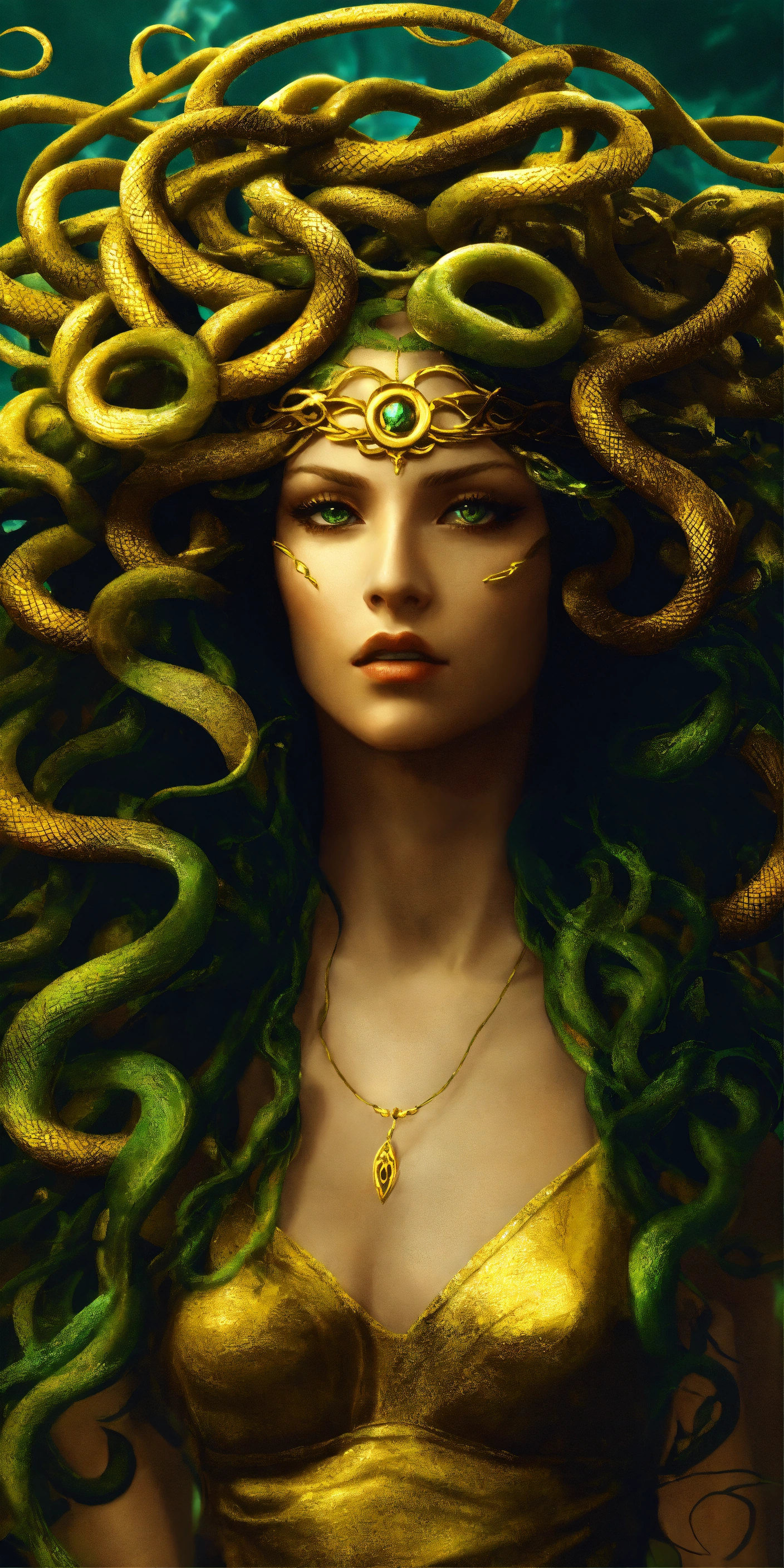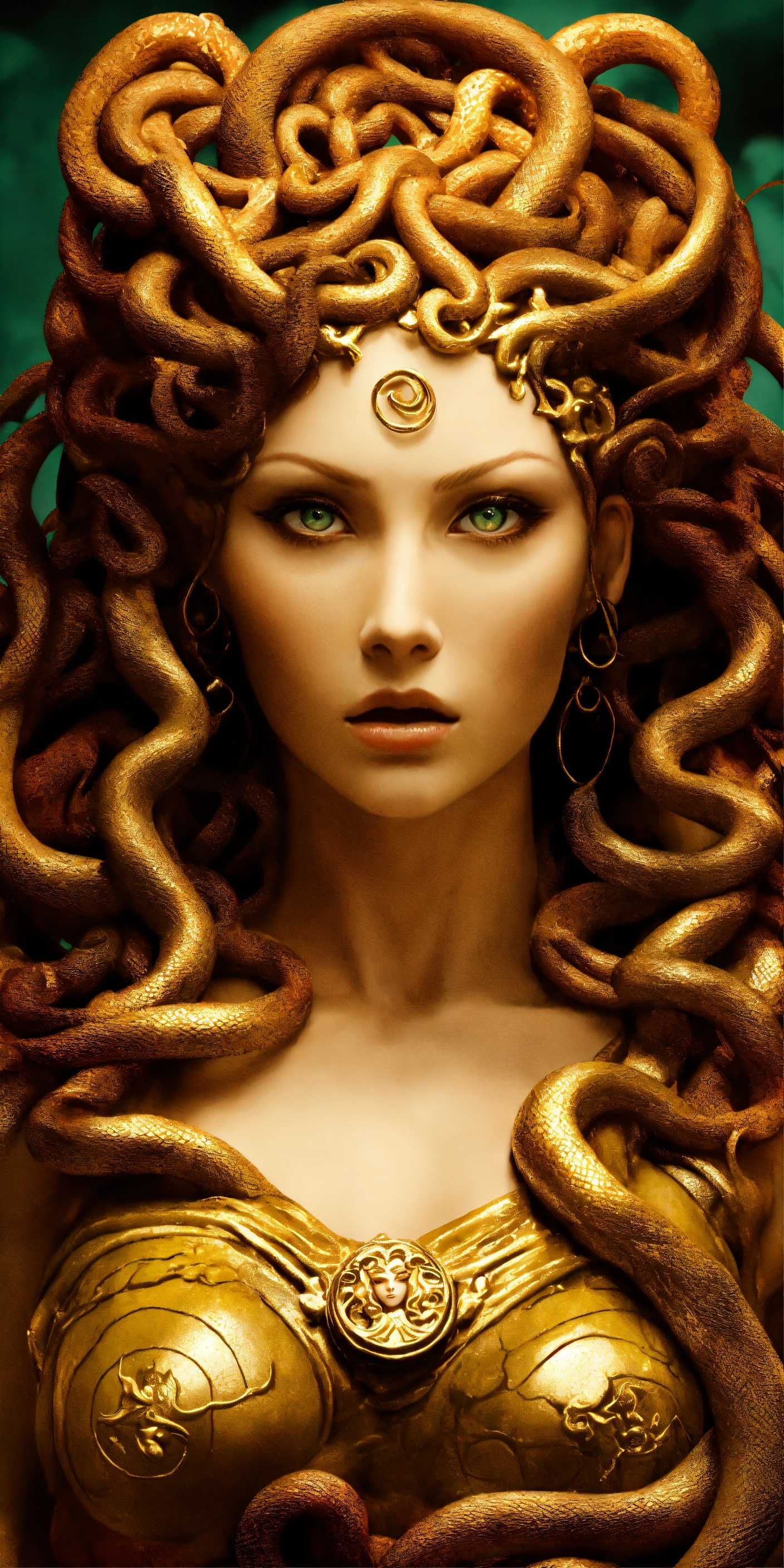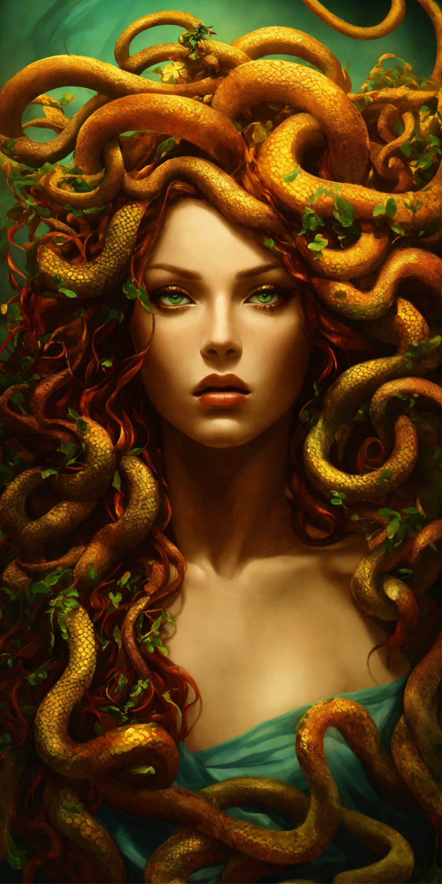 Medusa transformation and redemption a bold and unique choice, medusa's image could symbolize a journey from victimhood to empowerment. rather than focusing on the terrifying aspects, portray her in a moment of transformation or redemption, with her serpentine hair and strong gaze symbolizing wisdom and inner strength.