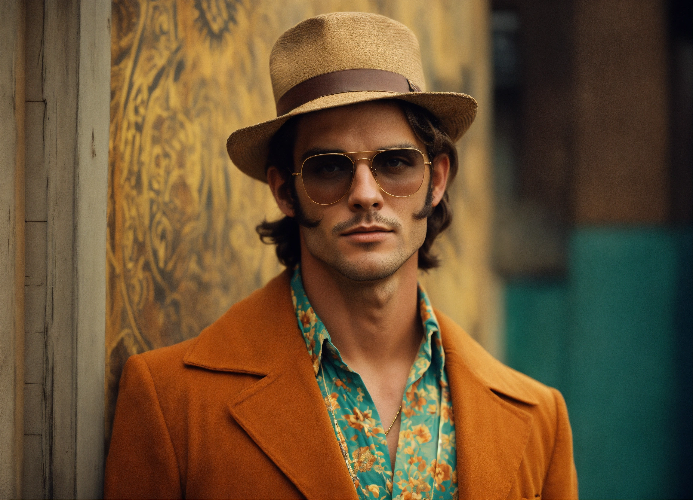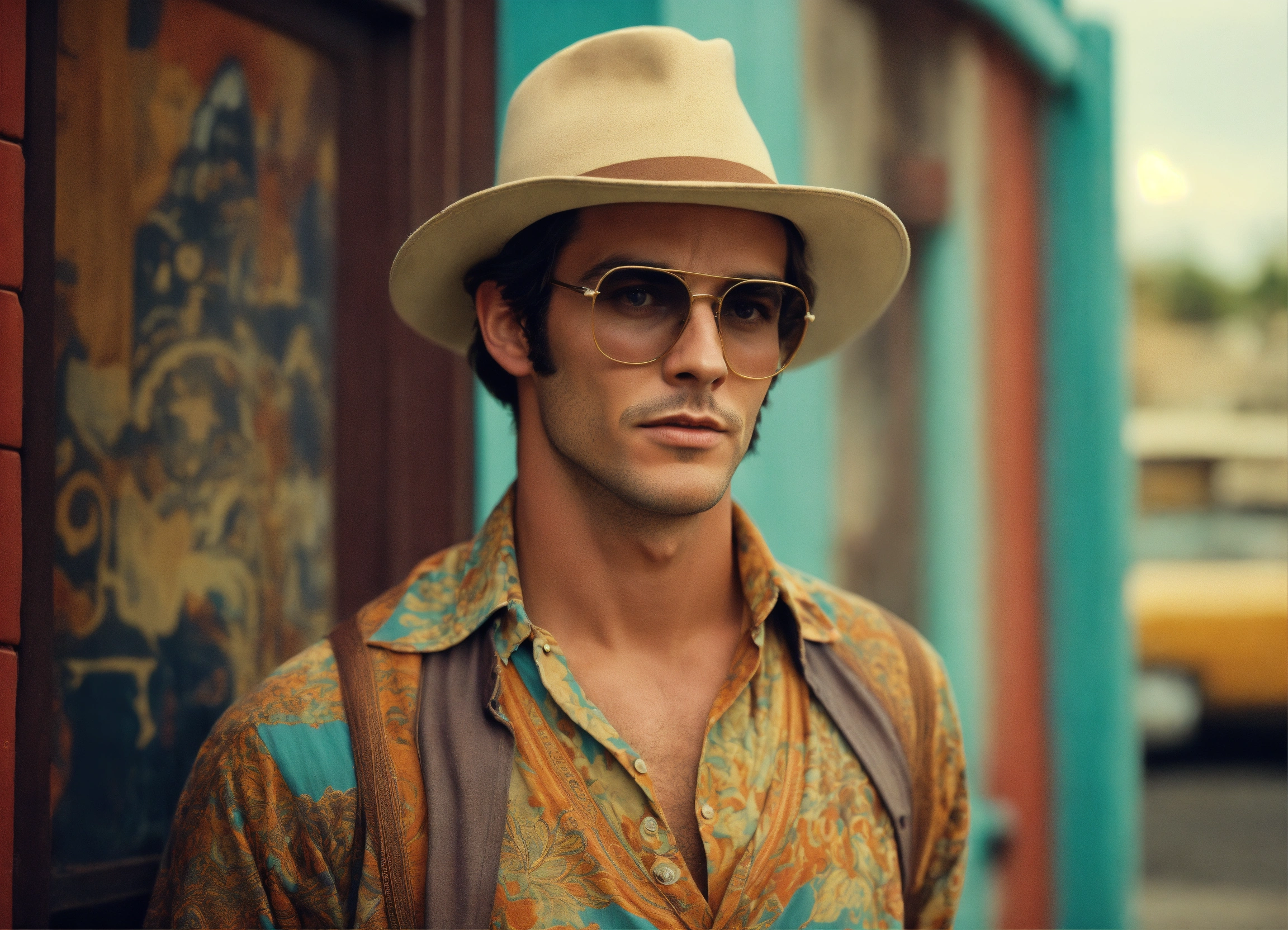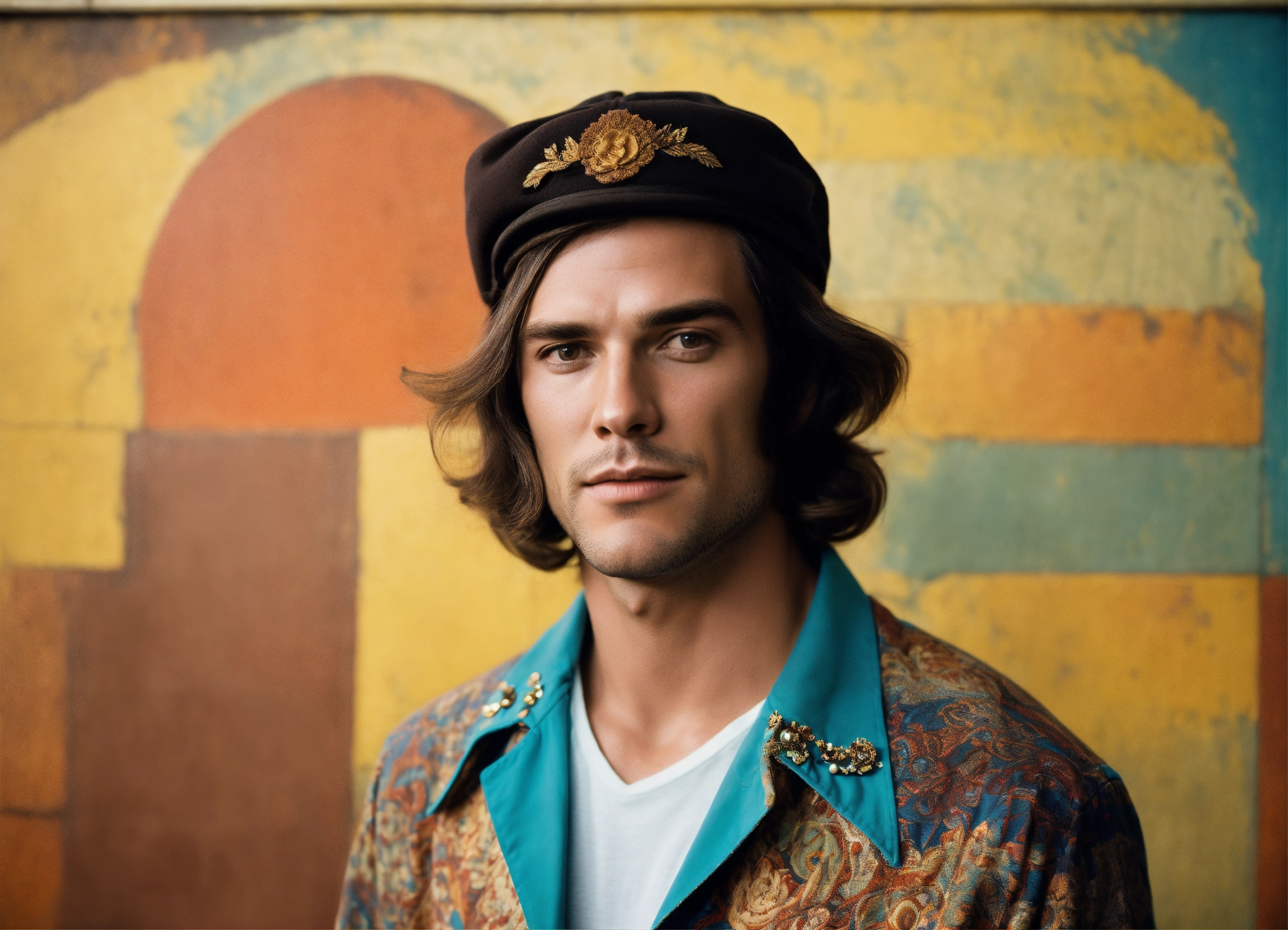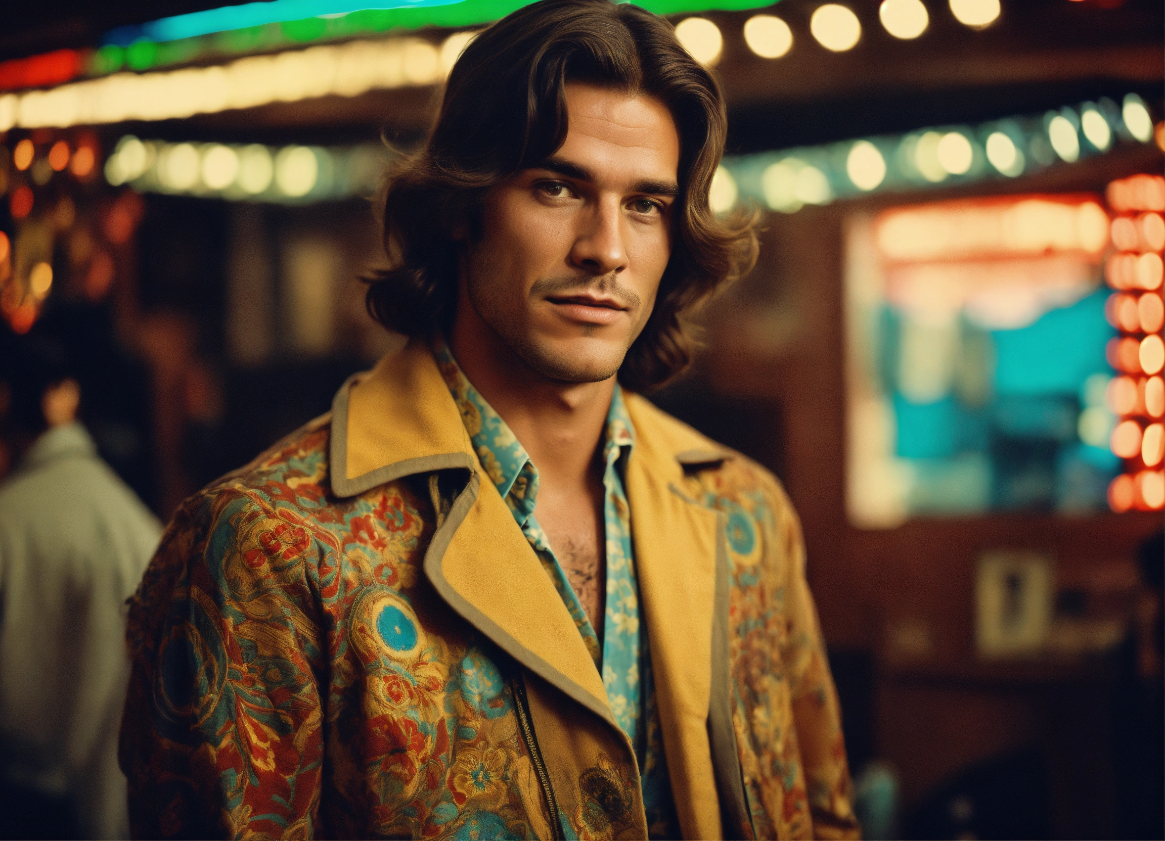 Charming man retro america style 1970-1990, hollywood background, hollywood, a square face with large cheekbones, full length, hippie