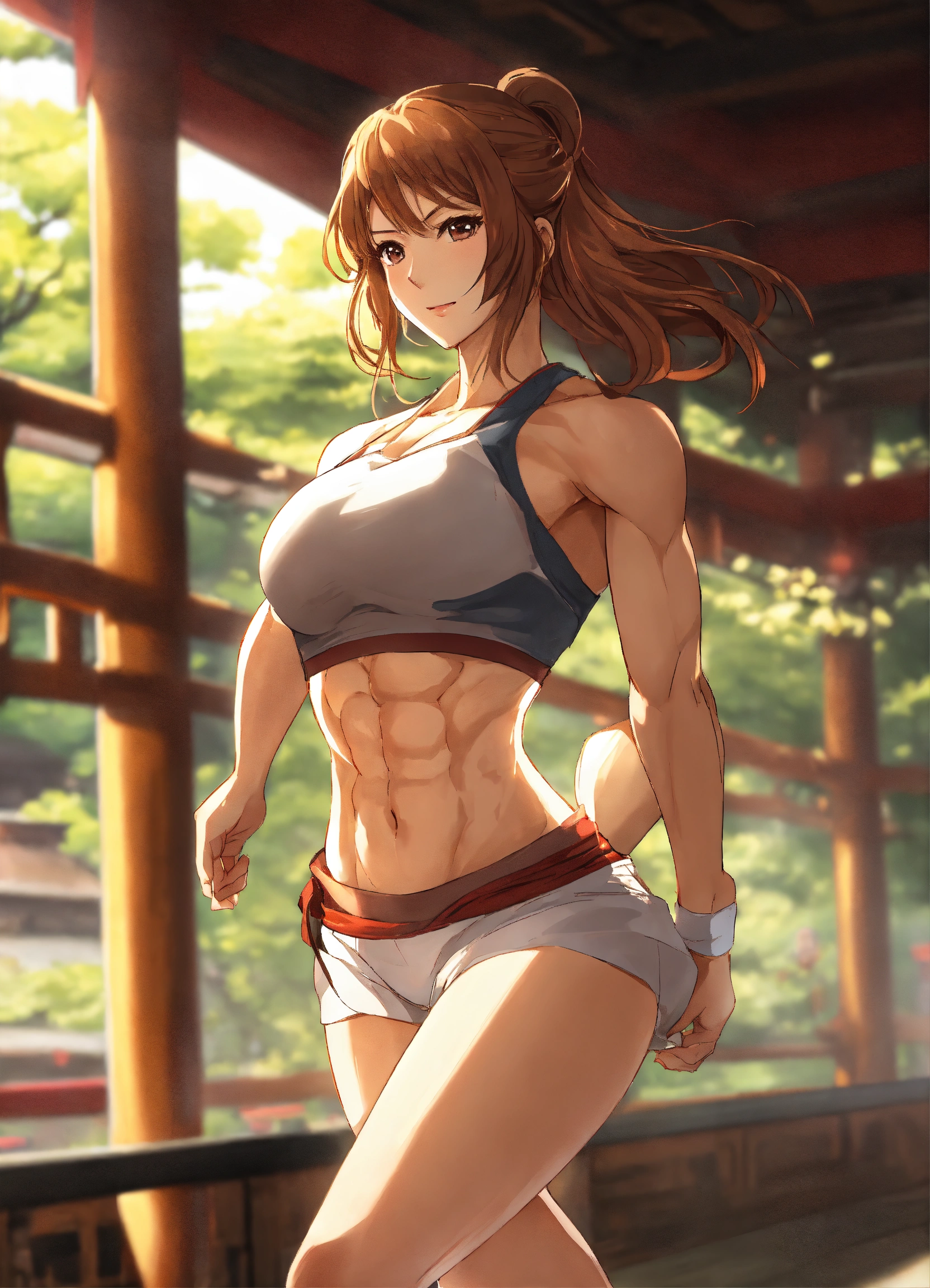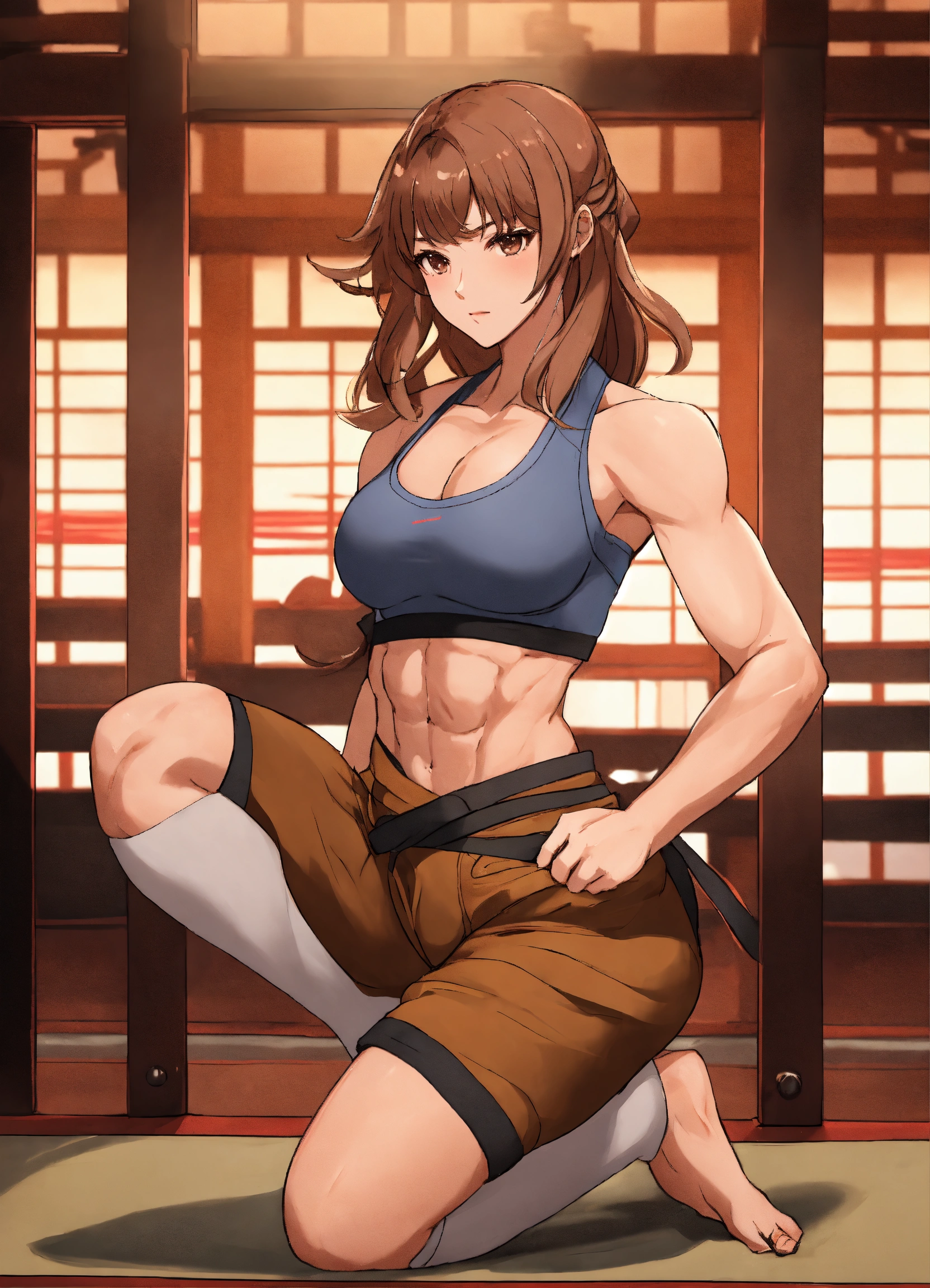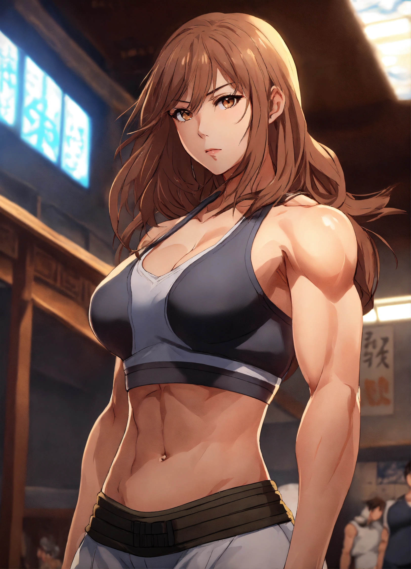 Anime beautiful light brown hair jiu jistsu girl muscles full body in dojo with strong abs and legs