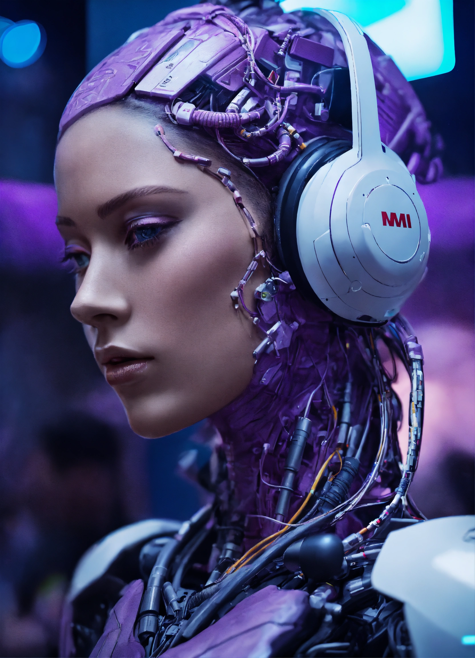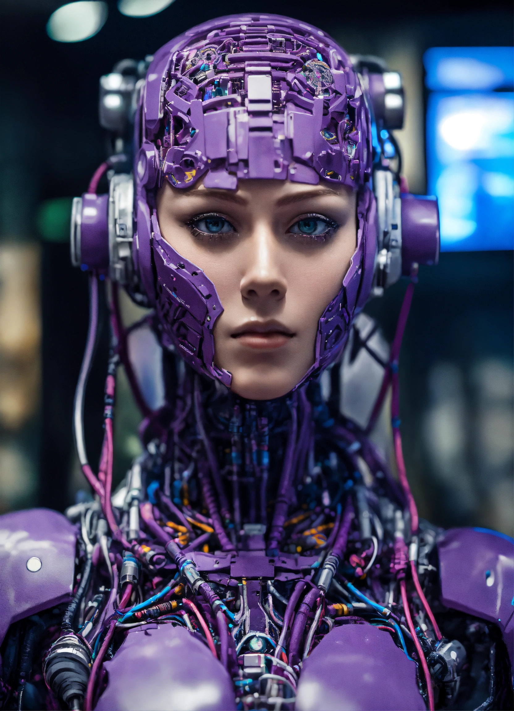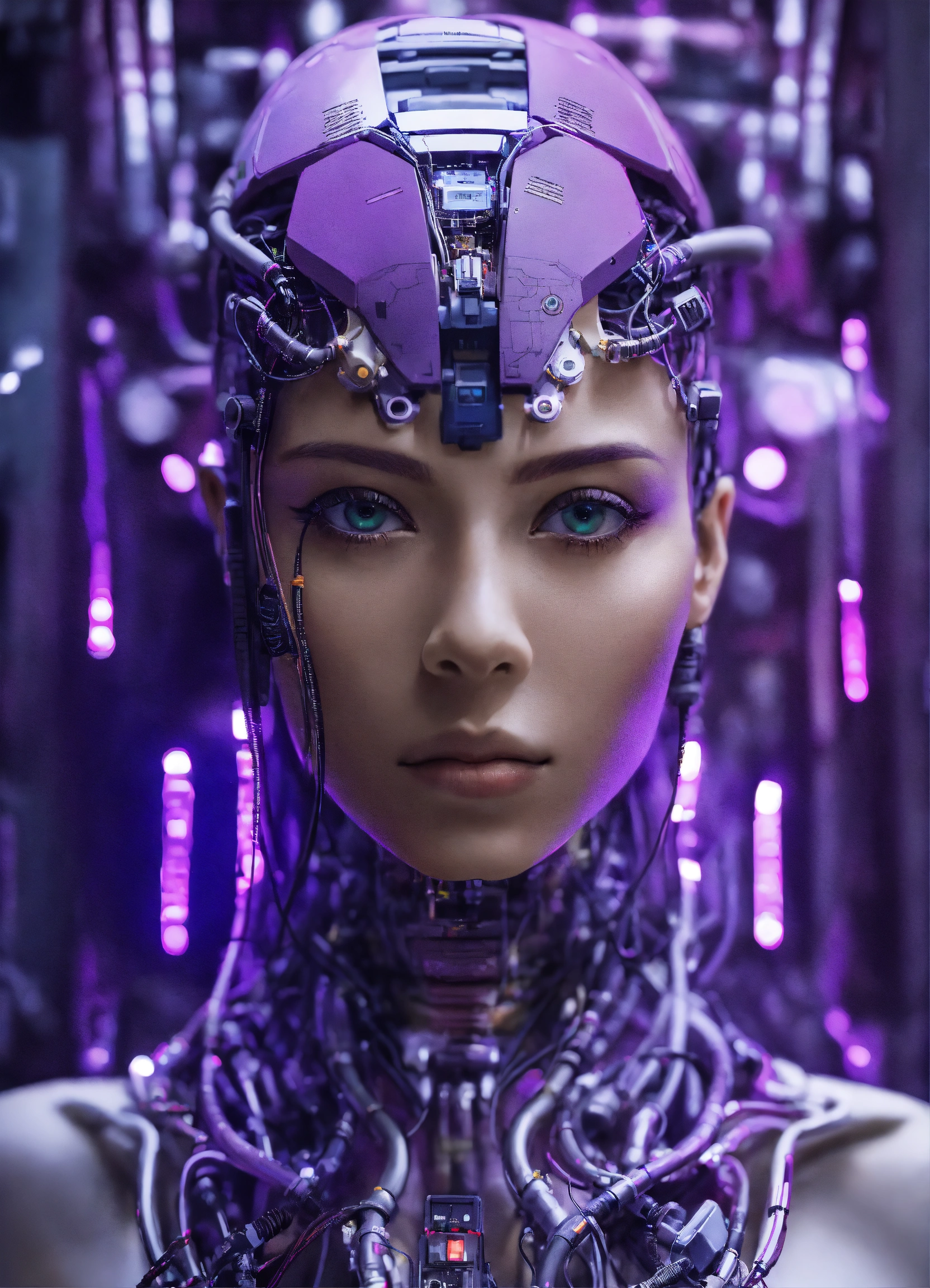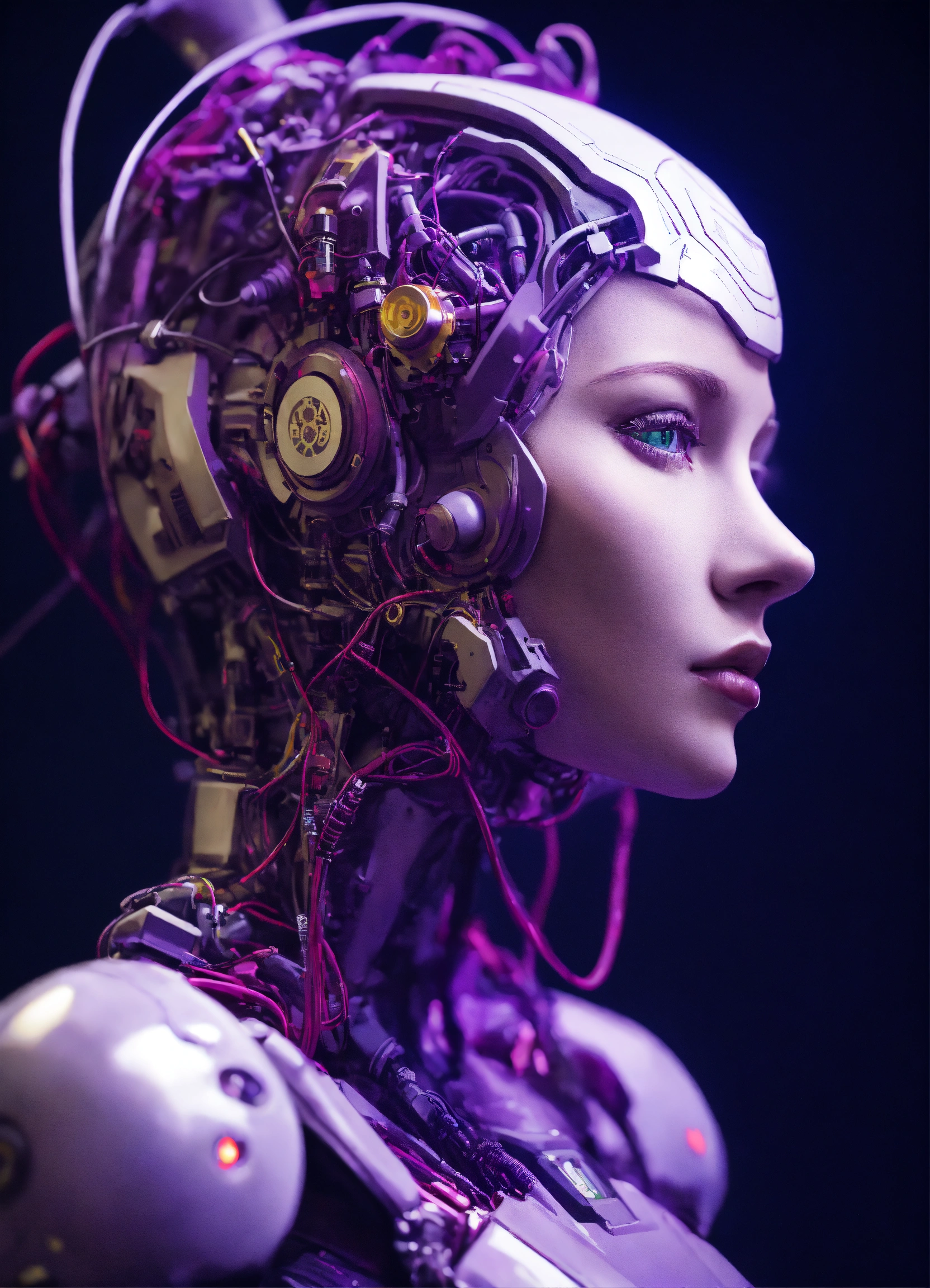 Purple electronic system on head humanoid |cyborg woman| with a visible detailed brain| with a visible detailed heart| muscles cable wires| biopunk| cybernetic| cyberpunk| white marble bust| canon m50| 100mm| sharp focus| smooth| hyperrealism| highly detailed| intricate details| carved by michelangelo