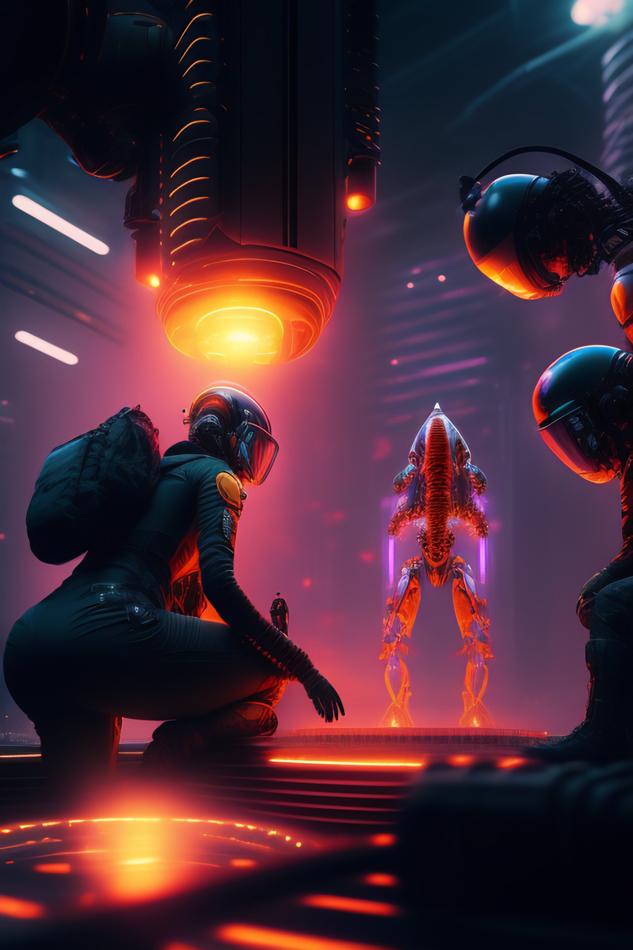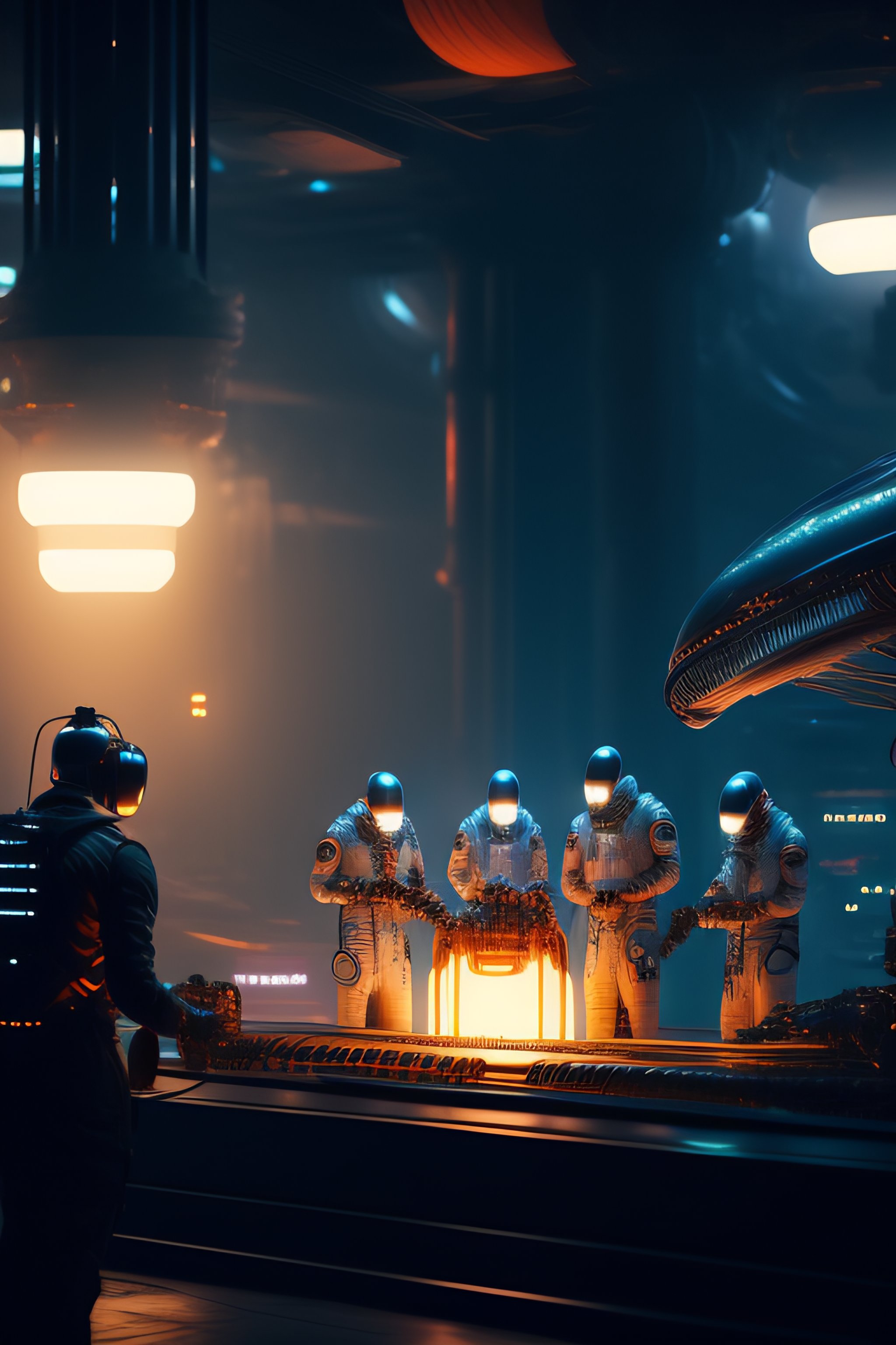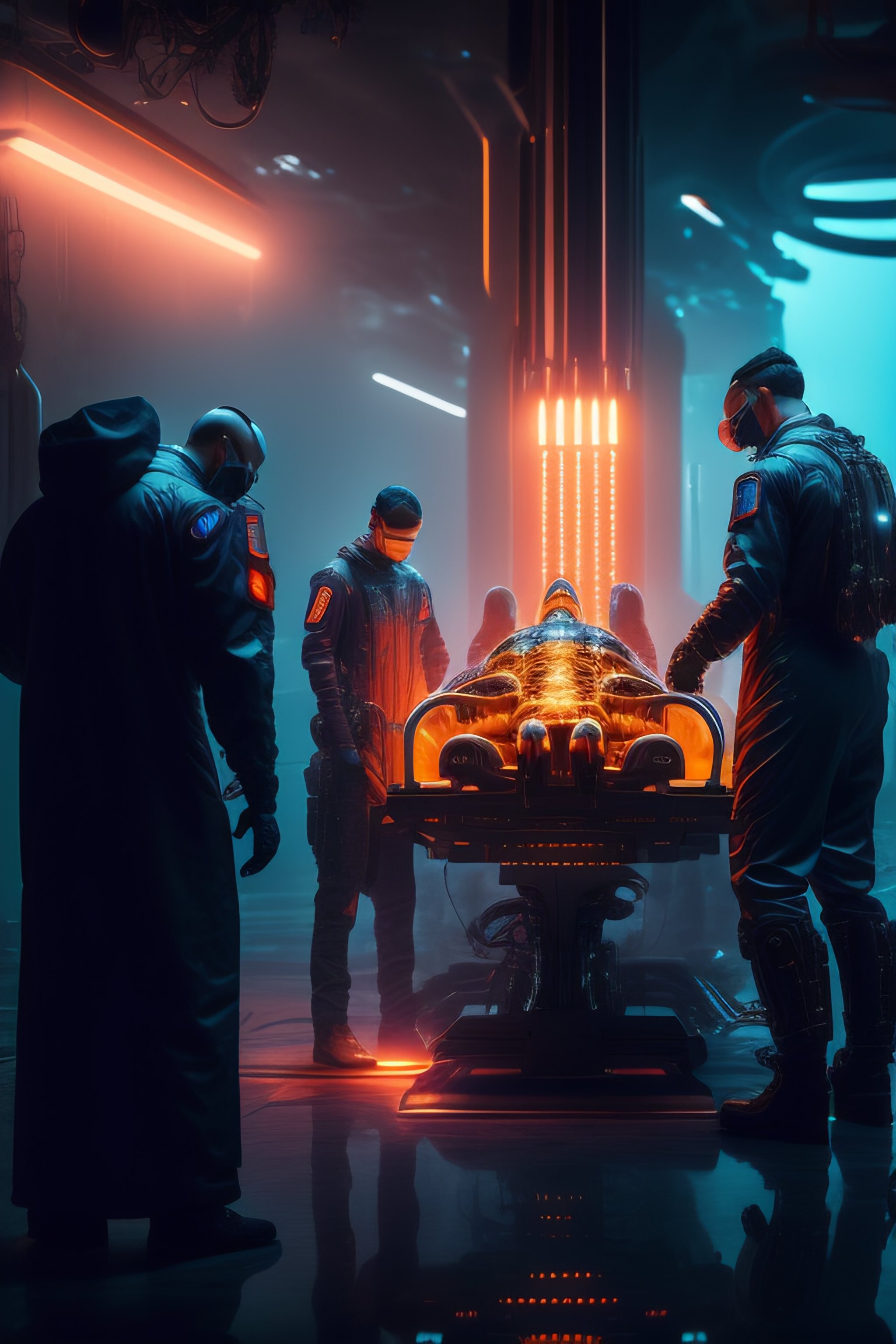 Group of doctors performing an operation on an alien biomechanical, full body cinematic style digital art render with mechanical and futuristic details in a cyberpunk underworld, moody atmospheric lighting, techno horror, dangerous, directed by roger deakins