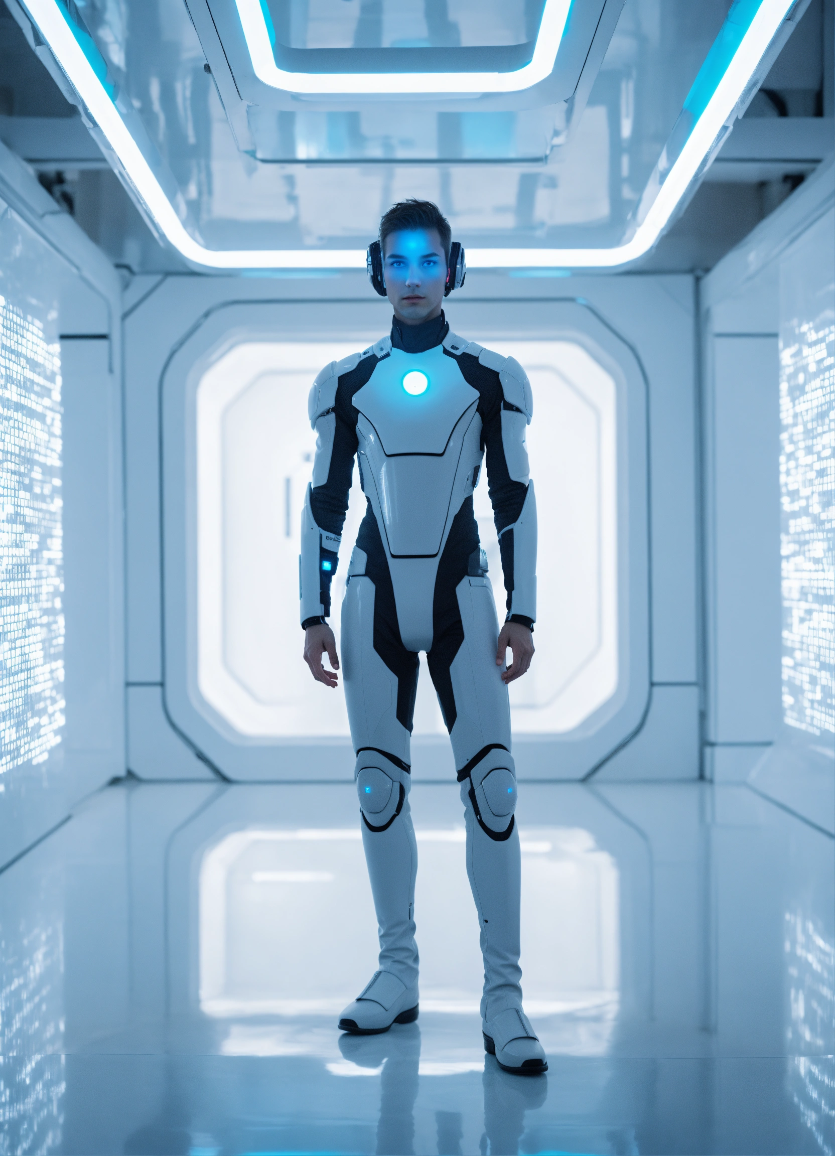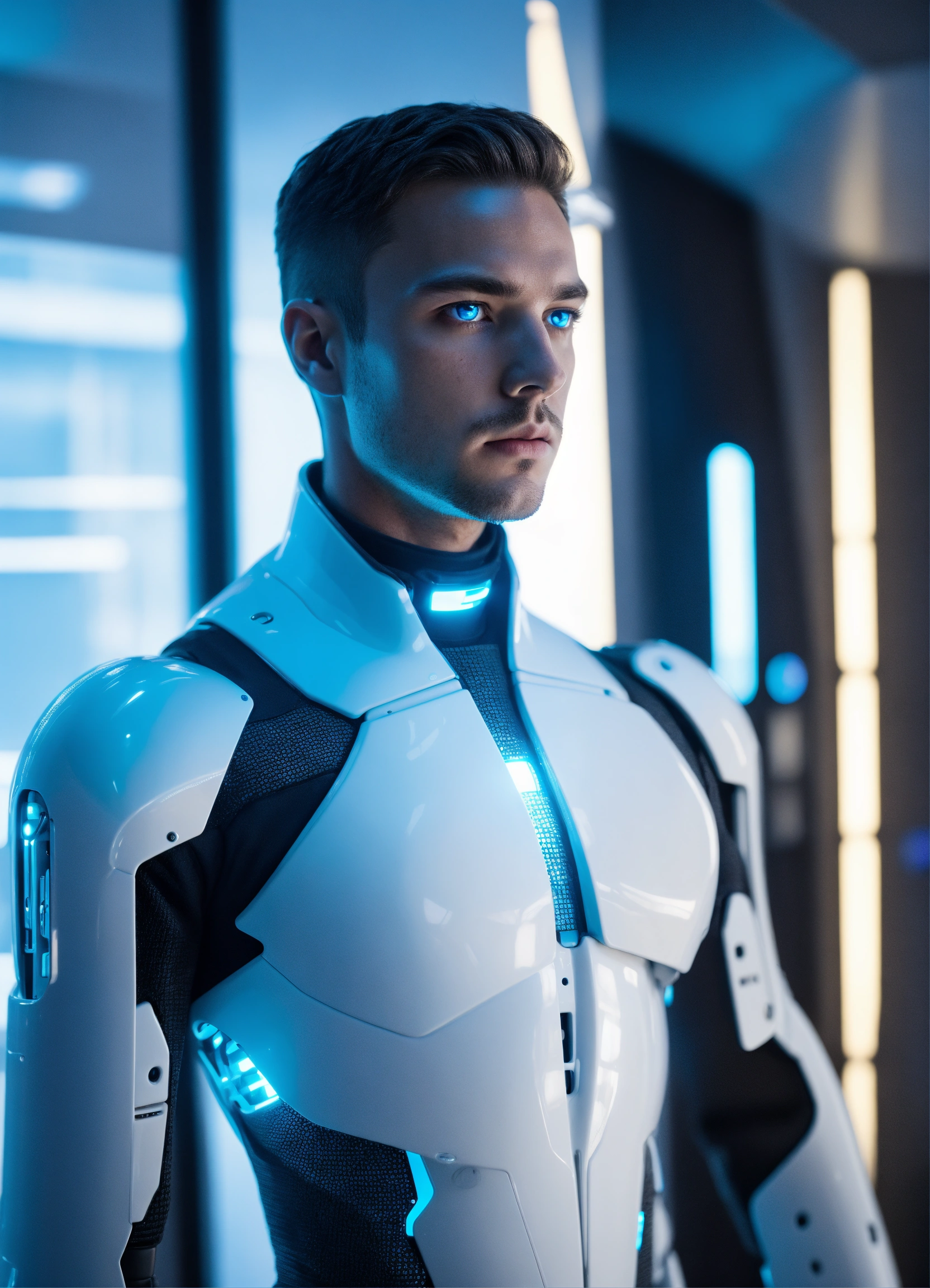Human looking male android standing in a white futuristic room with glowing blue eyes