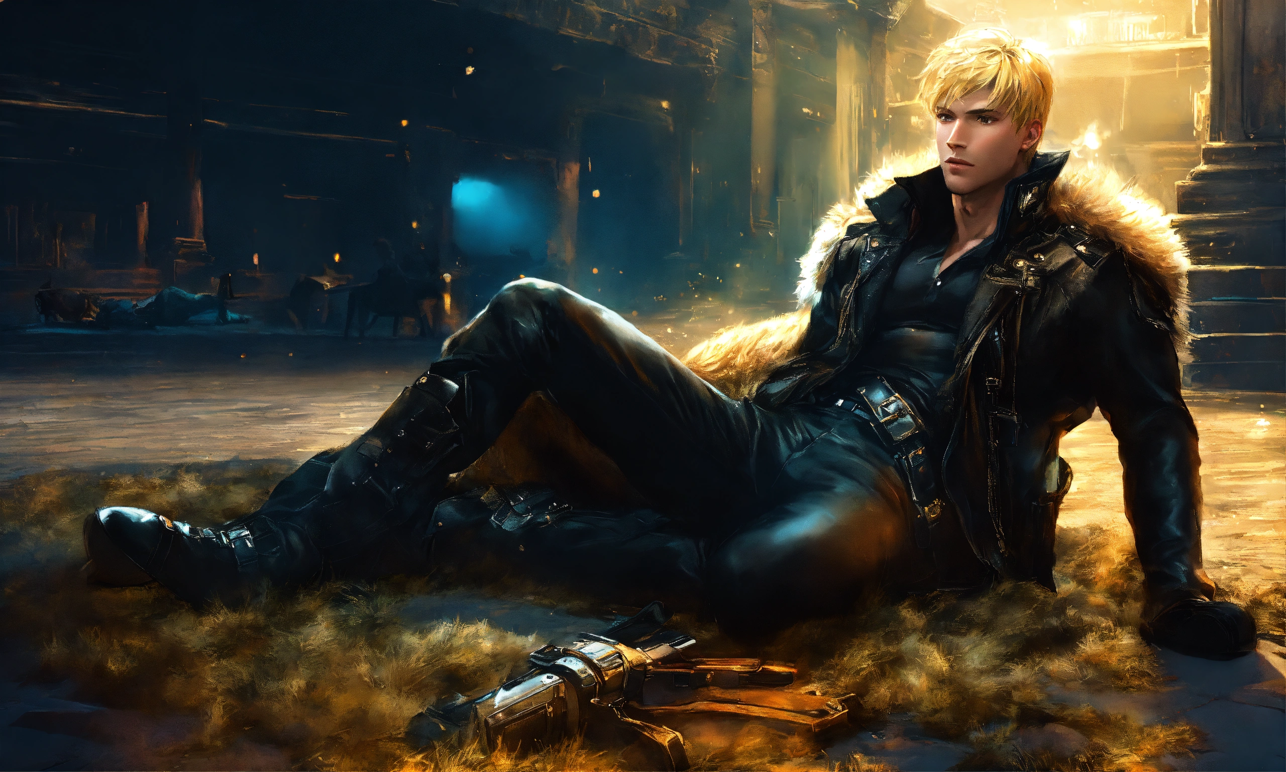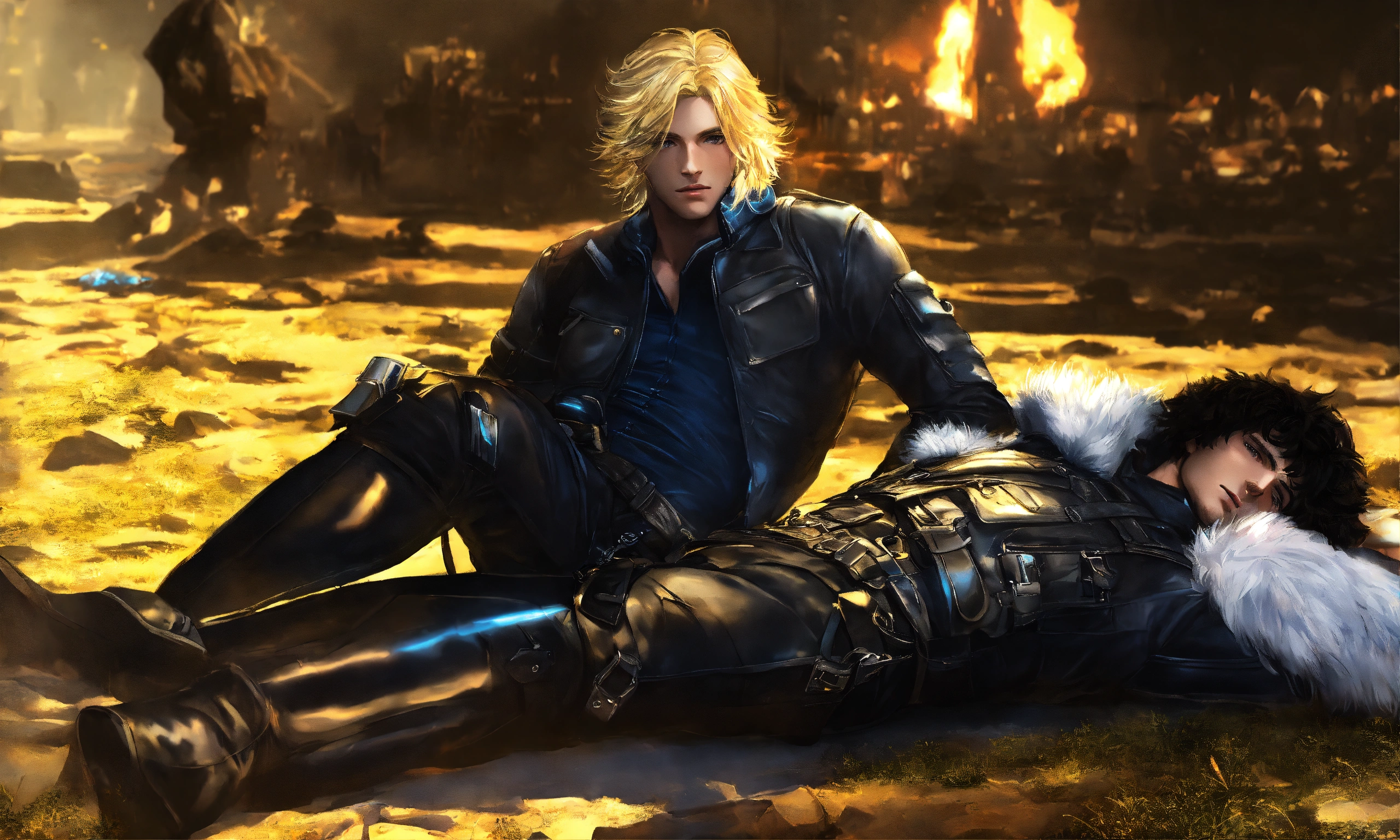 Blond male in metall armer and fur standig over black haired male laying on the ground digital art