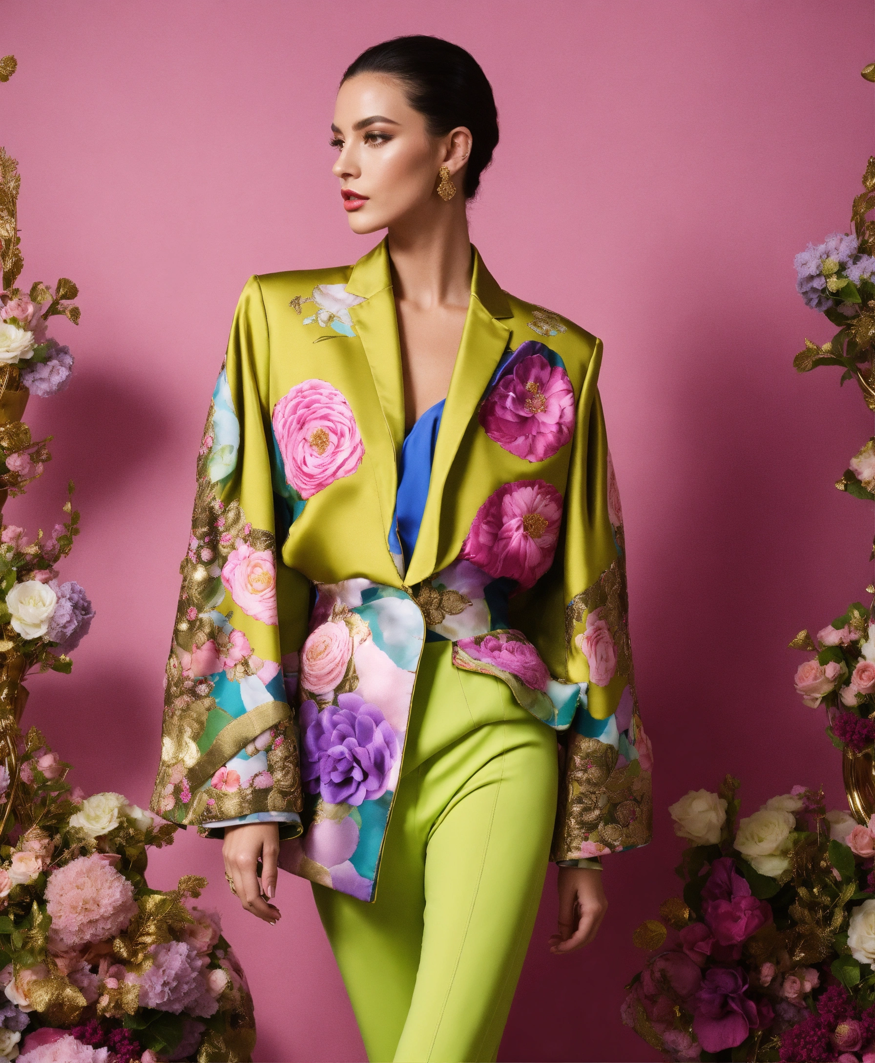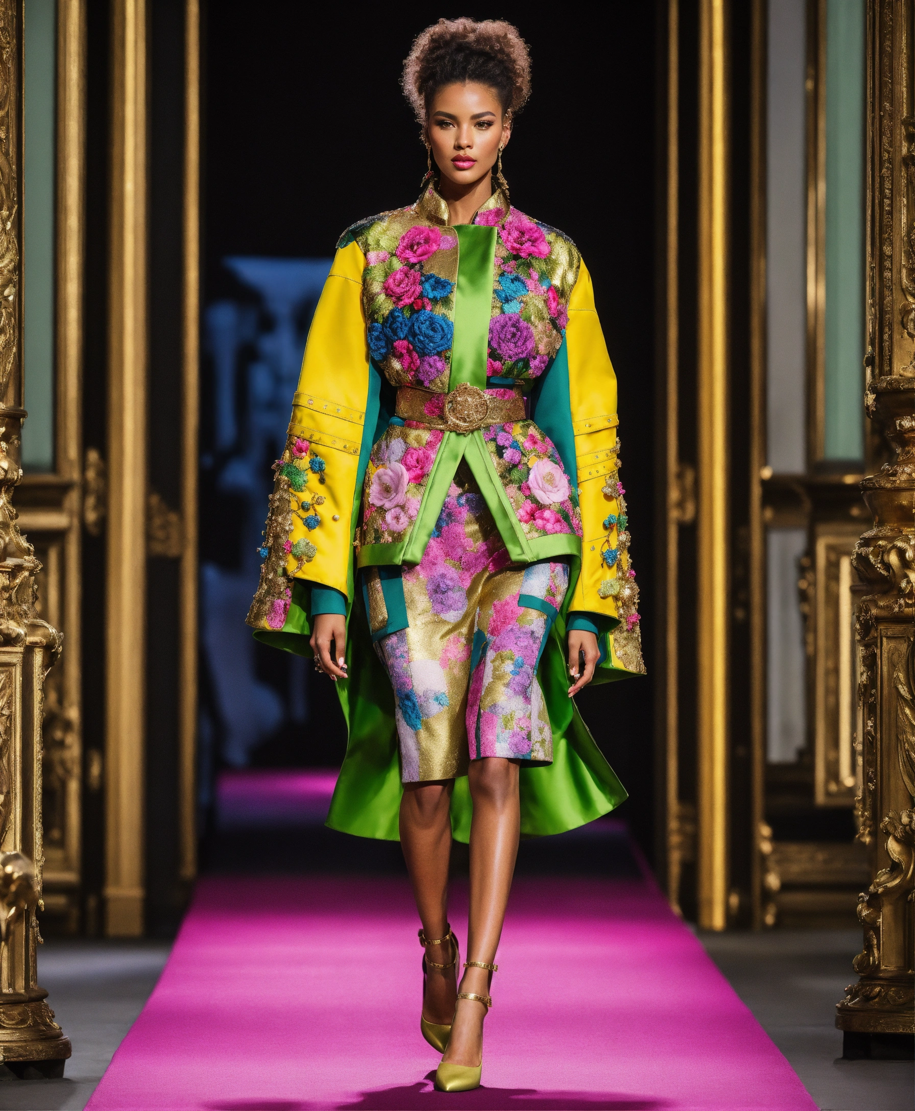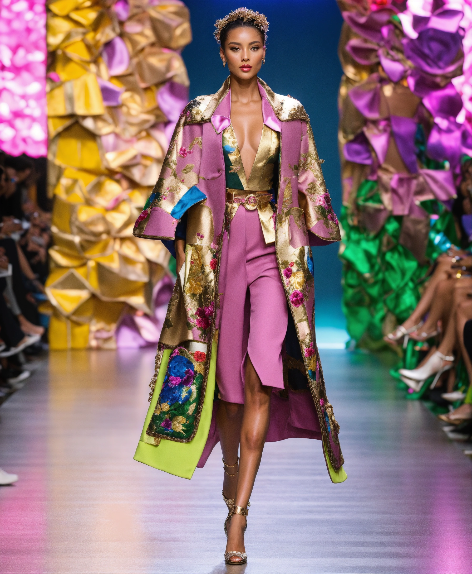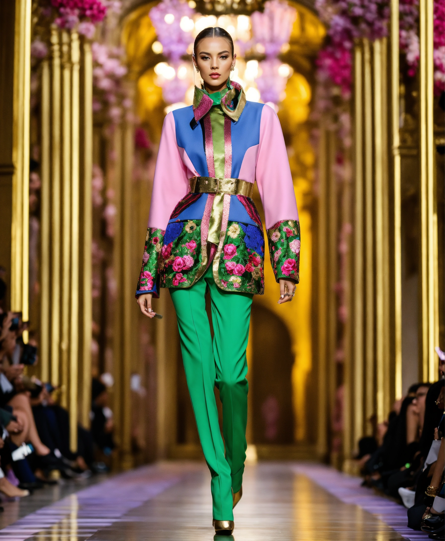 Ultra realistic full body photo of a stylish edgy european model walking the runway modeling summer designer novelty interesting complex unusual street sporty classy modern dolman sleeve outfit brave, paris versailles details cutouts and and gold geometric pattern floral structured tailored jacket pink gold green lilac peridot silver magenta lime fuchsia yellow blue black gray copper mauve bronze haute couture ultimate elegance beautiful luxurious awesome appliques haute couture wealthy resplendent magnificent sublime 12k