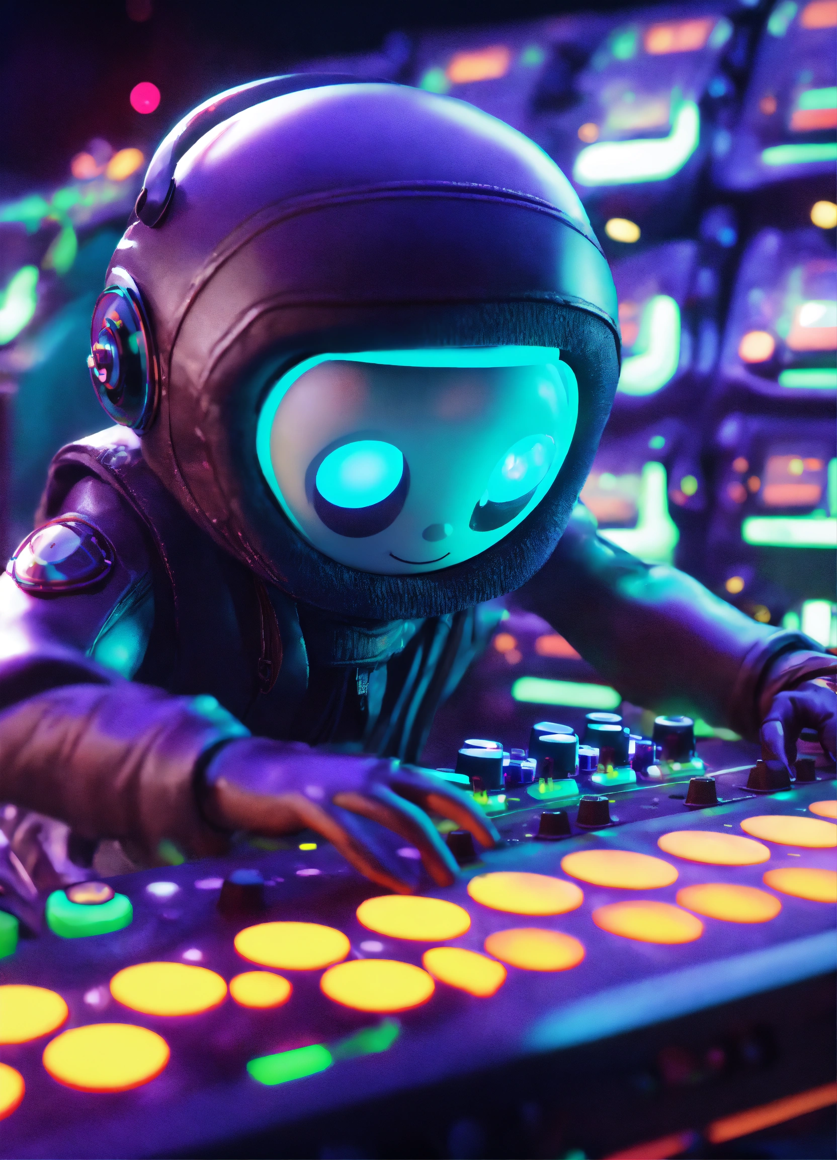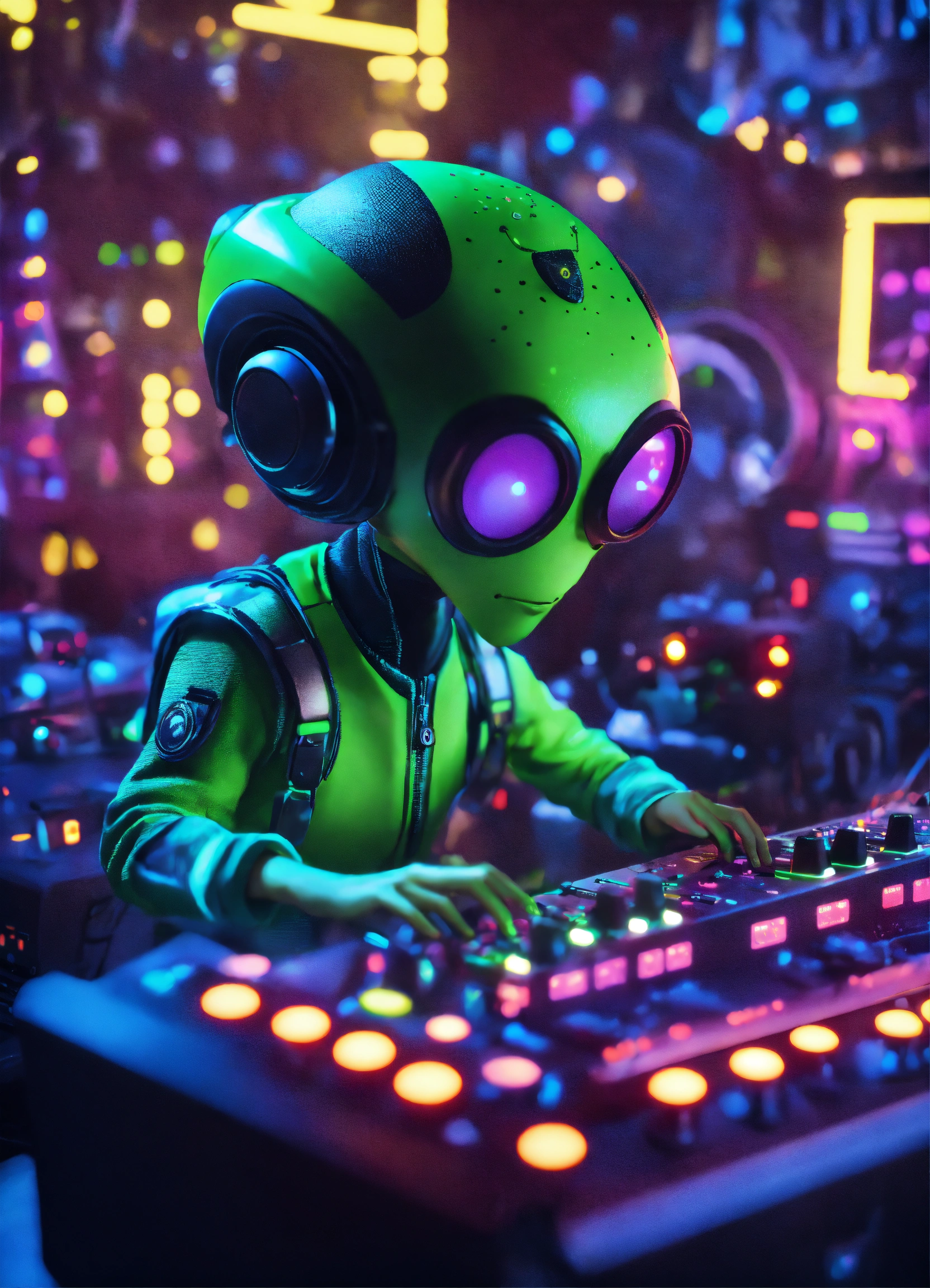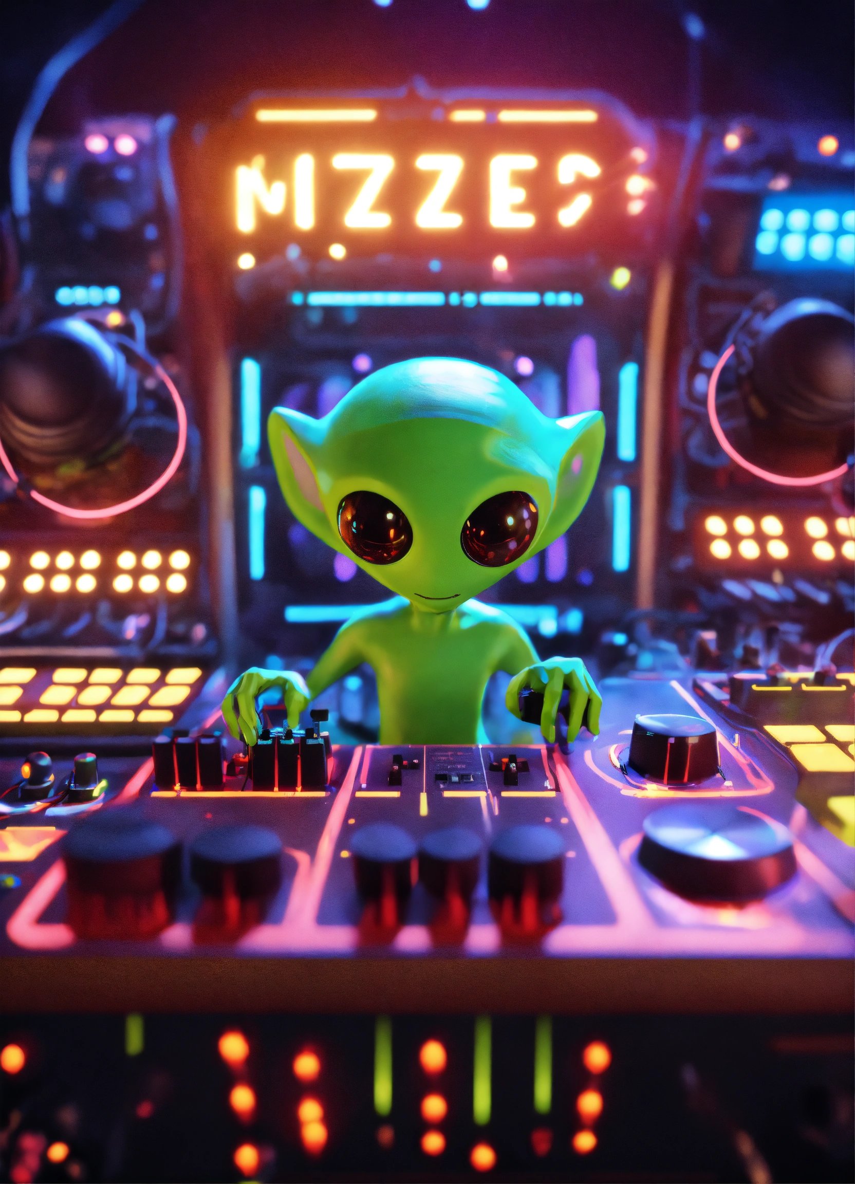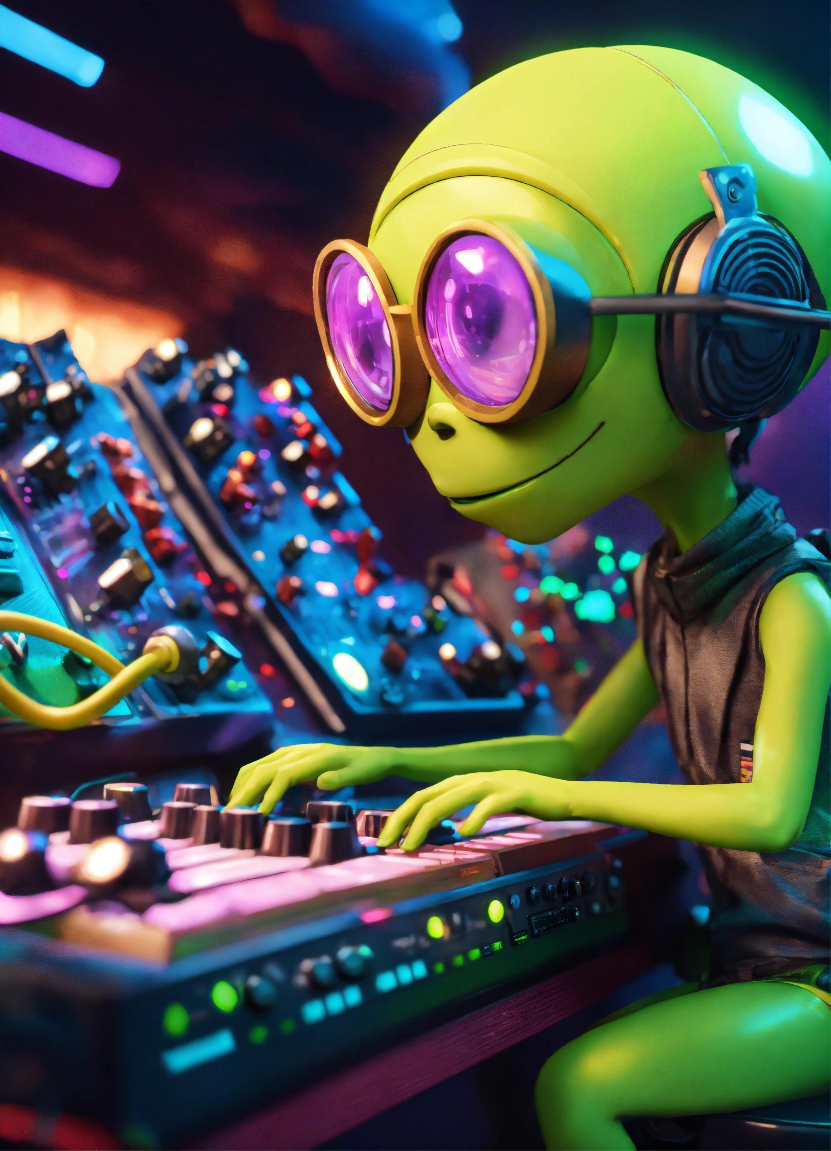 Zoom out cute alien cartoon character turning knobs on a alien modular analog synthesizer at a rave on a spaceship, pixar, unreal engine, 8k.