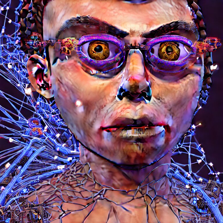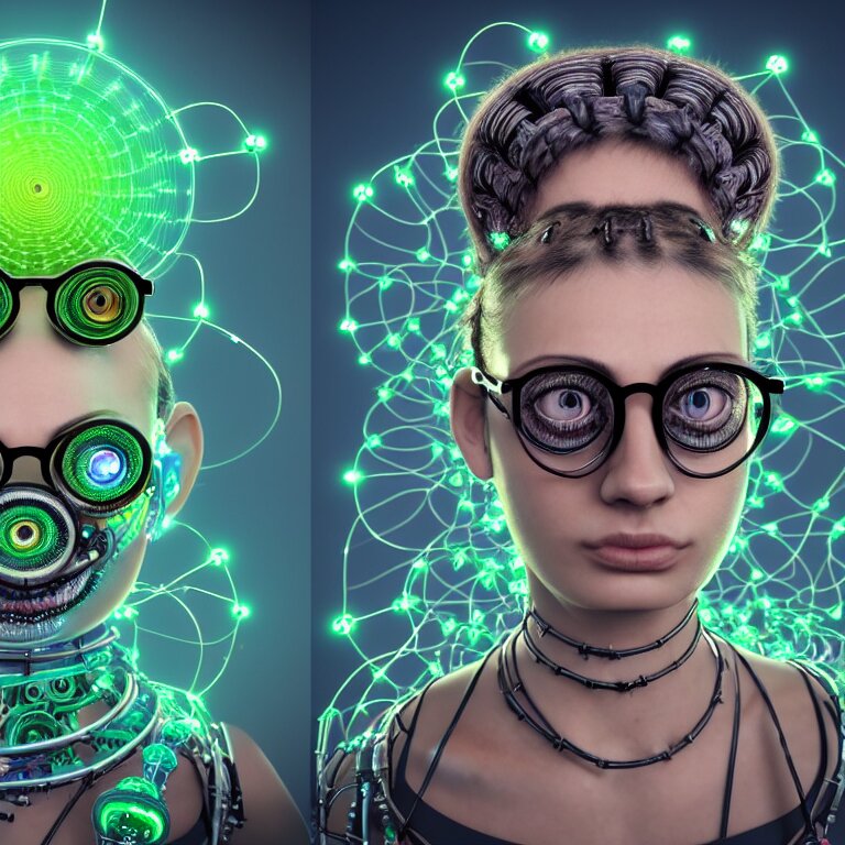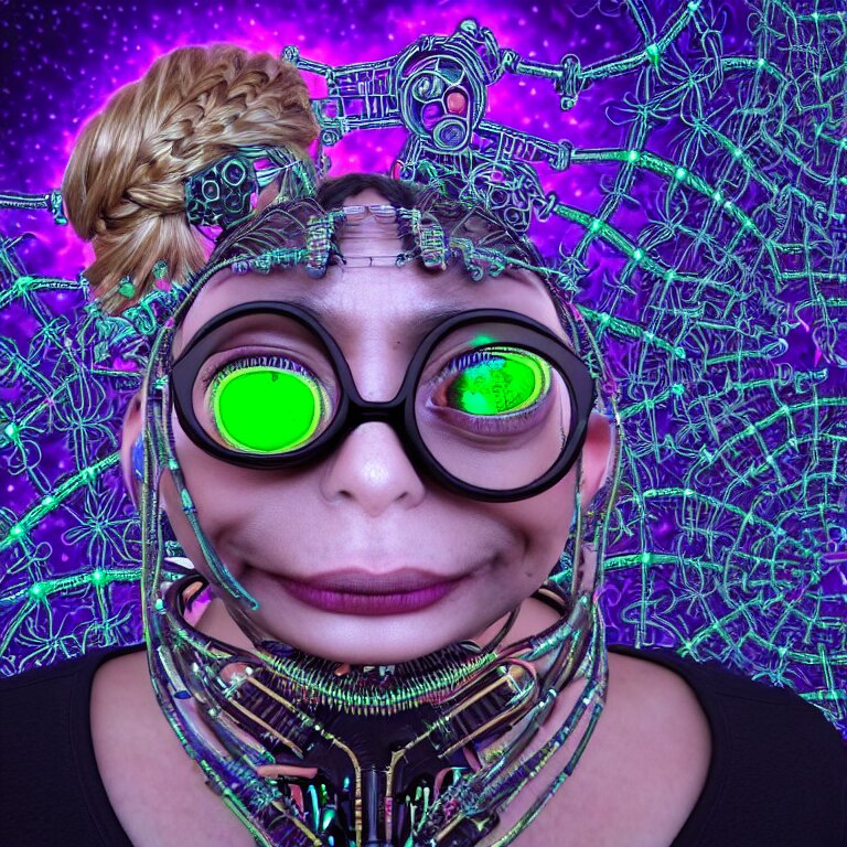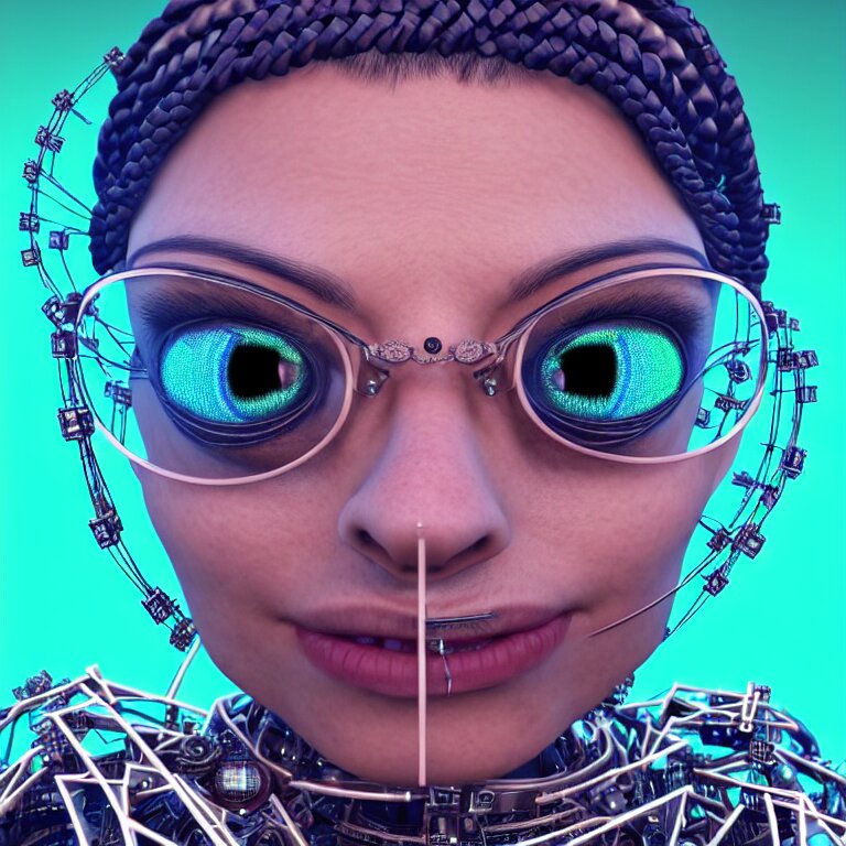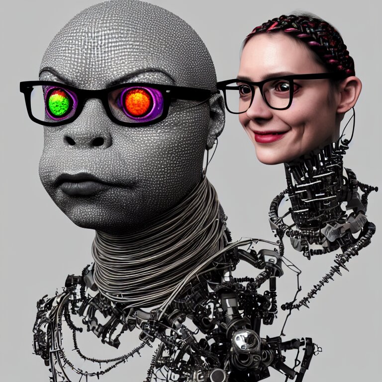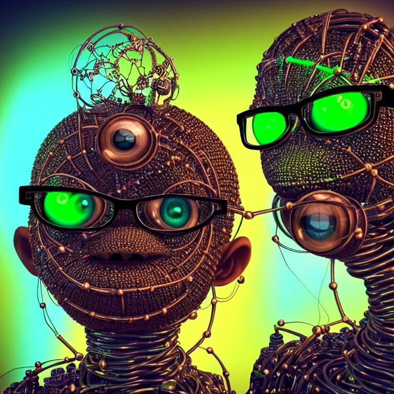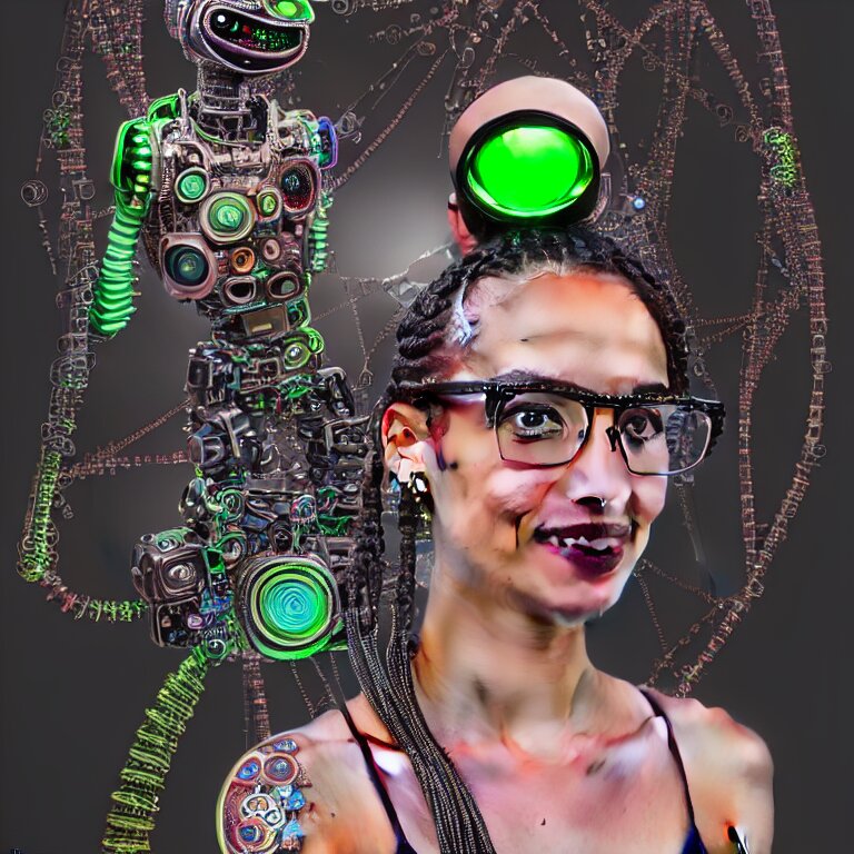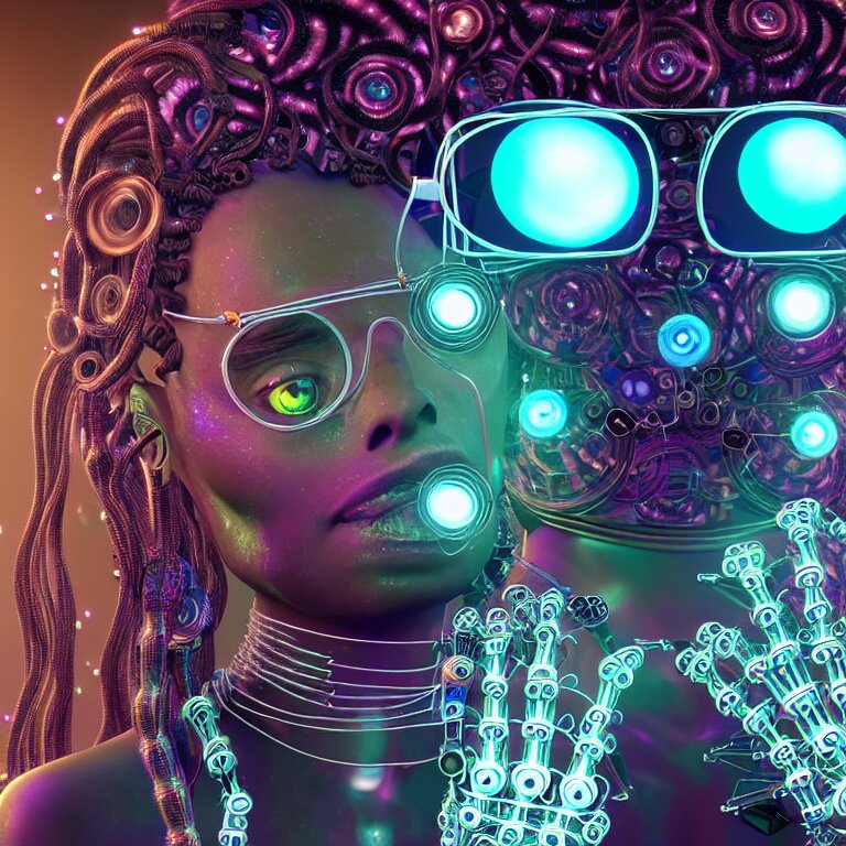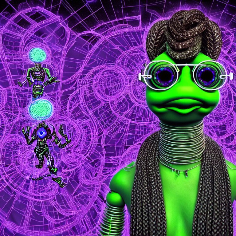 A realistic pepe staring into the camera in a photo shoot with holographic eyes, braided hair, jewelry, tattoos, holding a mechanical smiling robot covered in wires they are wearing matching hi tech glasses the entire image is covered in a hint fractal designs and mandelbrot bursts with cinematic lighting, unreal engine, trending on artstation, hyper realistic, surrealist, perfect symmetry