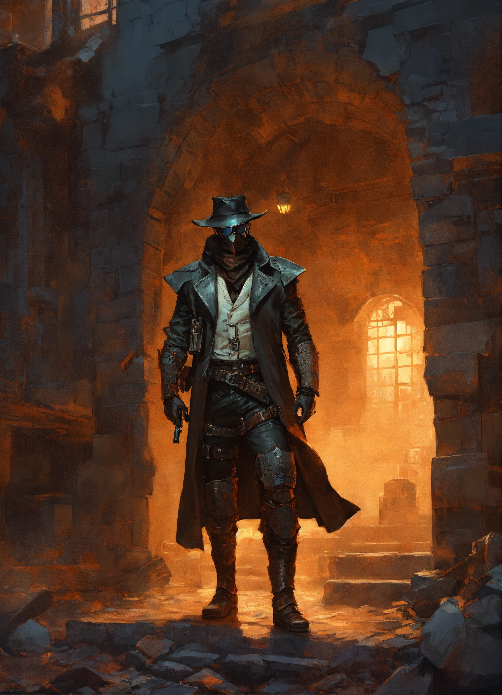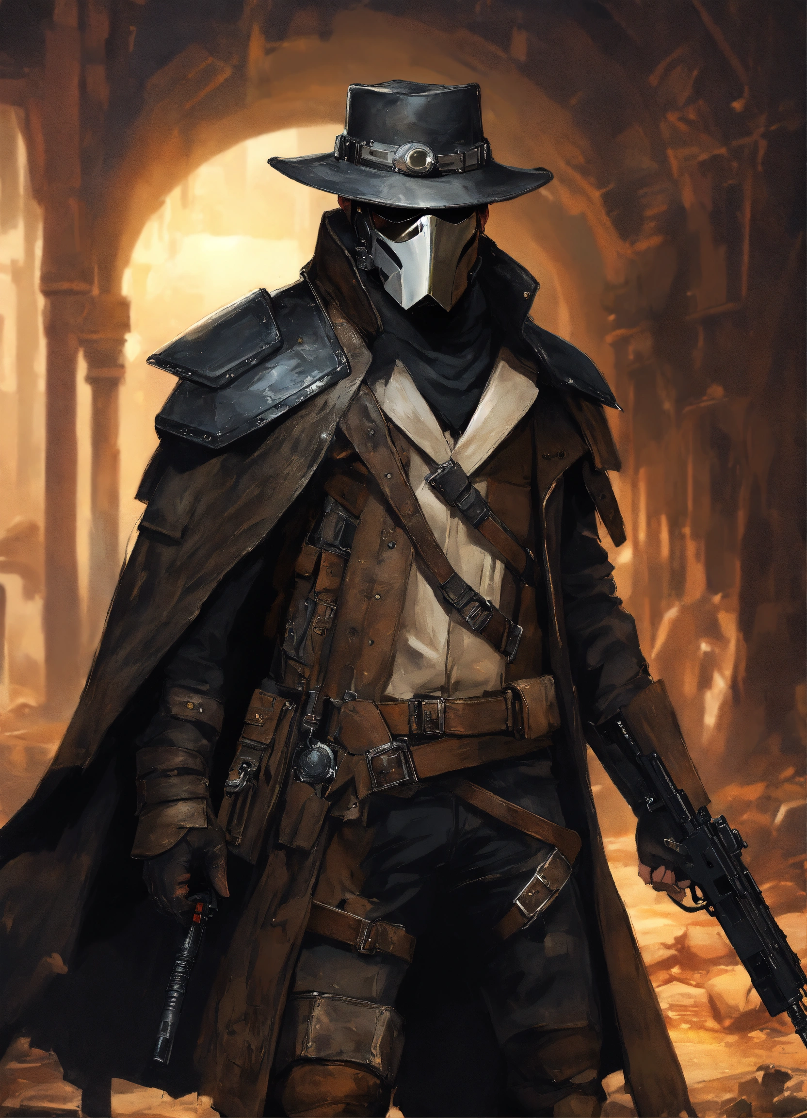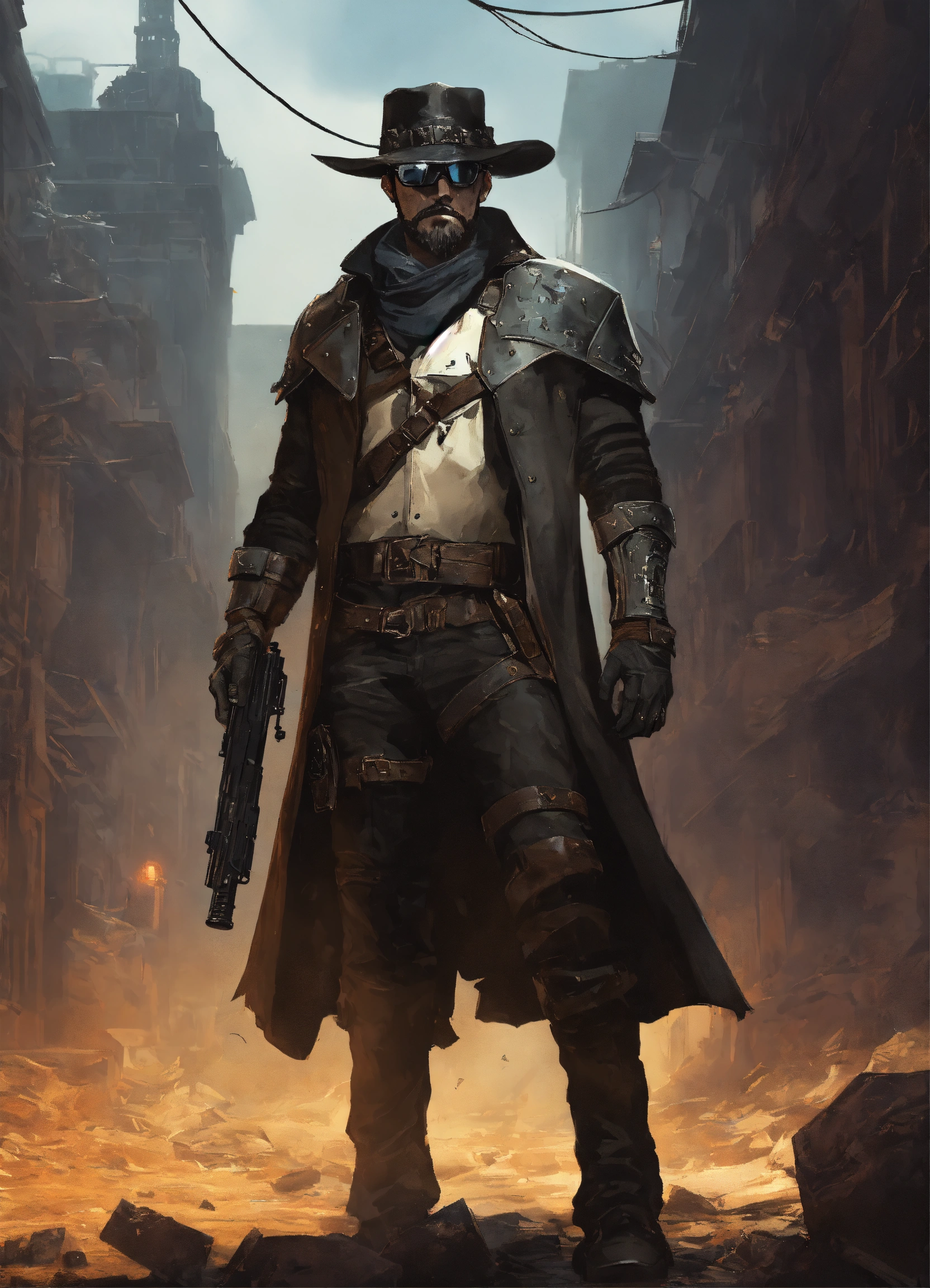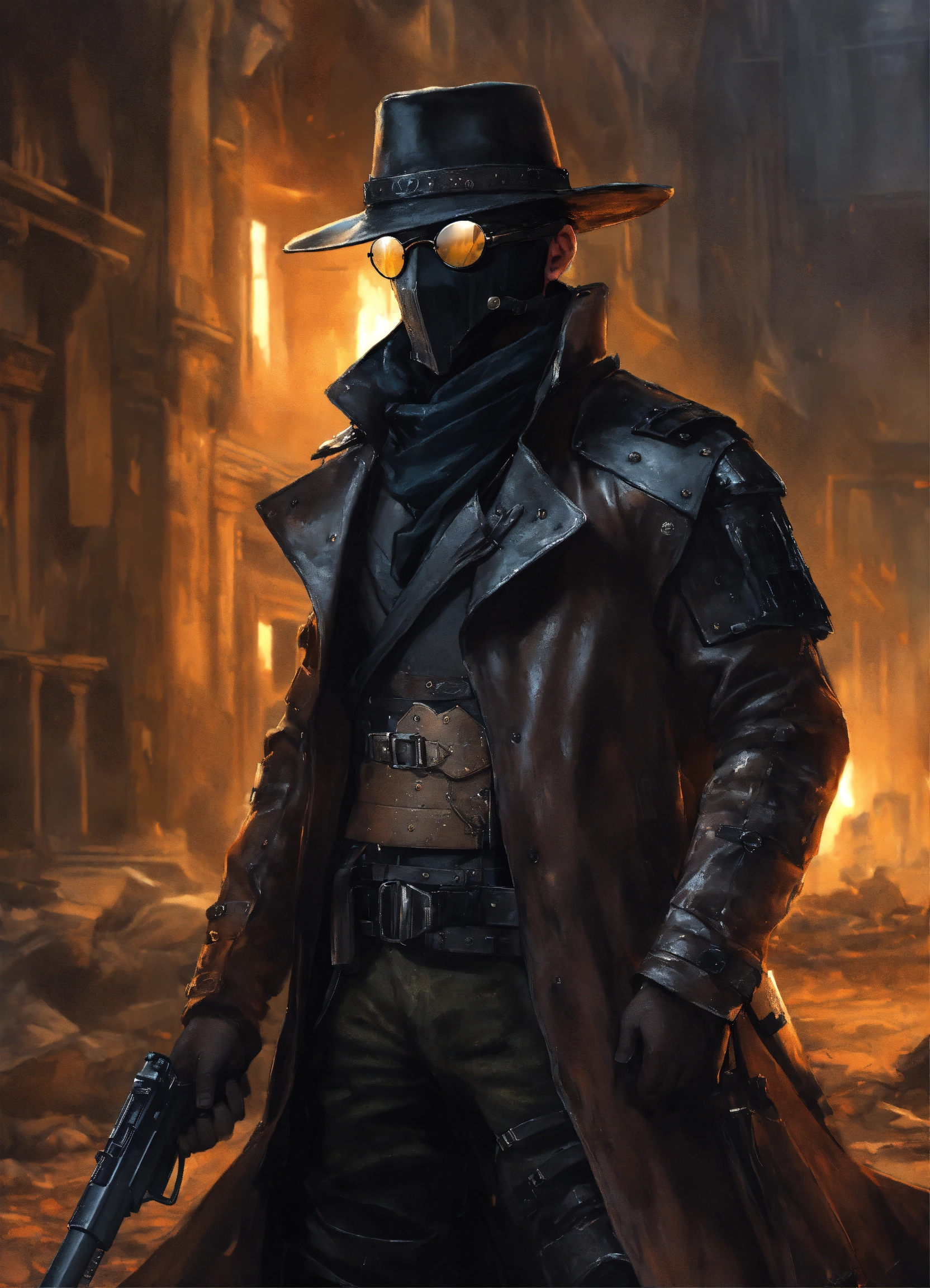 In a ruined city, a white bounty hunter in an armoreed back leather trenchcoat with mantled shoulders wearing a black stetson hat and a leather face mask with dark glasses over his eyes, armorer ballistics vest under armored leather trenchchoat
