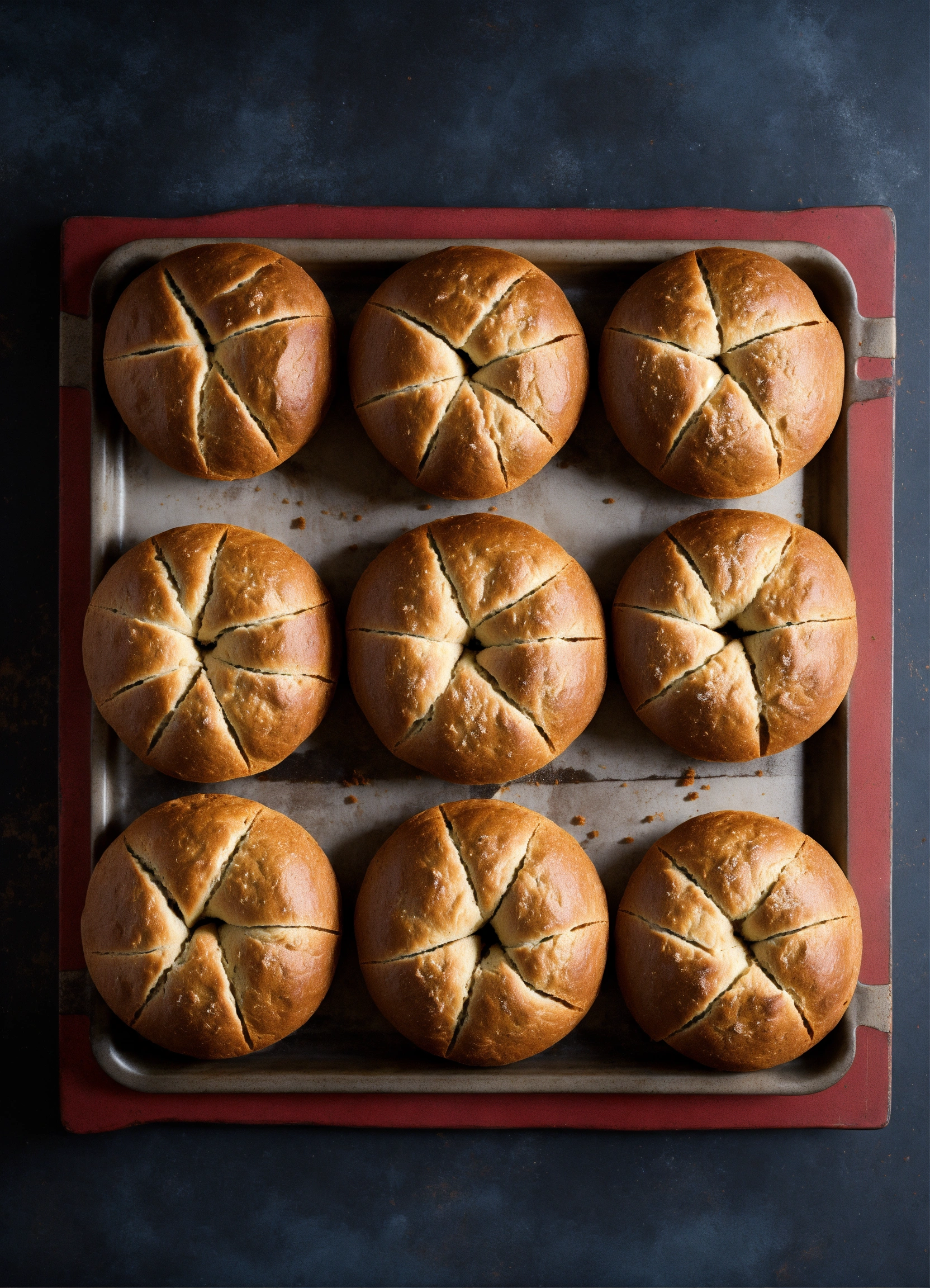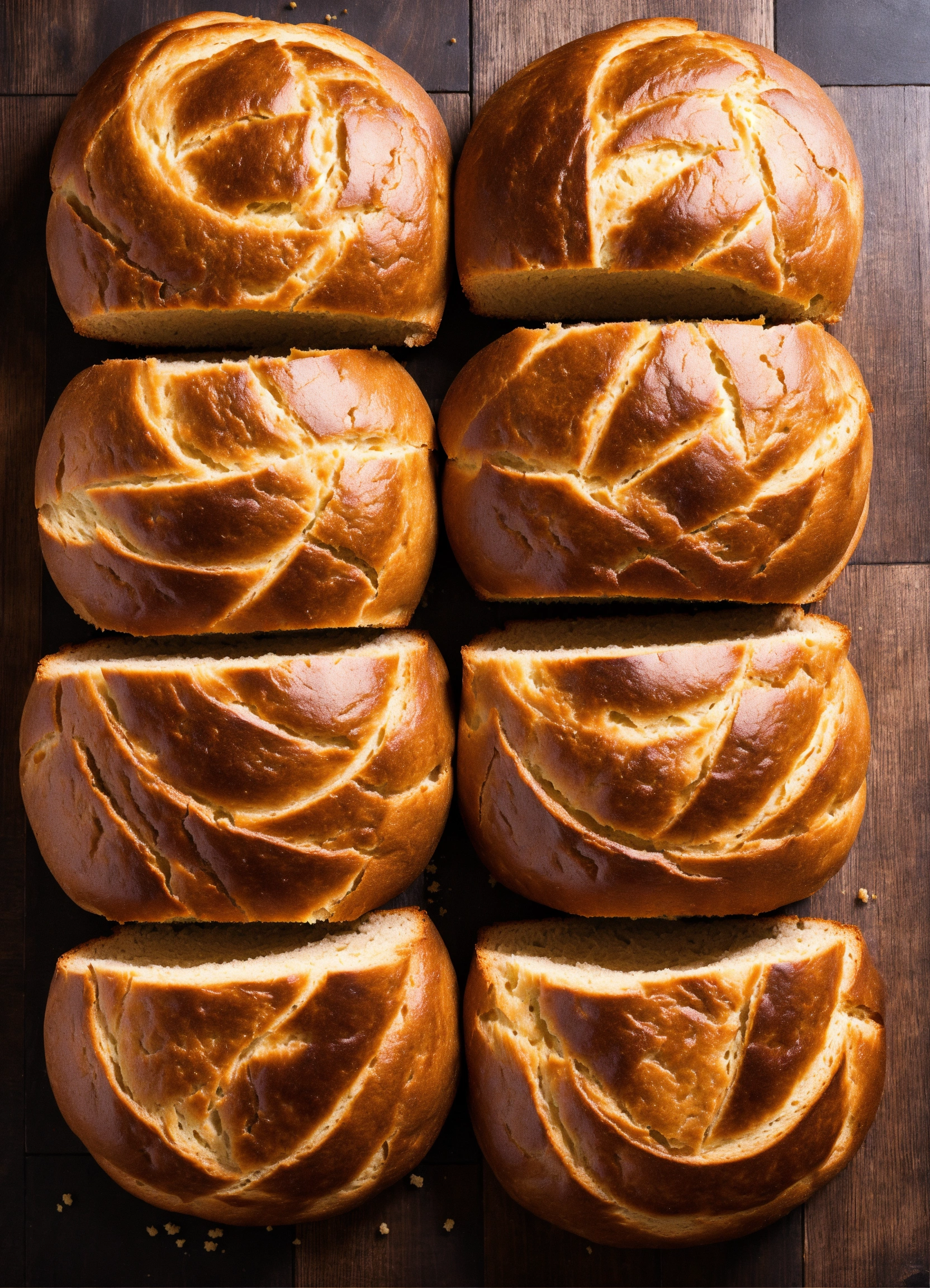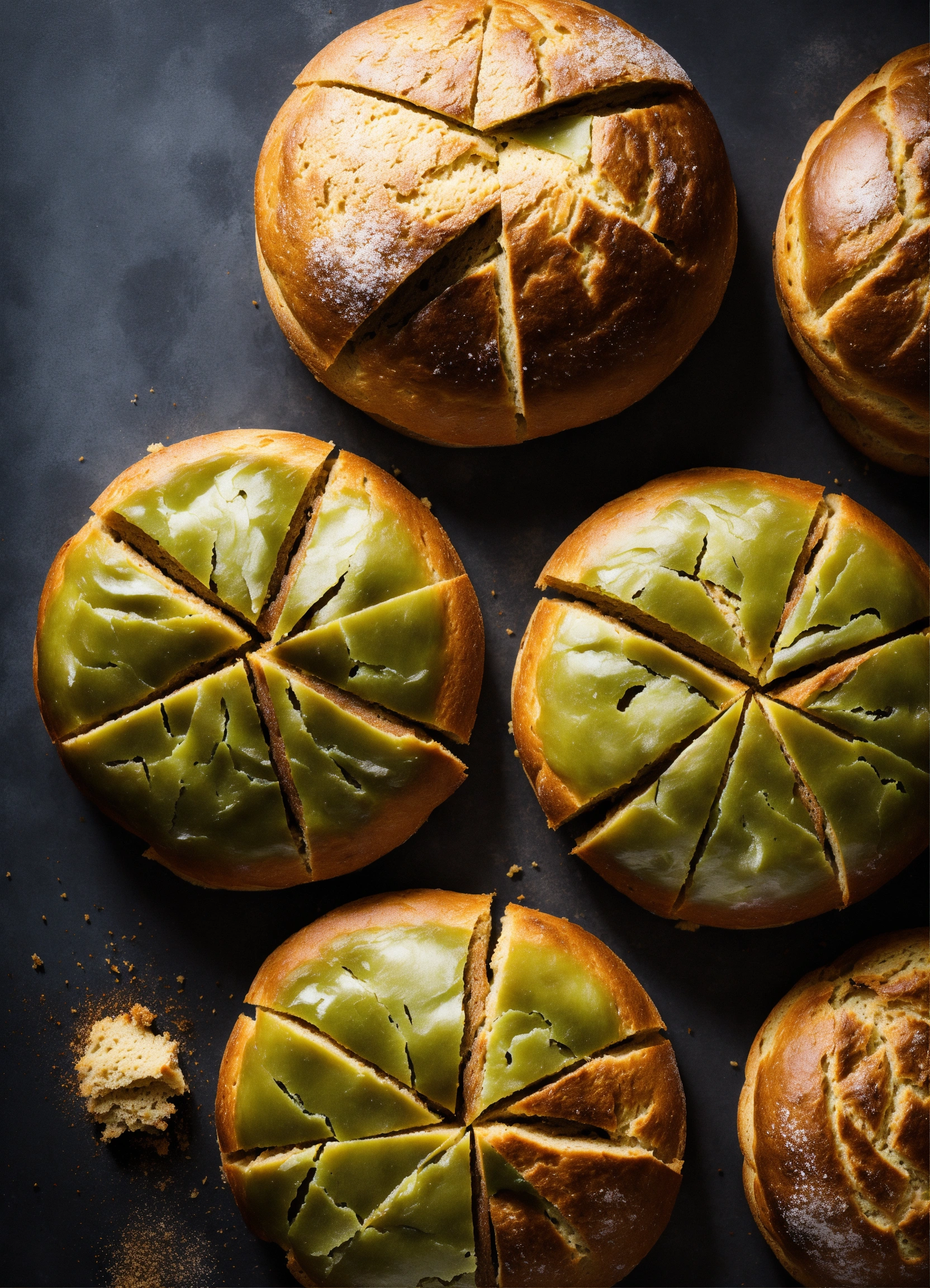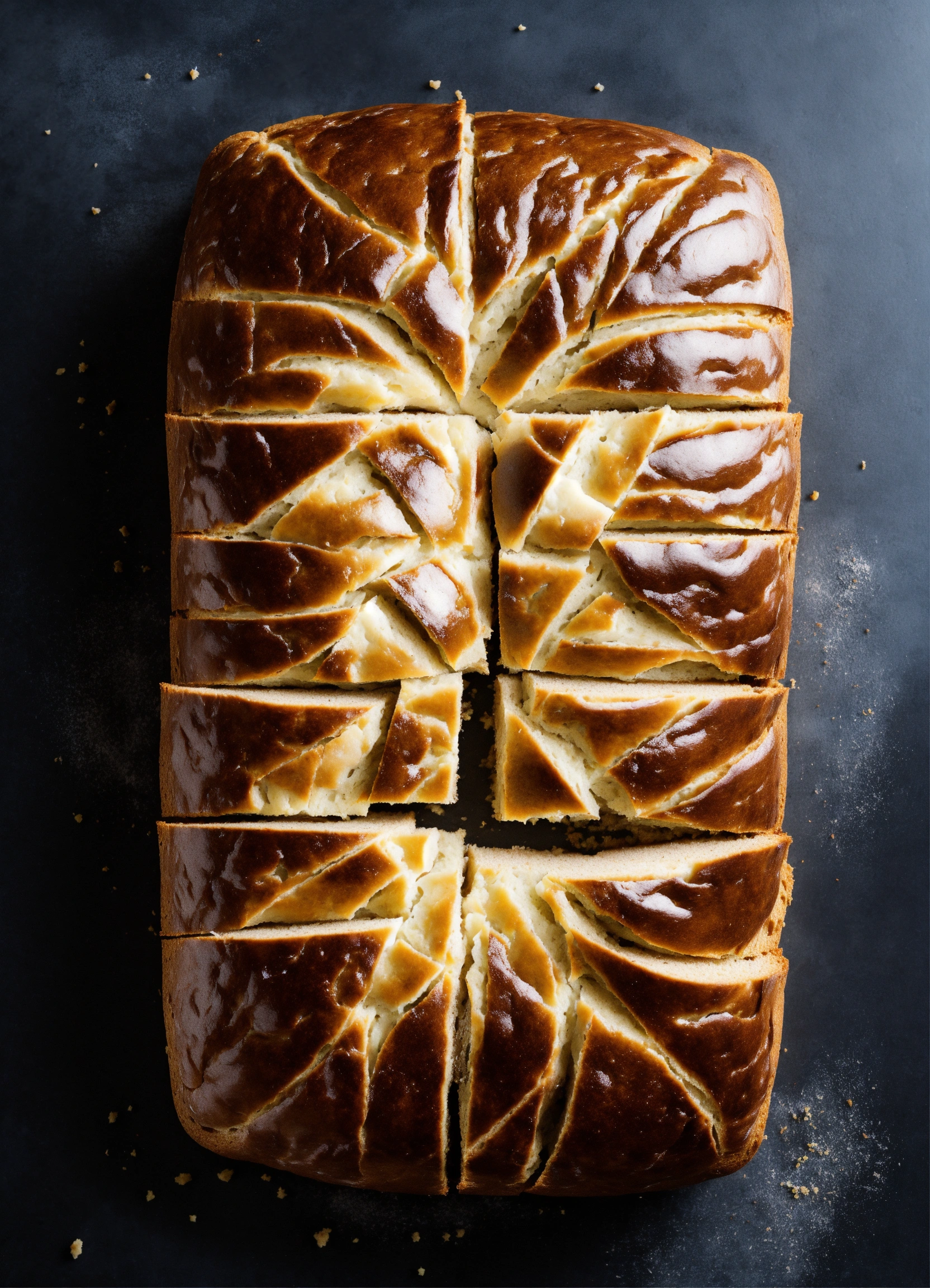 Loaf of dark round-shaped bread picture view from the top, divided into 6 uneven slices and looking like chart pie.