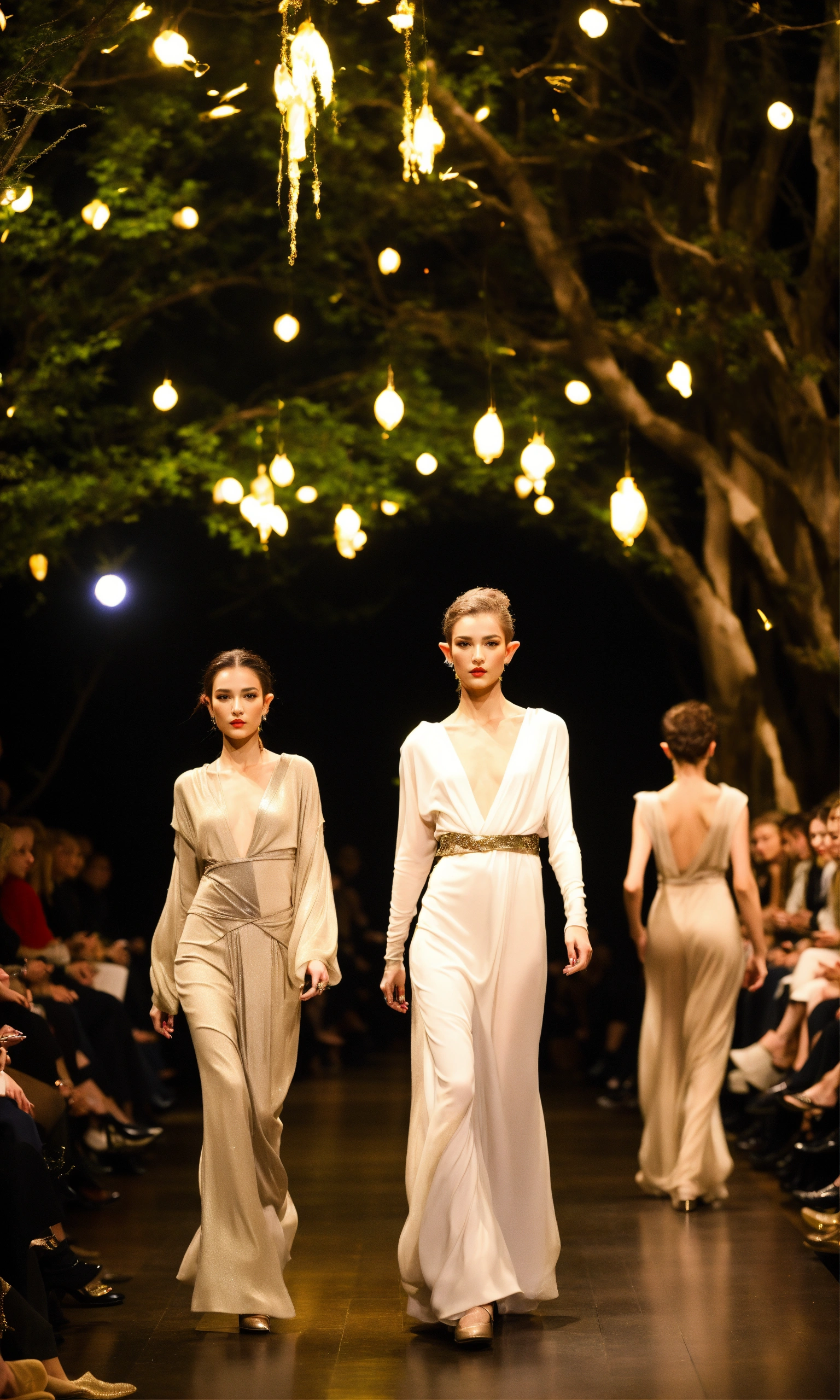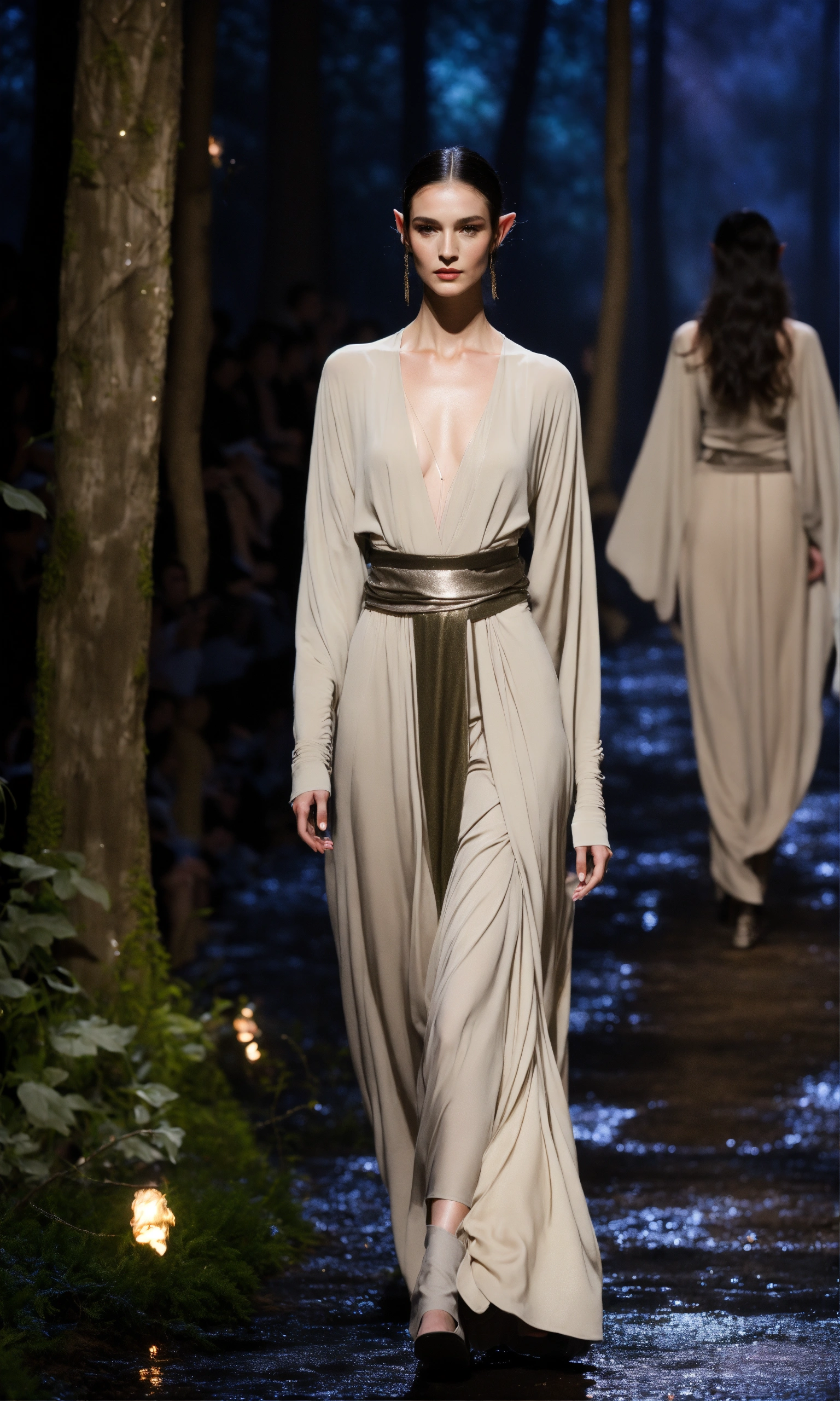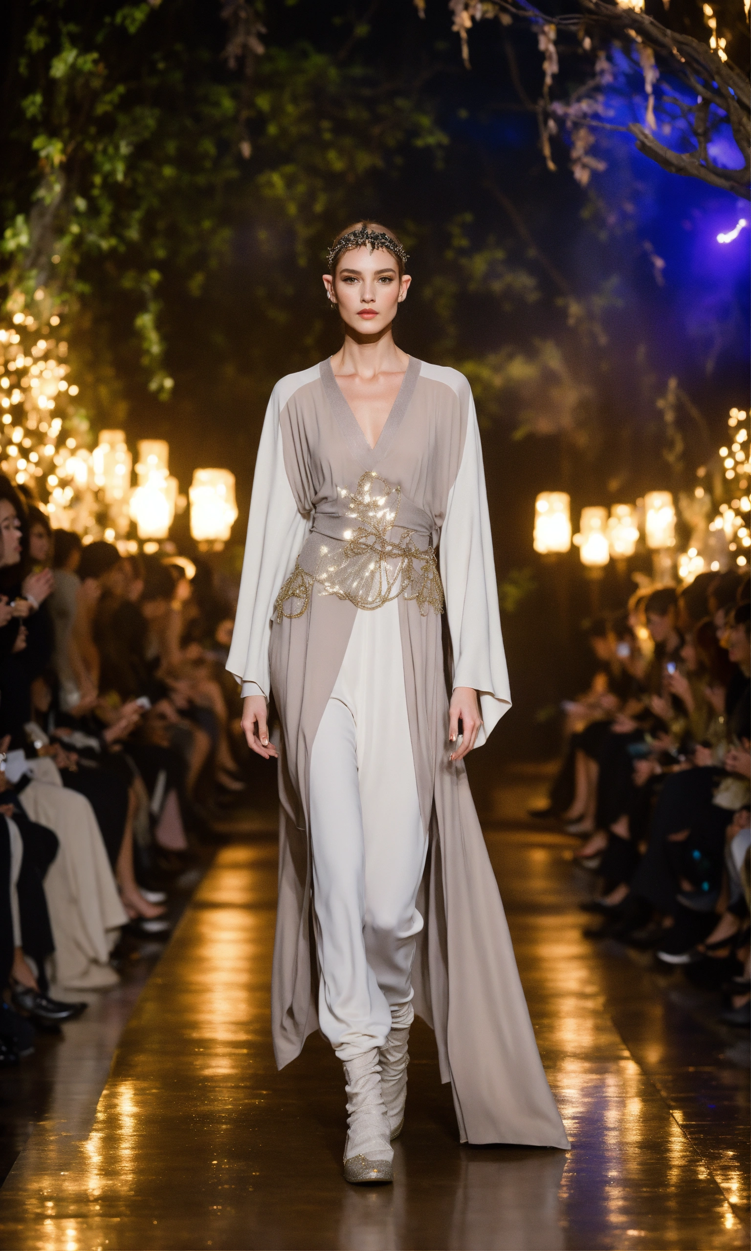 Lothlorien androgynous elves walking runway during elvin fashion week wearing dolman sleeve elvish donna karan fashion in black, white, grey, beige, stone, metallics, shimmer at an enchanted forest runway at starry nighttime, fireflies
