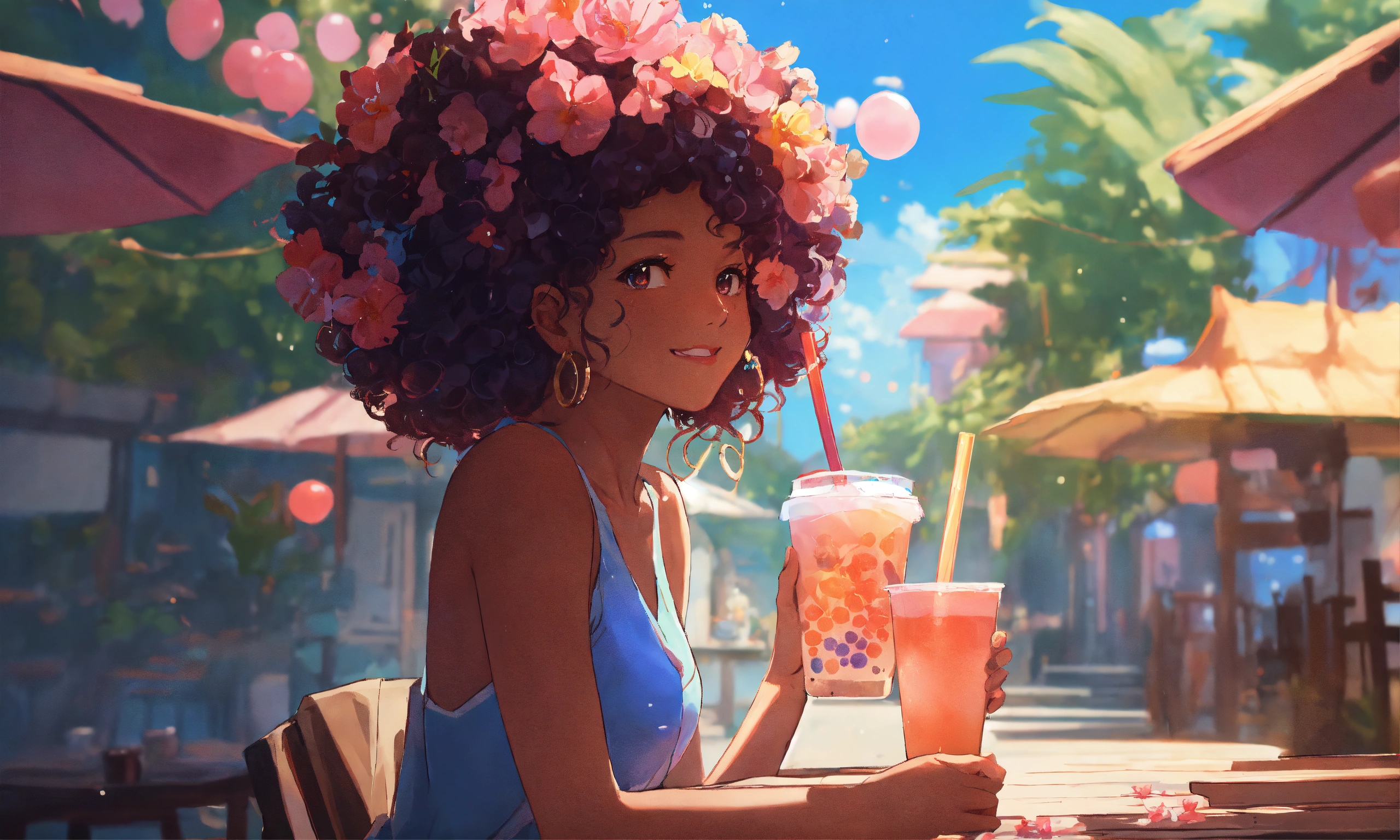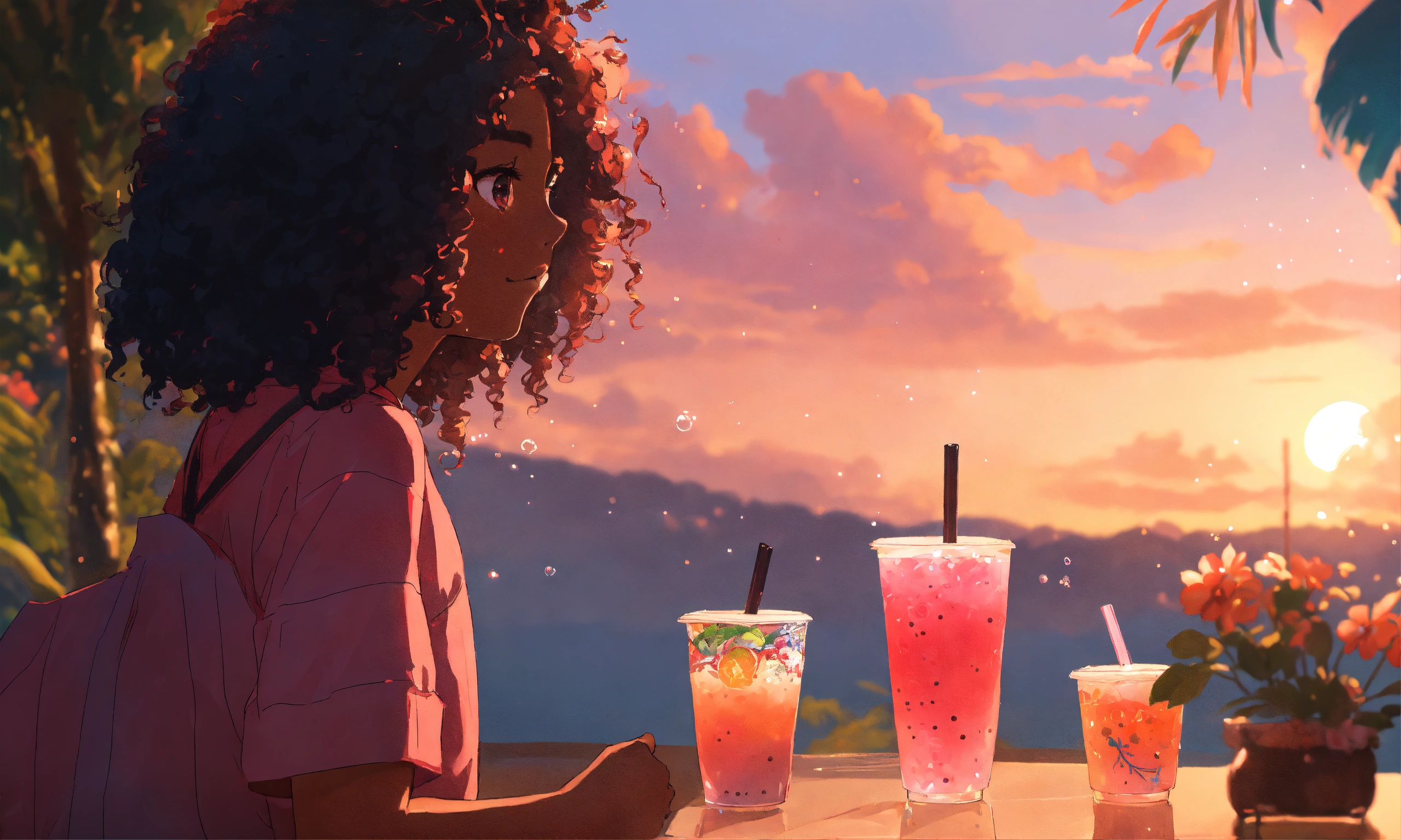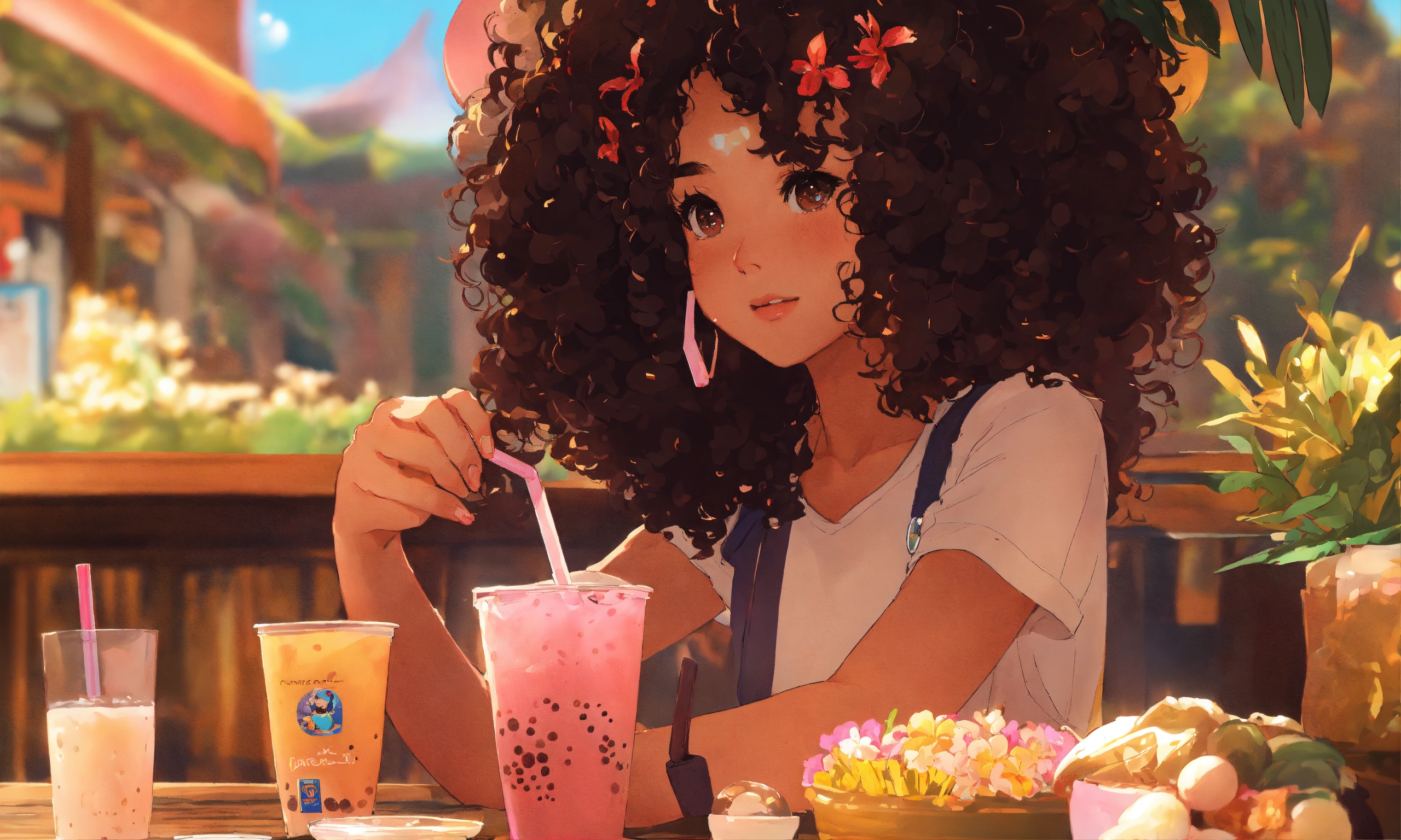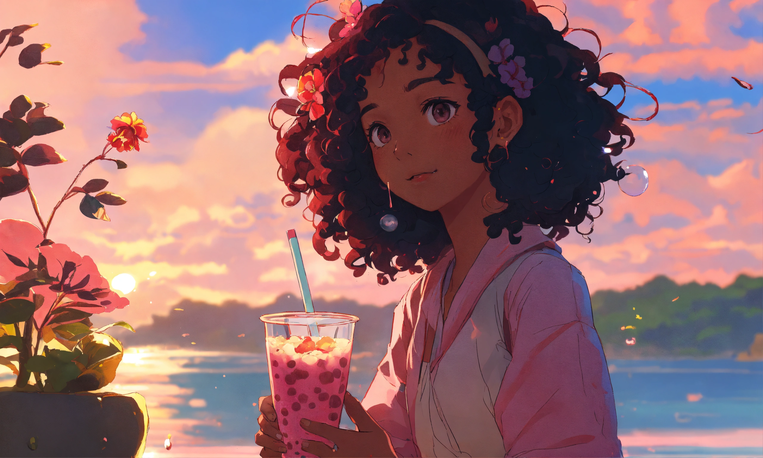 Bubble tea, boba milk tea, tapoica pearls, island girl, long hair, tropical, exotic flowers, bubble tea, cute girl, curly hair, cute waifu, afro, rosy cheeks, coral pink, girlie, style of laurie greasley, studio ghibli, akira toriyama, james gilleard, sunset, tropics, genshin impact, captivating, trending pixiv fanbox, acrylic palette knife, 4k, vibrant colors, devinart, trending on artstation, low details.