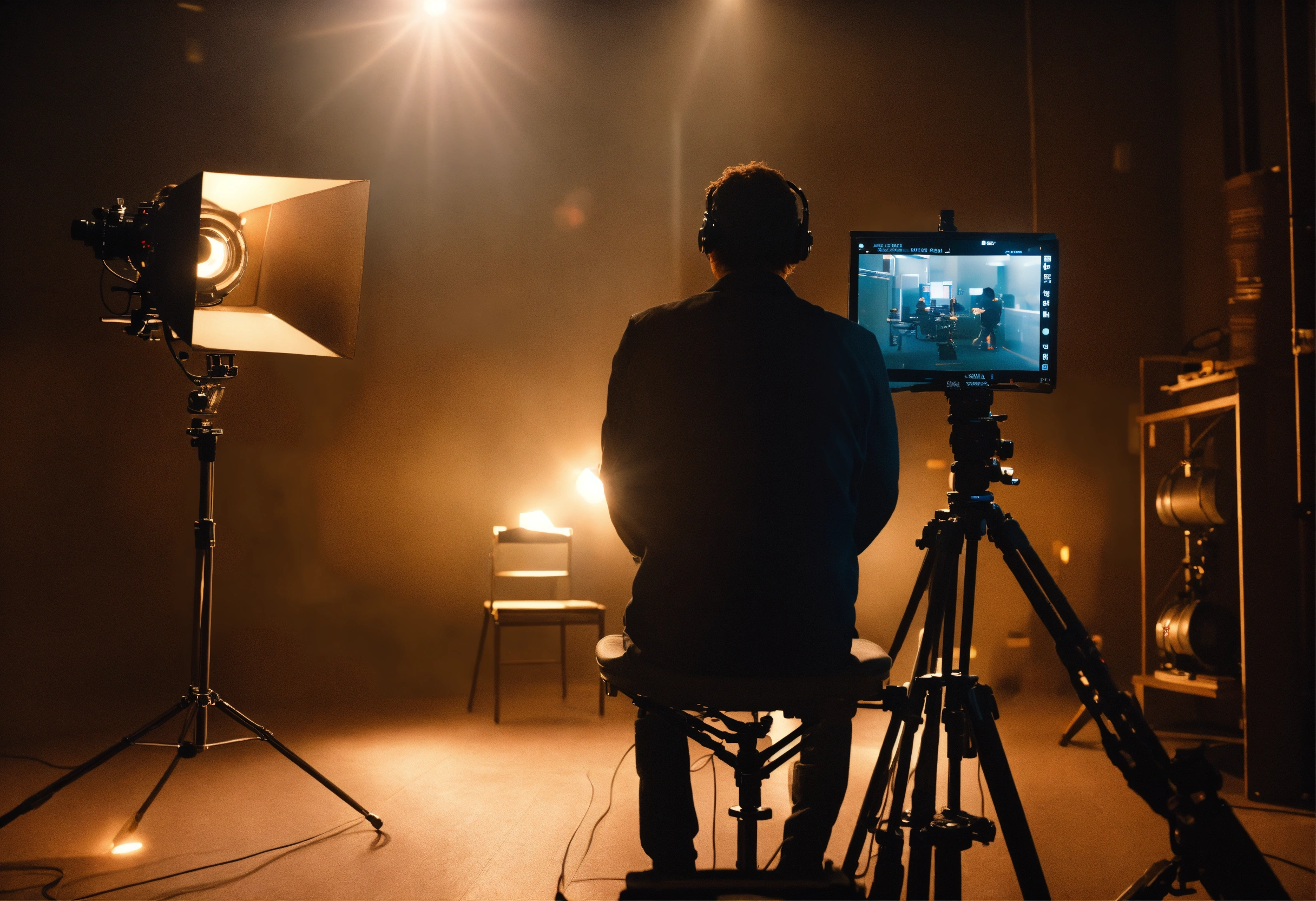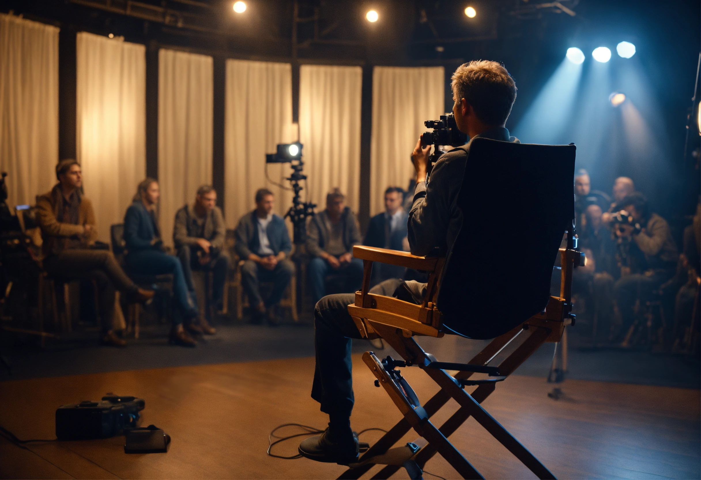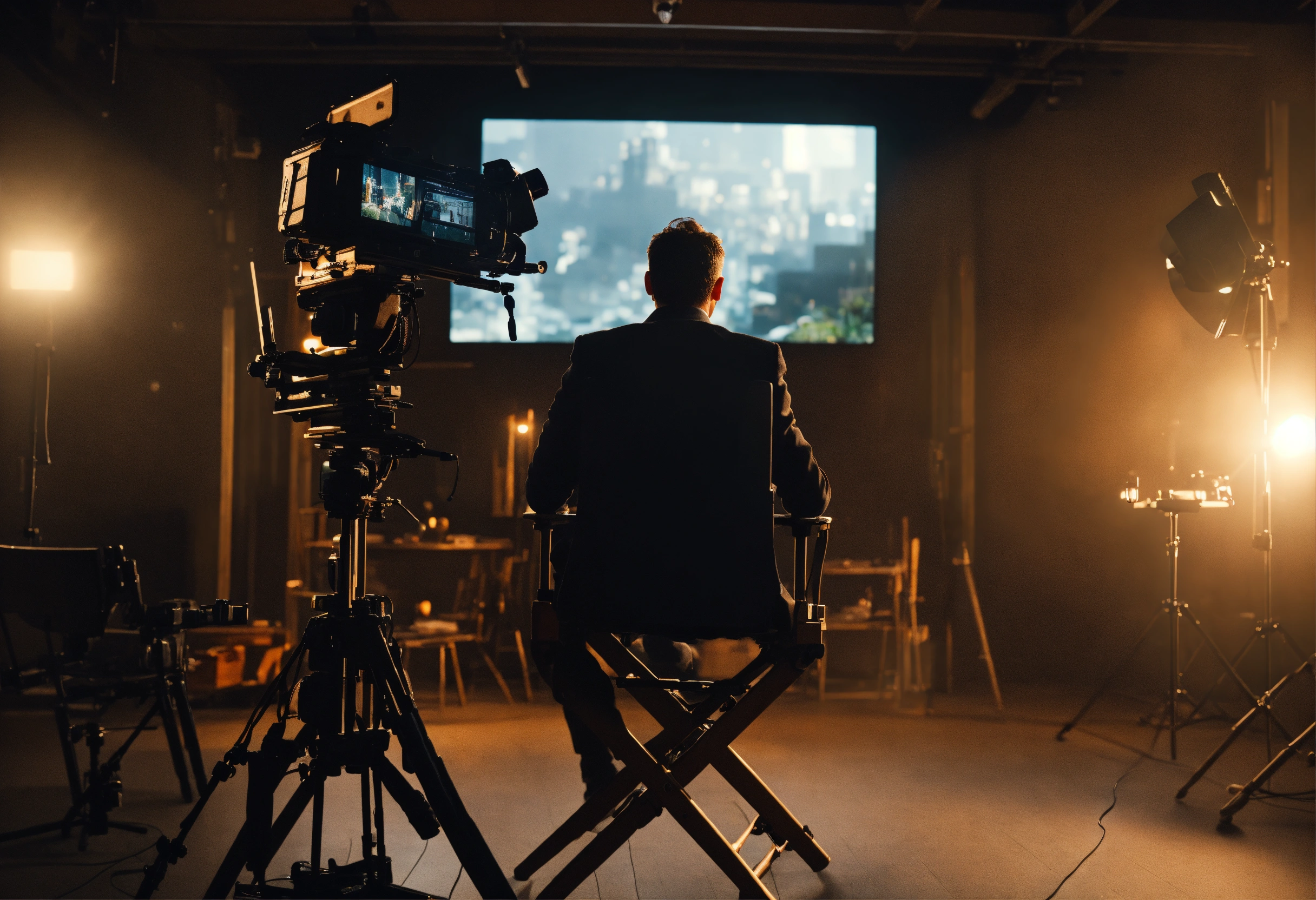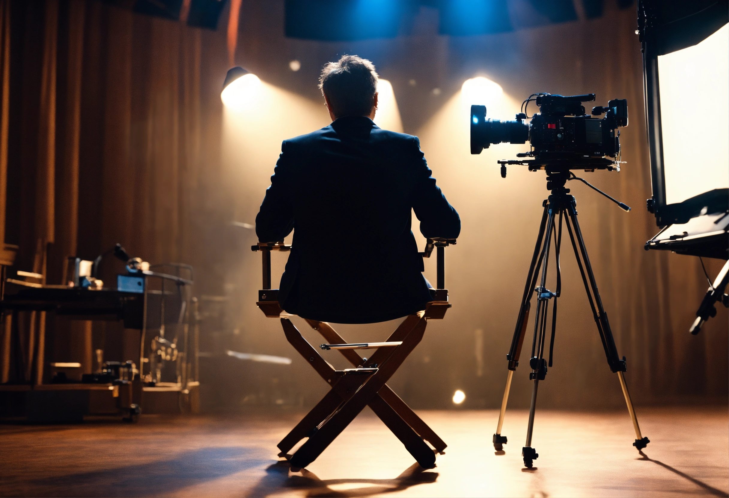 The director in the director's chair looks towards the set. realistic. a clear correct focus. full frame. 3d, hd, soft light, complex details, depth of field, beautiful lighting. view from the back