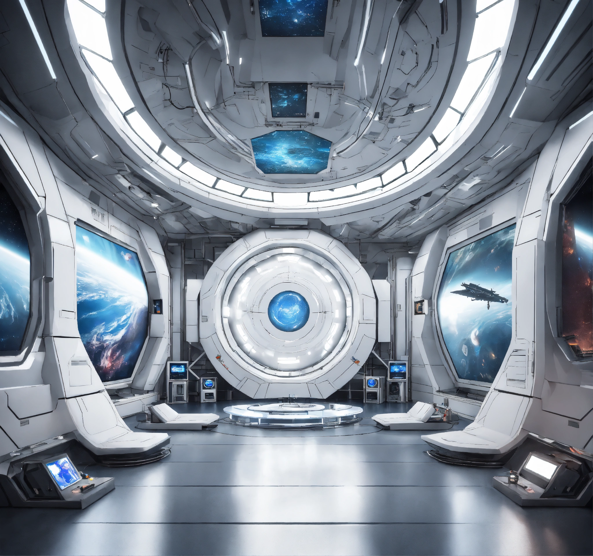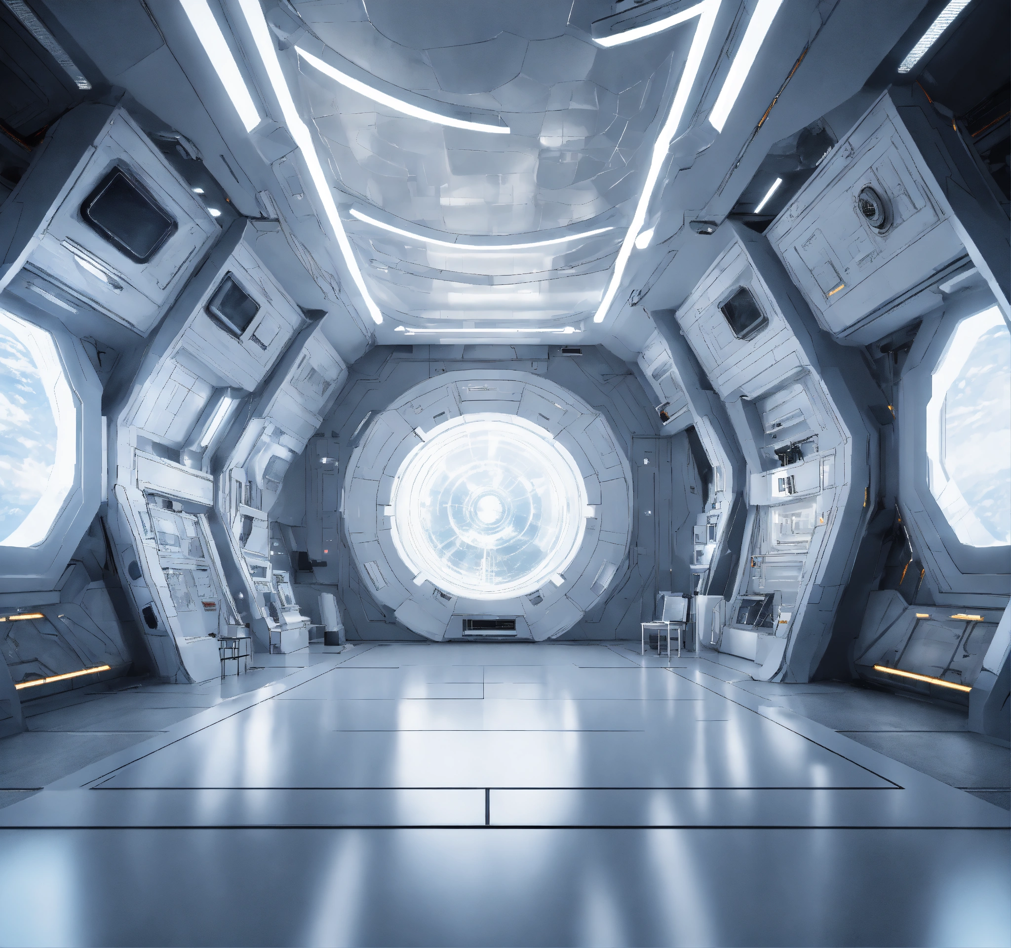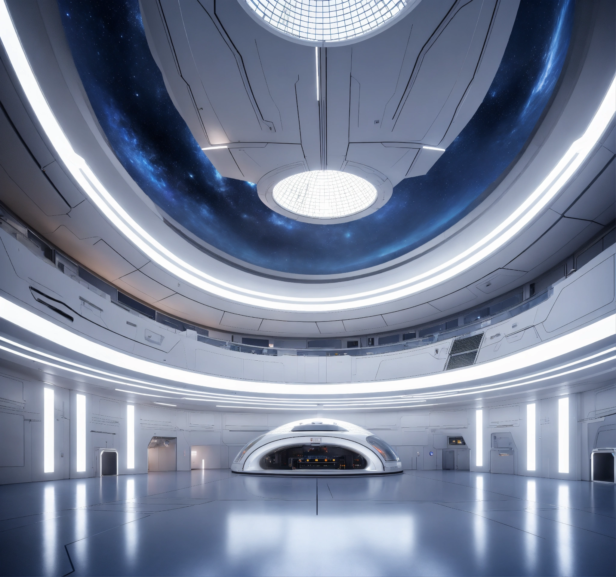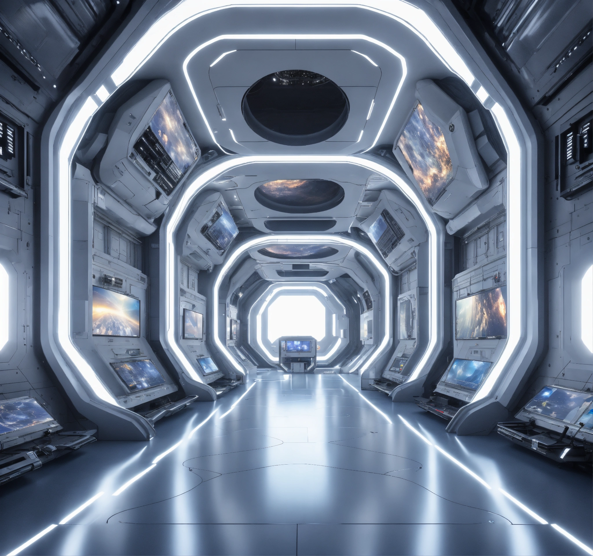 A huge hall with a big screen in the wall in the interior of a futuristic space station, white metal round walls, no windows, hyperralistic, hyperdetailed