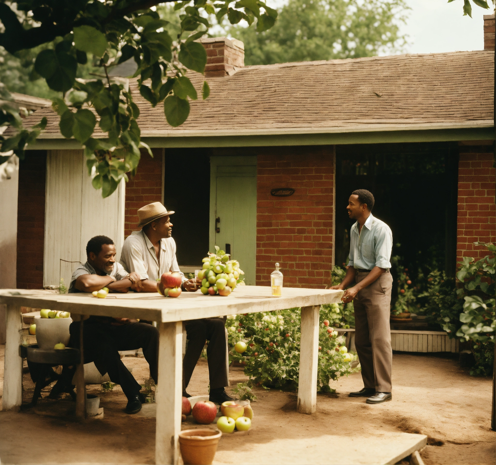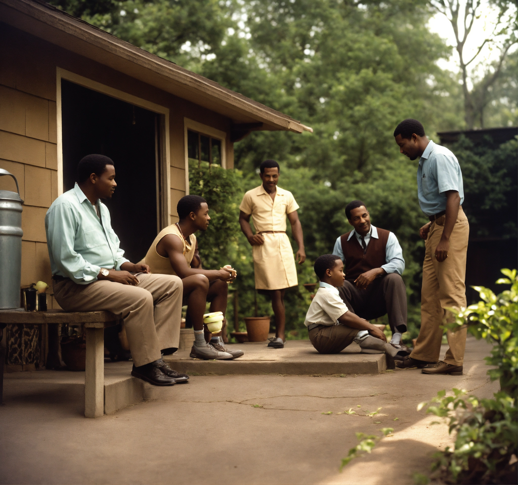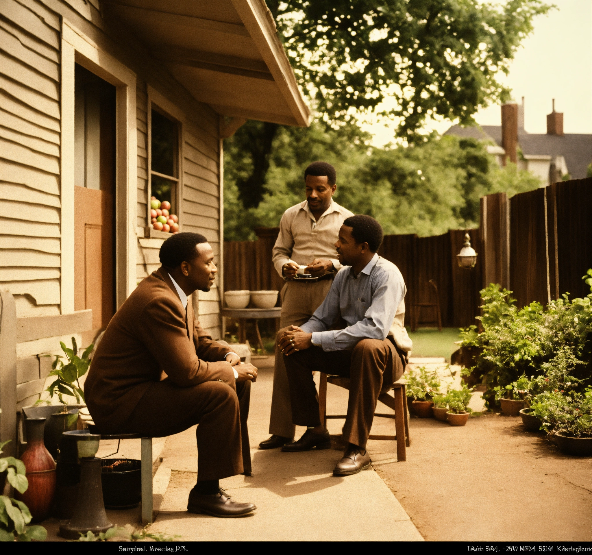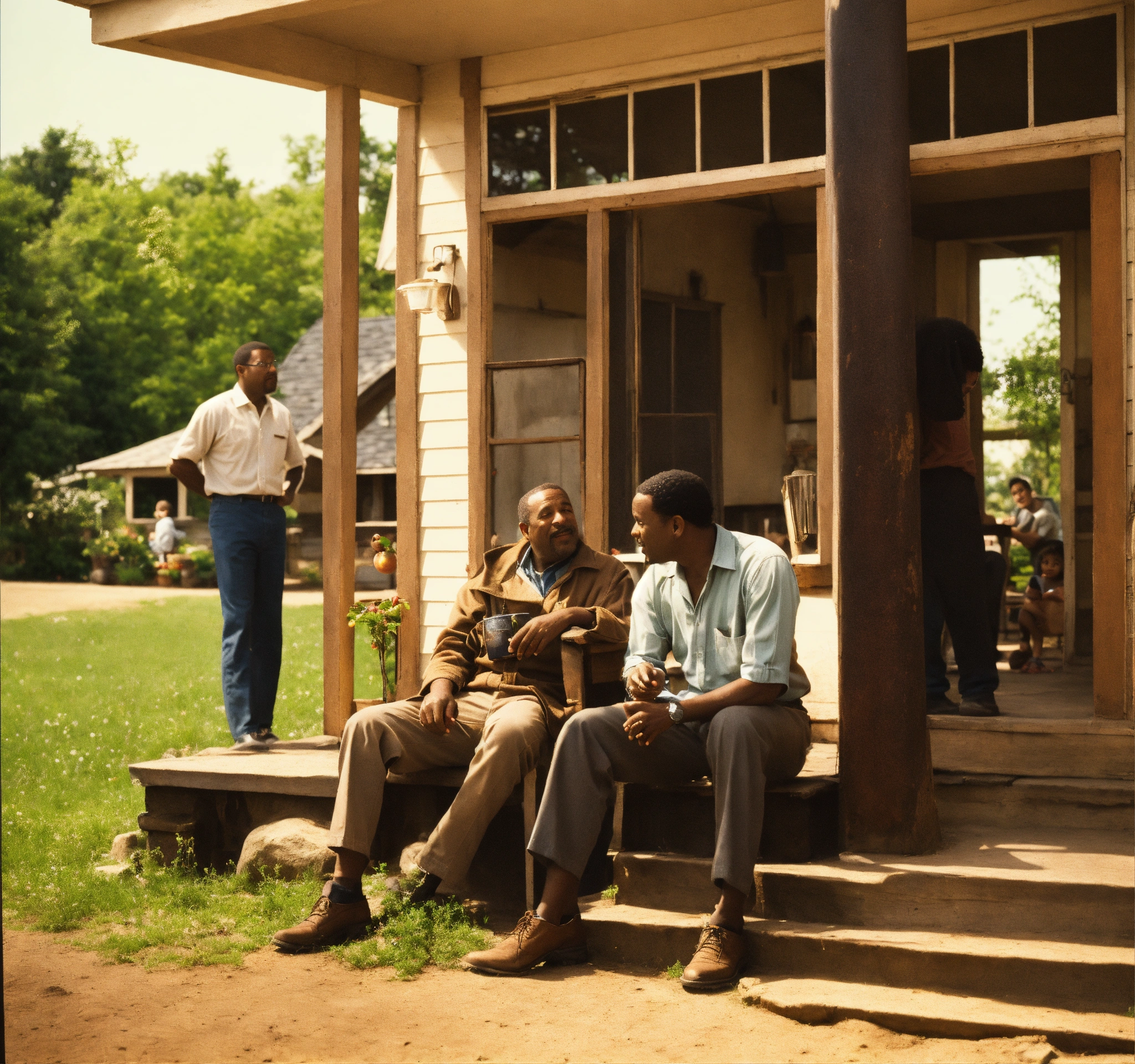 Setting 1960s backyard and porch of a urban home. in the foreground a medium-skinned 55-year-old man is seated on the porch. he is holding a brown-skinned five-year-old on his lap. in the background also, two black men are having a conversation by themselves. they stand next to a well-grown apple tree, possibly discussing it. their expressions are relaxed, indicating a casual chat. technical specifications steps 20 sampler dpm++ 2m karras cfg scale 15 desired output size 1024x960 pixels