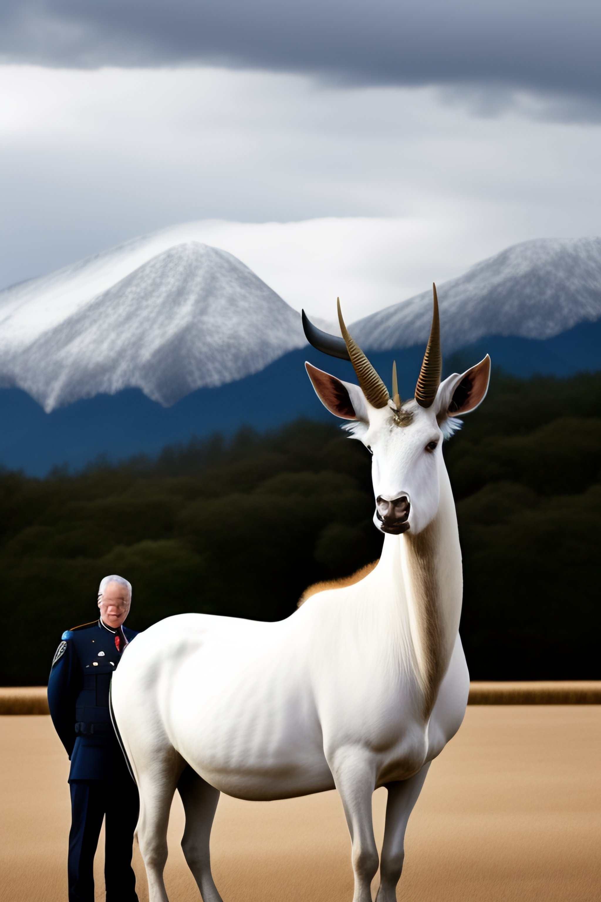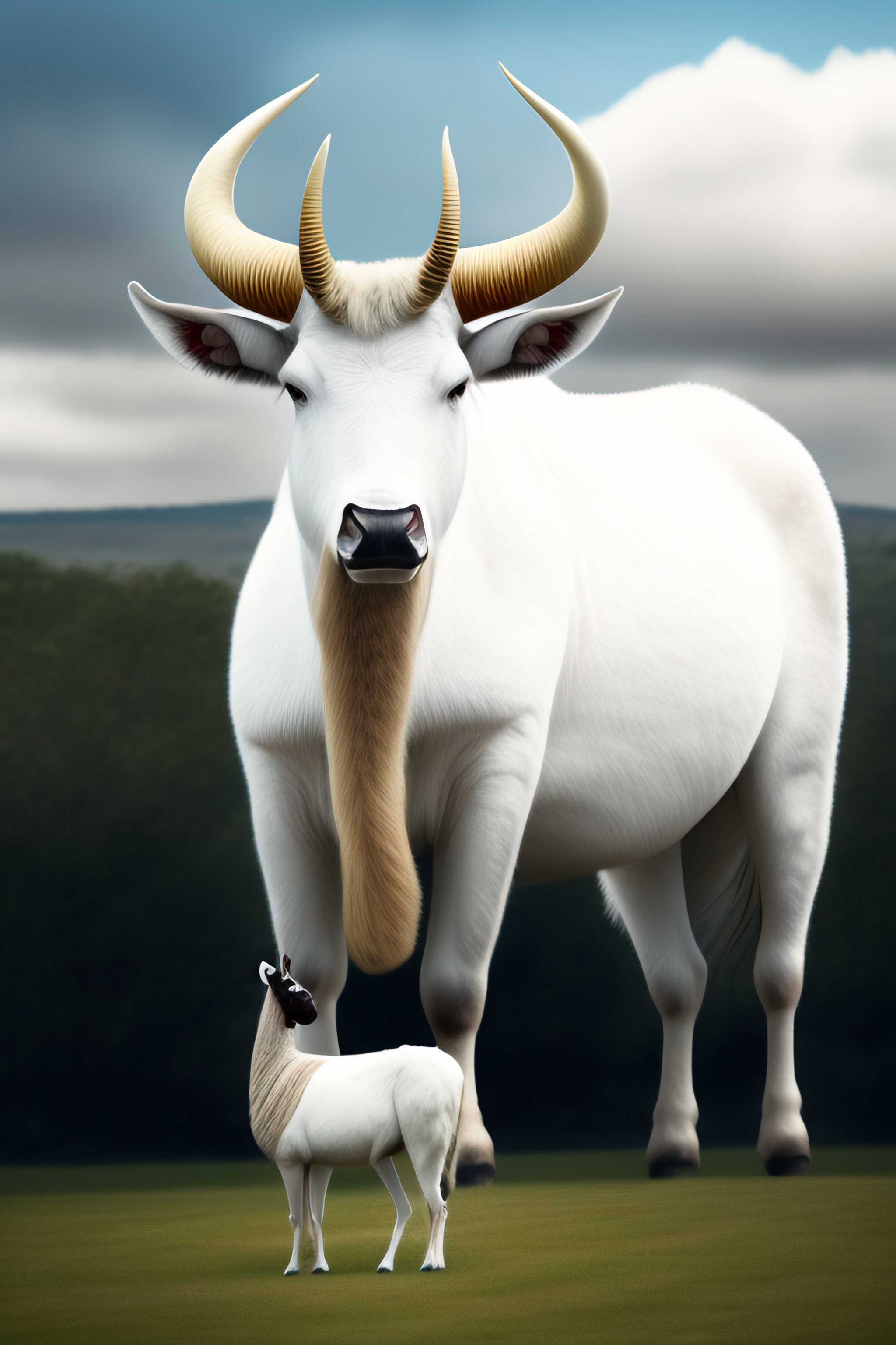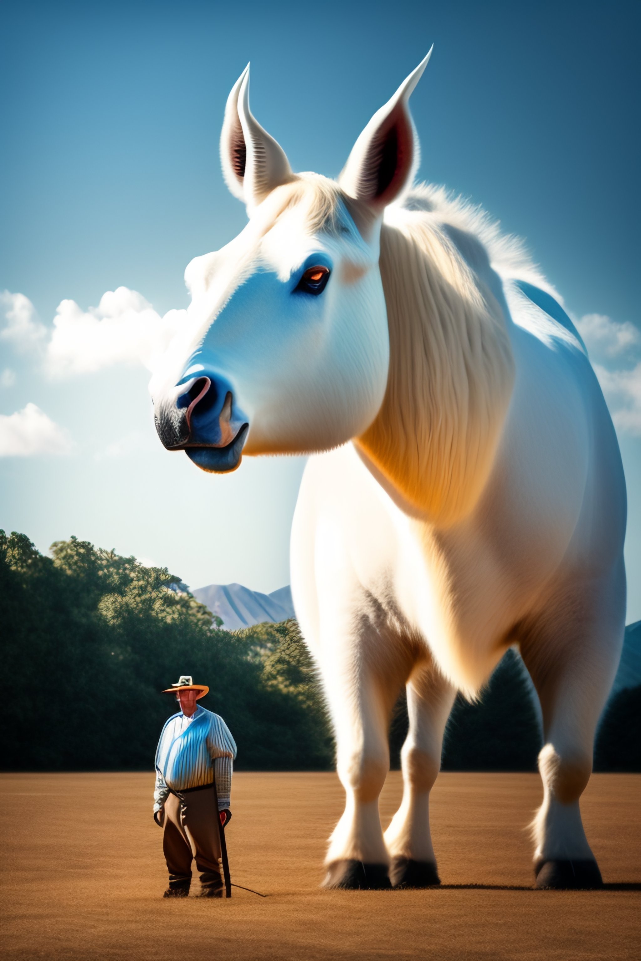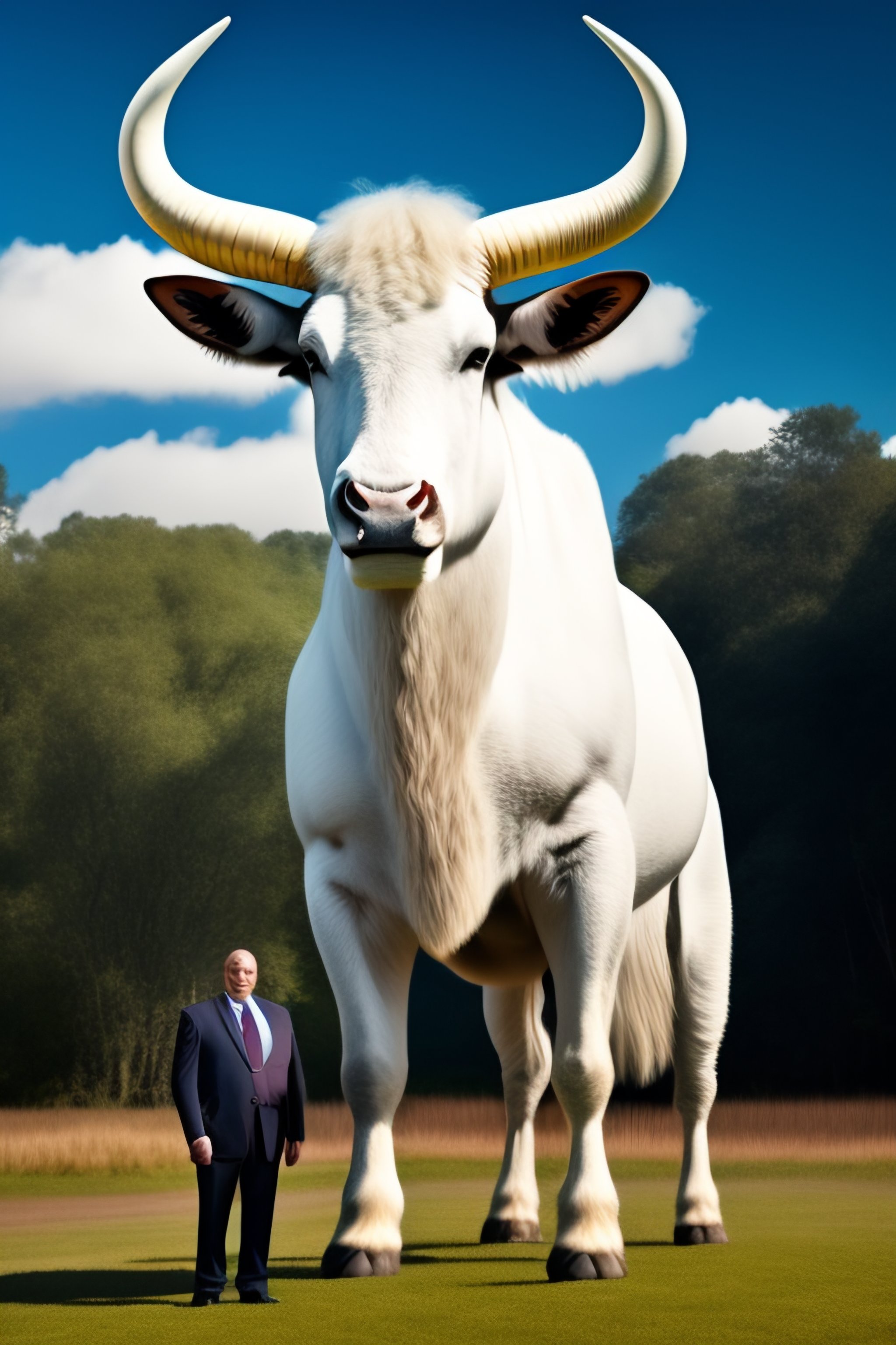 Giant white beast with a horn facing back, the beast is 3 time bigger then the human standing next to it