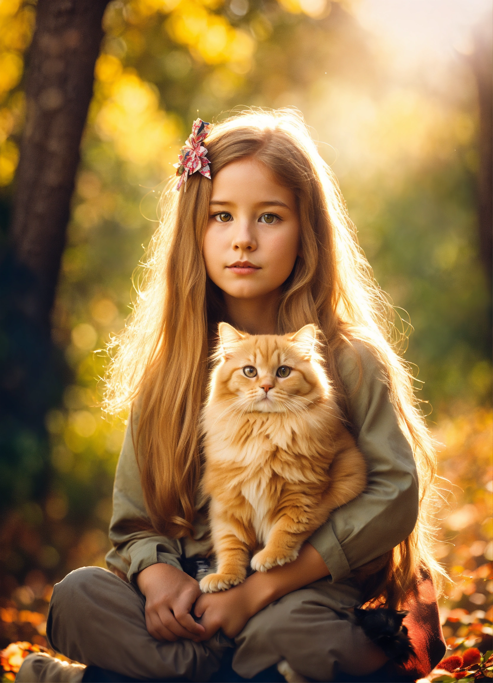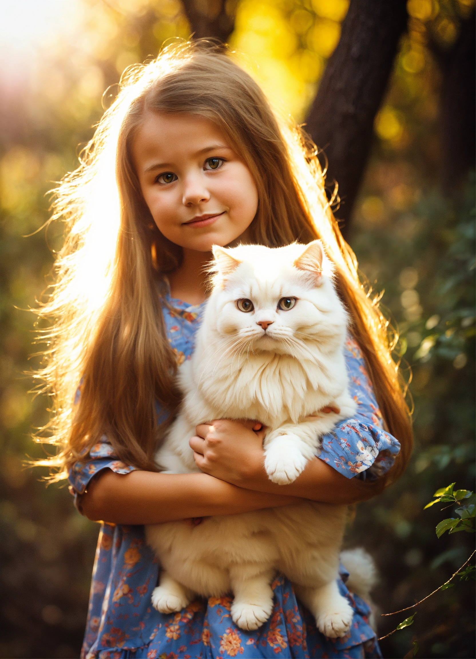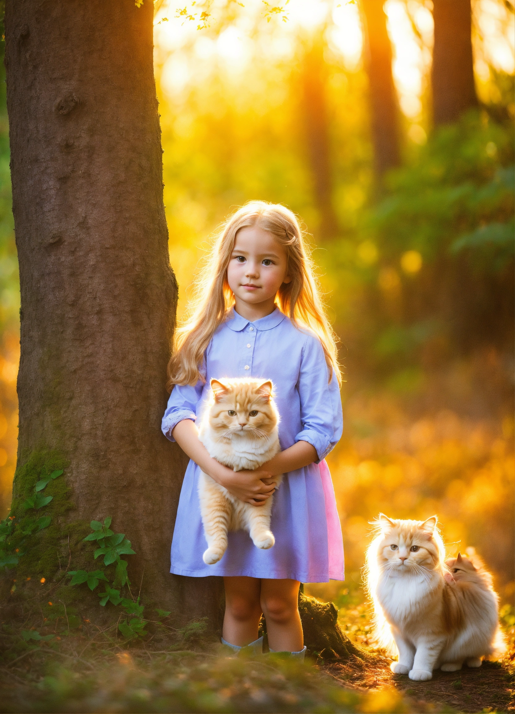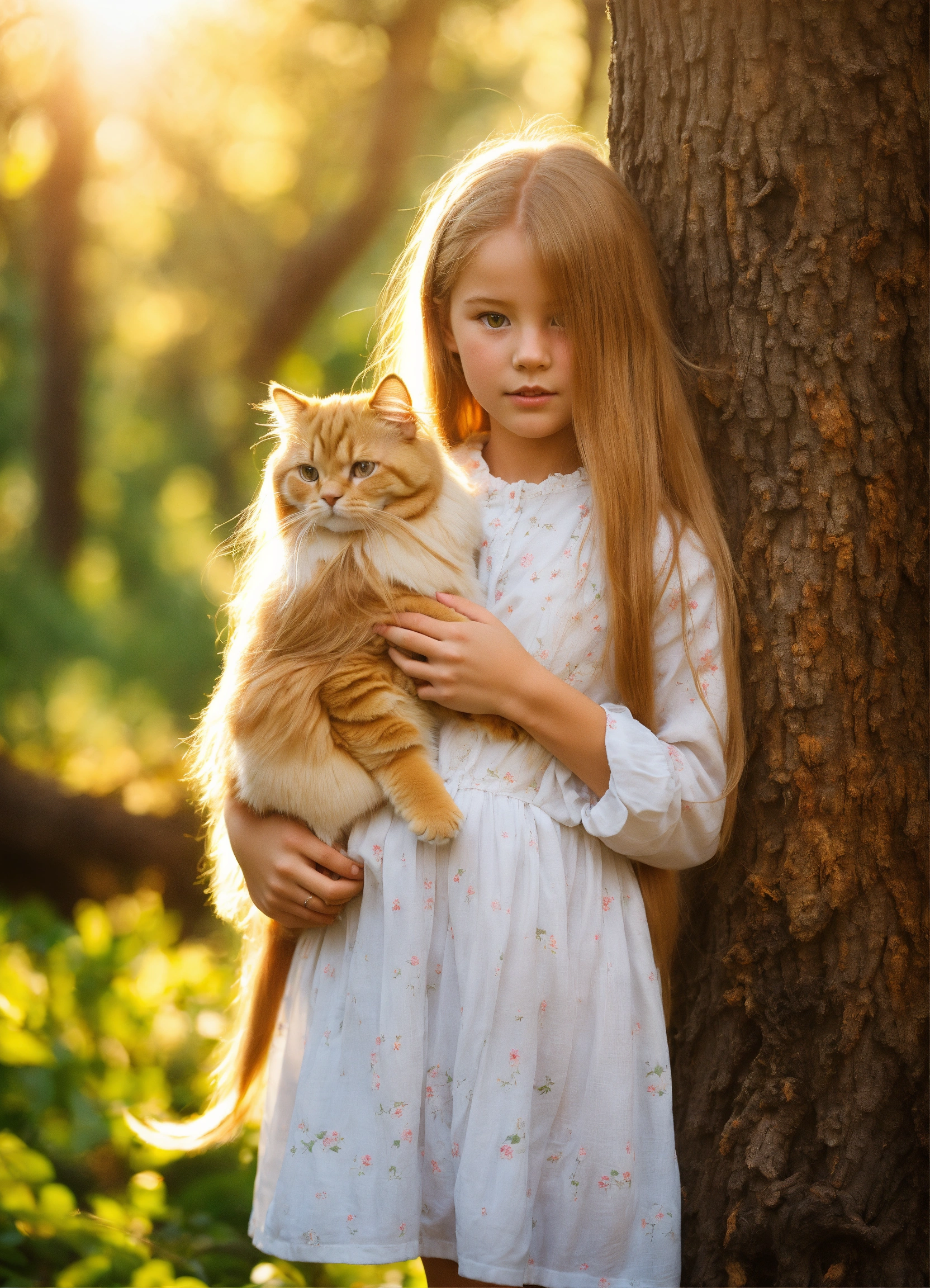 A little british girl with long golden hair. holding the persian cat in his arms, looking into the distance. standing under the big tree in the forest. sunlight.