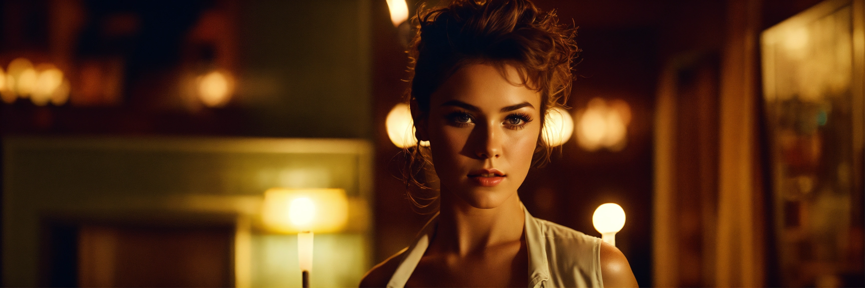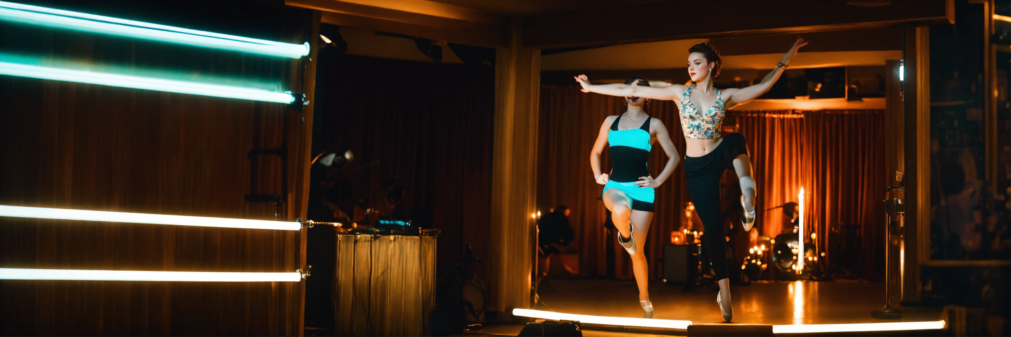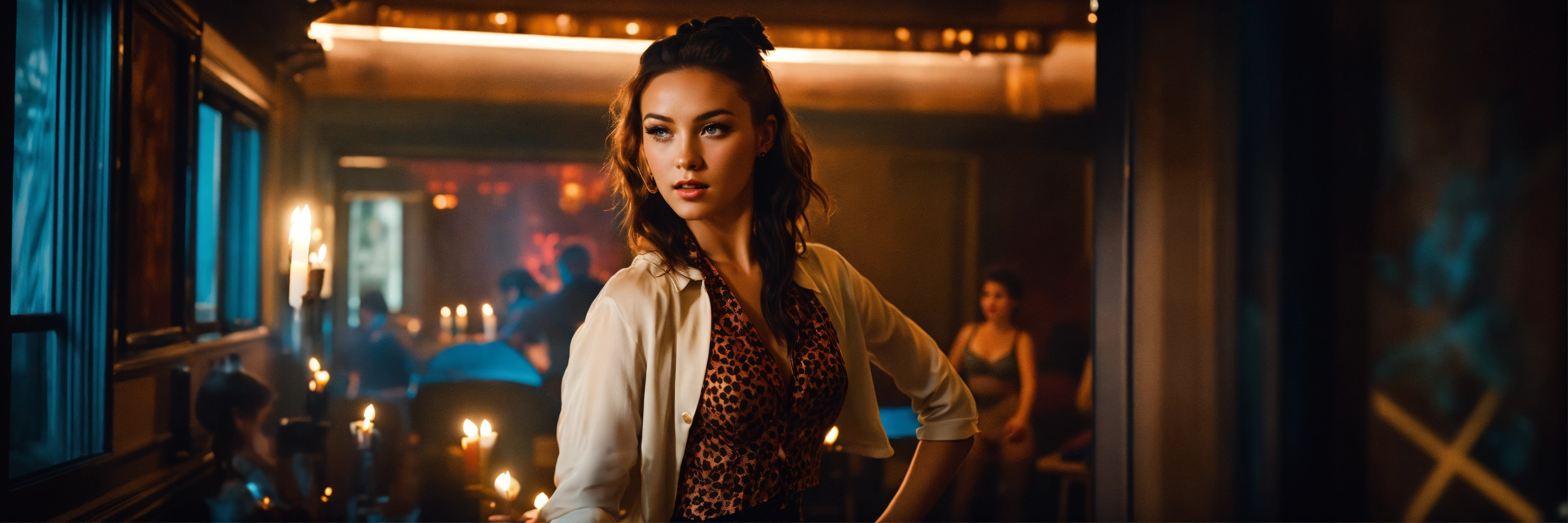 Full frame portrait, shutter speed 160, 16k of the dancer with movement and motion blur, seen in the background, candlelight, photorealistic variant, punk style woman with brown hair moving while dancing, 22 years old, pin- up in 2023, with short black culottes and white bolero, one hand in hair and the other on hip, vintage hotel room decor with neon visible through a window, photorealism, summer dynamism, cinematic, realistic photo studio, background black, photo fusion. photo effects, cinema